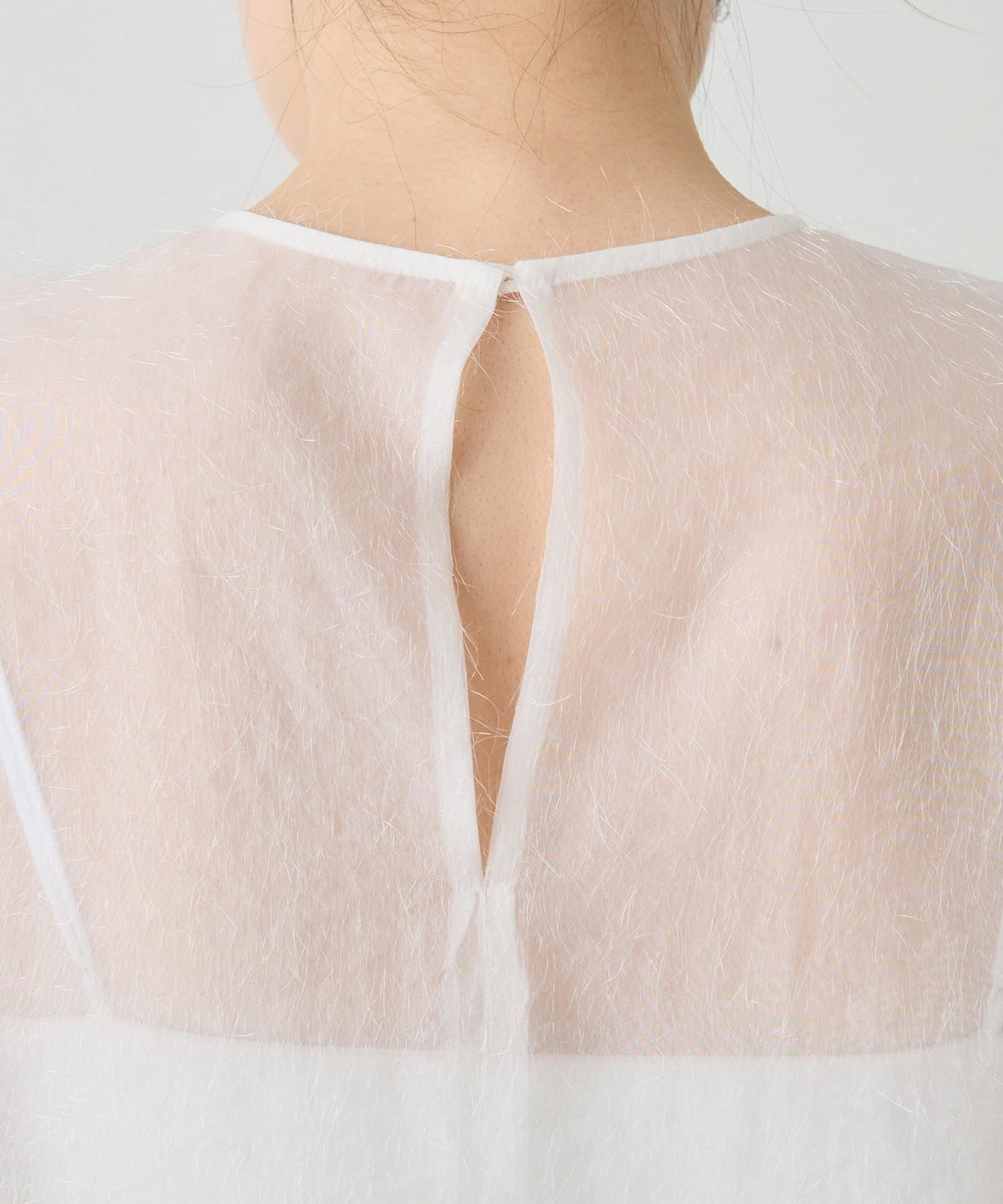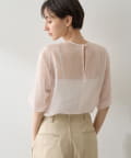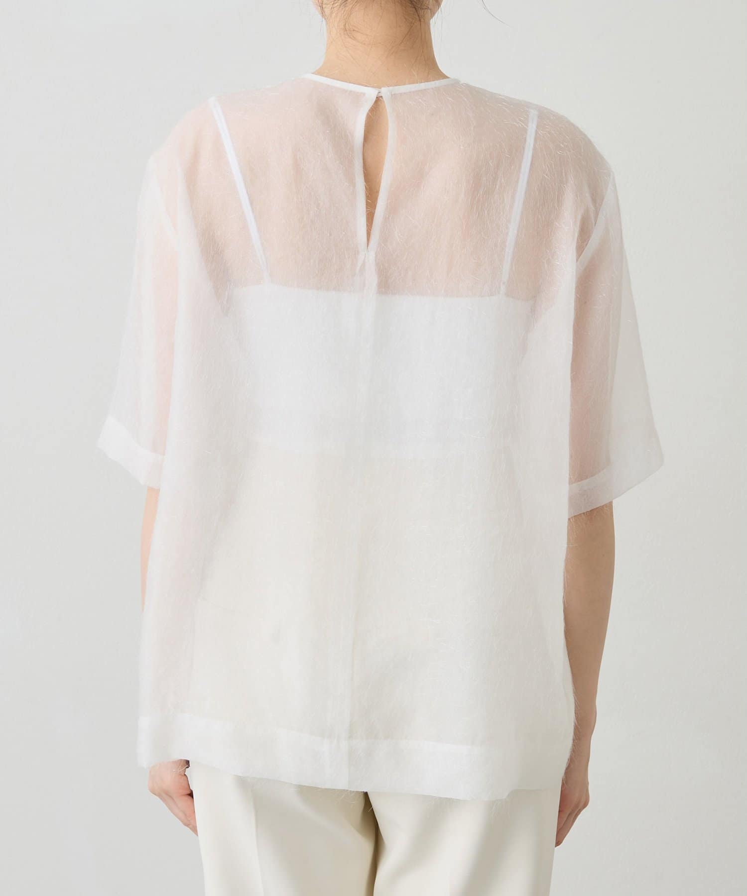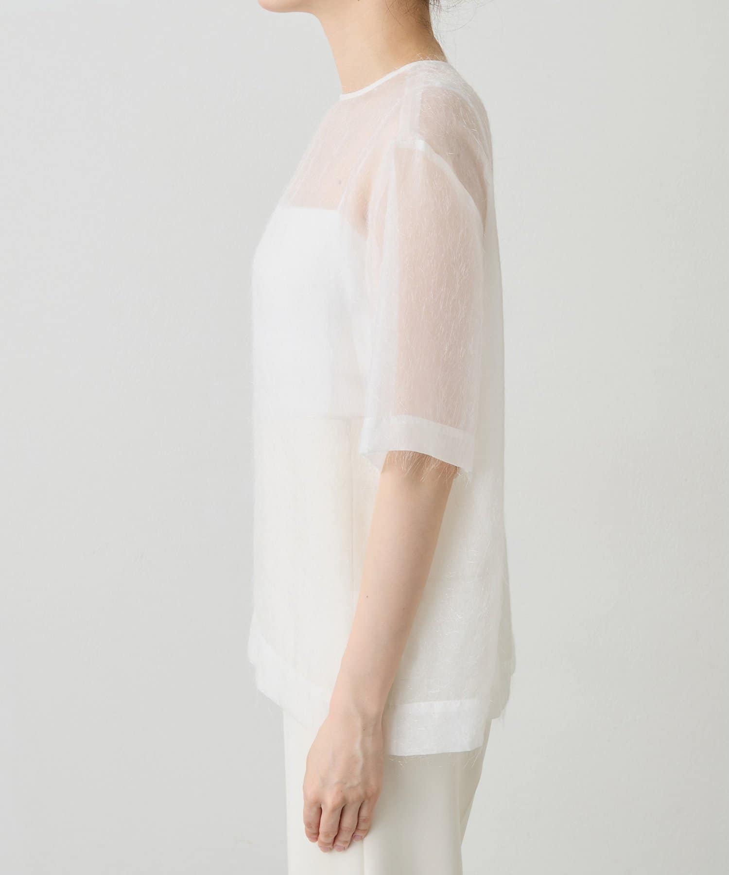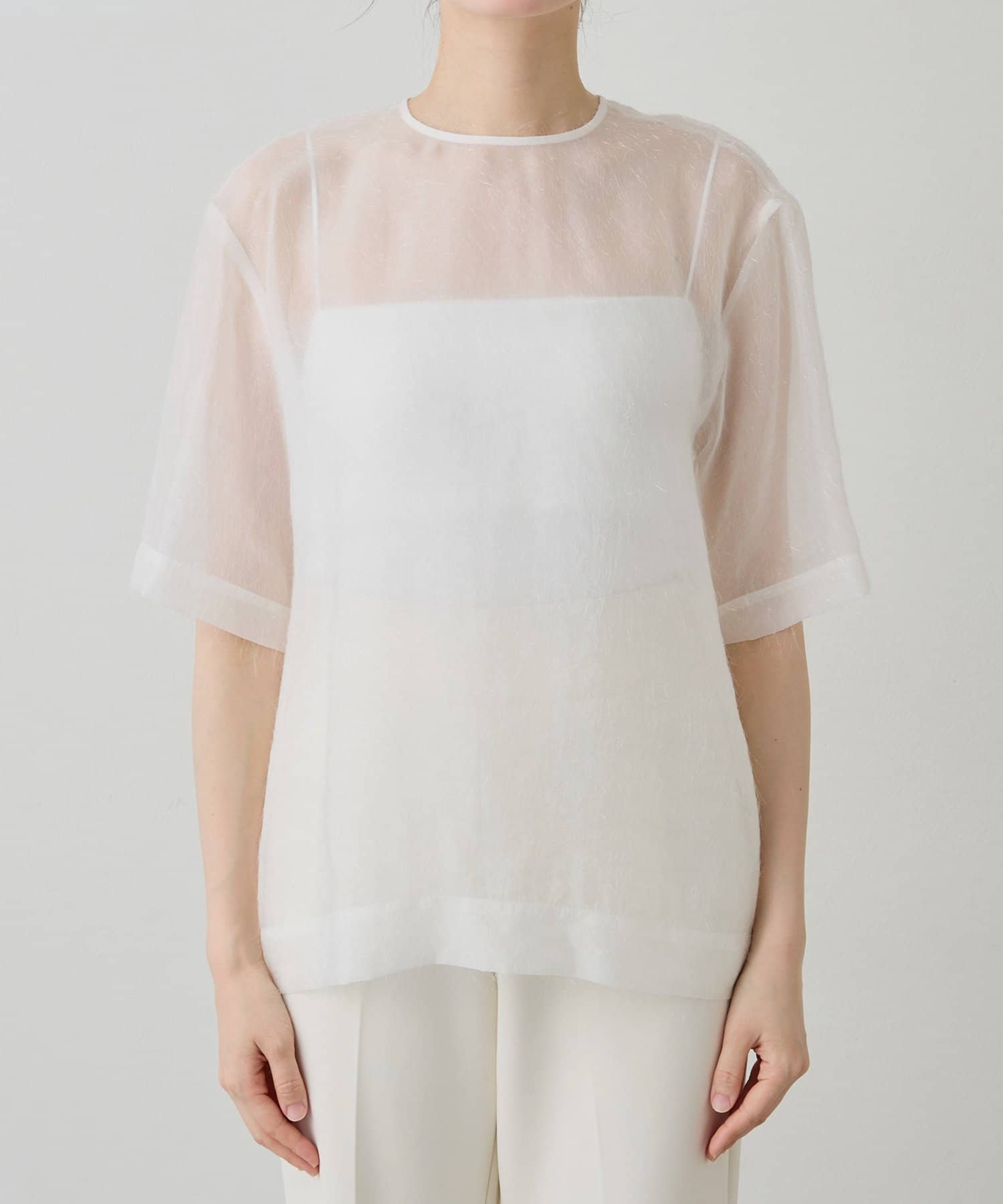 ■シアー感と光沢のあるフェザーのような生地が目を惹くハーフスリーブプルオーバー。