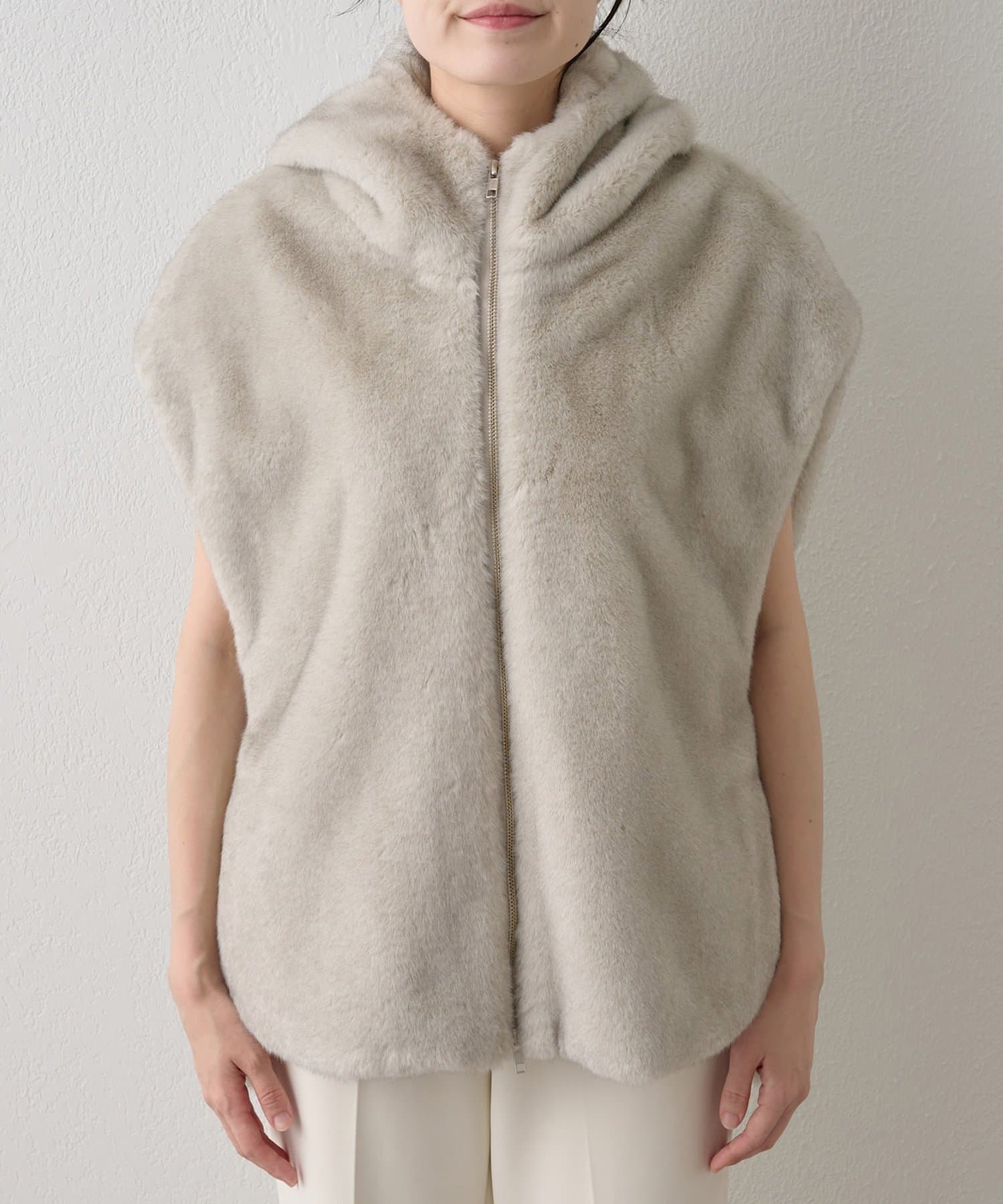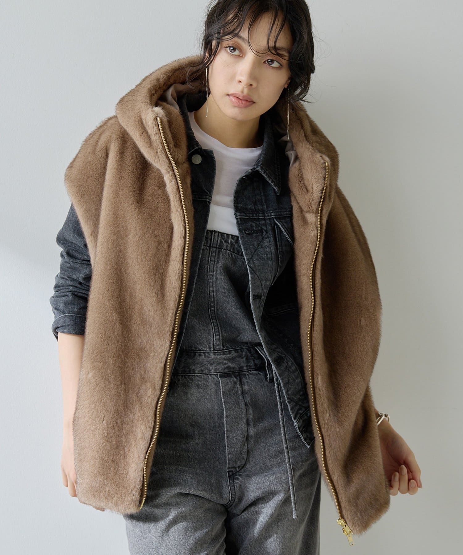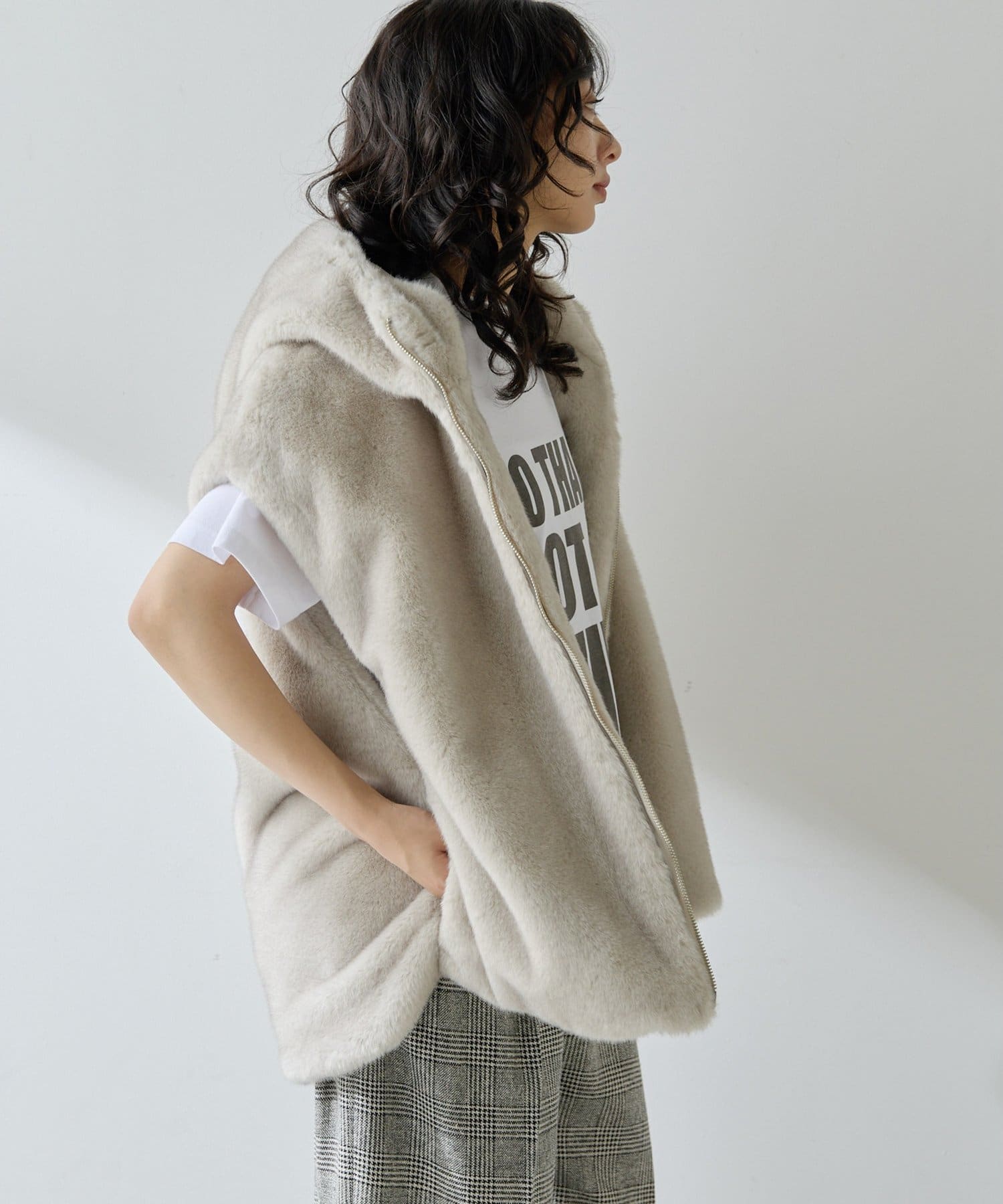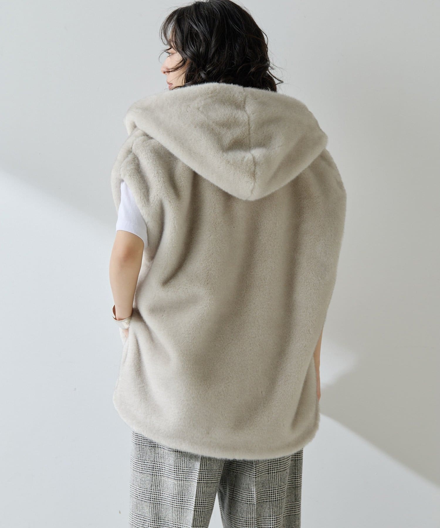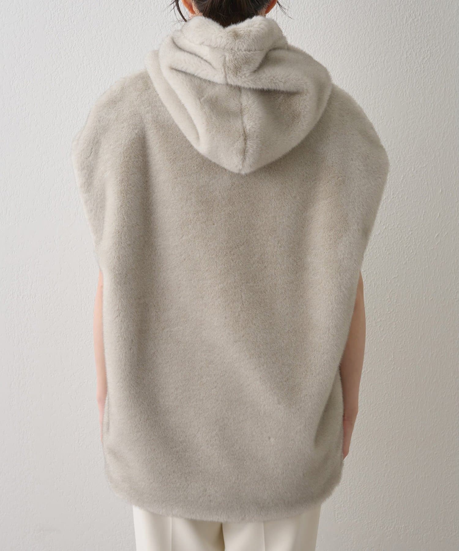 ■フェイクミンクファーを使用したフード付きのノースリーブアウター。