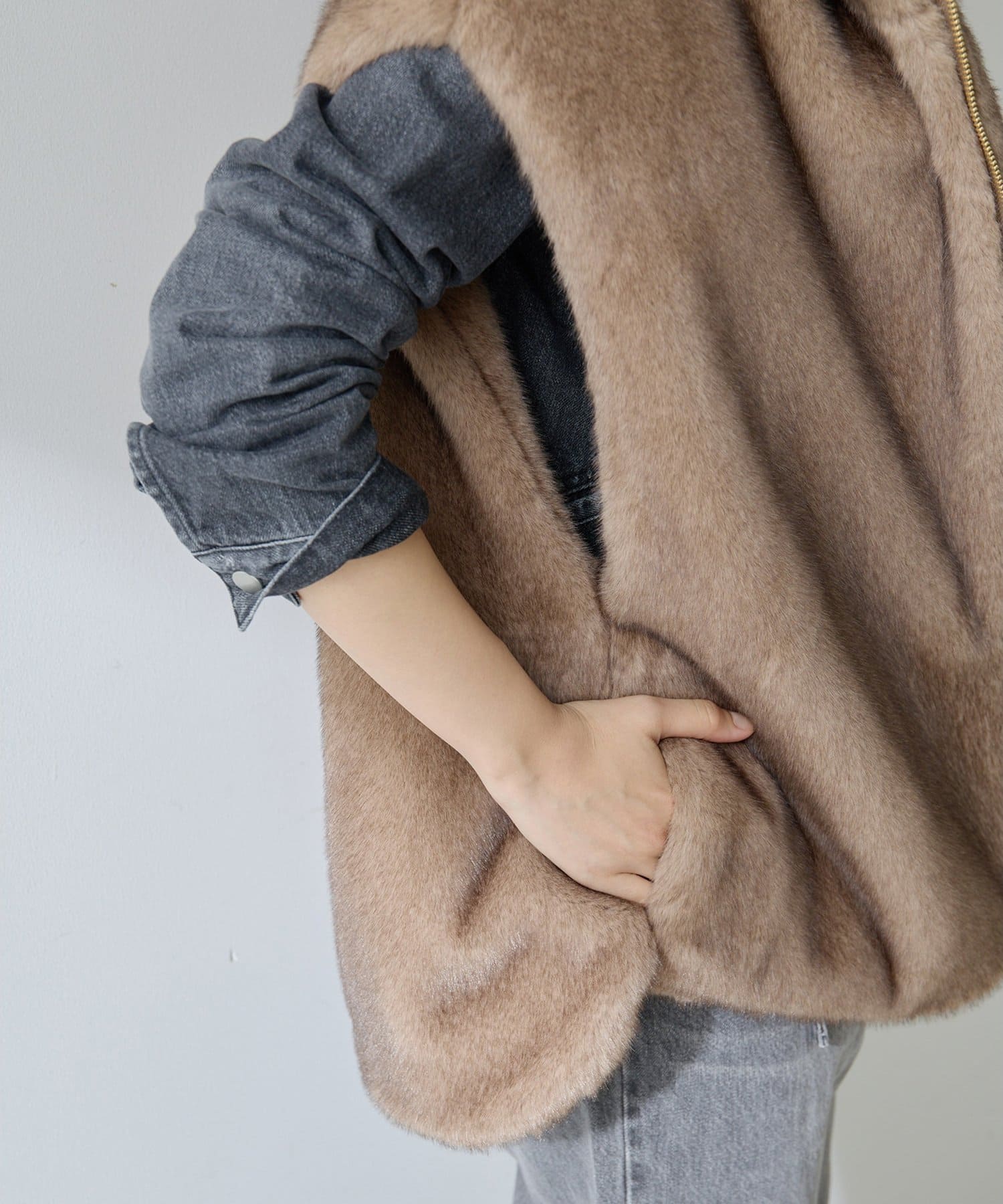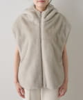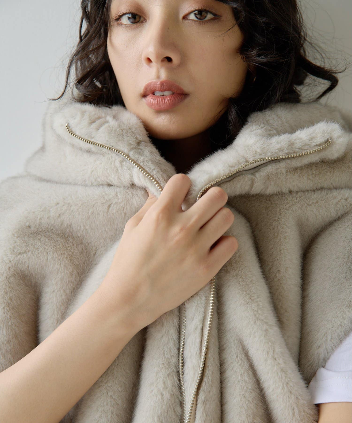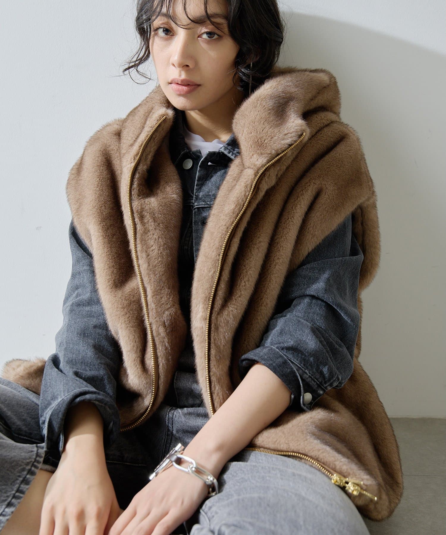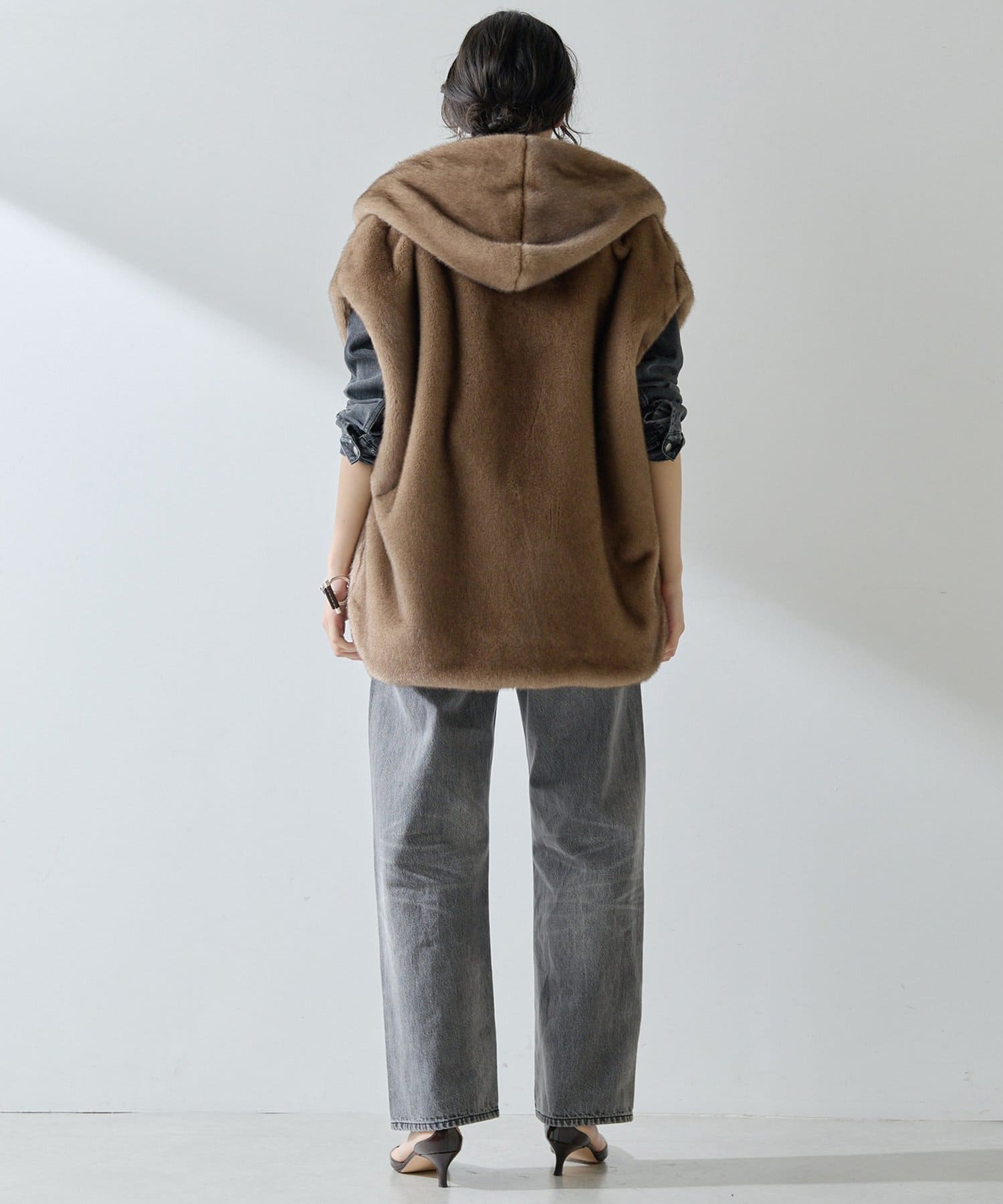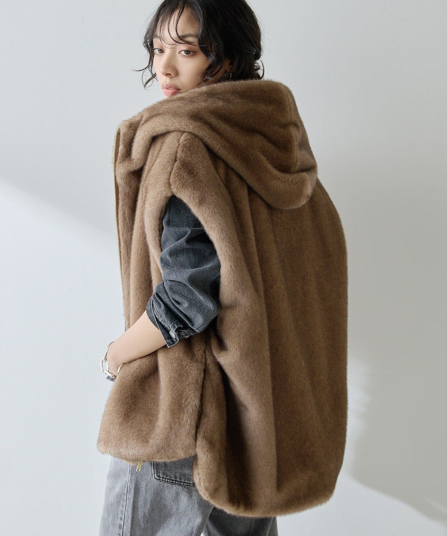 ■フェイクミンクファーを使用したフード付きのノースリーブアウター。