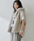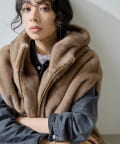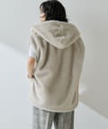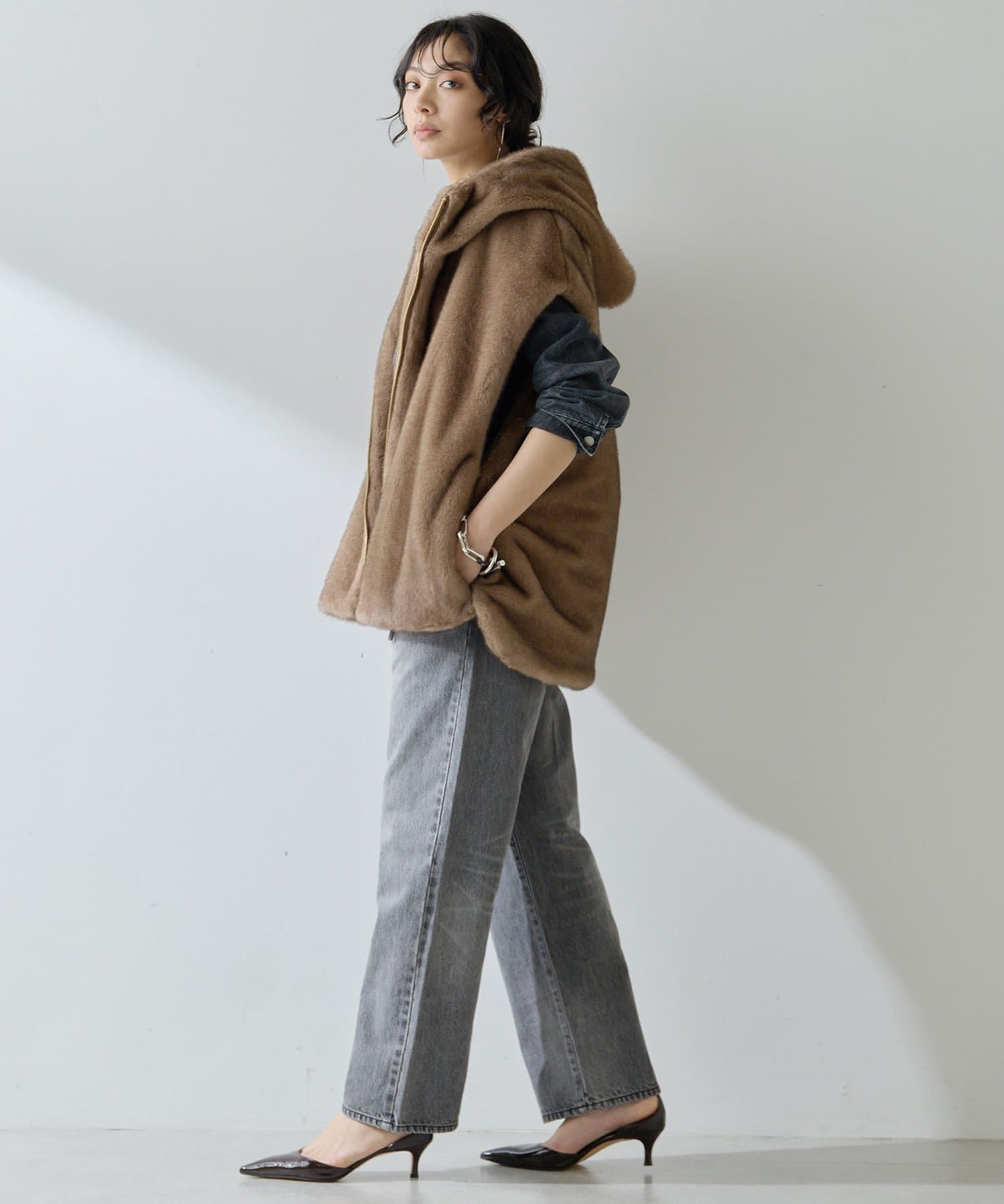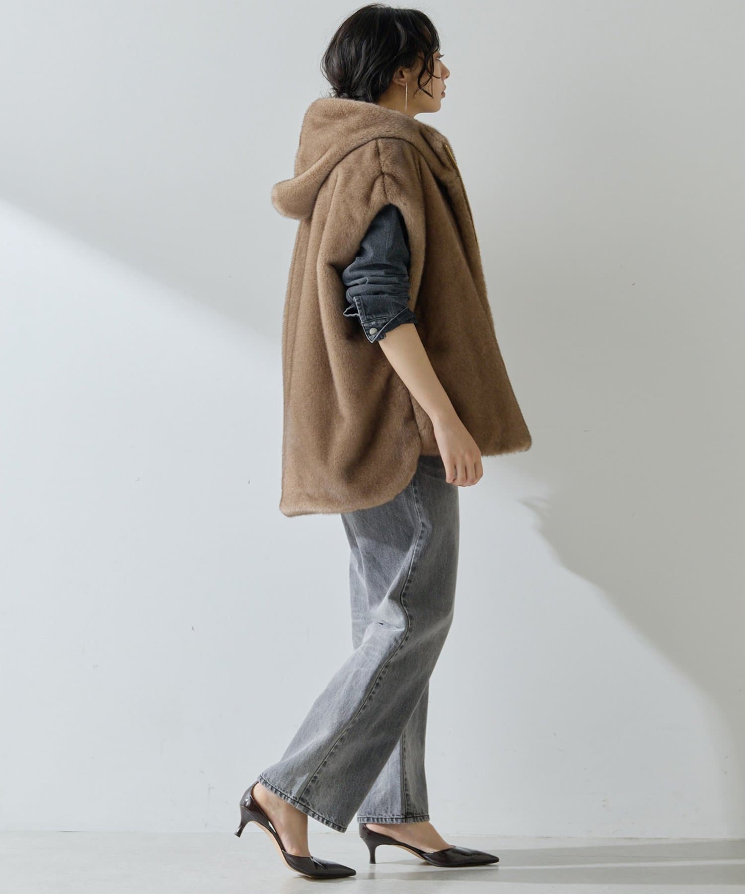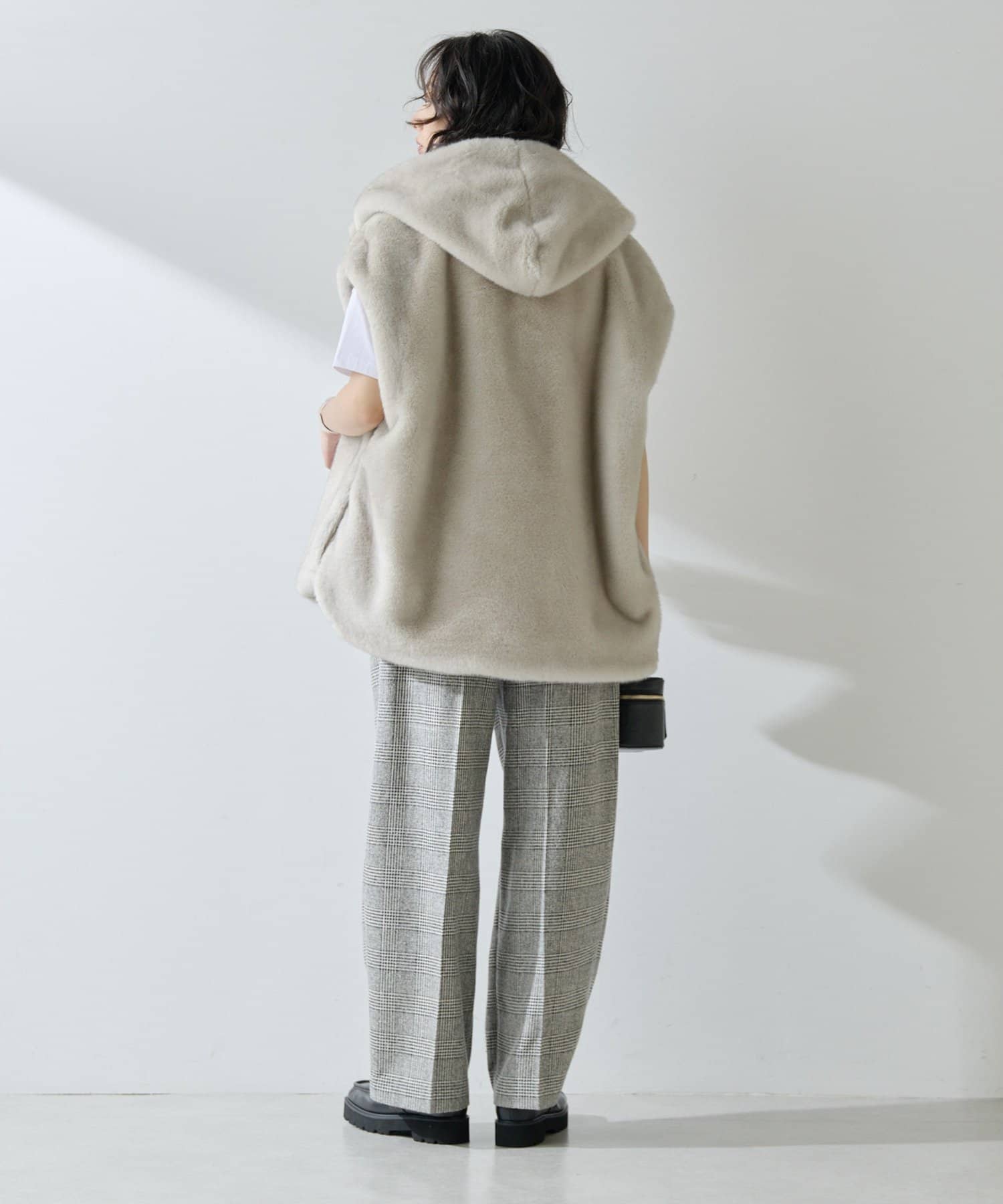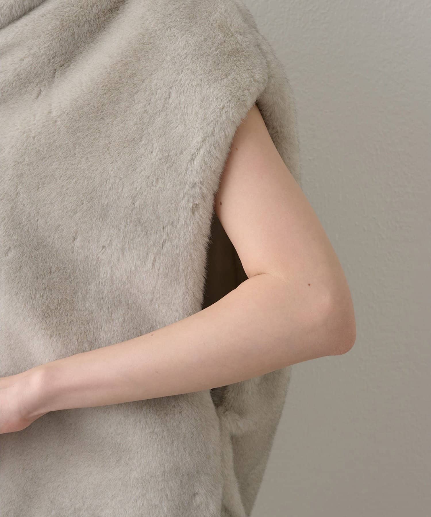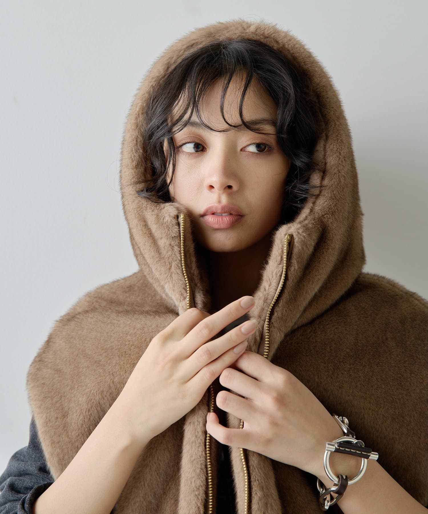 ■フェイクミンクファーを使用したフード付きのノースリーブアウター。