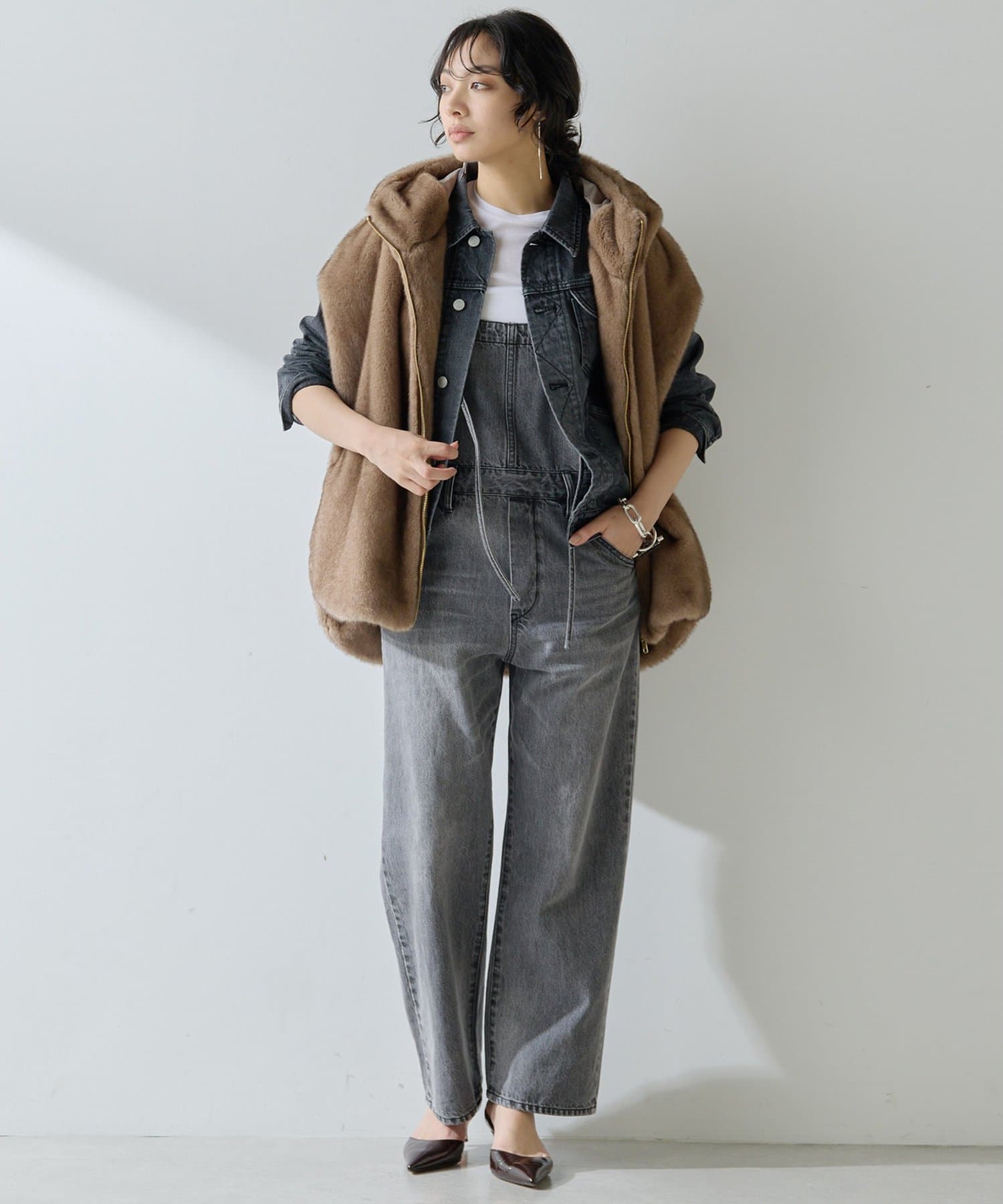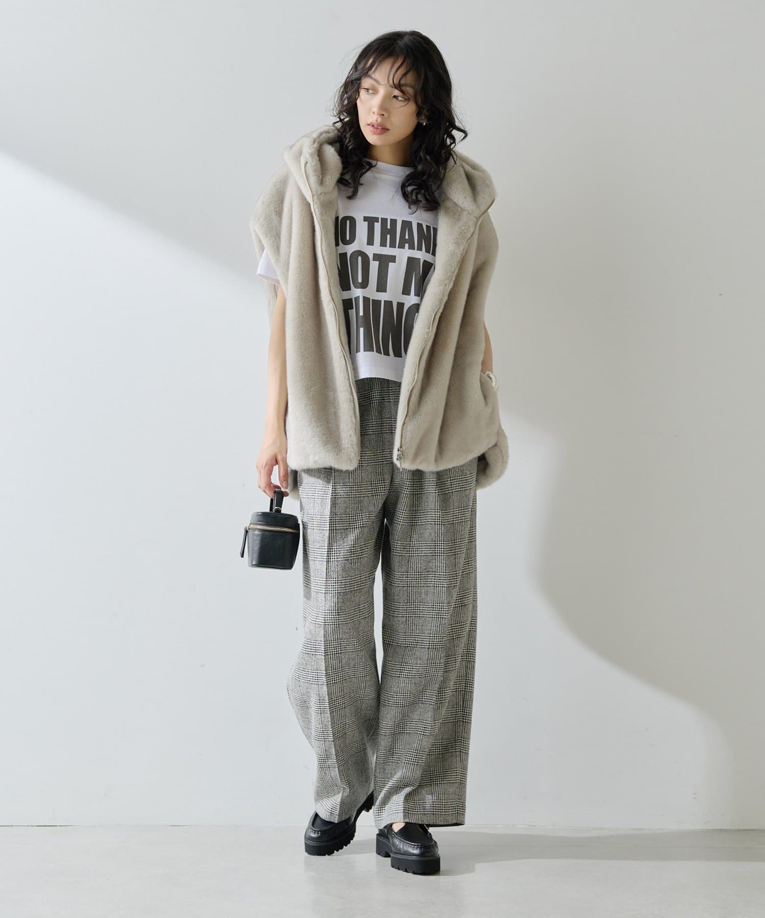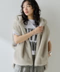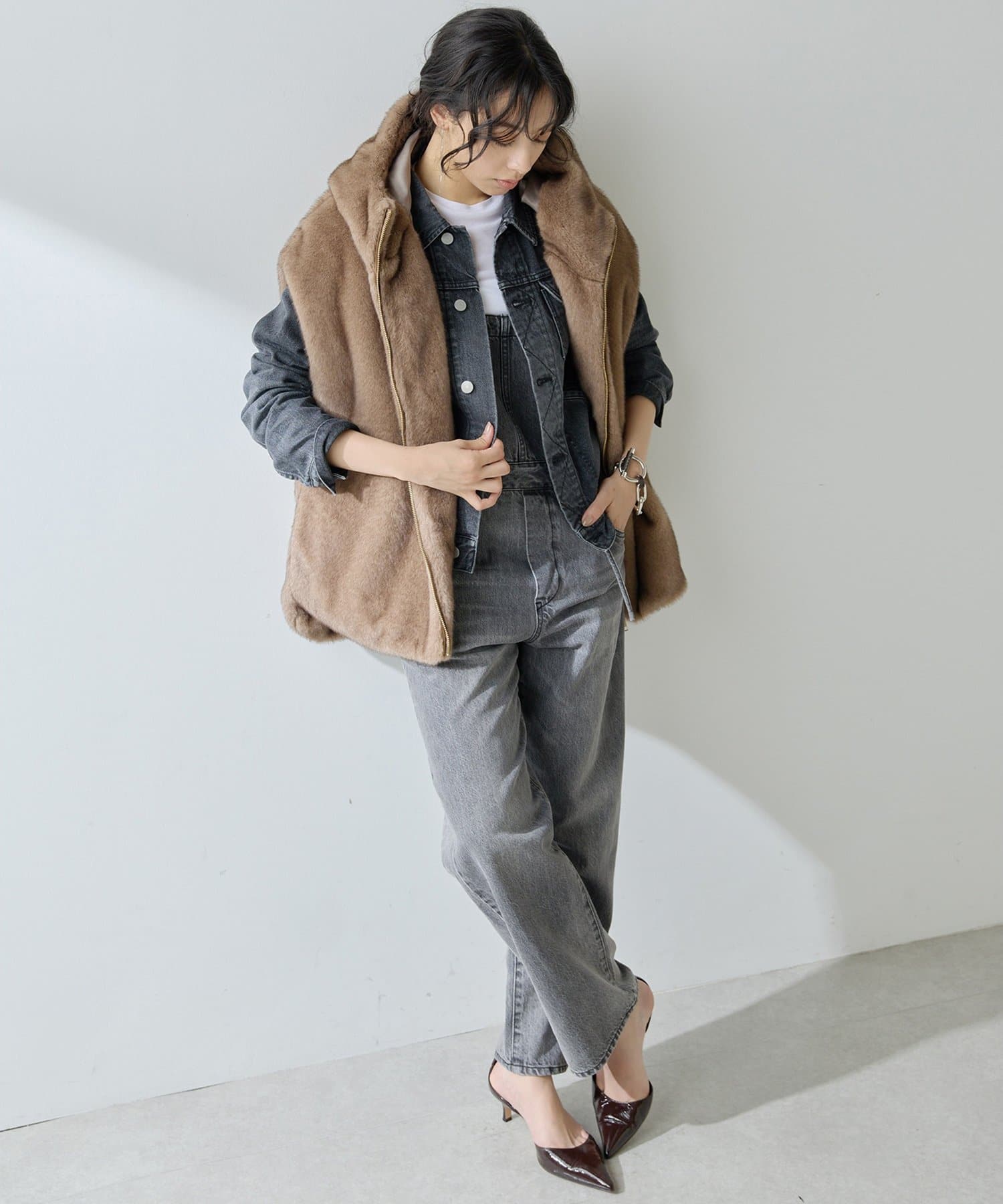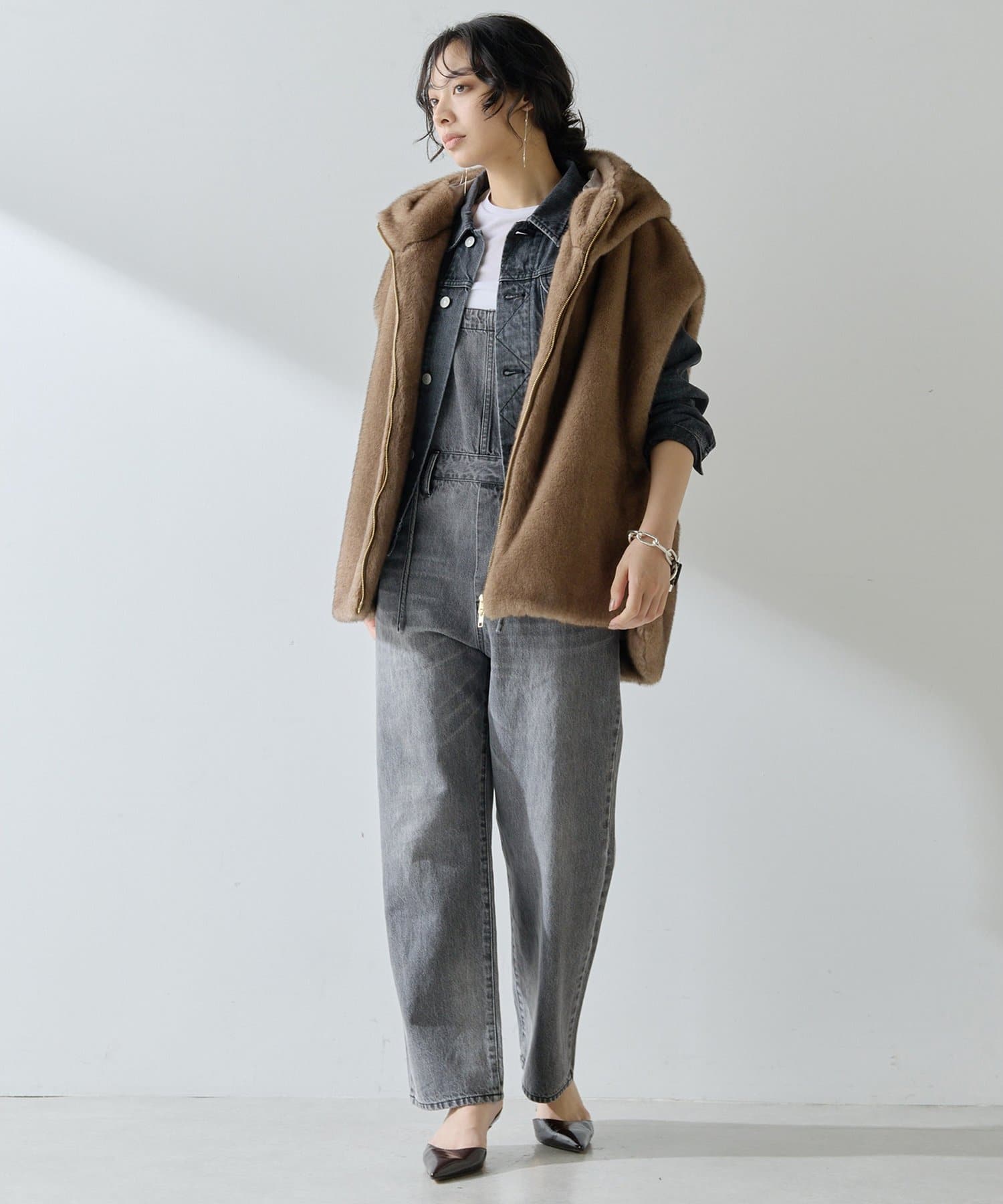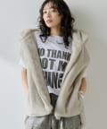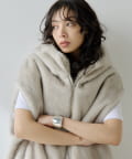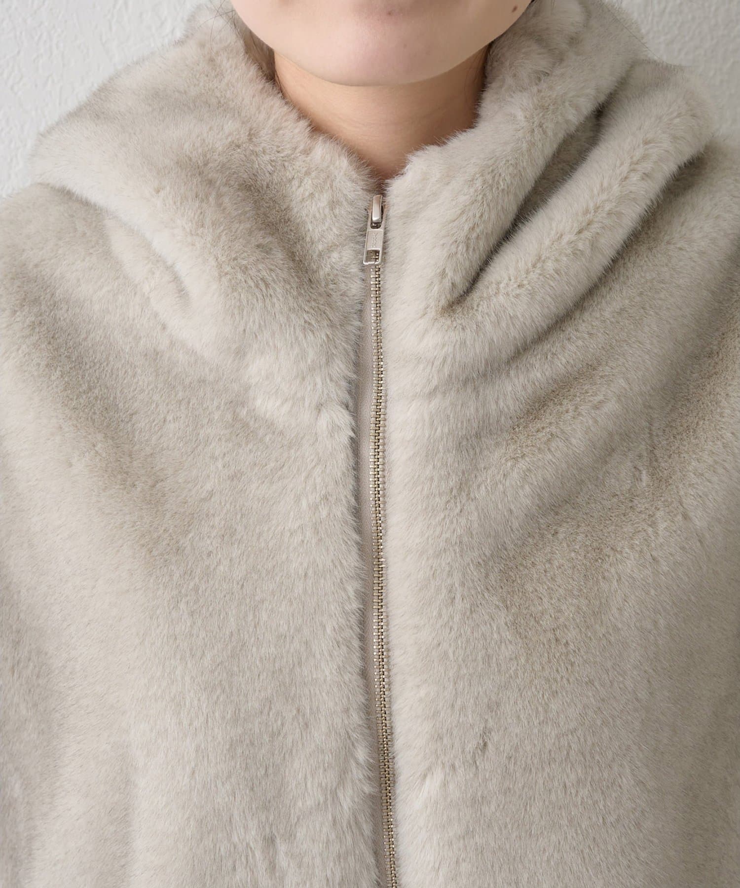 ■フェイクミンクファーを使用したフード付きのノースリーブアウター。