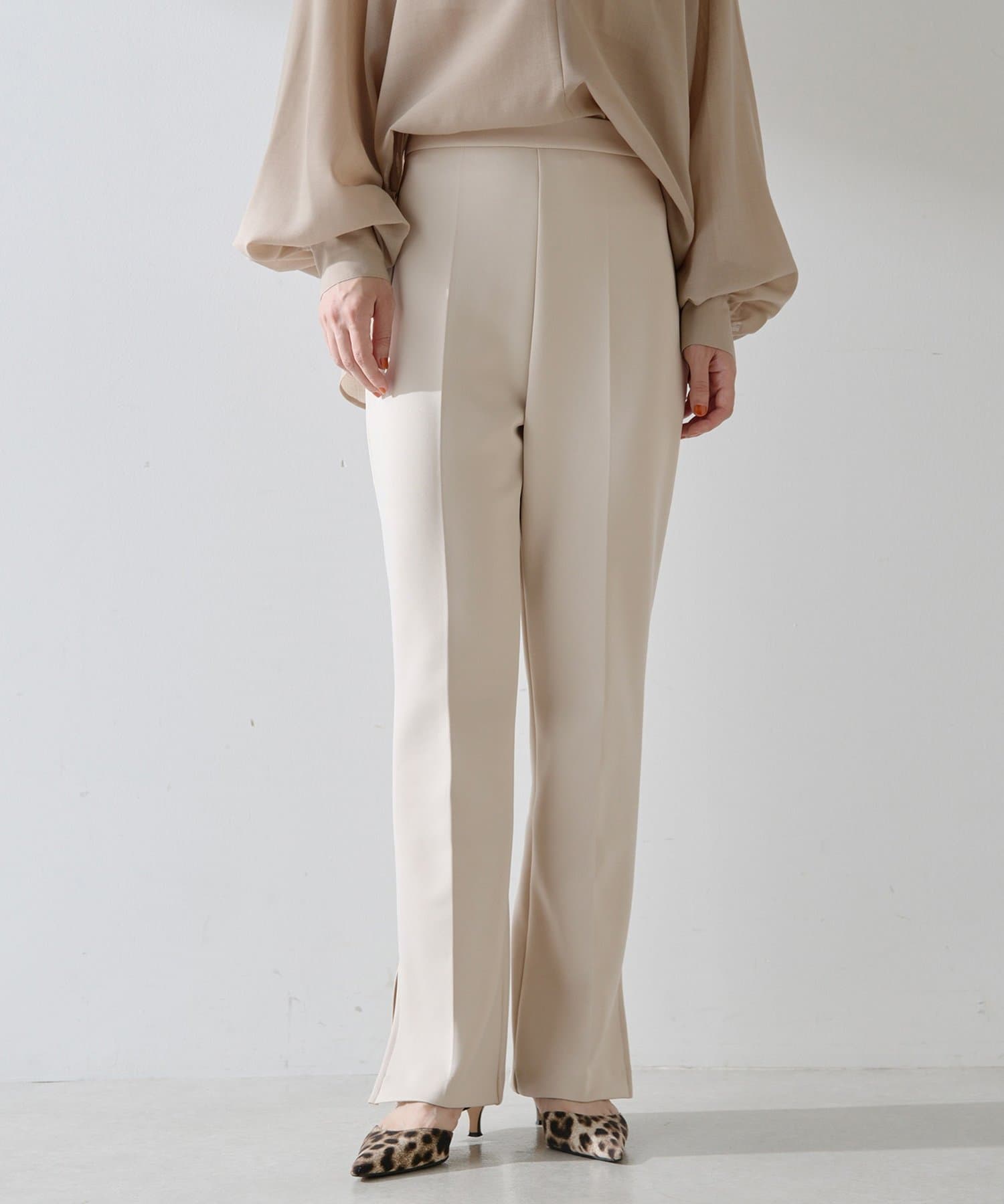 ■センタープレスやサイドスリットデザインが美脚効果抜群のストレッチパンツ。