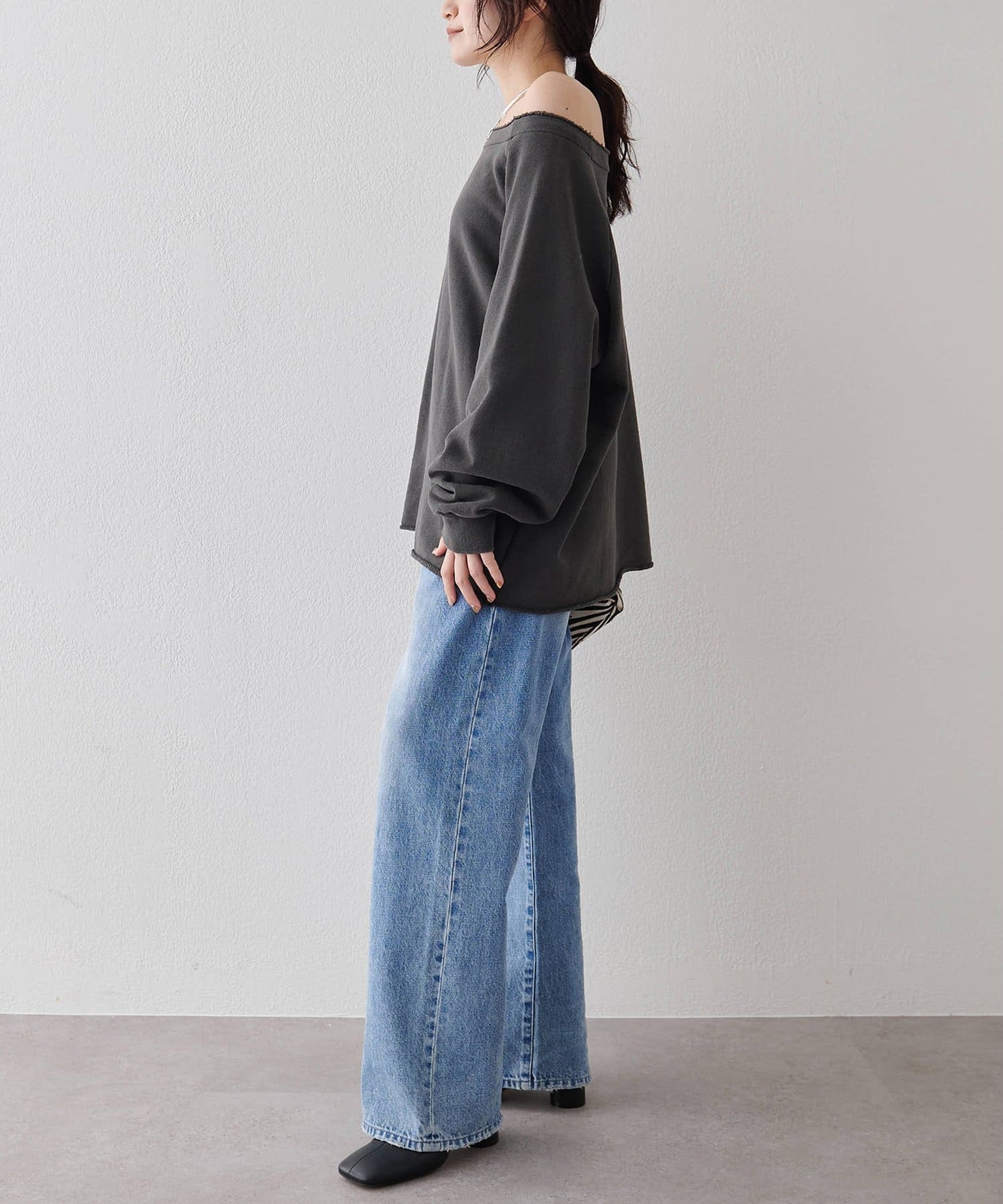 ■メンズライクなシルエットに横に開いたネックラインが抜け感をプラス。