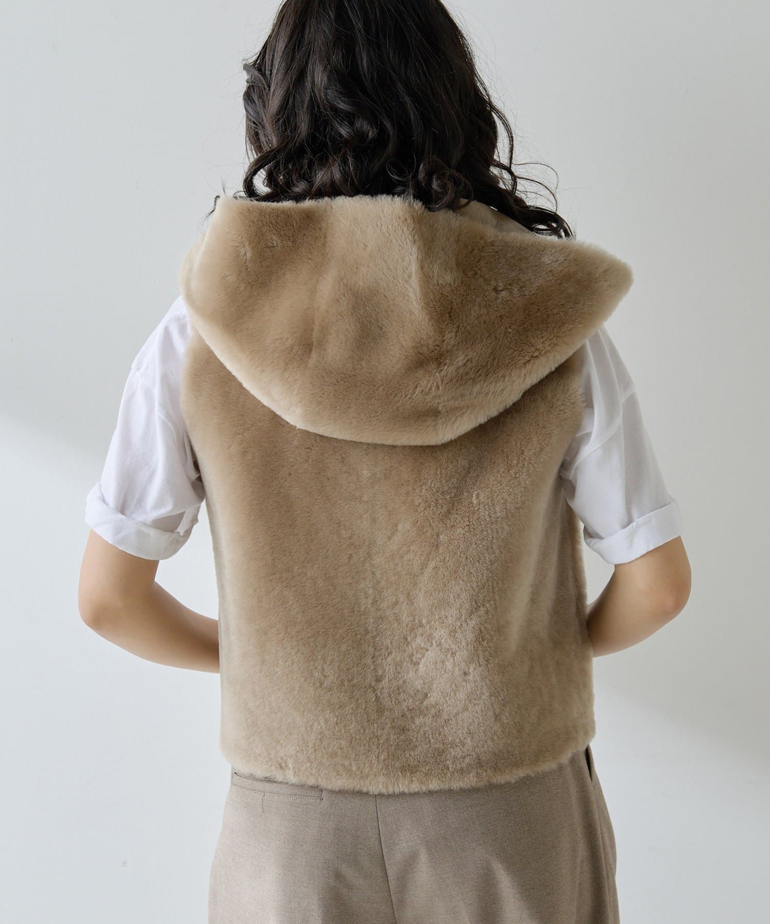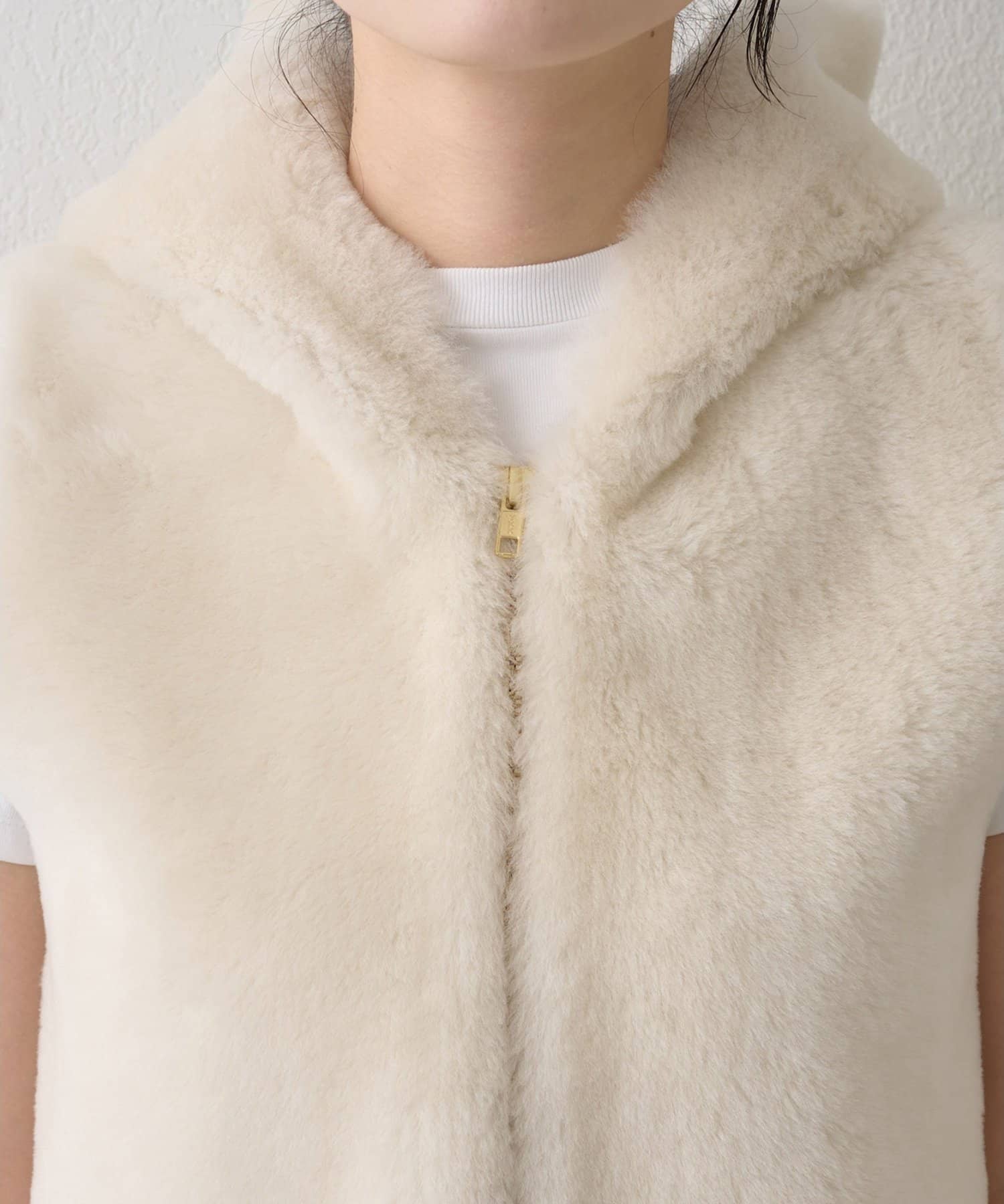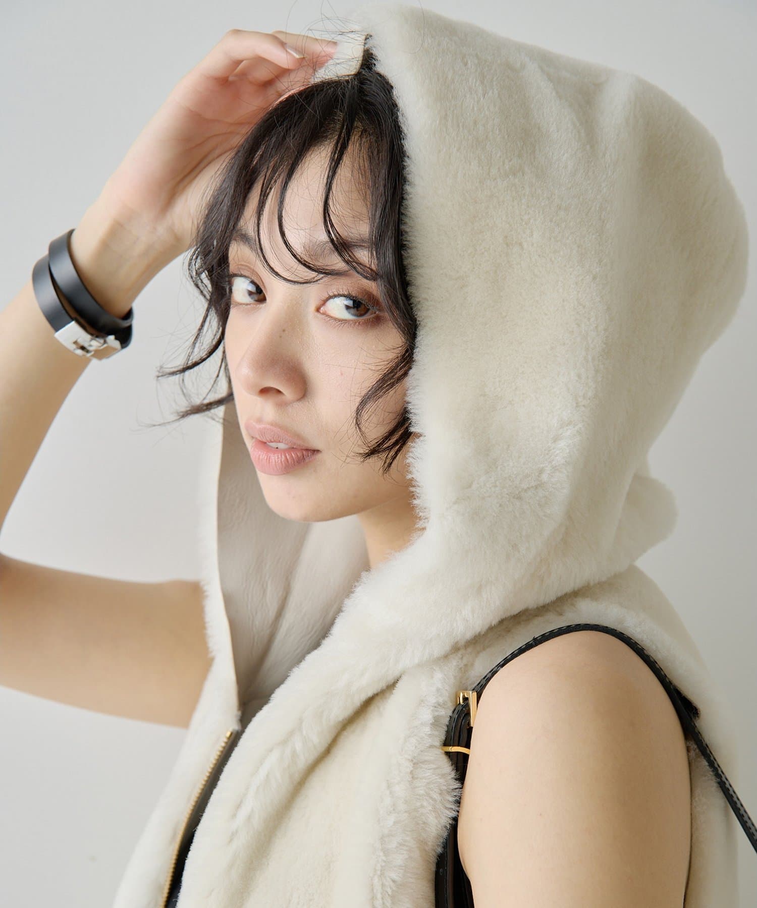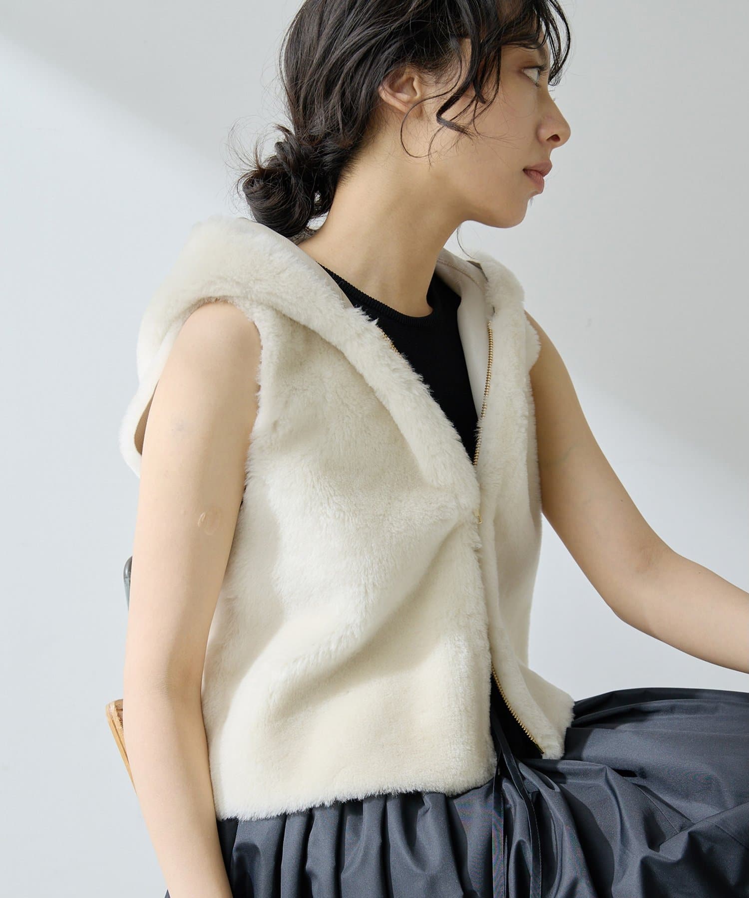 ■ハイクオリティな素材感を活かしたフード付きのムートンベスト。