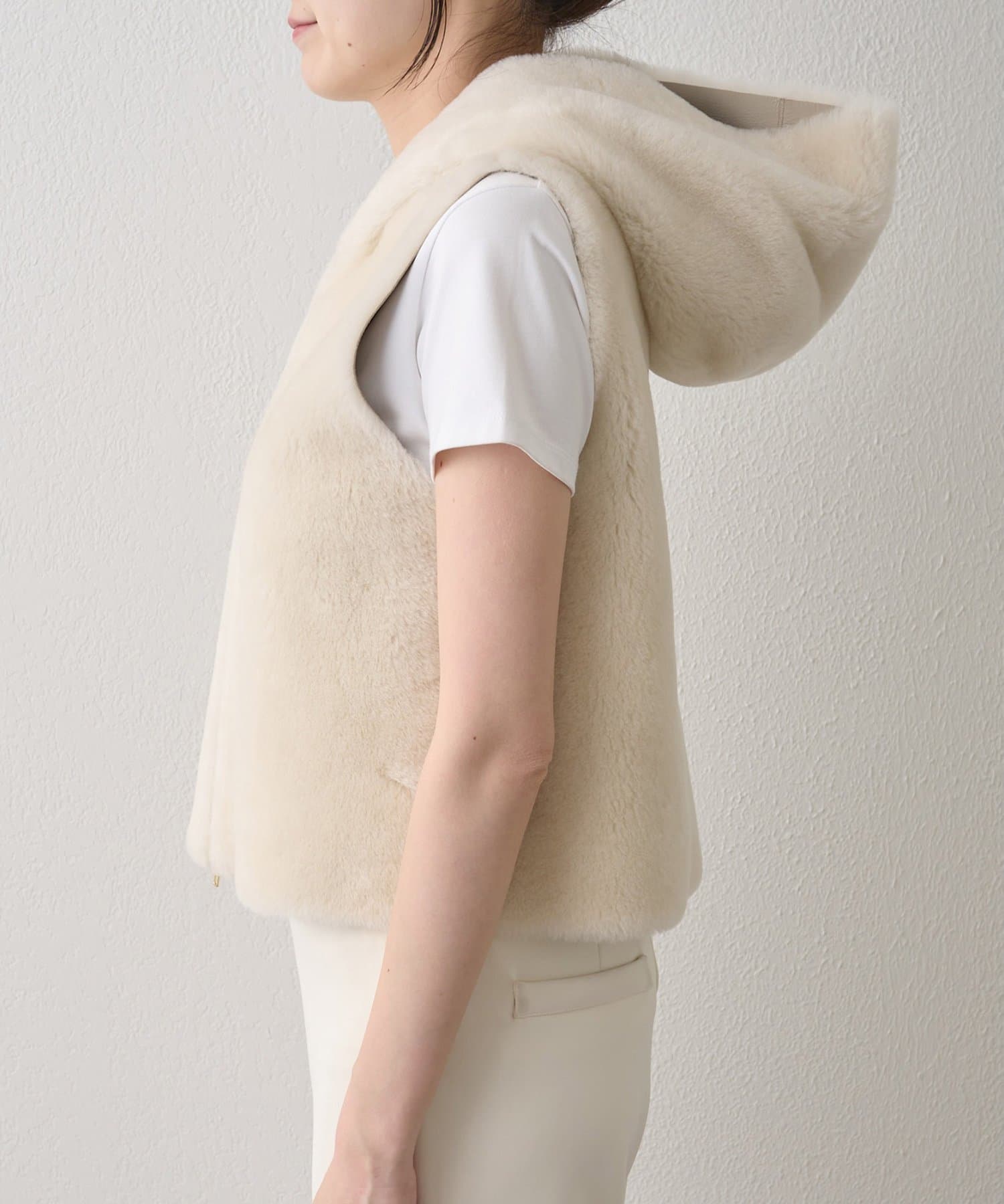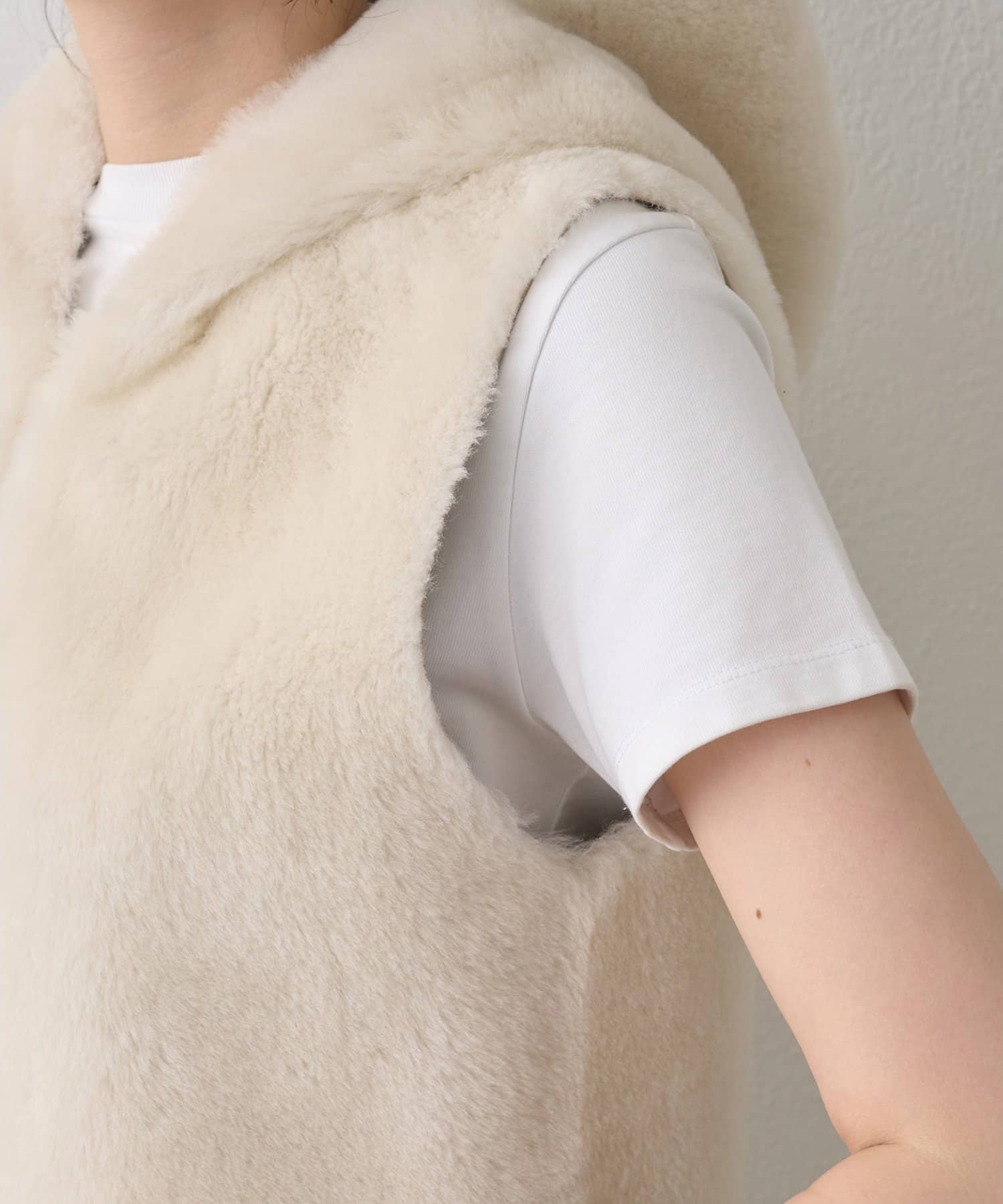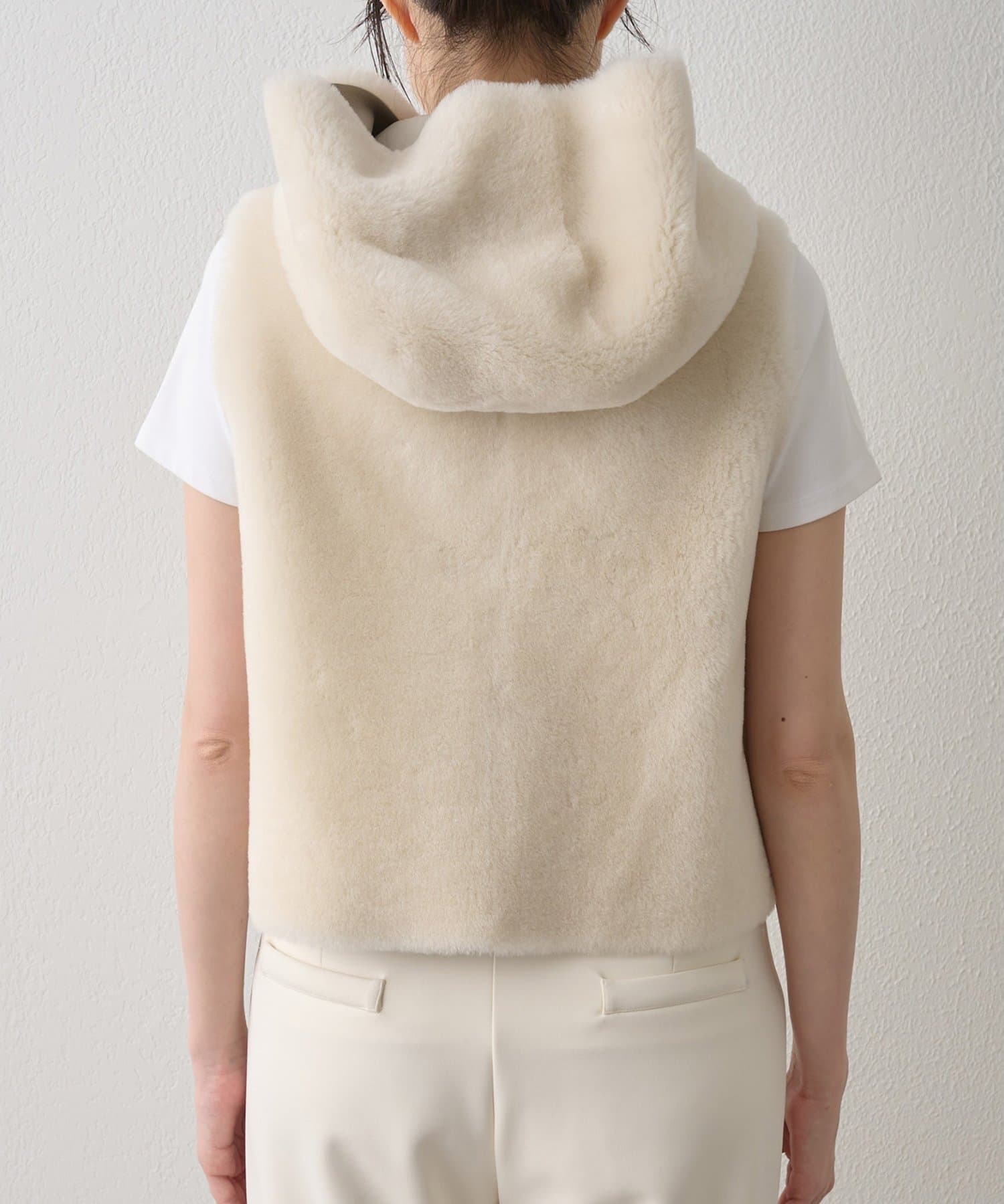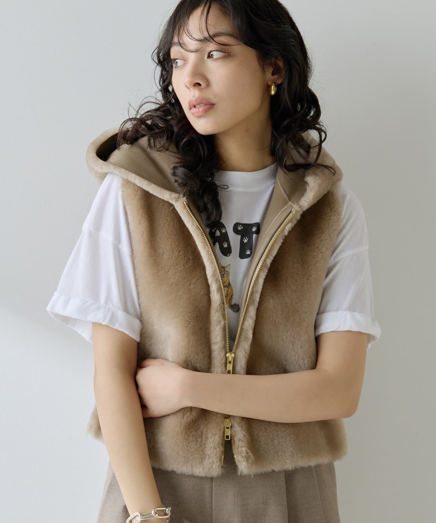 ■ハイクオリティな素材感を活かしたフード付きのムートンベスト。