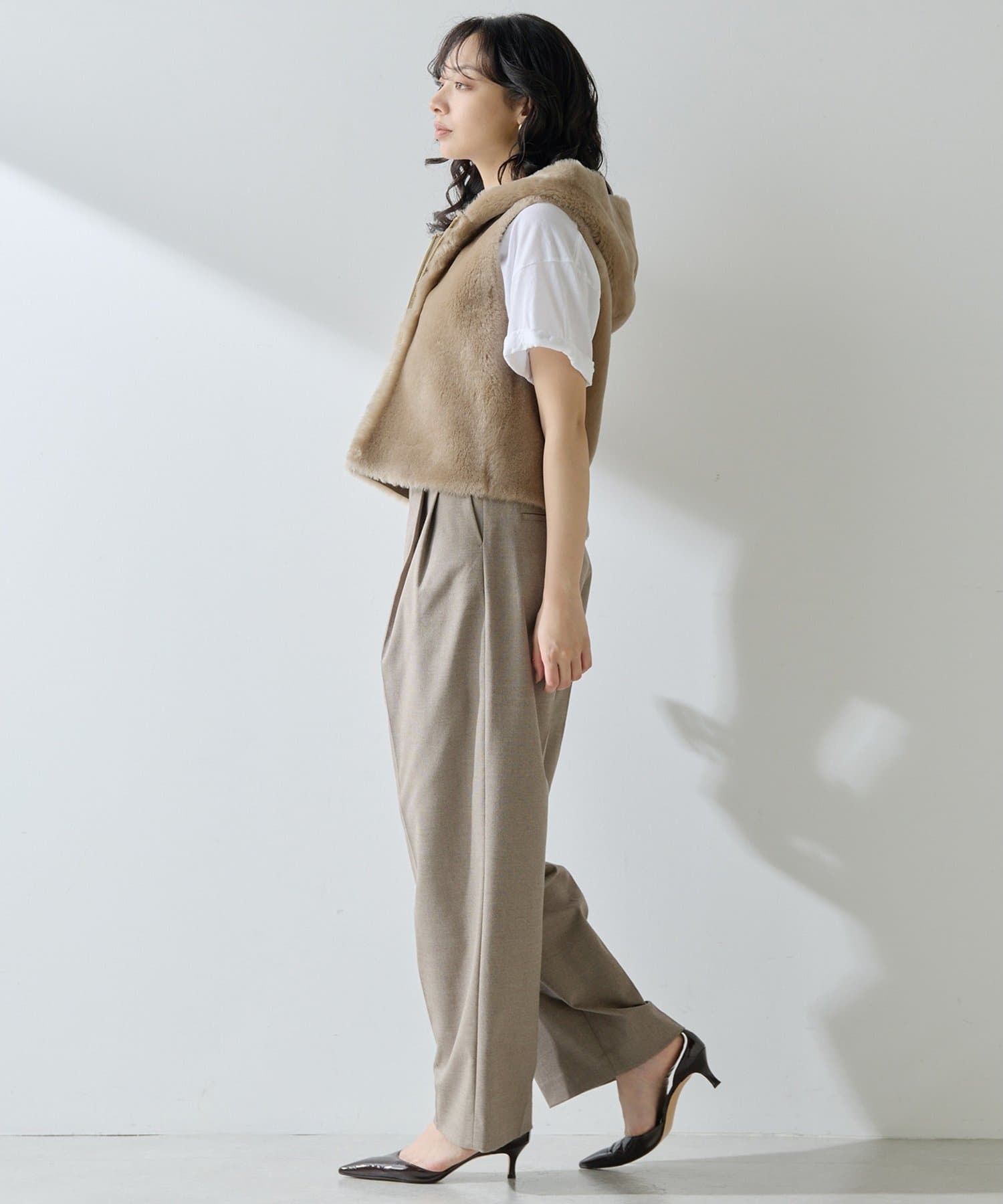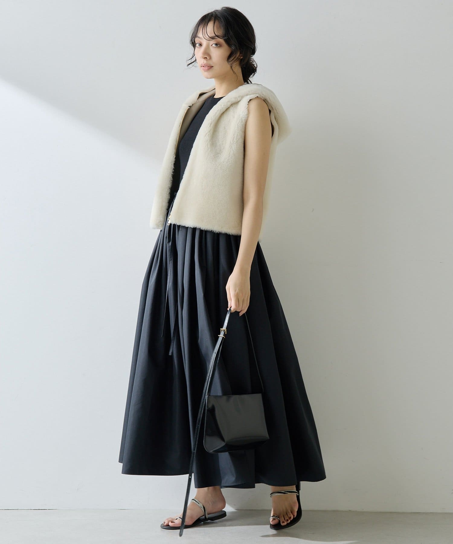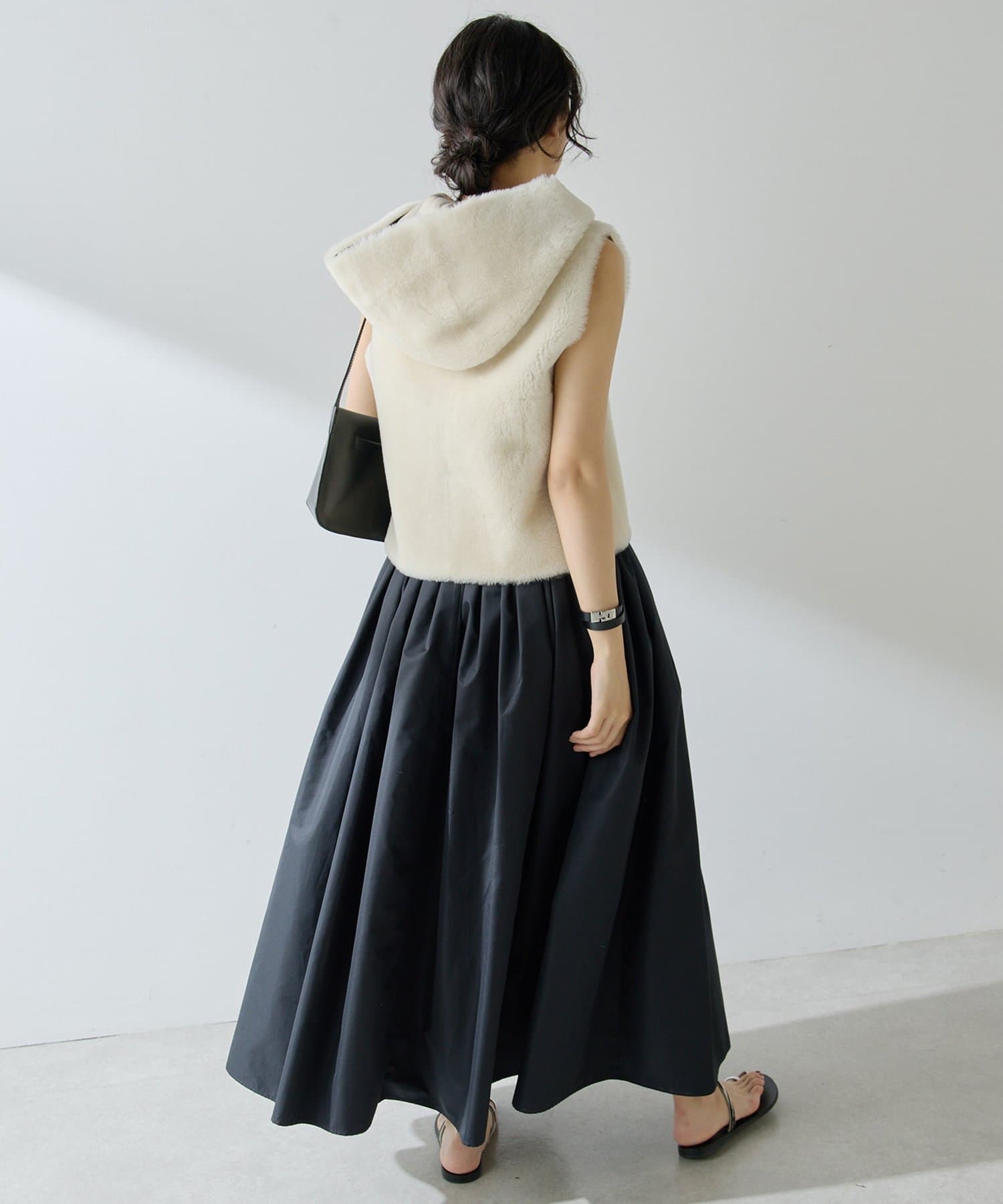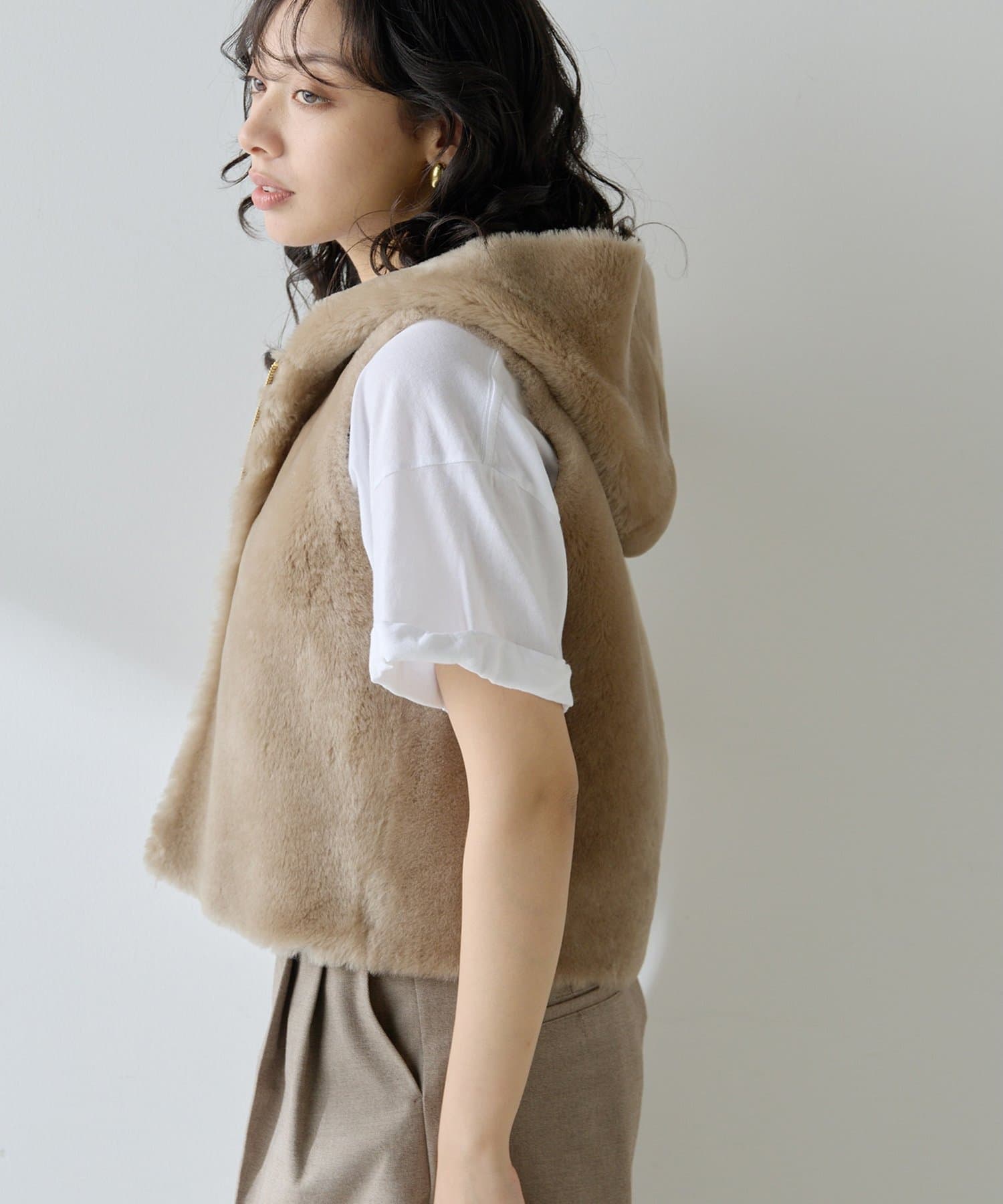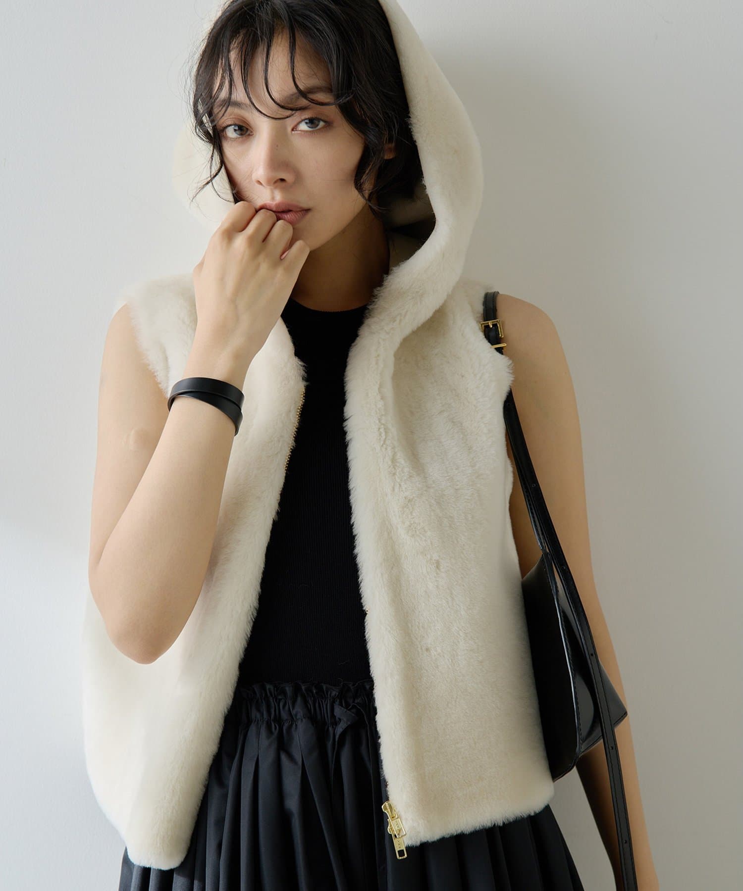 秋冬の装いをクラスアップ出来る、フード付きムートンジレ