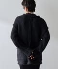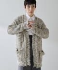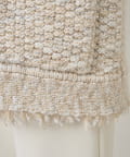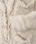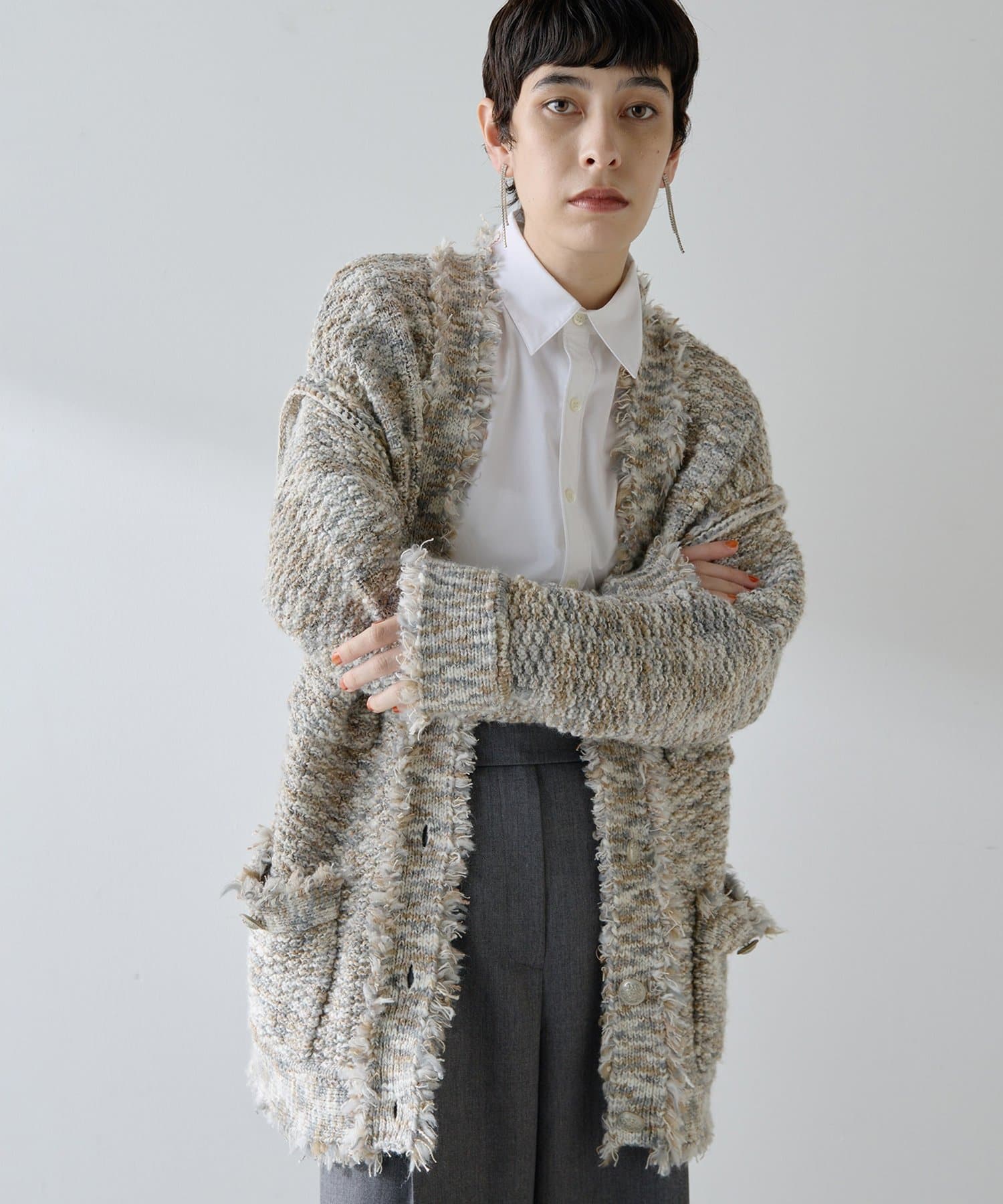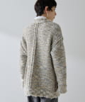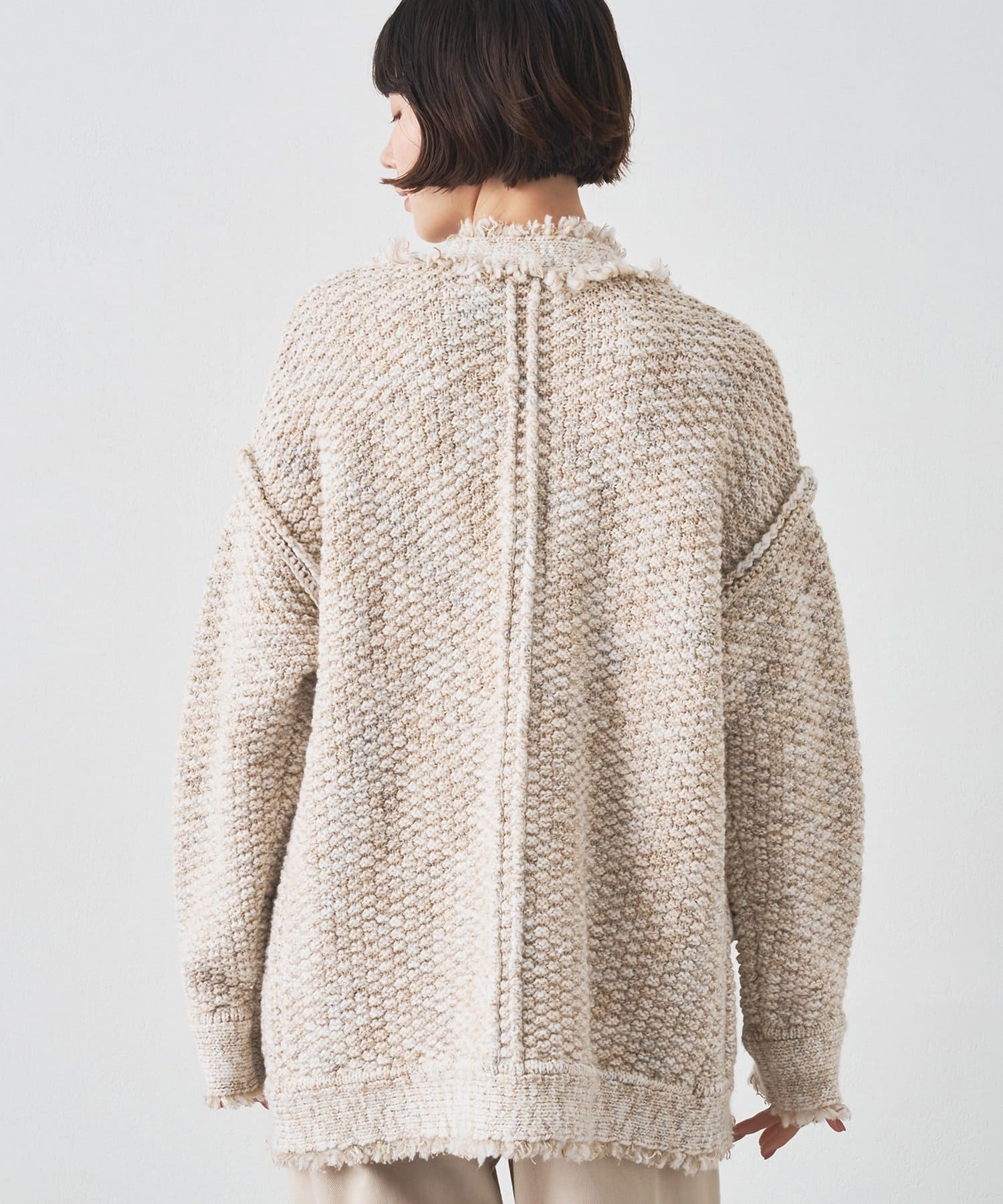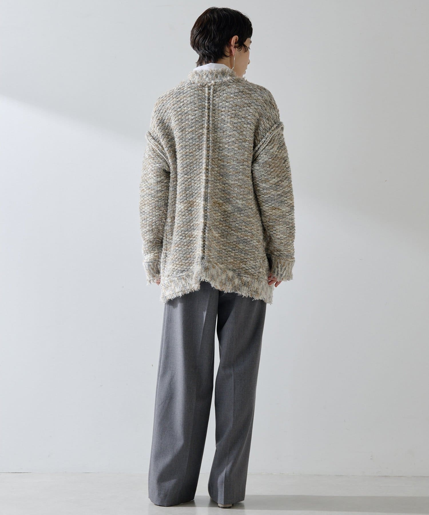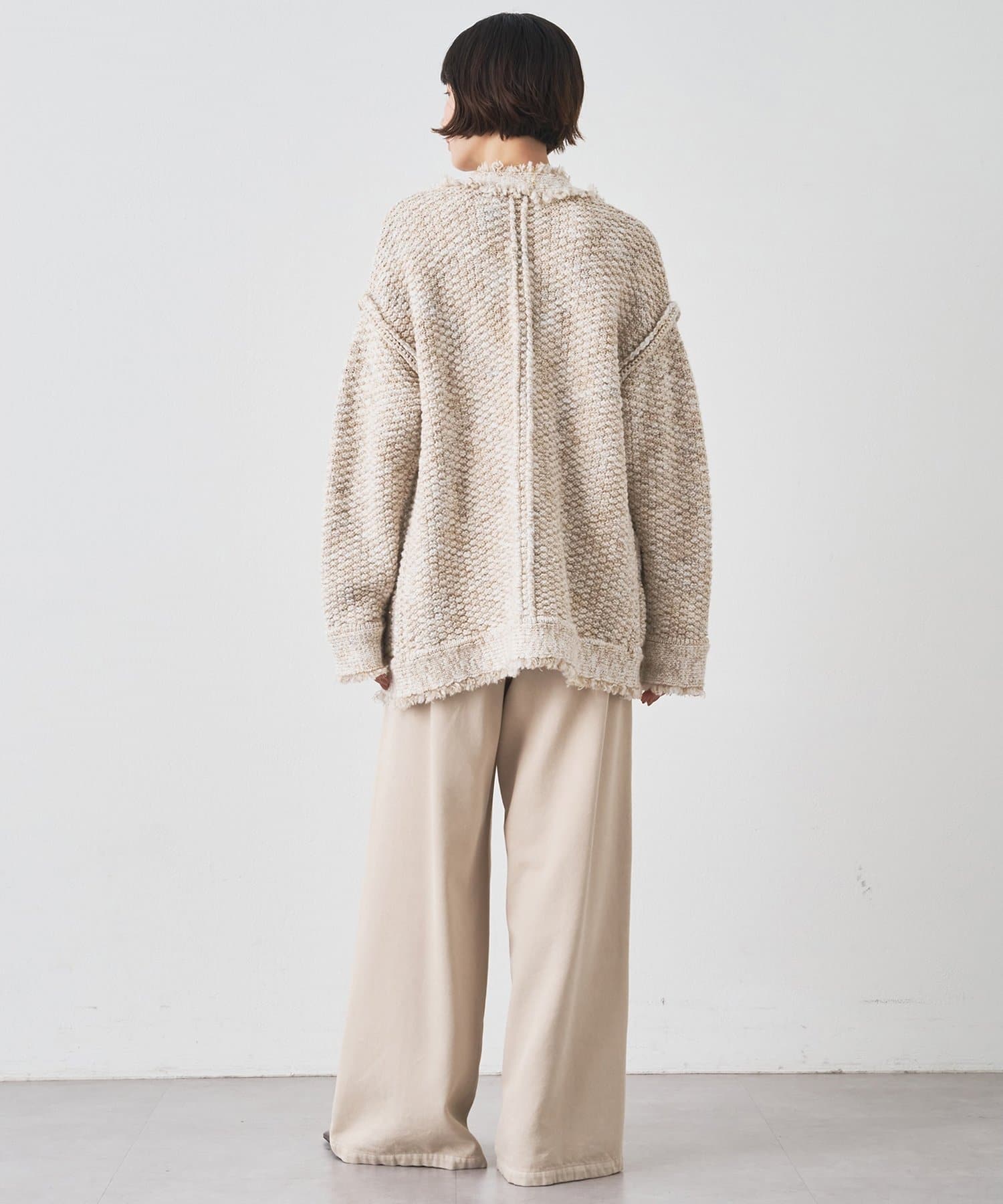 バルキータイプのアクリルと、カスリ染をした太スラブの糸の2種類の糸を組み合わせてツイード調の編地を表現した素材。