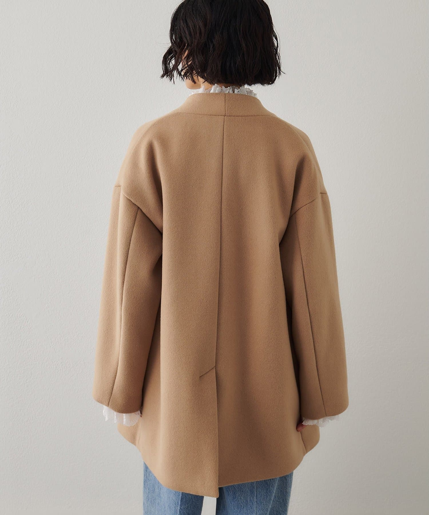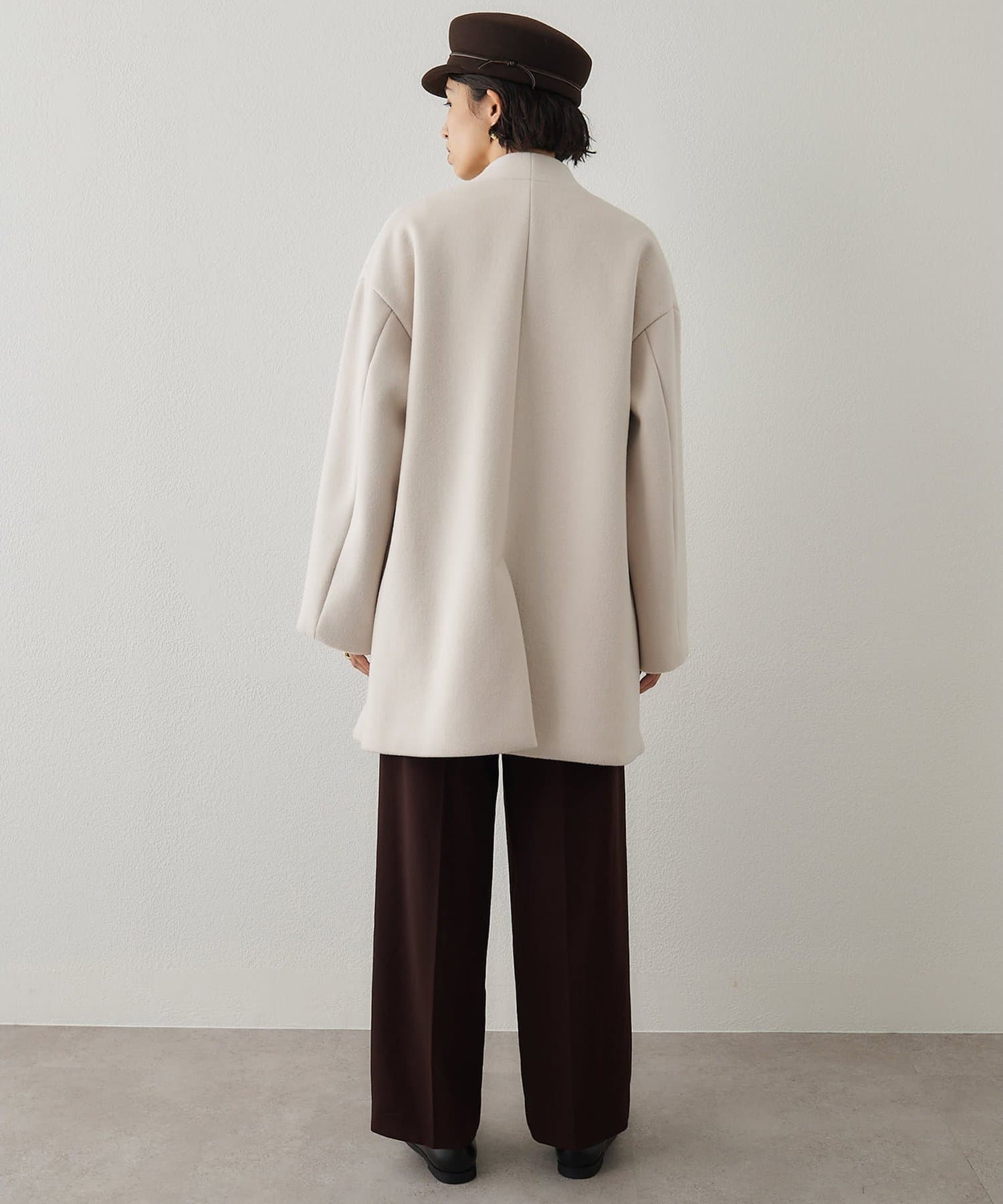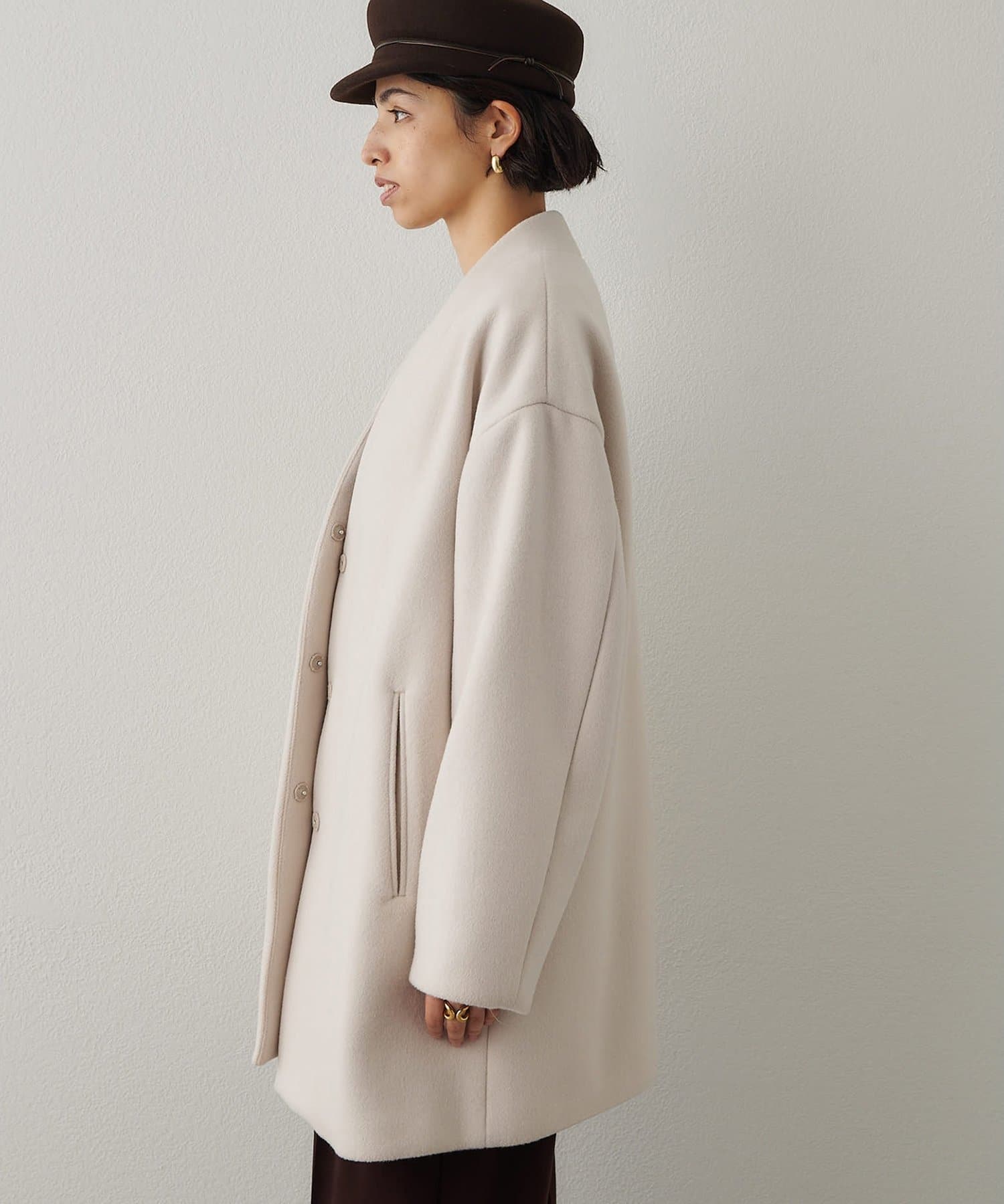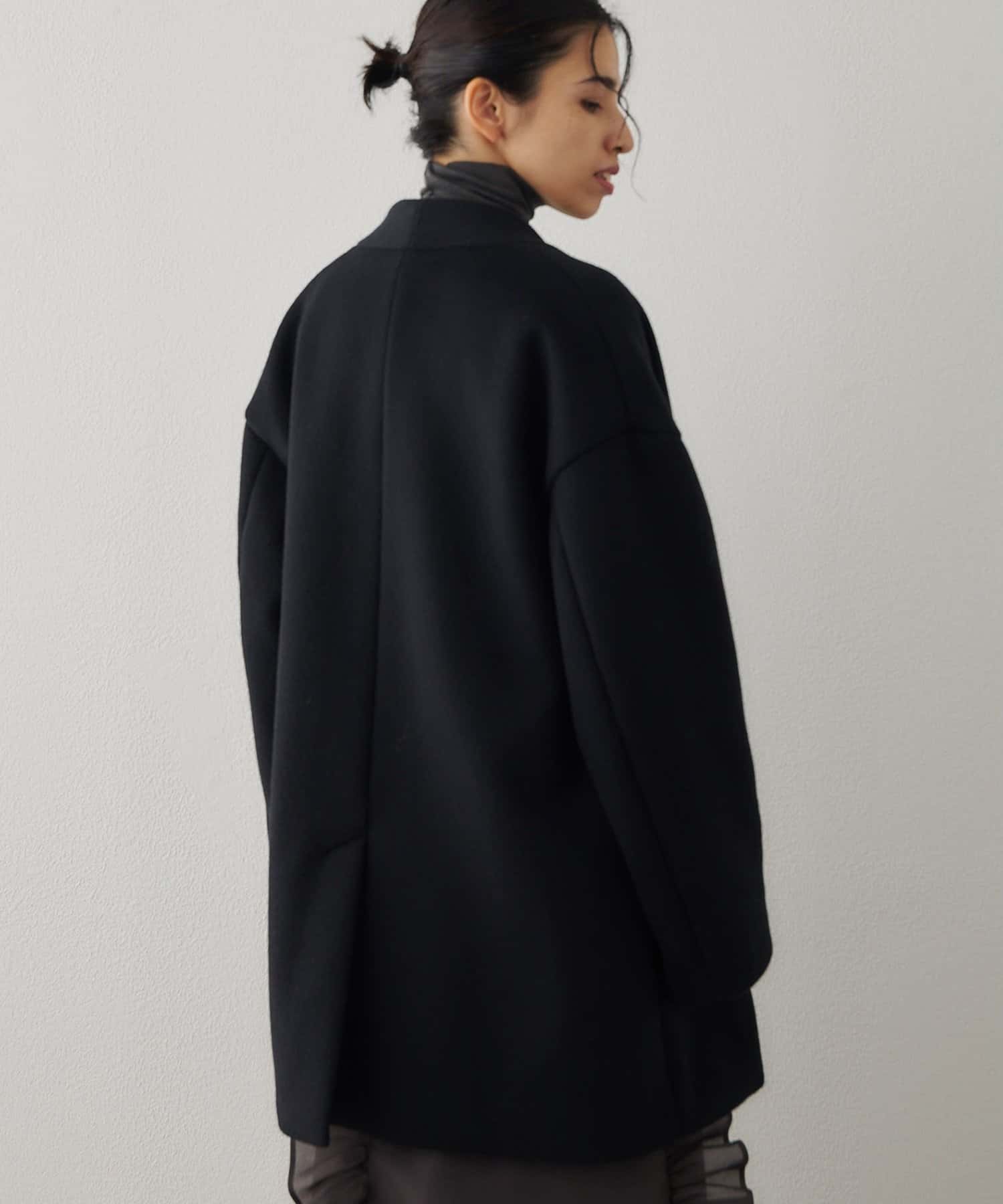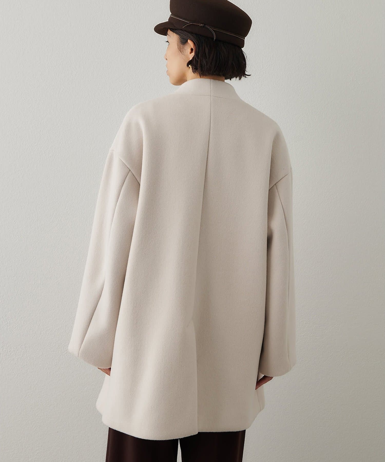 ■リラックス感のあるドロップショルダーに、着ぶくれせずにすっきりと見えるシルエットが美しく、短めの着丈がライトな印象。