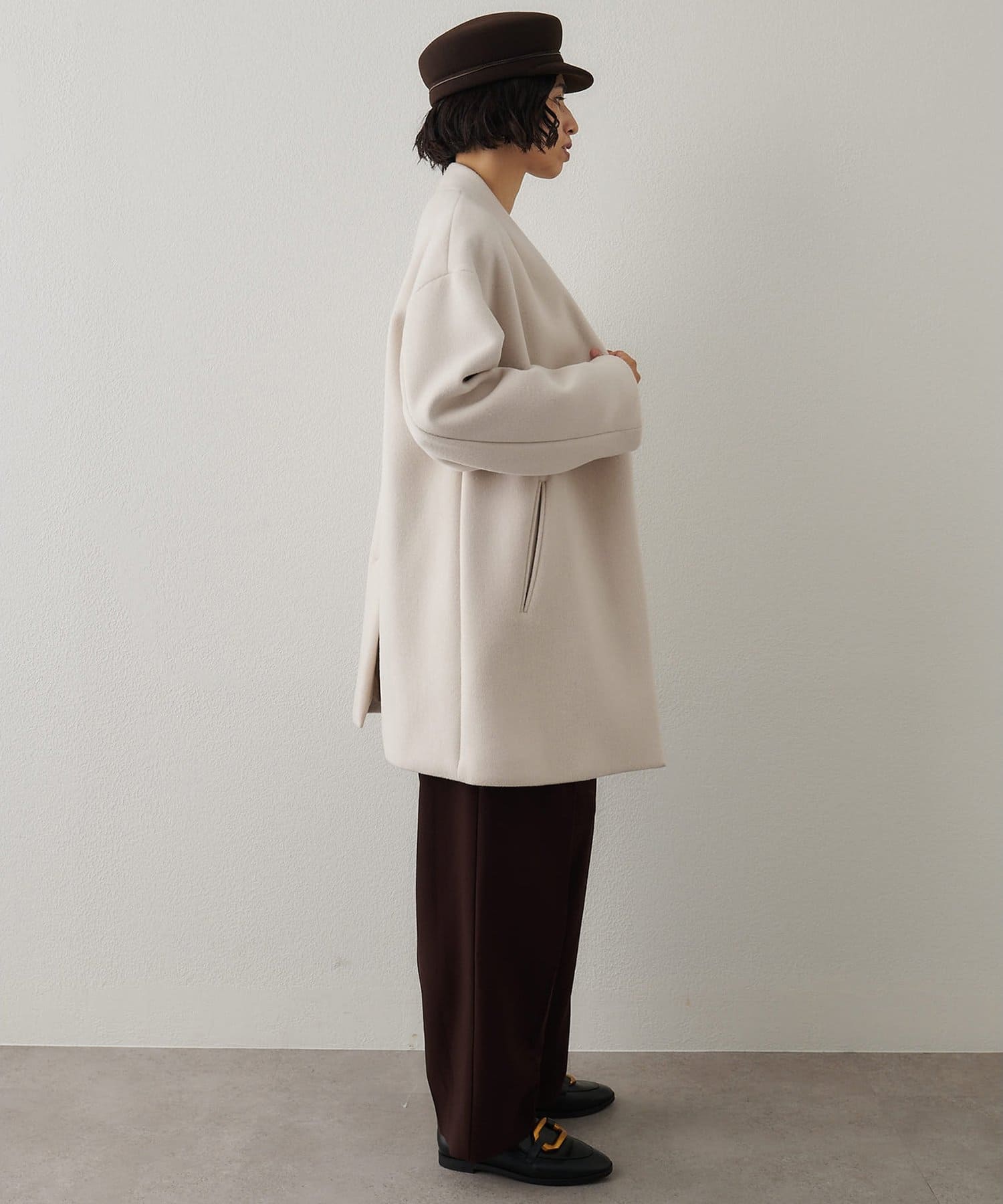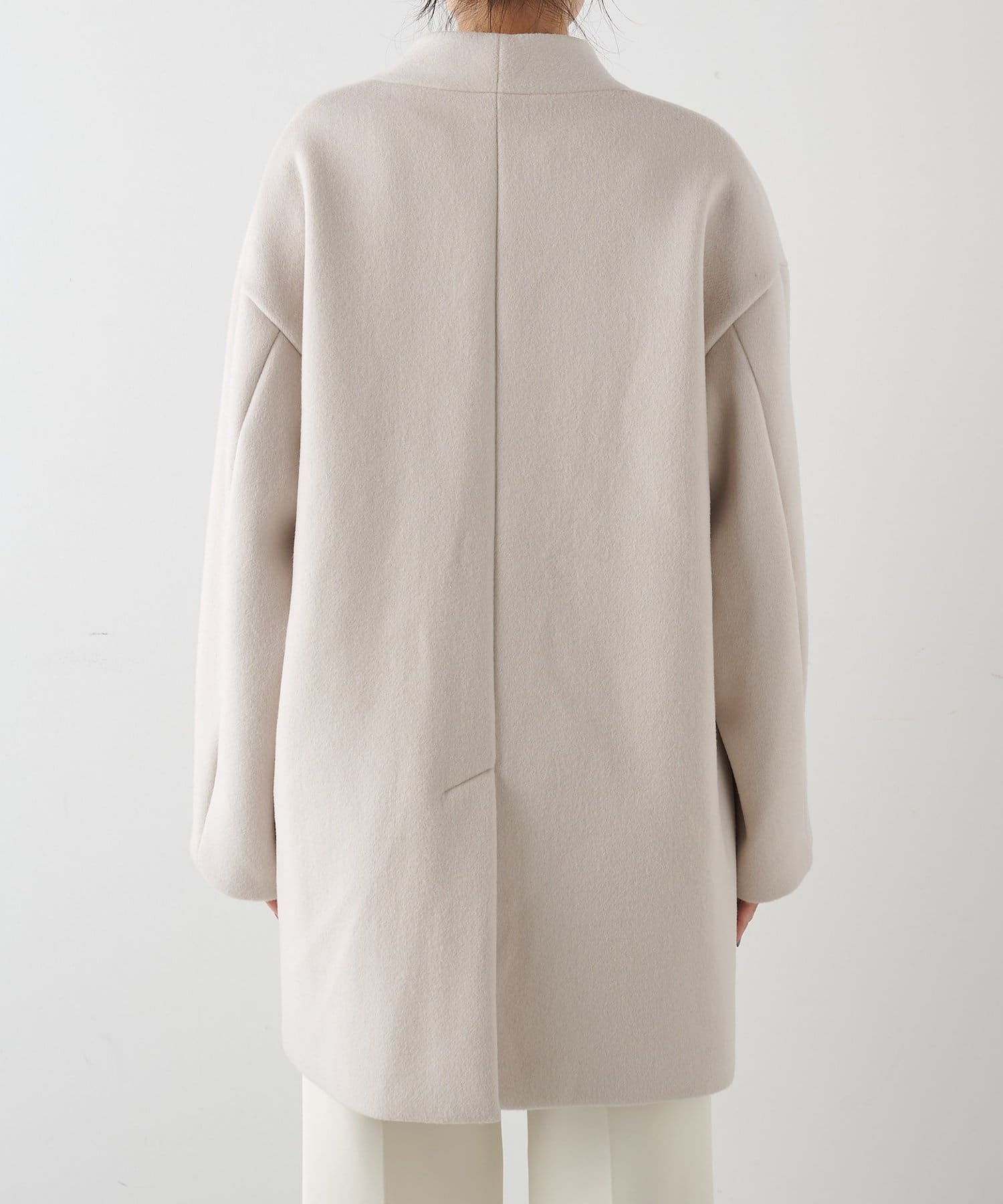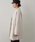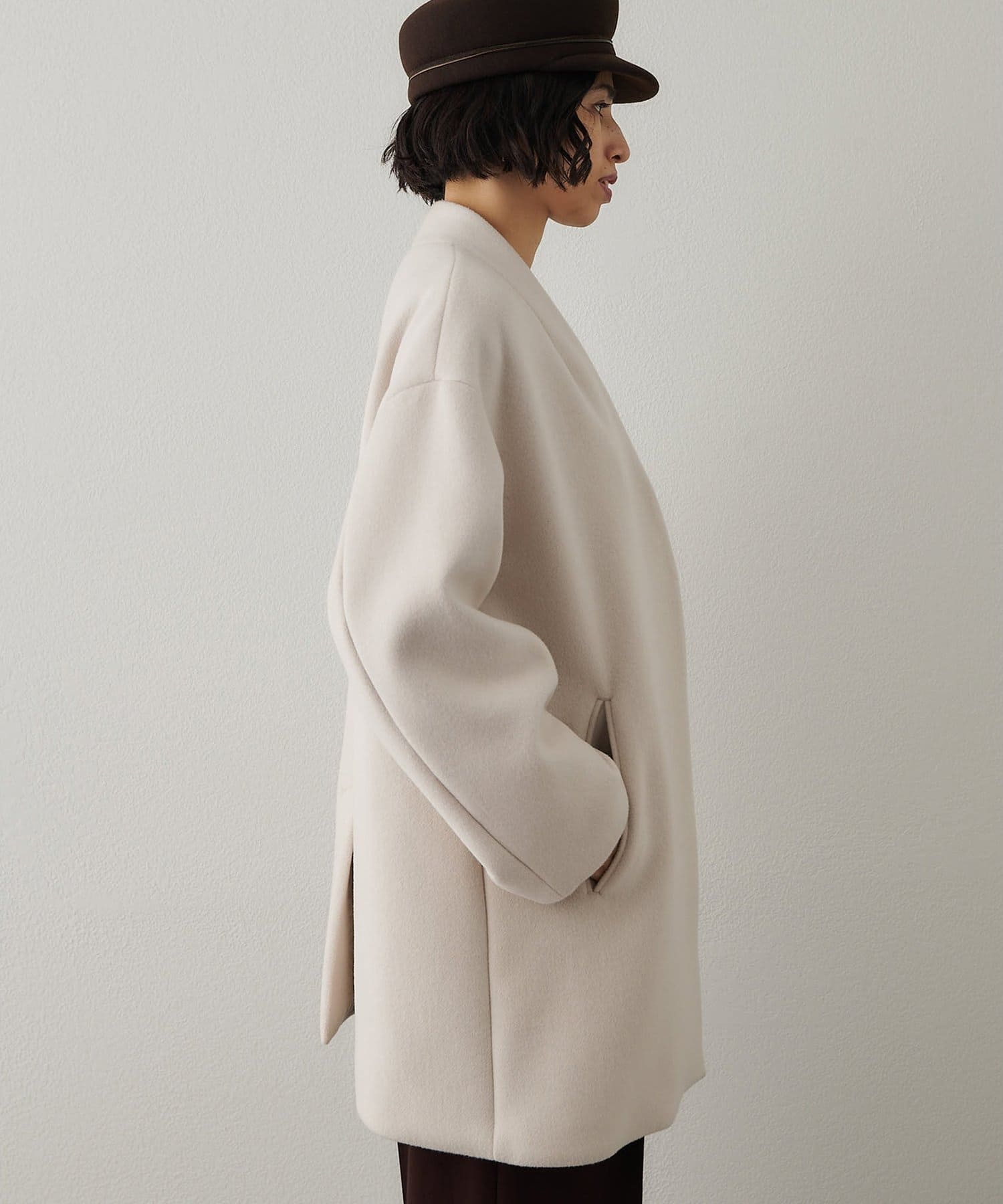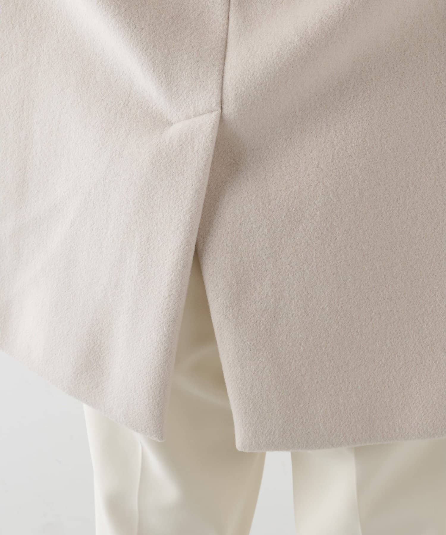 ■リラックス感のあるドロップショルダーに、着ぶくれせずにすっきりと見えるシルエットが美しく、短めの着丈がライトな印象。
