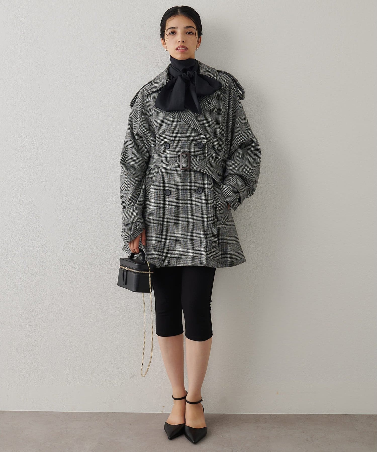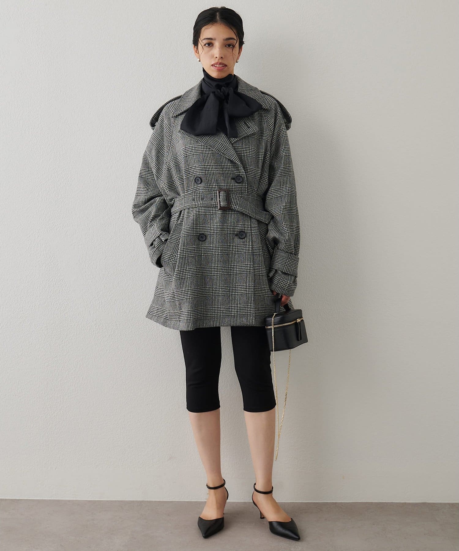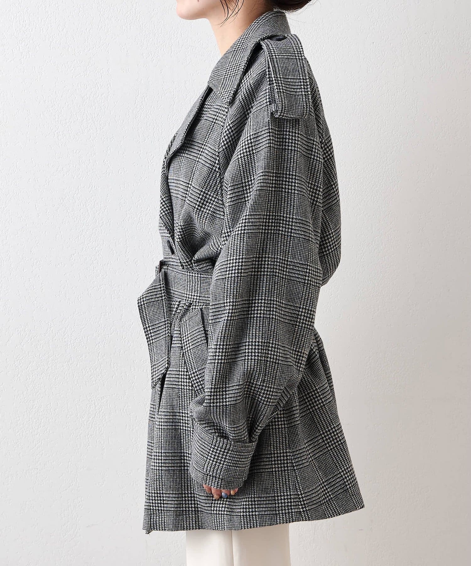 ■大きめの襟とダブルのフロント、ウエストベルトでマニッシュに仕上げた一着。