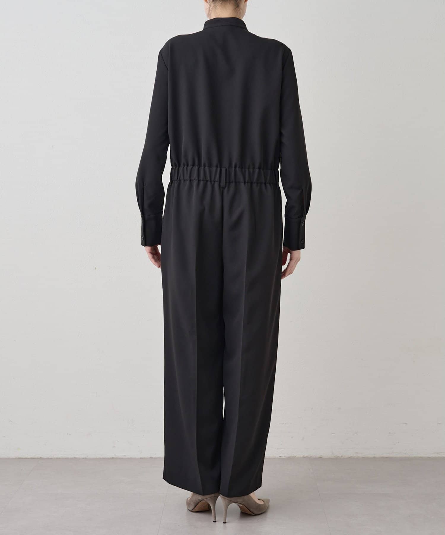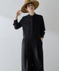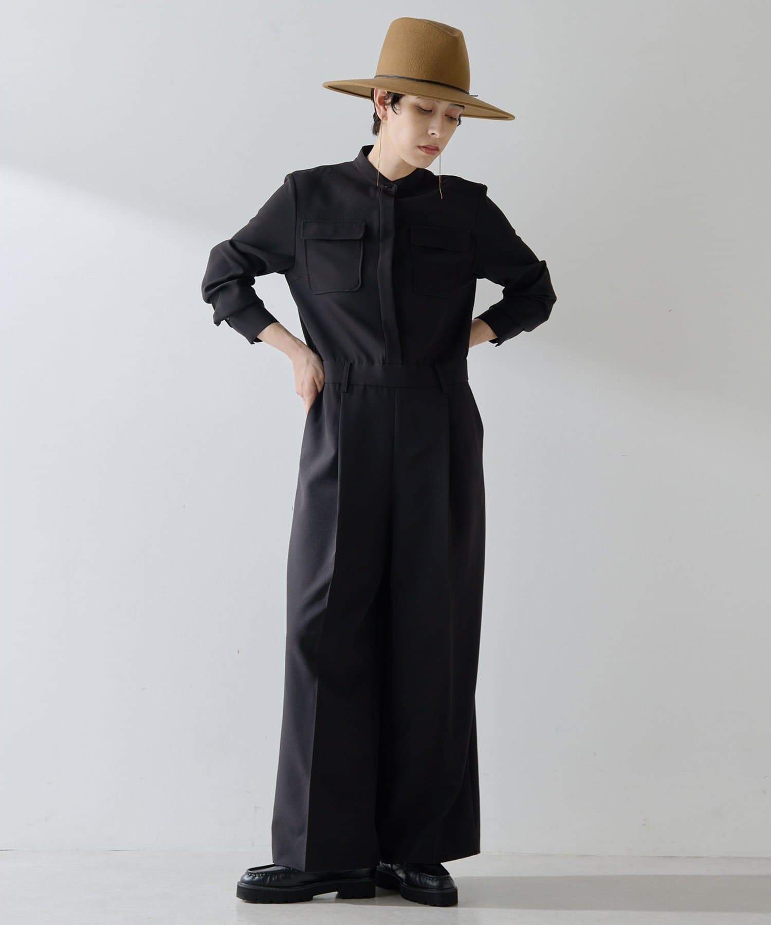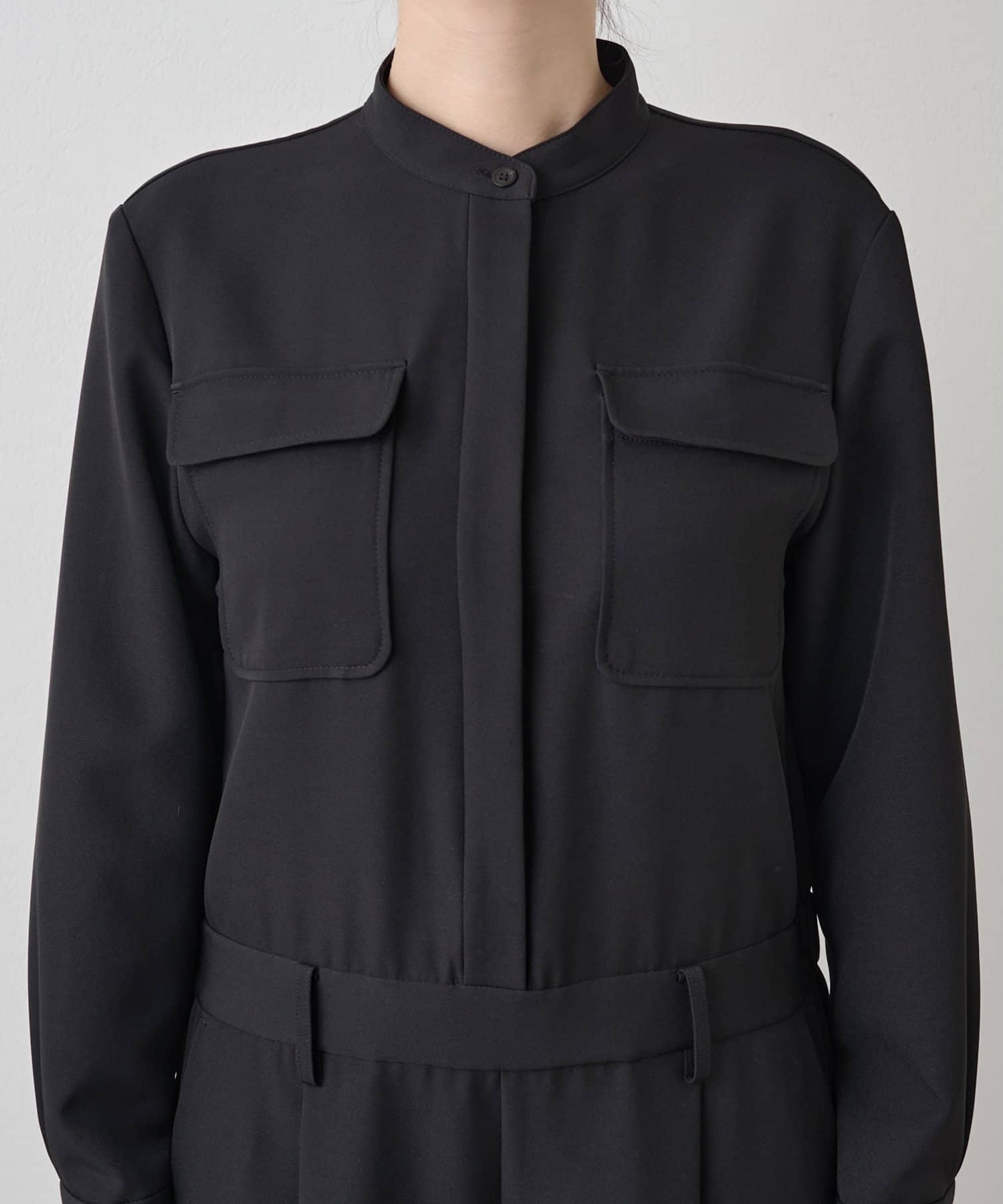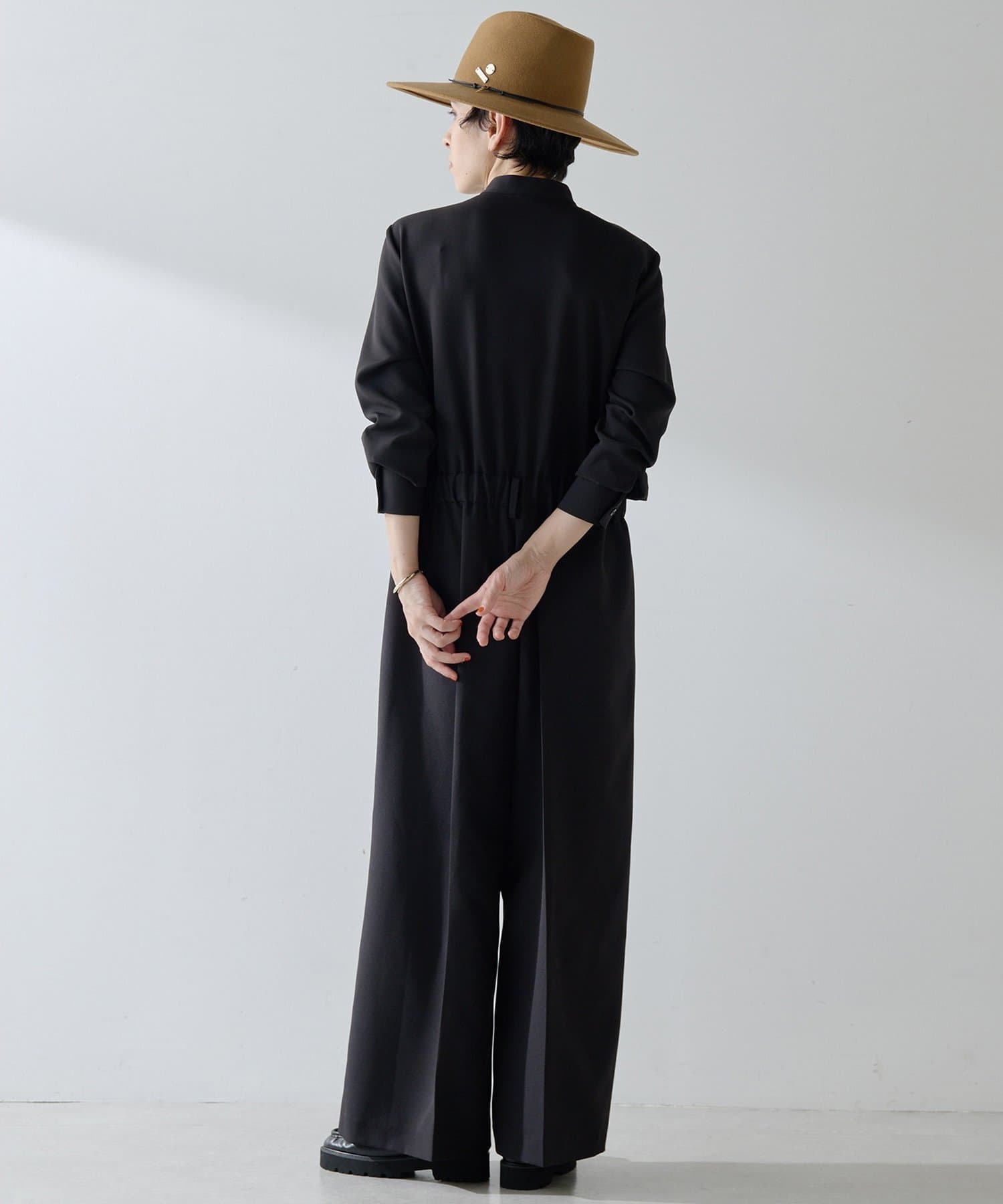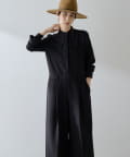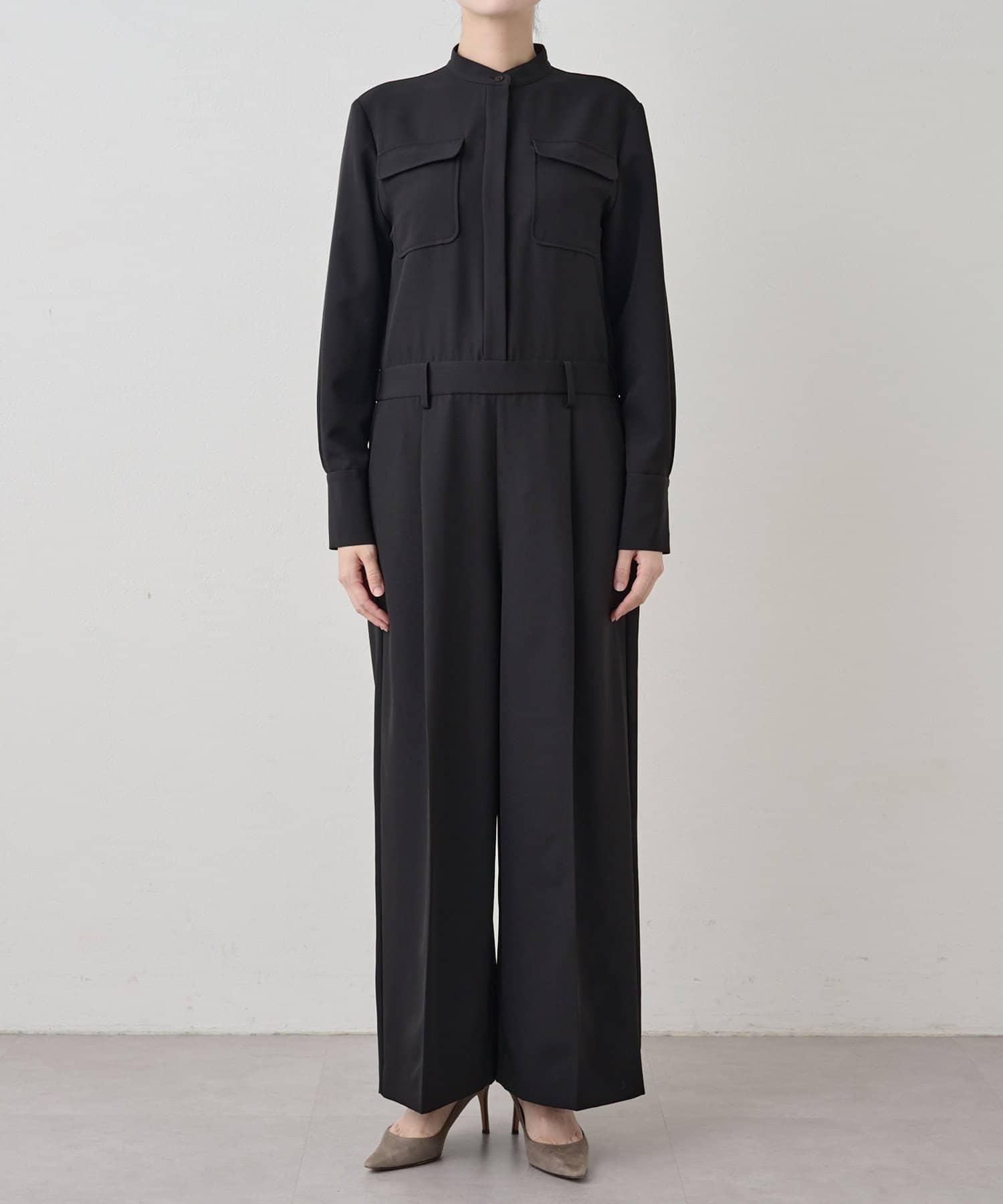 ■すっきりとしたバンドカラーで、マスキュリンな印象に仕上げたジャンプスーツ。