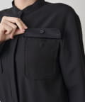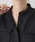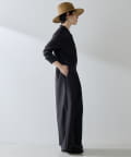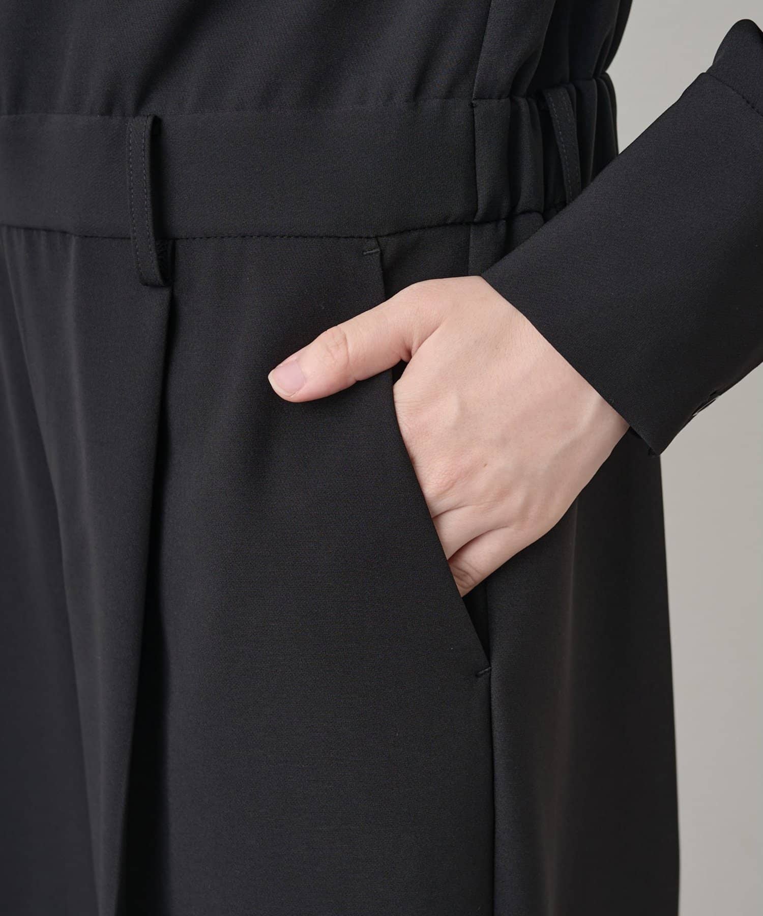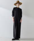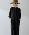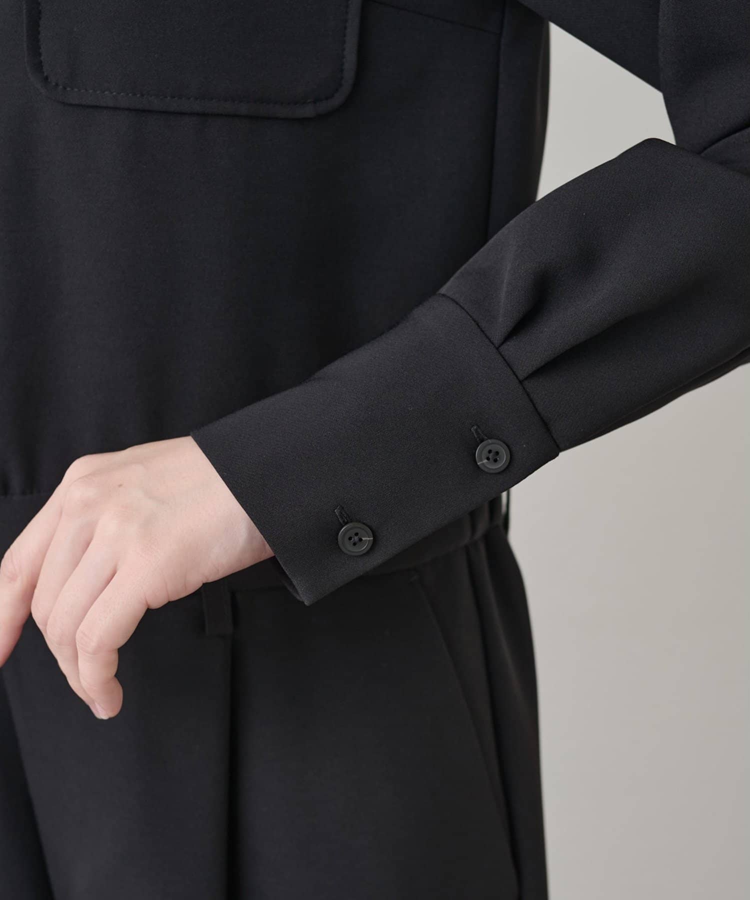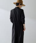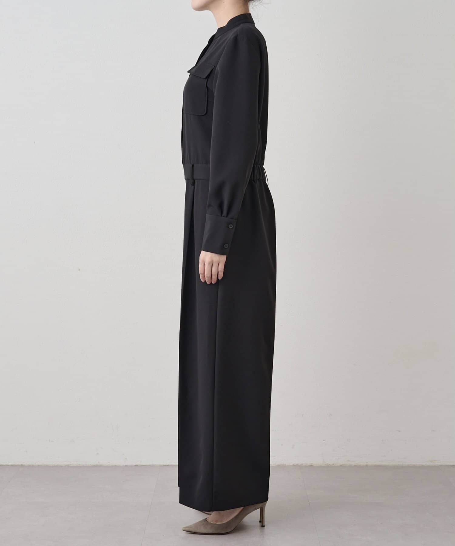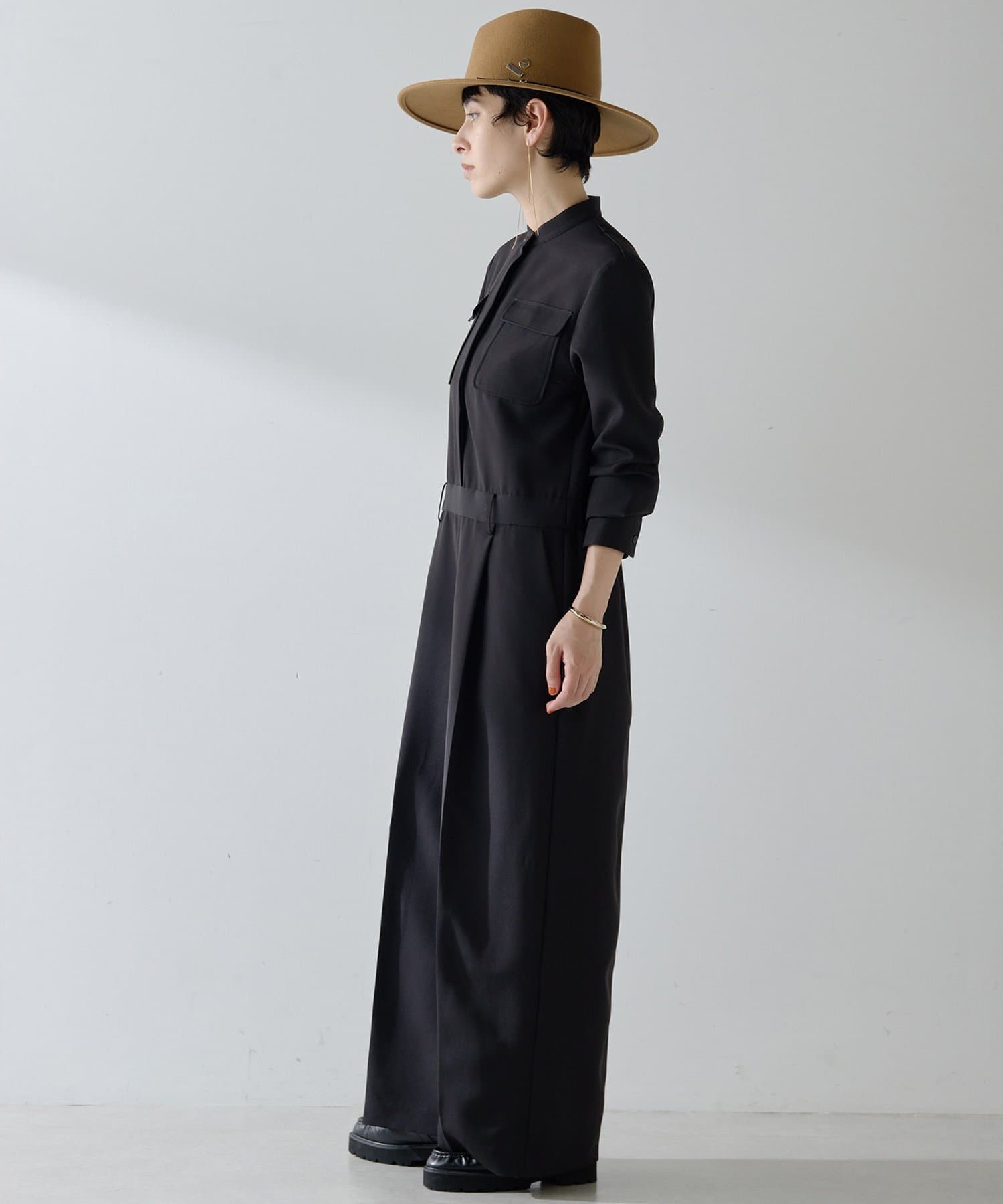■すっきりとしたバンドカラーで、マスキュリンな印象に仕上げたジャンプスーツ。