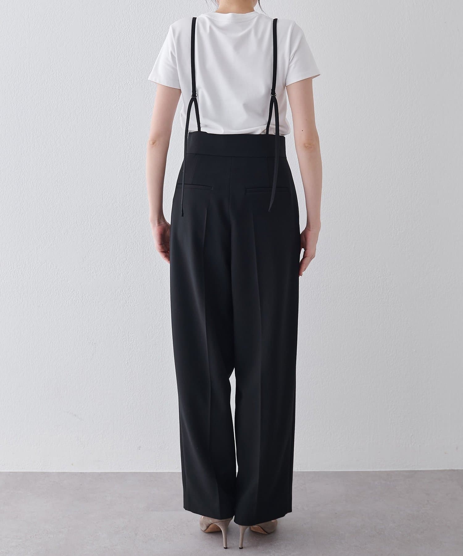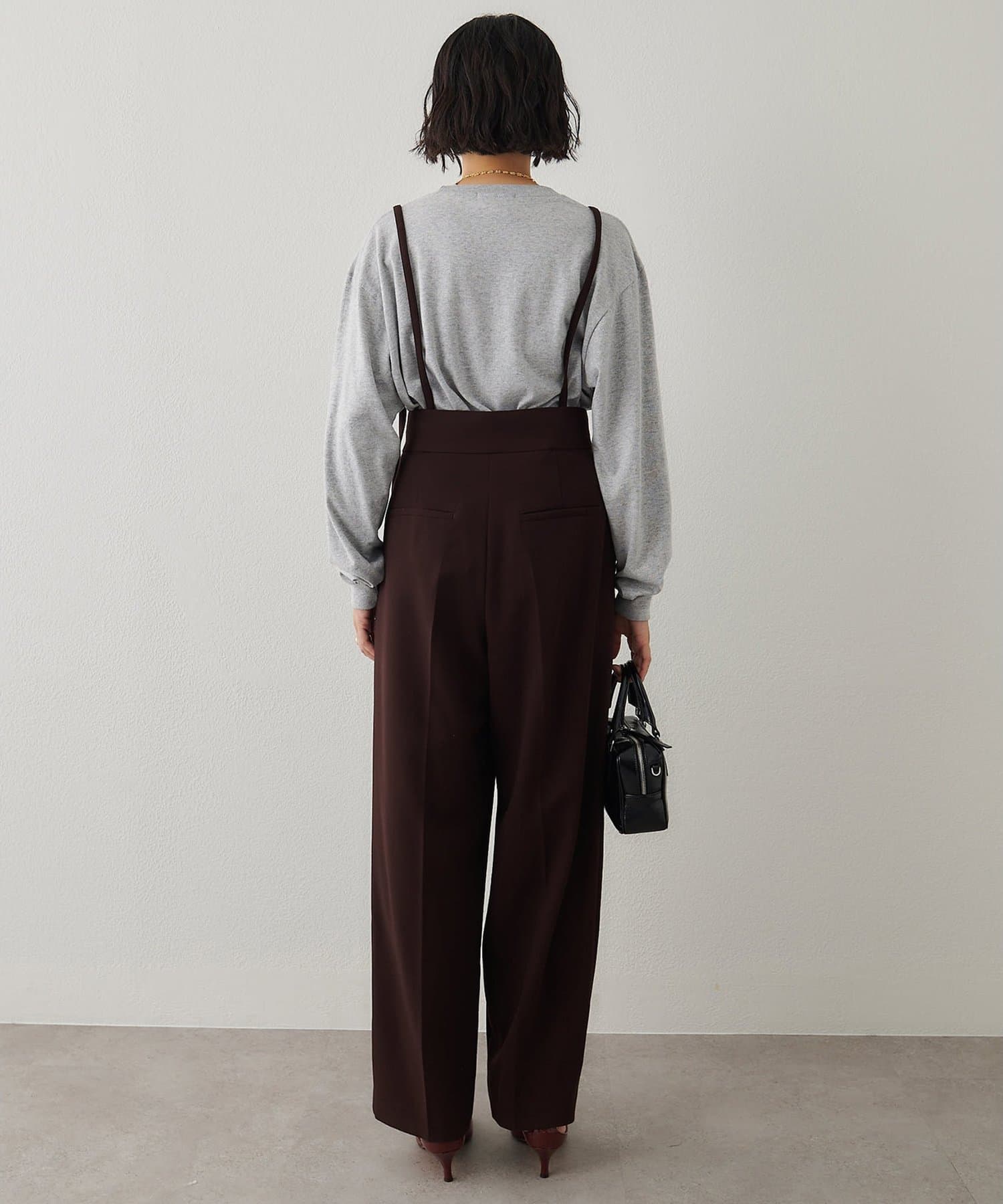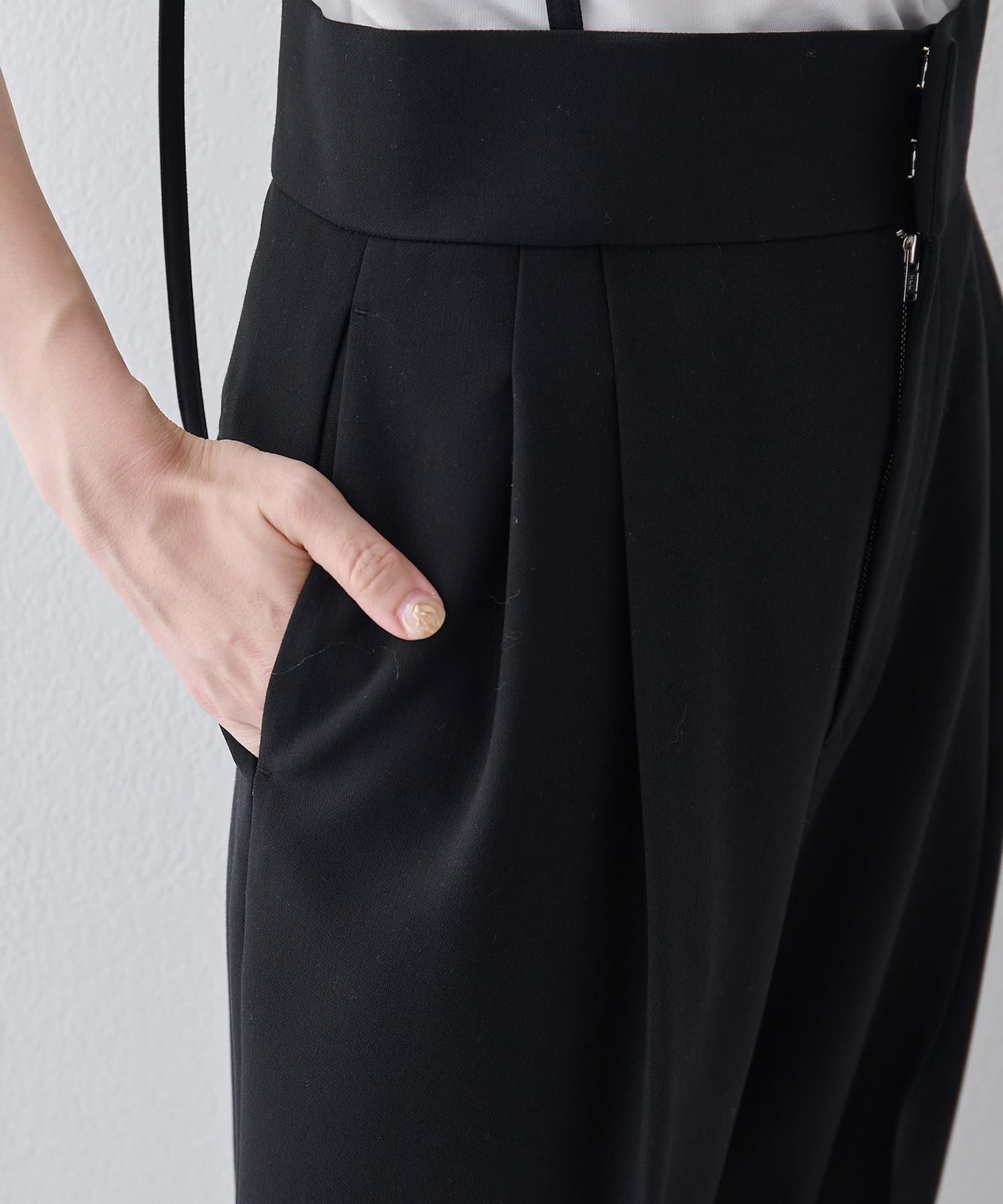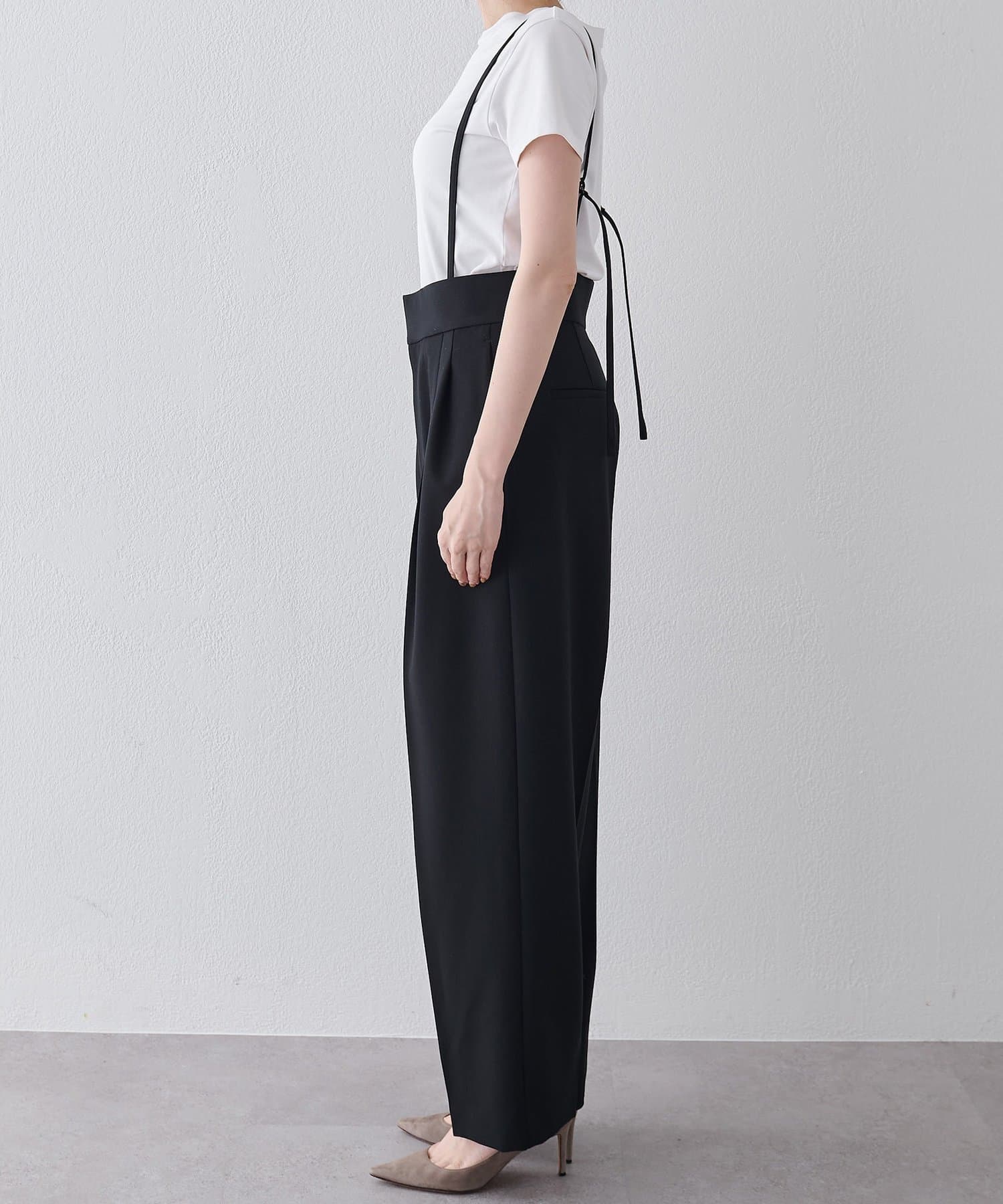 ■仕立て映えする美しいシルエットが魅力のサスペンダーパンツ。