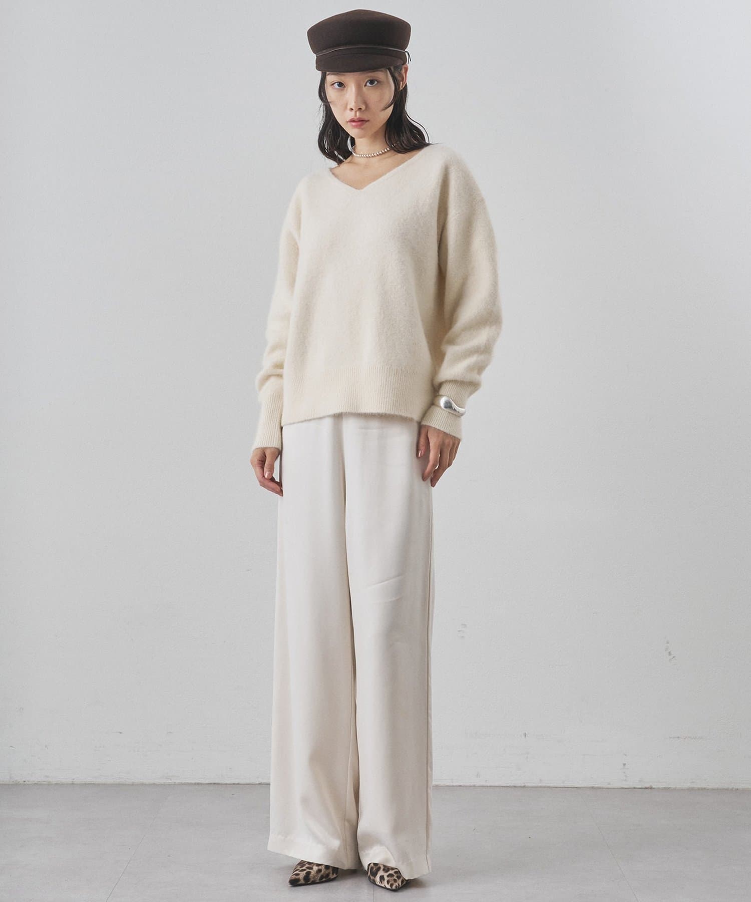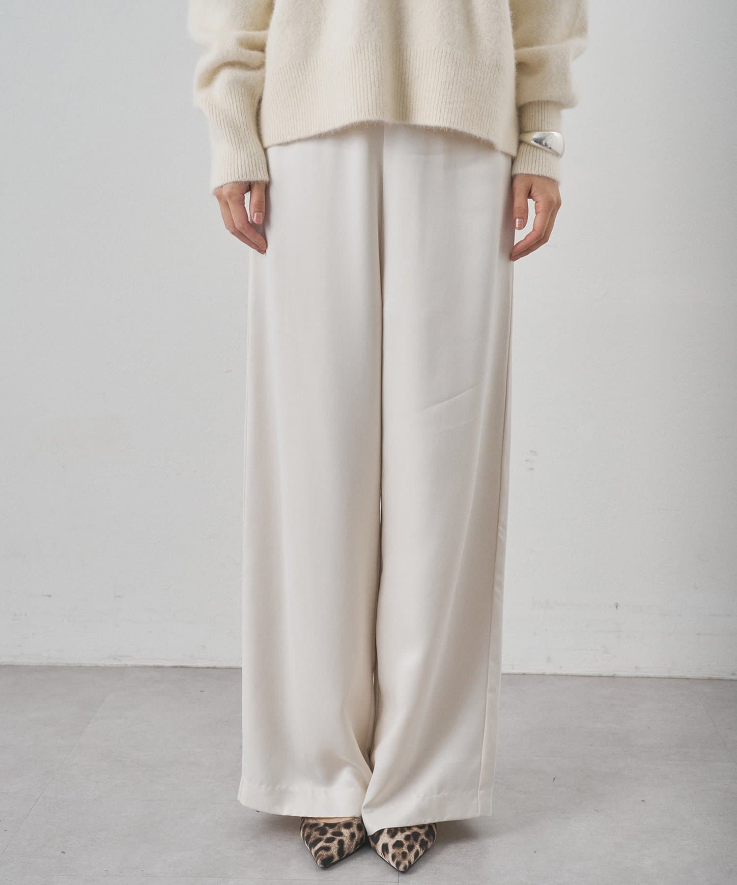■落ち感の良い素材感が美しいストレートラインを際立たせ、毛足のあるニットとの相性も抜群。