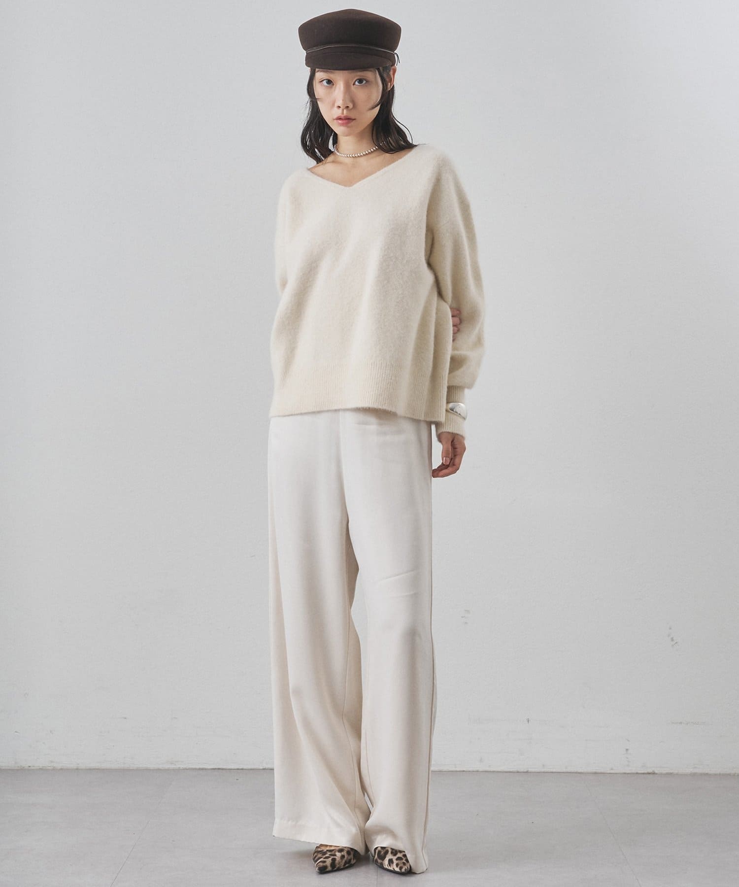 ■デコルテをきれいに見せる浅めのVネックが女性らしく上品な印象をプラス。
