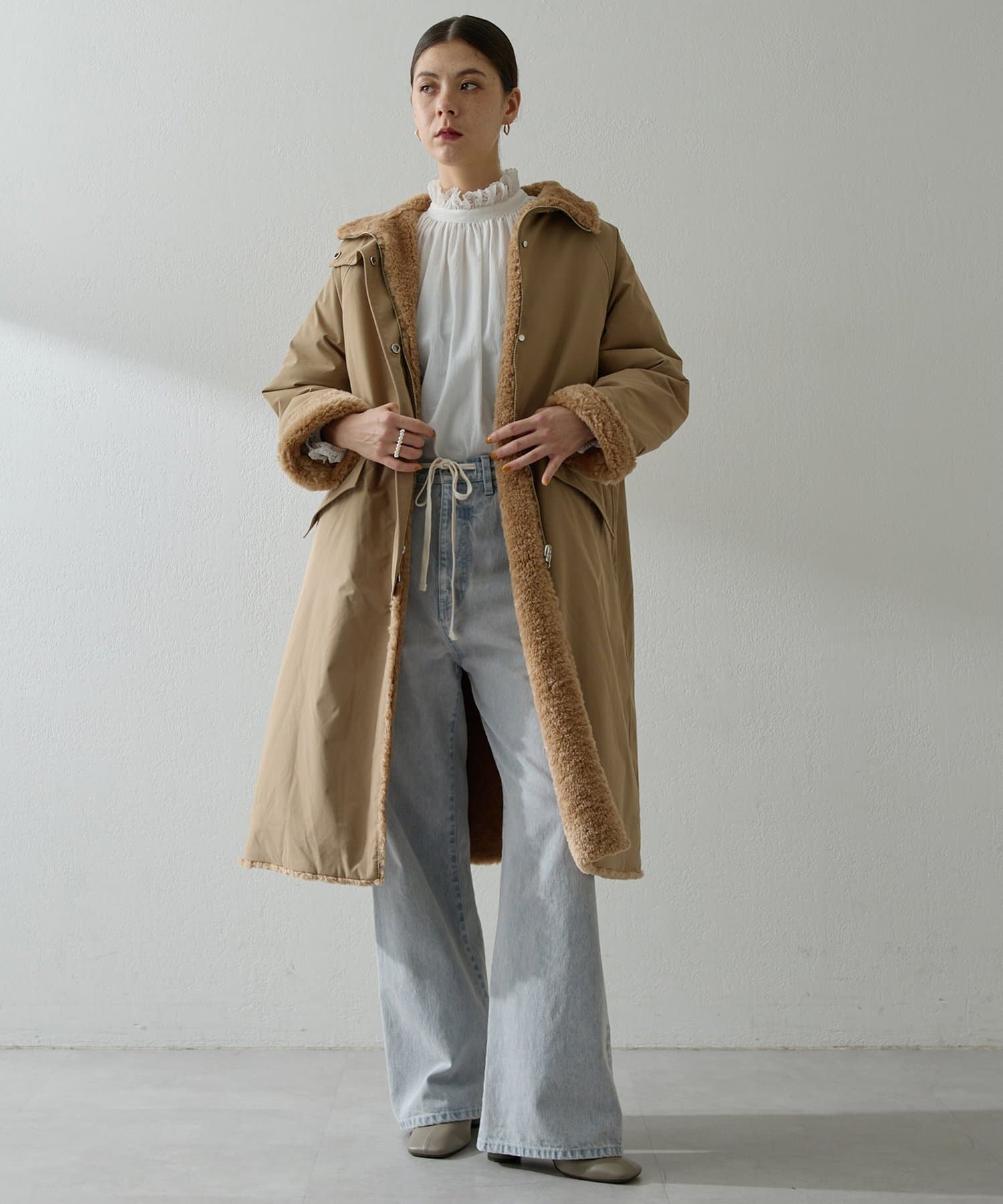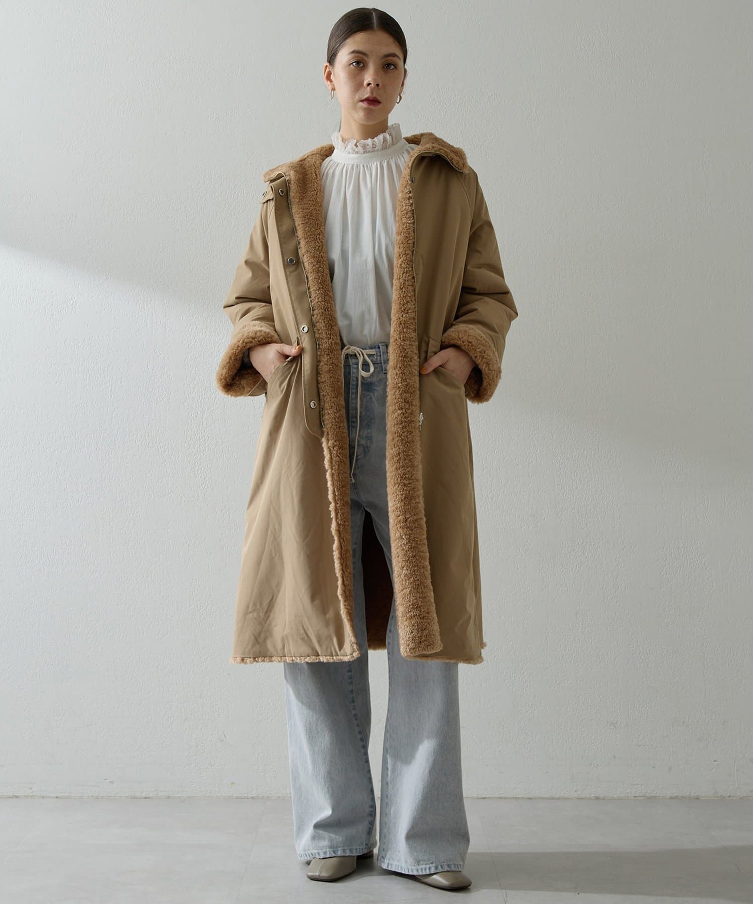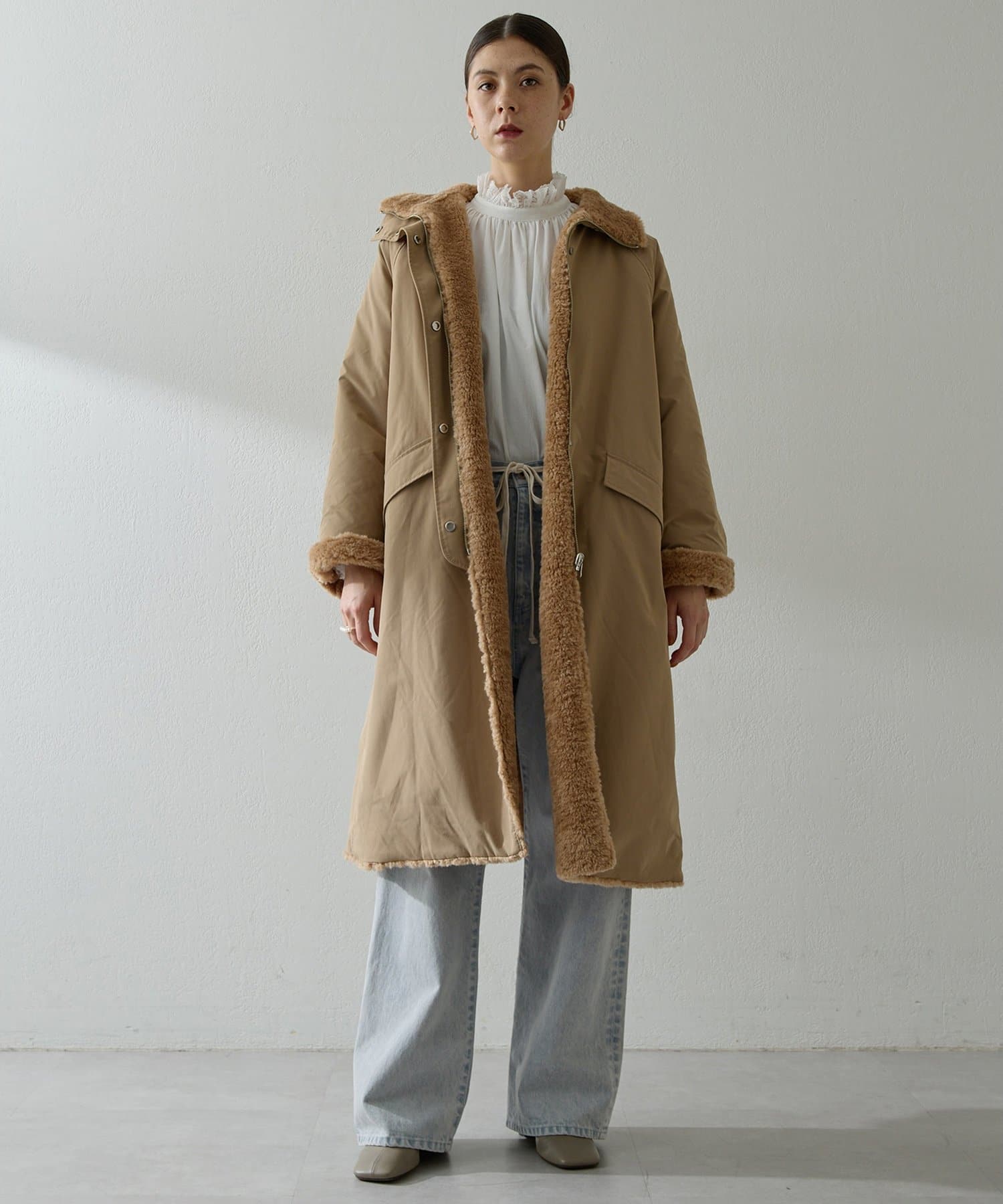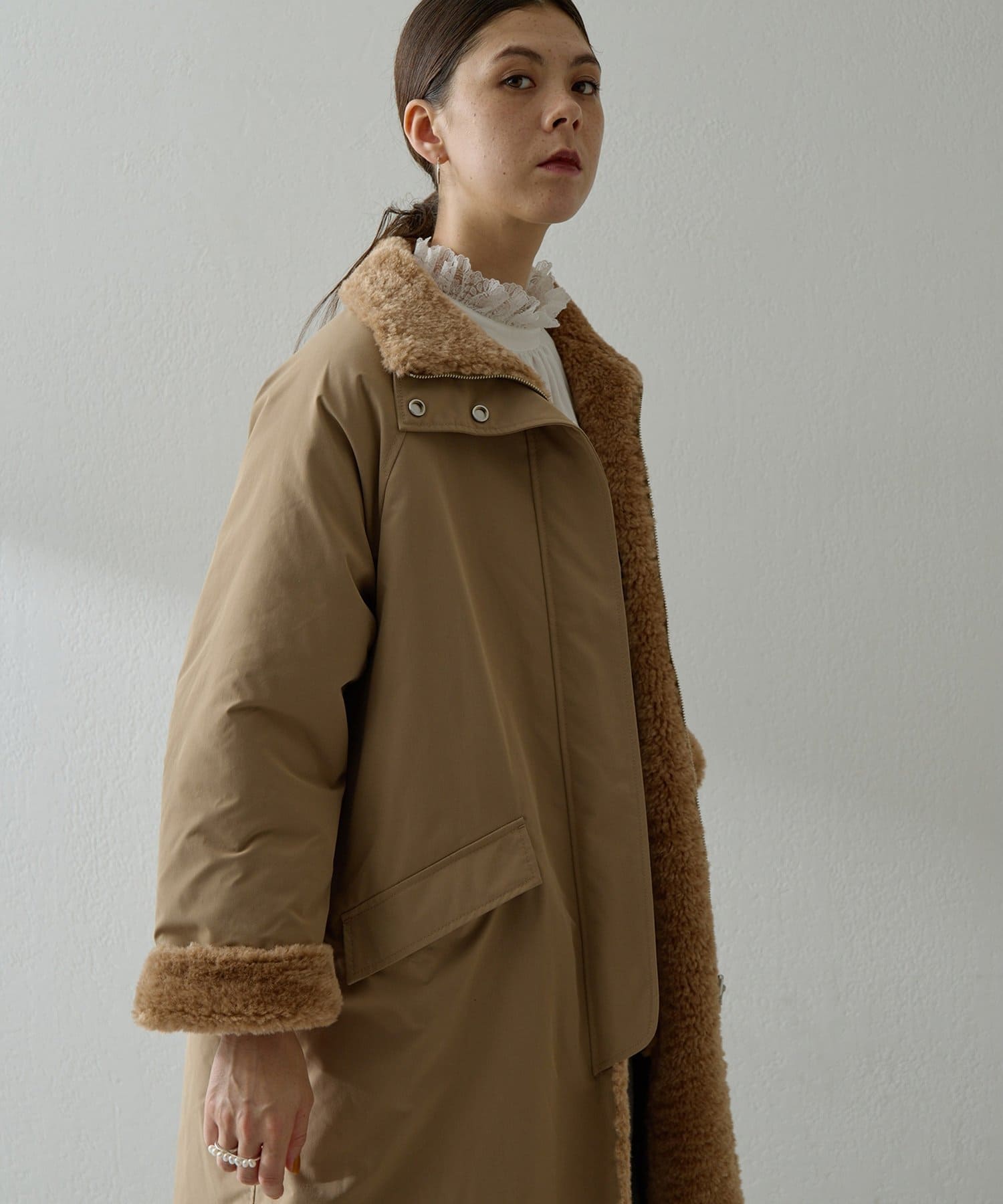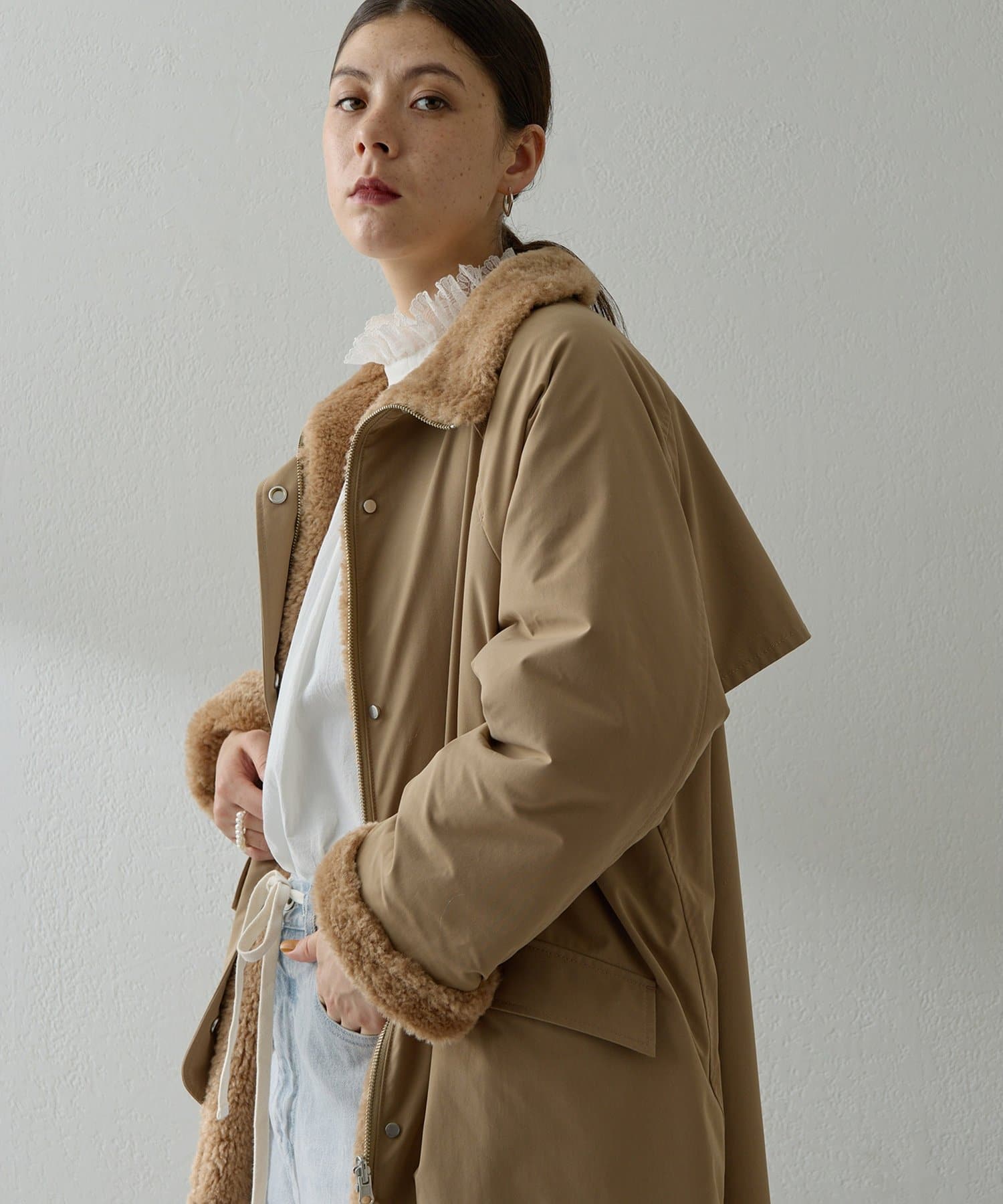 ■表側はワークテイストのスタイルでカジュアルに、ボア側を表にすれば華やかさのある印象に。