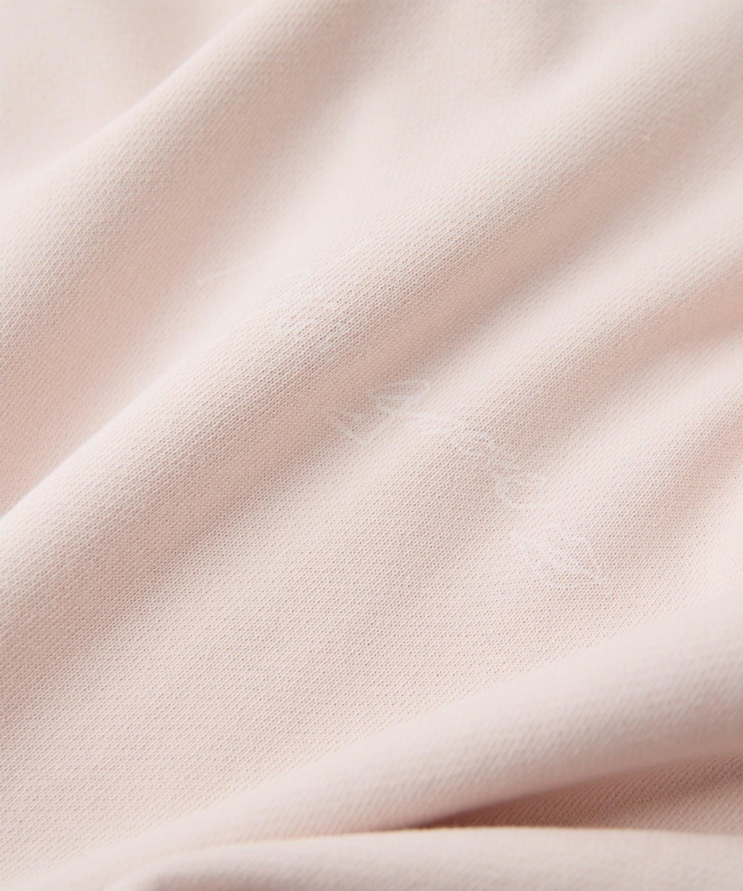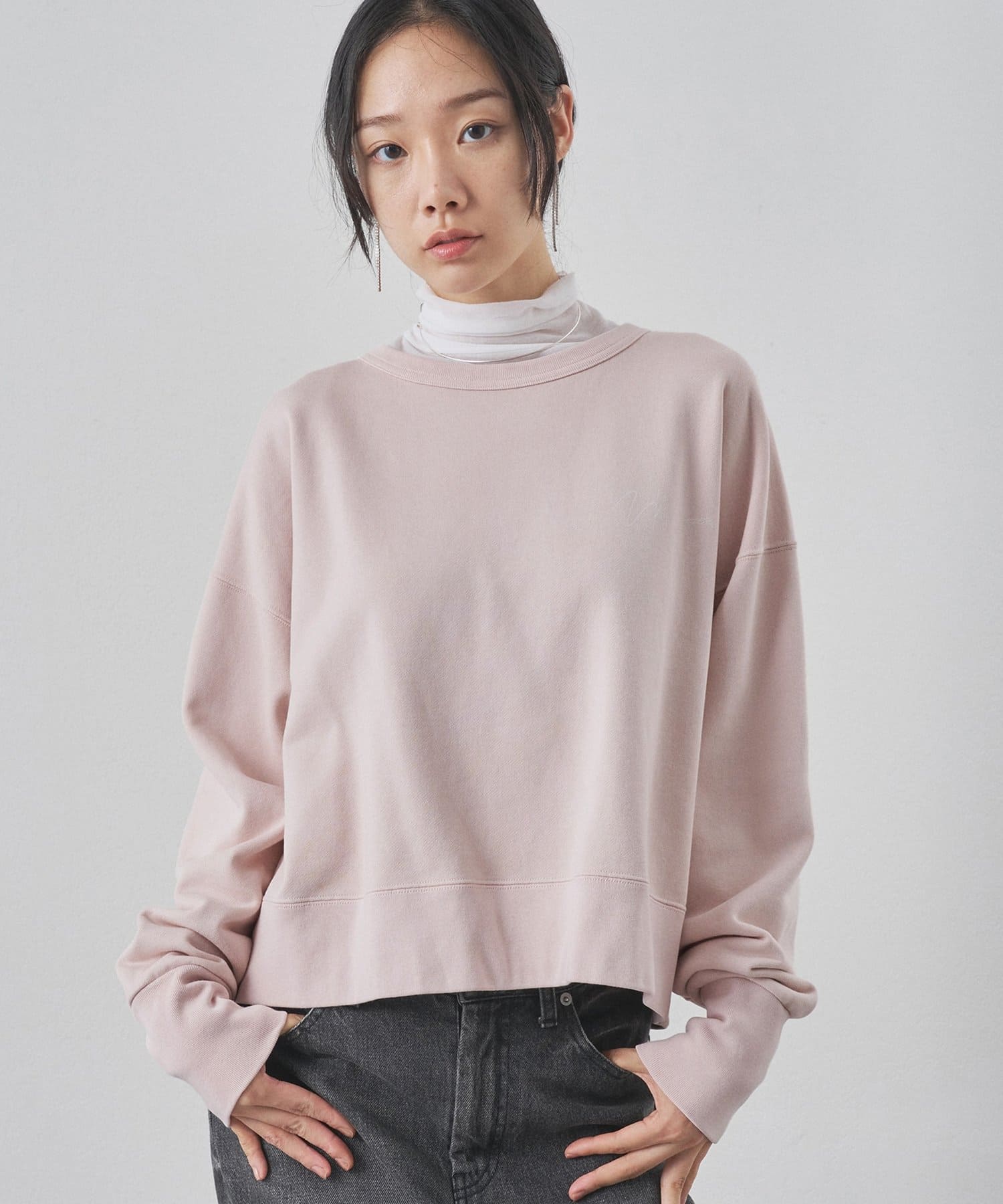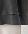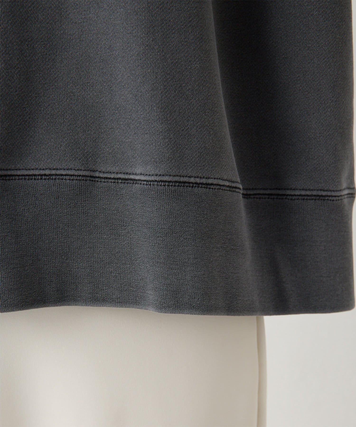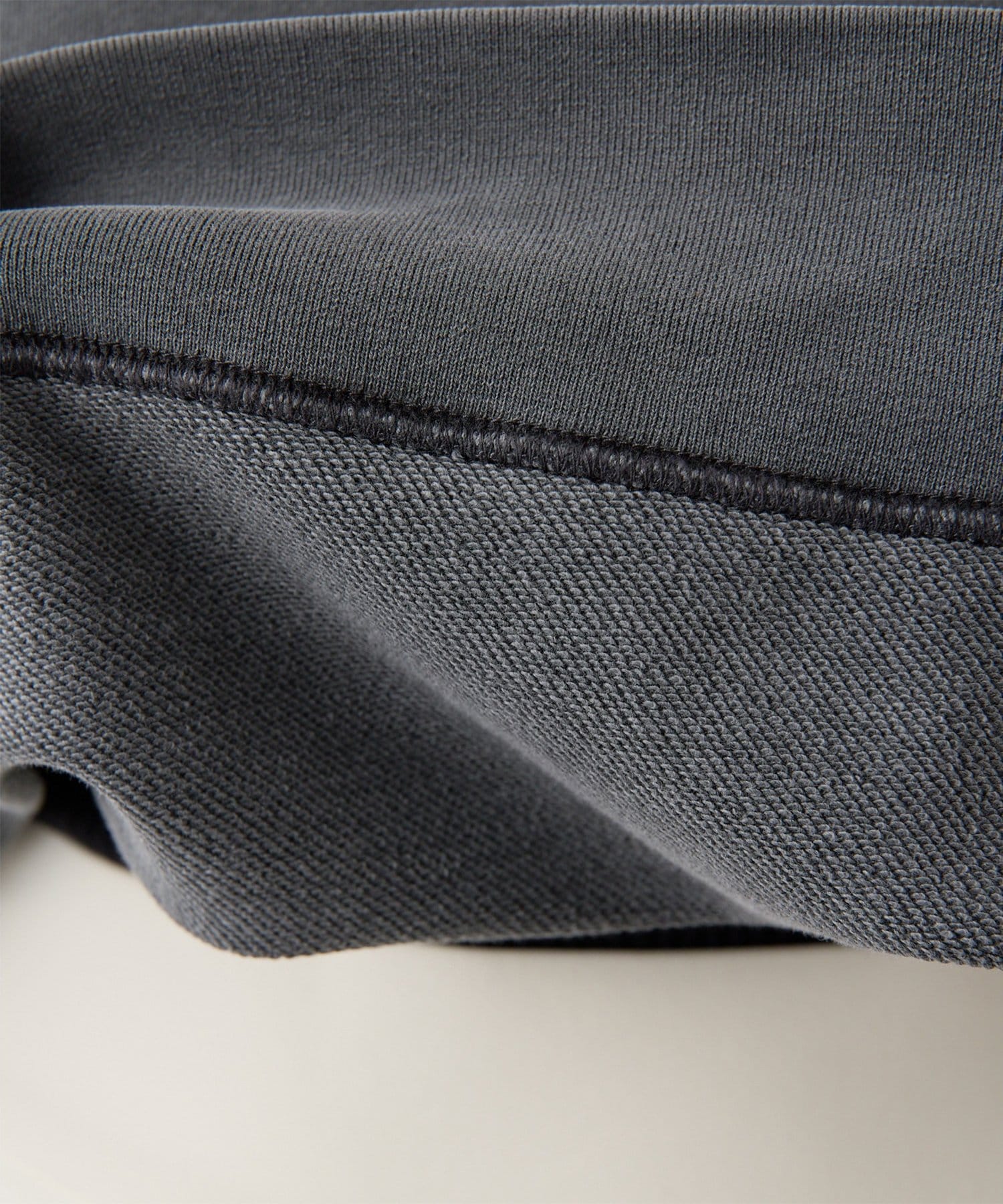 毛羽たちが少ない糸を使用した裏毛素材にピグメント染めをする事により、絶妙なムラ感や風合いを表現した素材。
