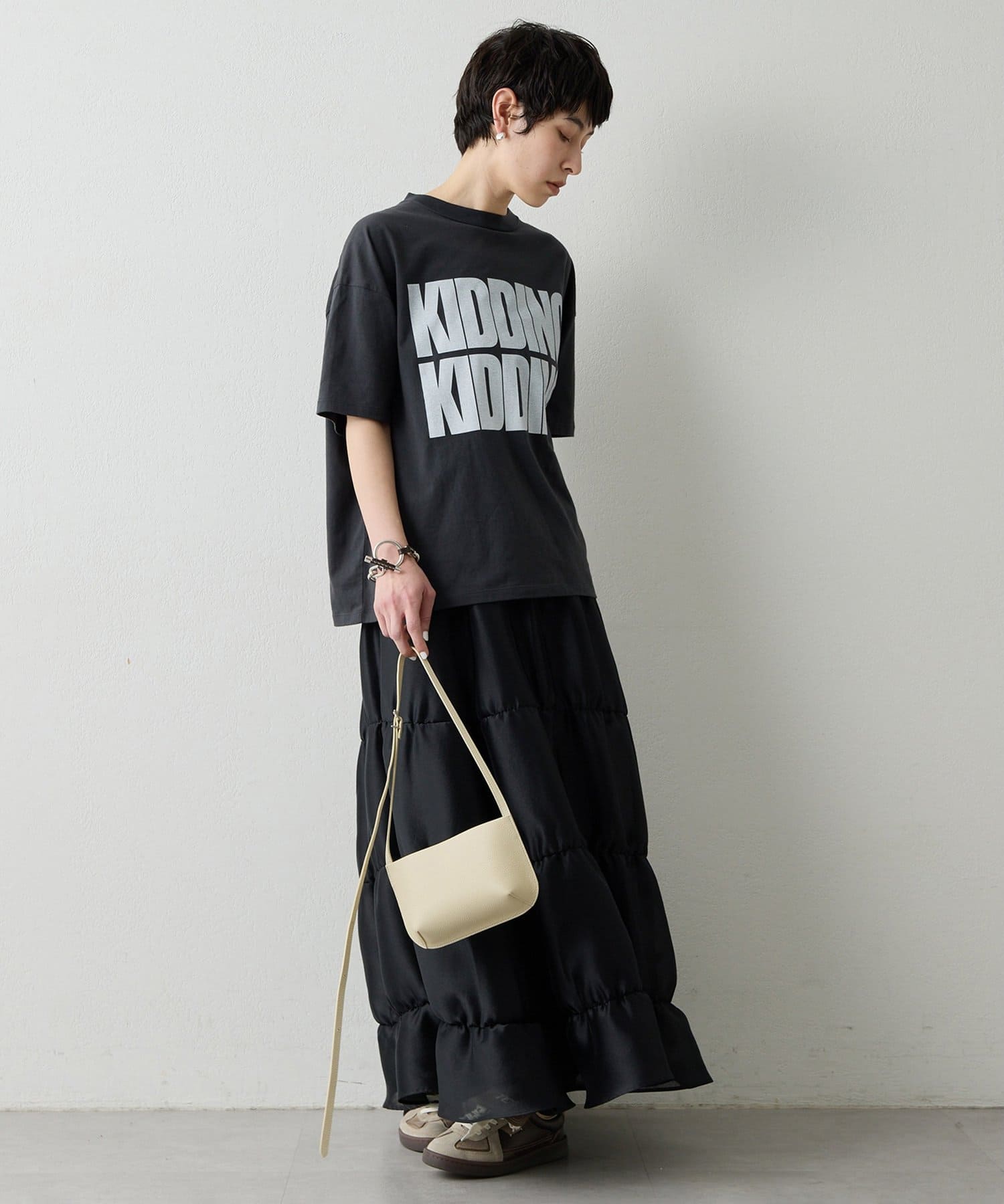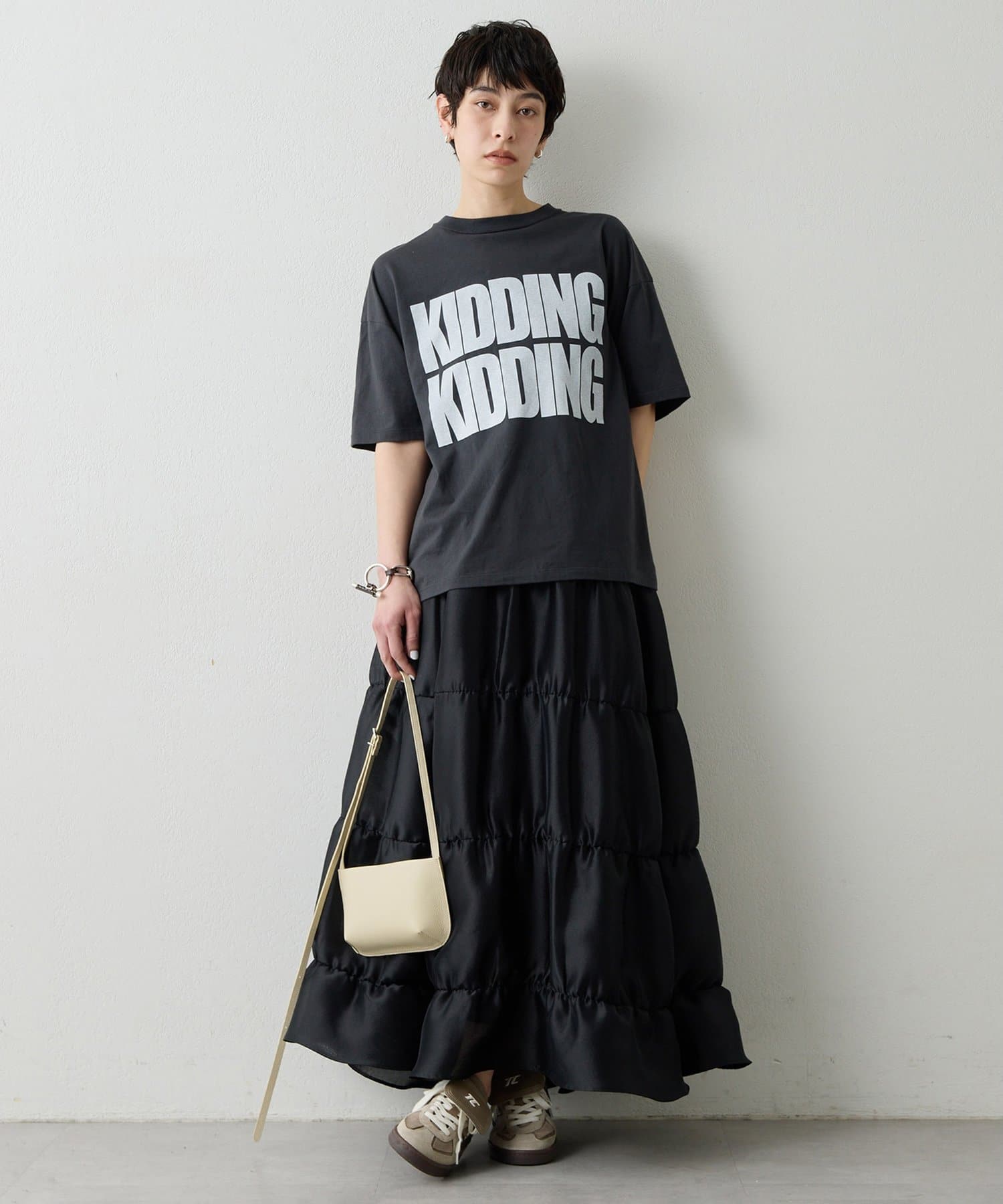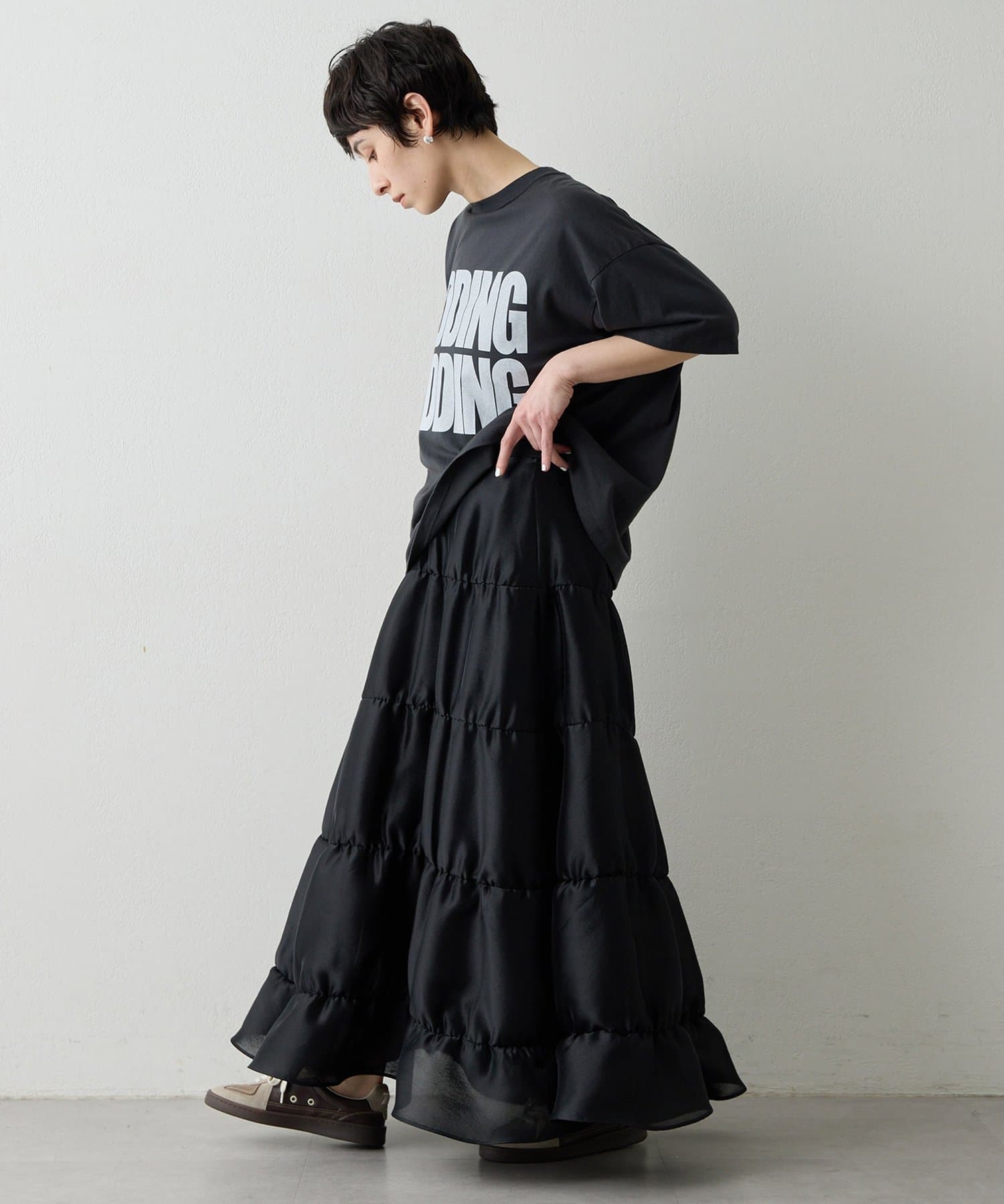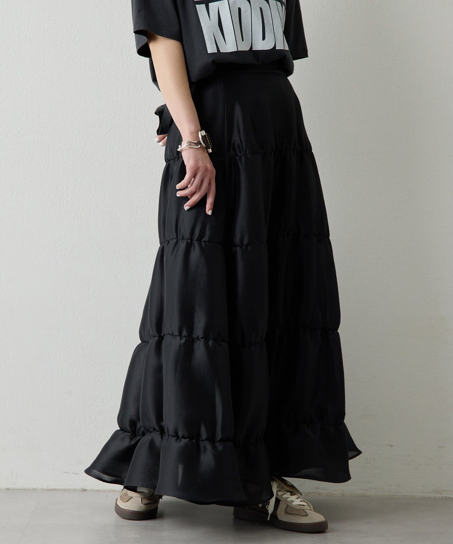 モードなニュアンスを感じさせる、大人のティアードスカート