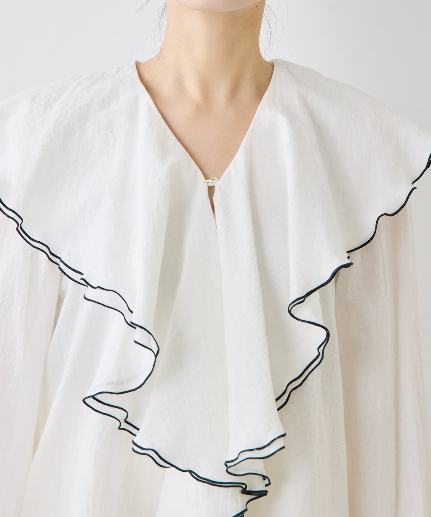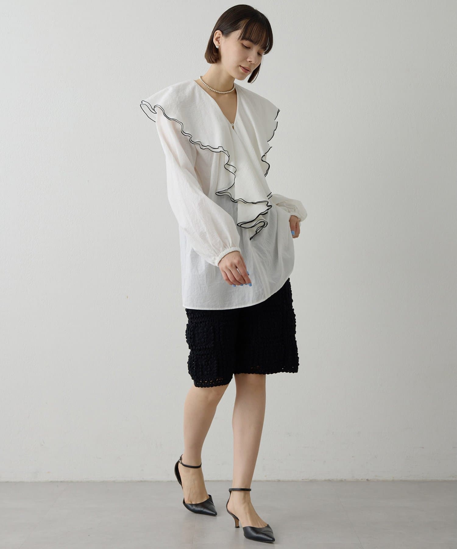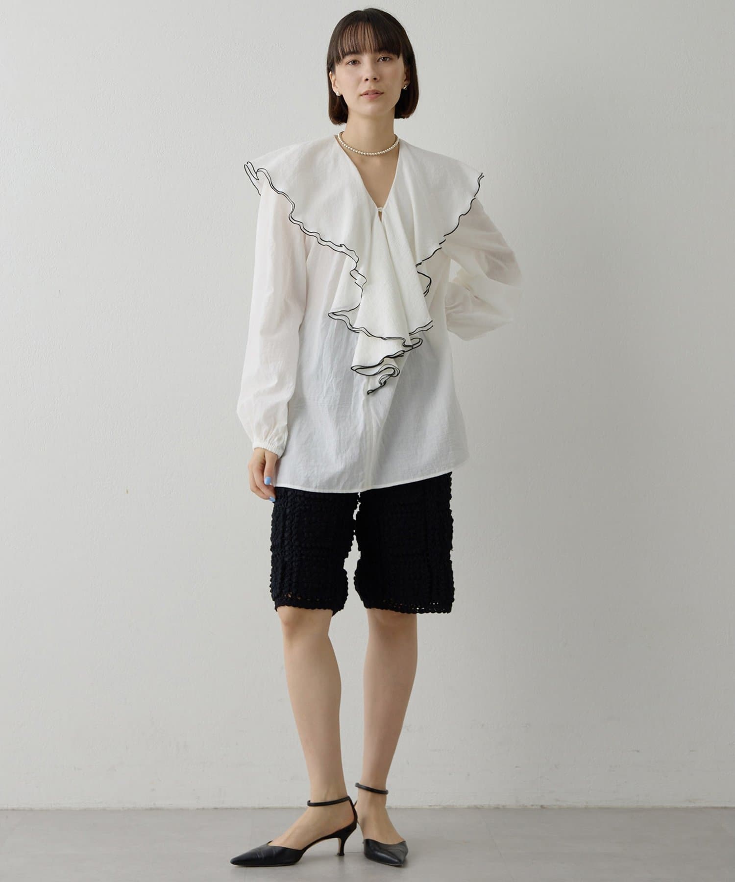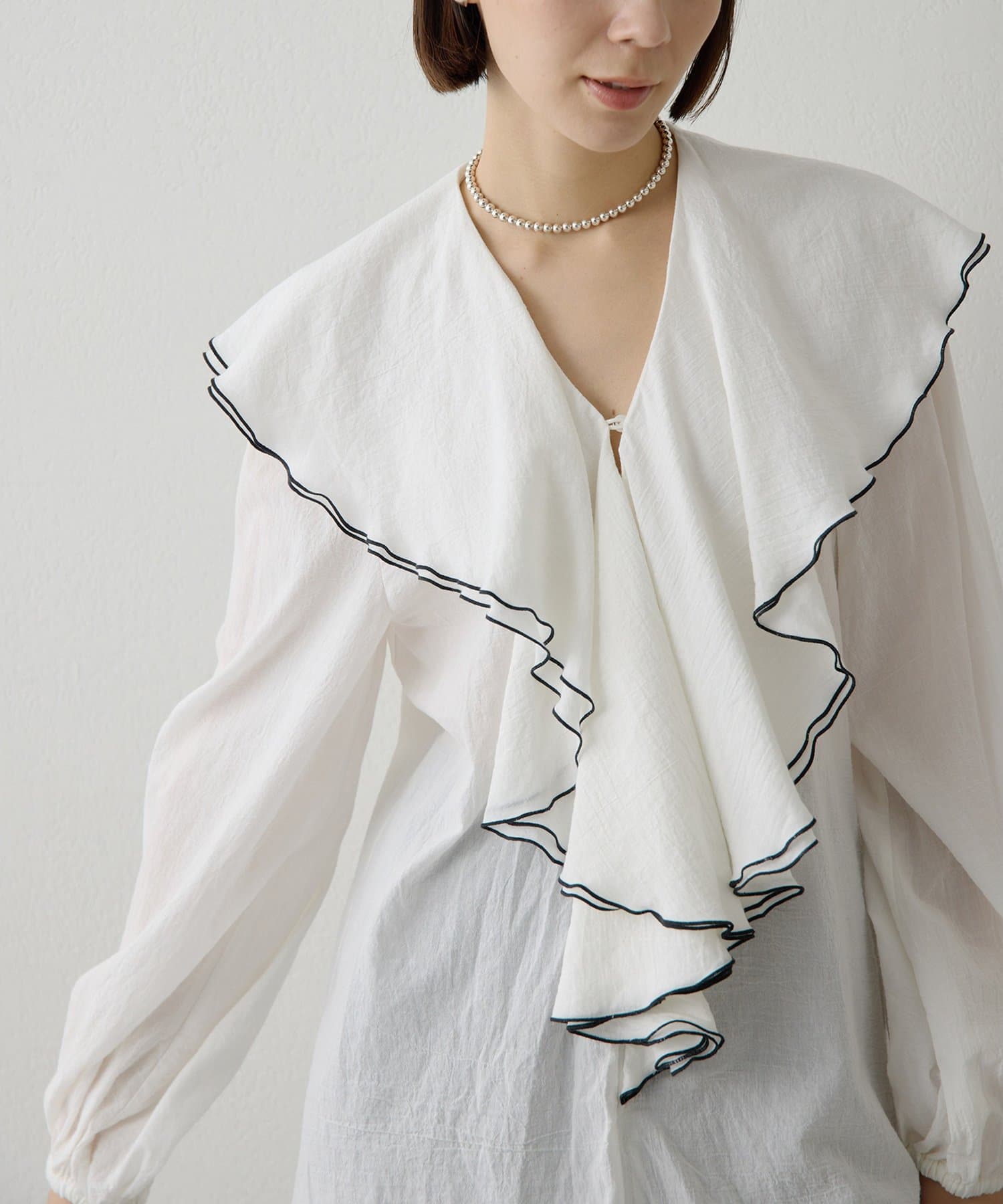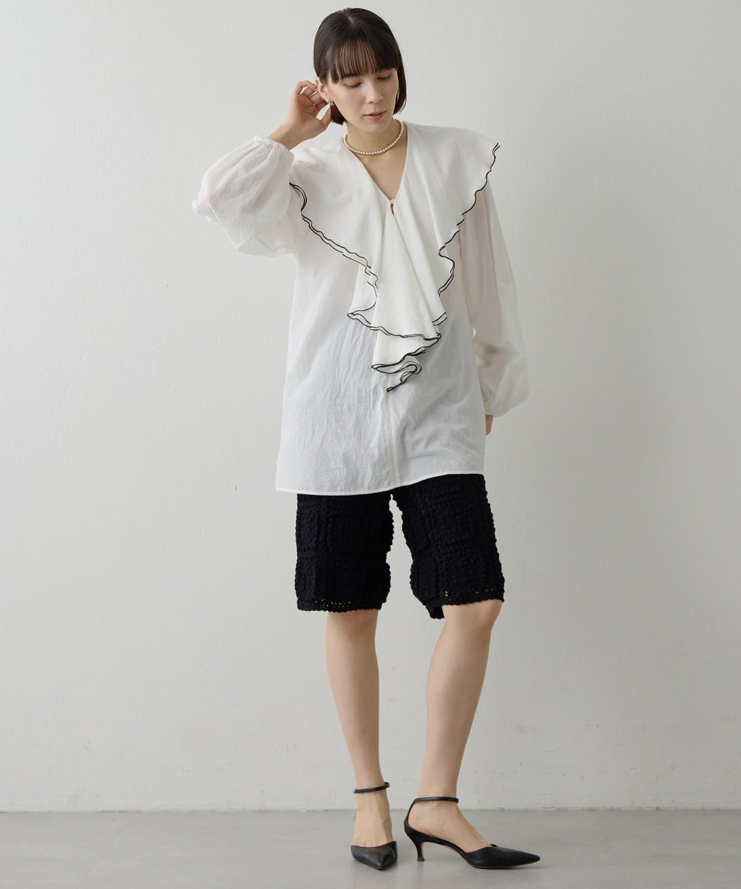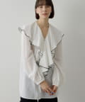 ■襟元に重ねたフリルが華やかさをプラスし、甘すぎず上品なバランスに。