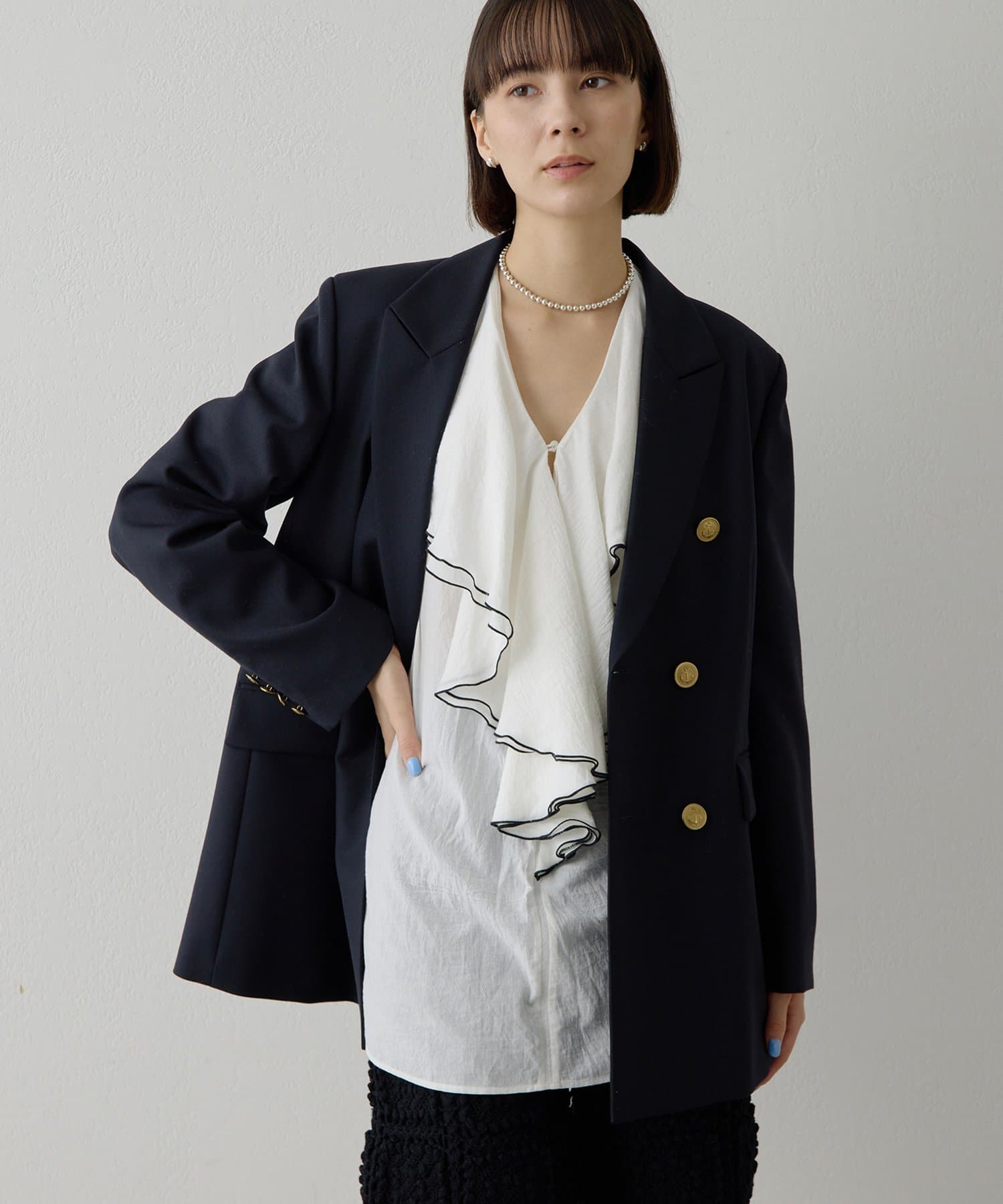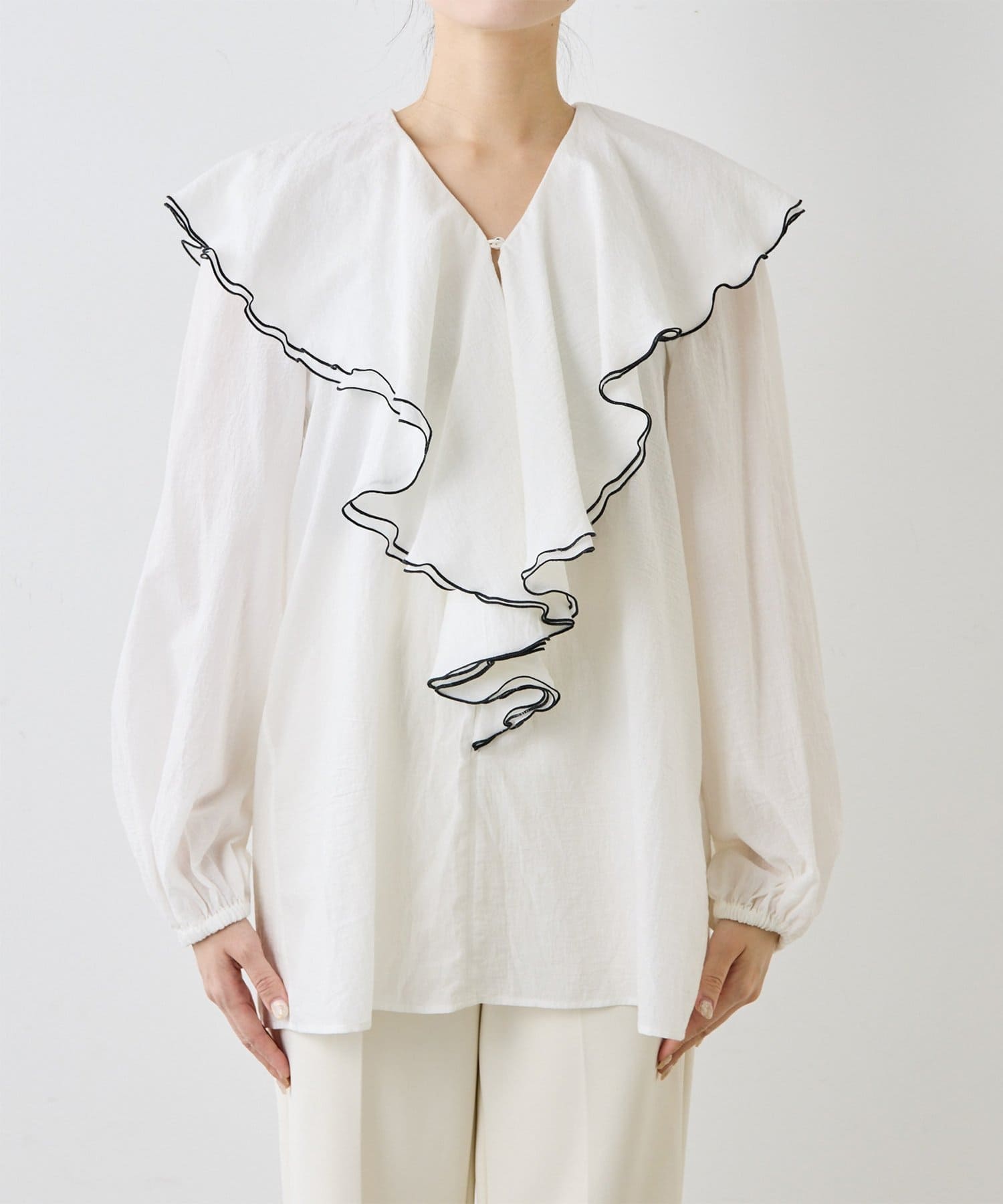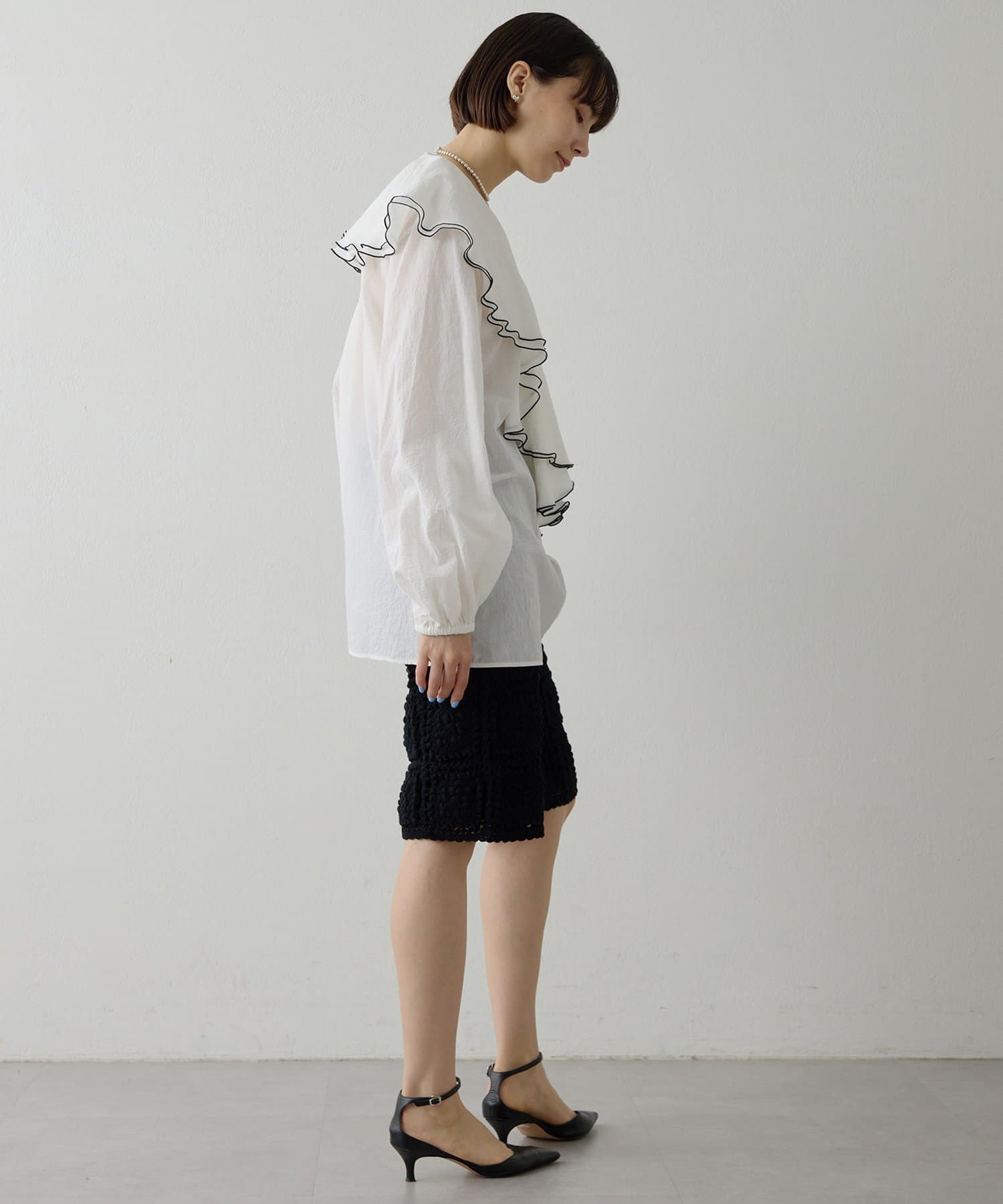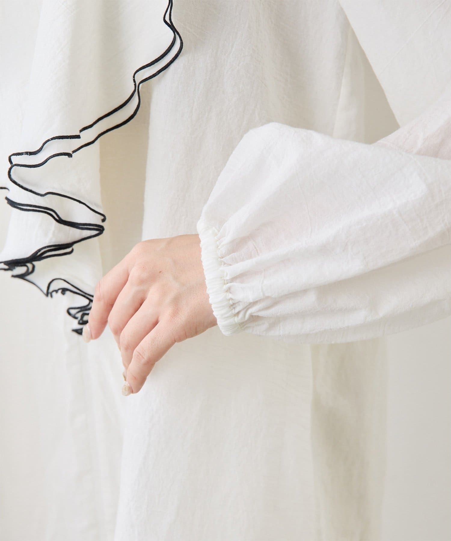 ■襟元に重ねたフリルが華やかさをプラスし、甘すぎず上品なバランスに。