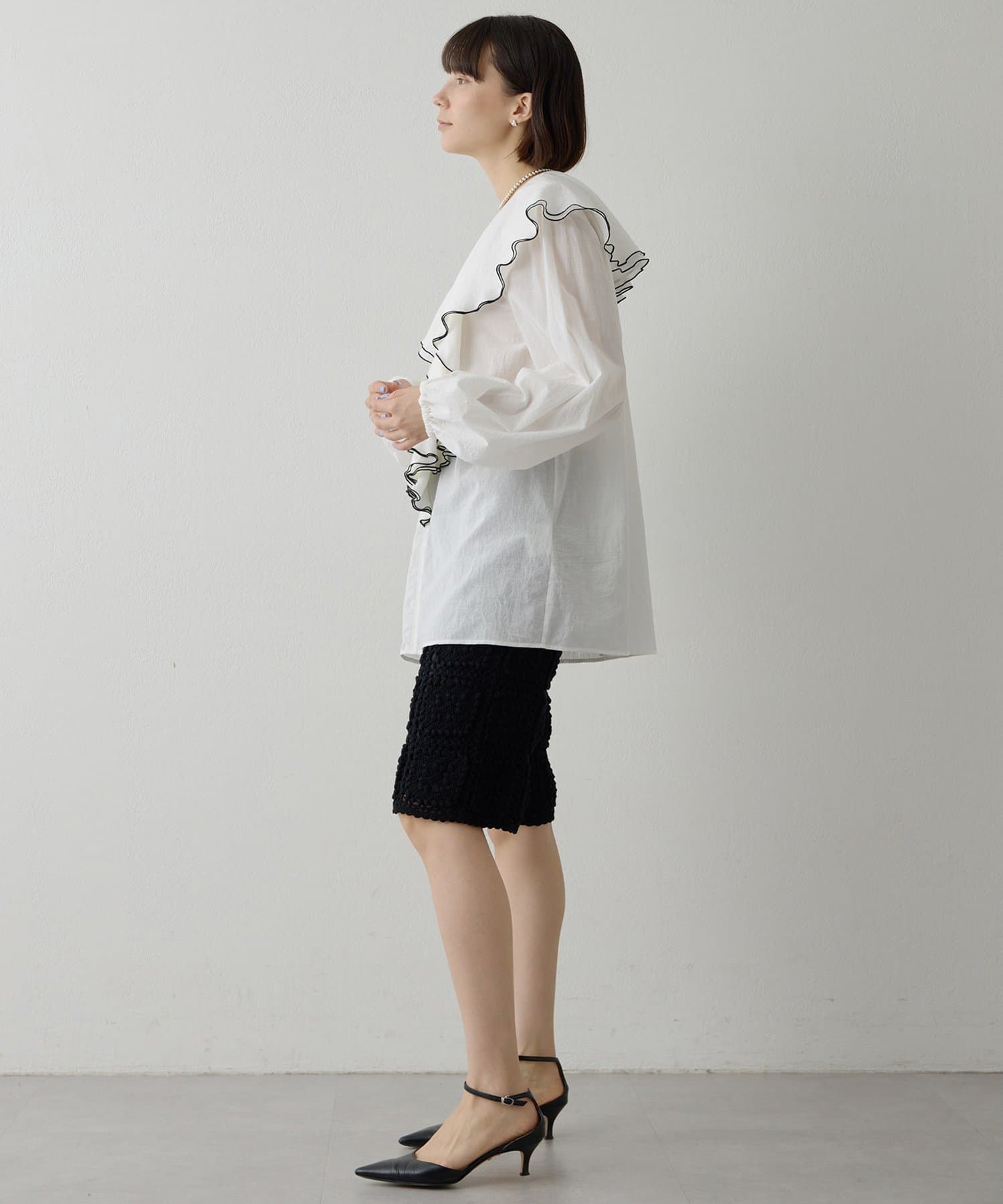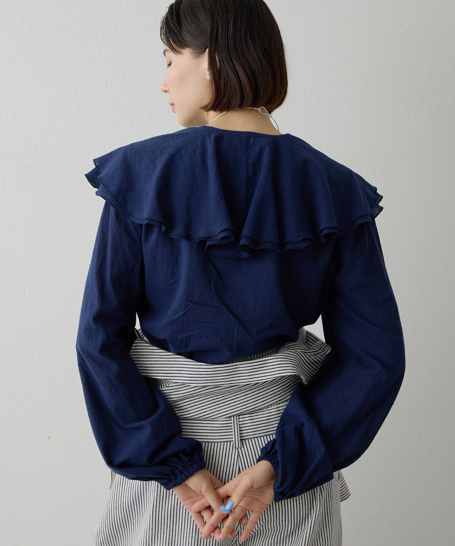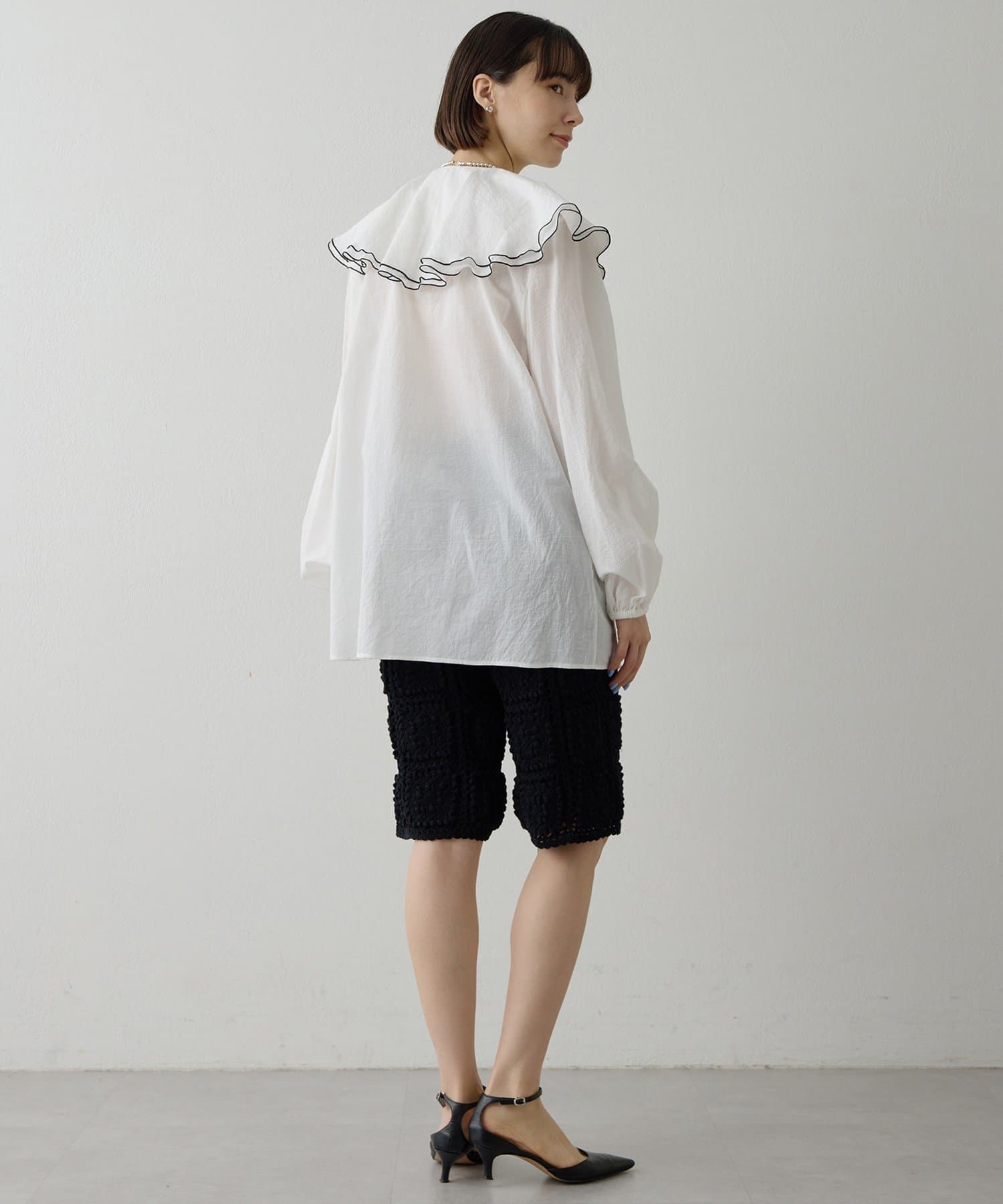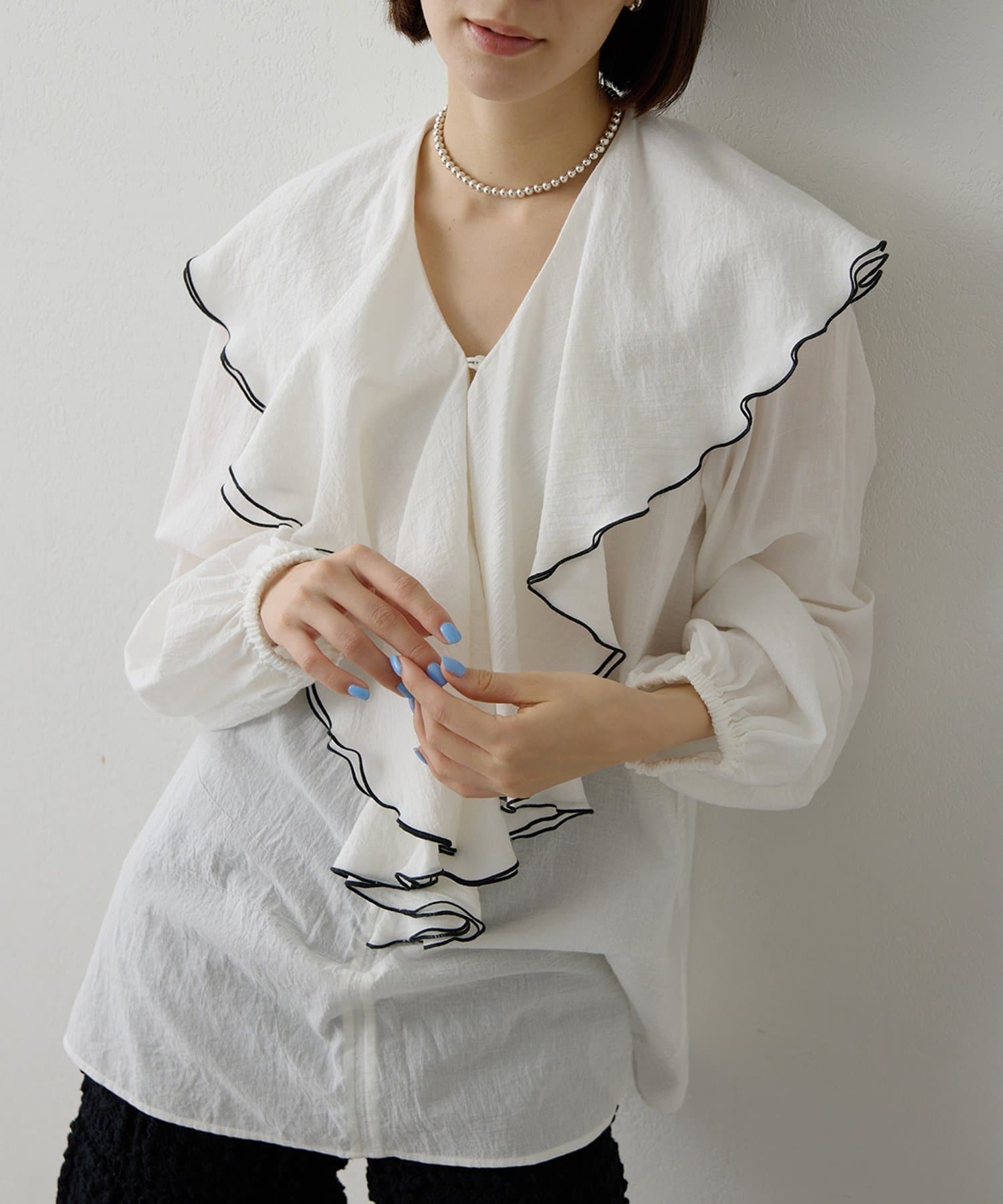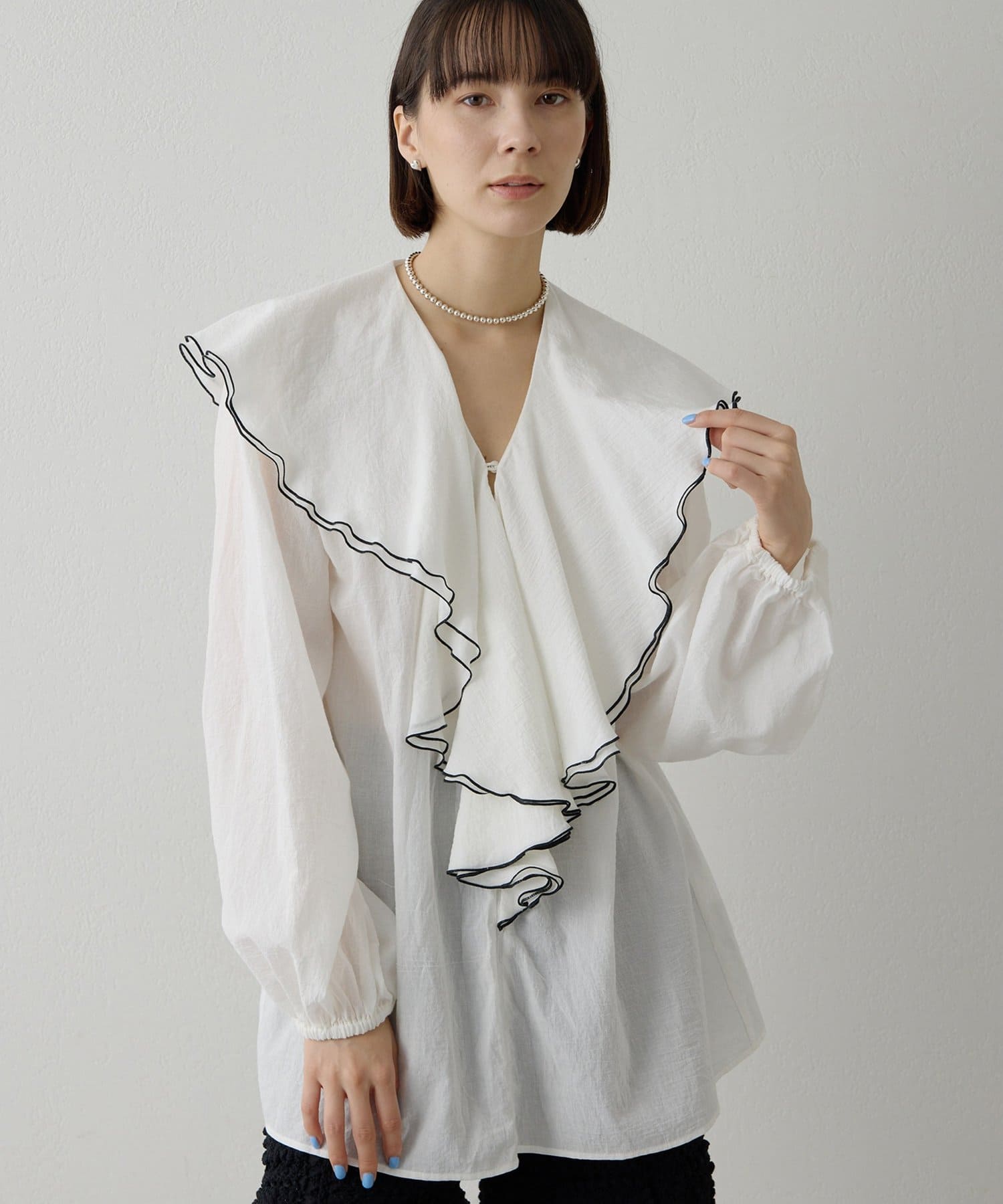 ■襟元に重ねたフリルが華やかさをプラスし、甘すぎず上品なバランスに。