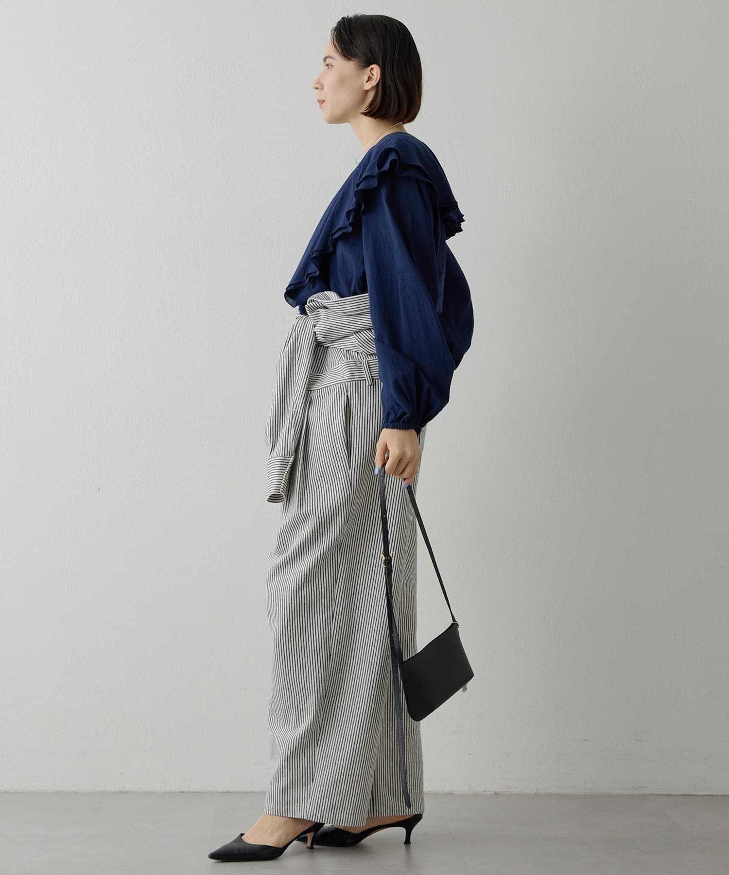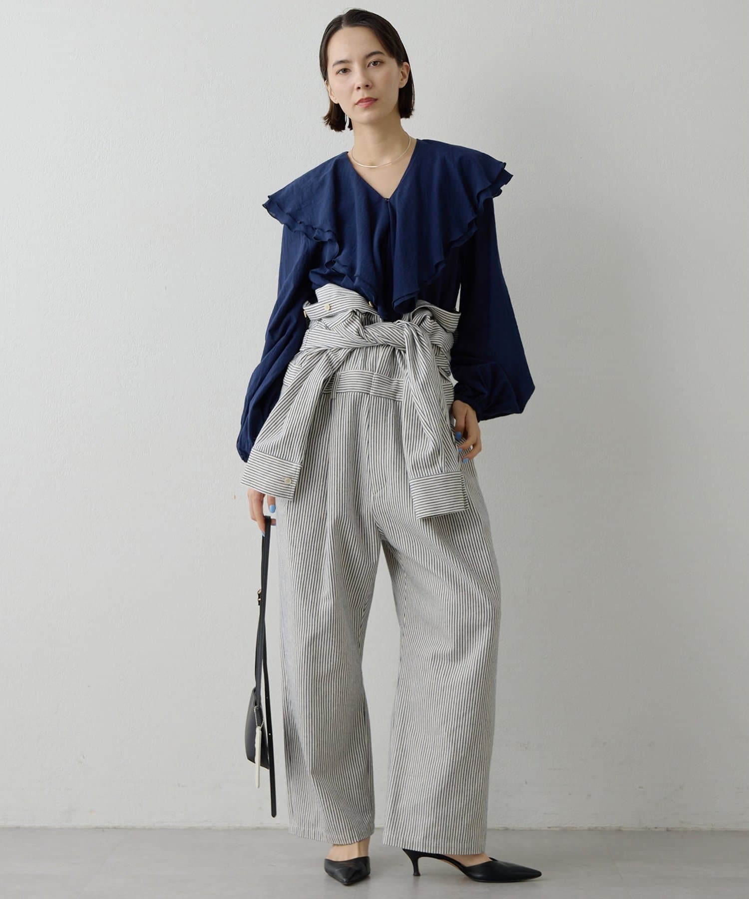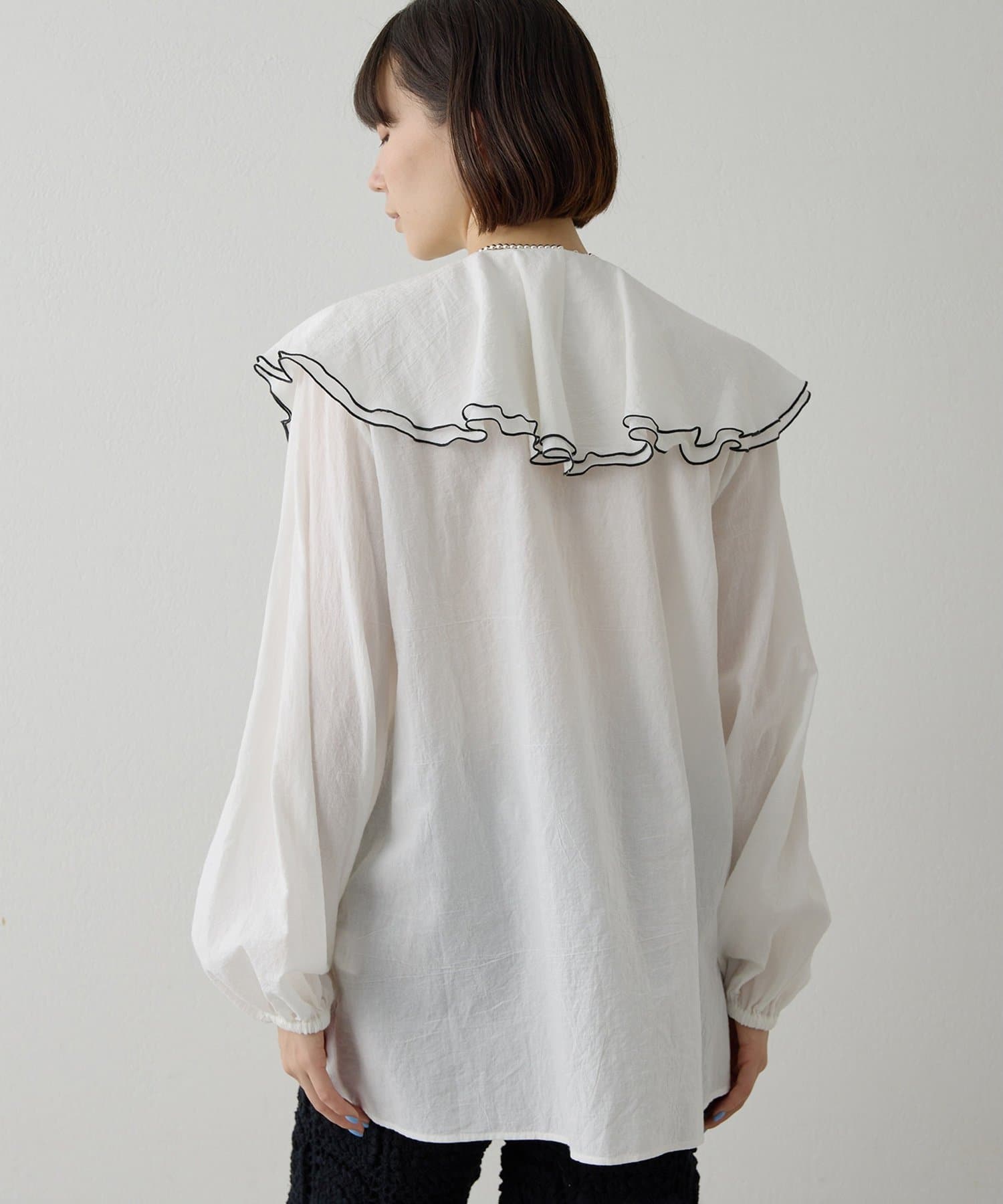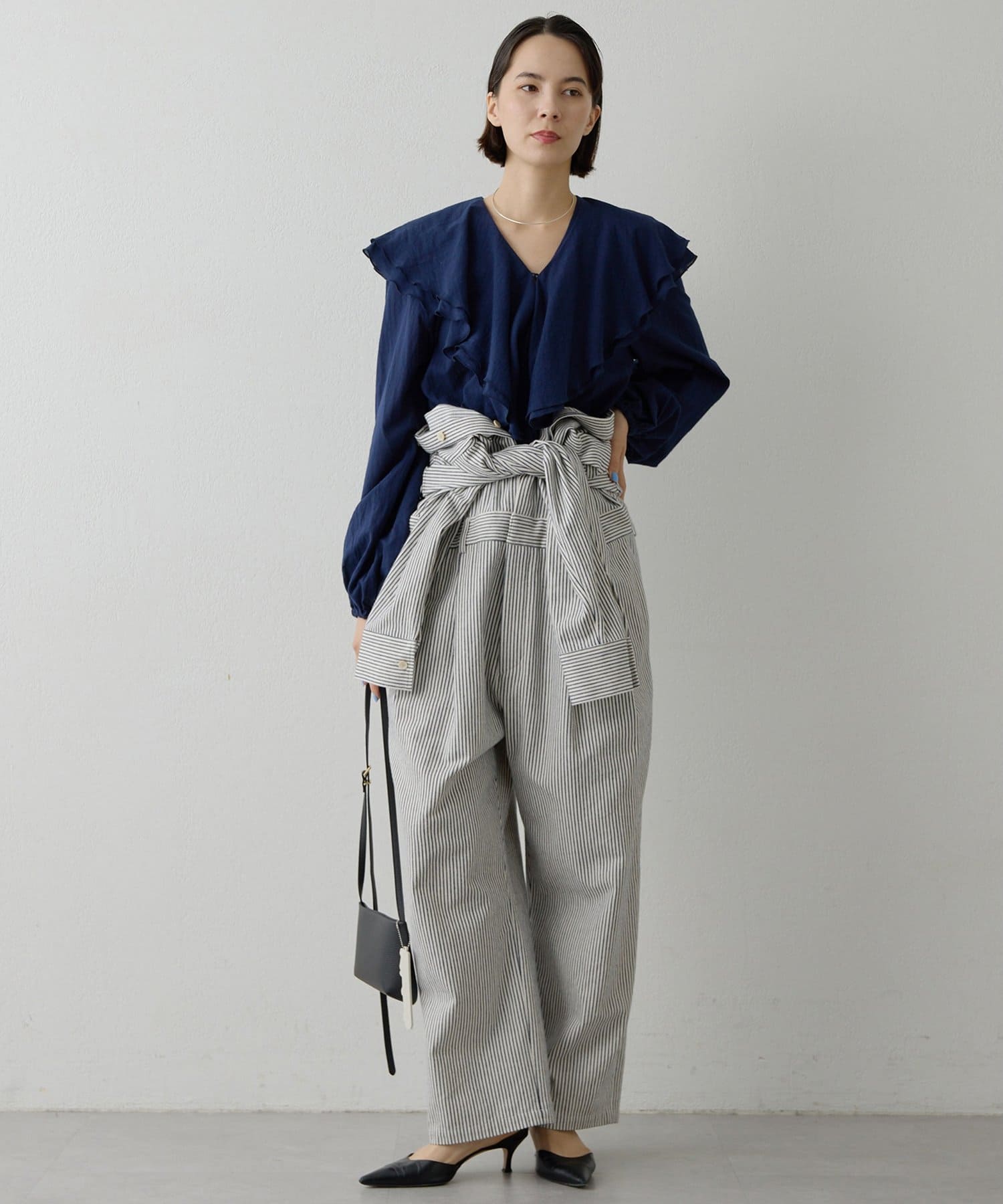 ■襟元に重ねたフリルが華やかさをプラスし、甘すぎず上品なバランスに。