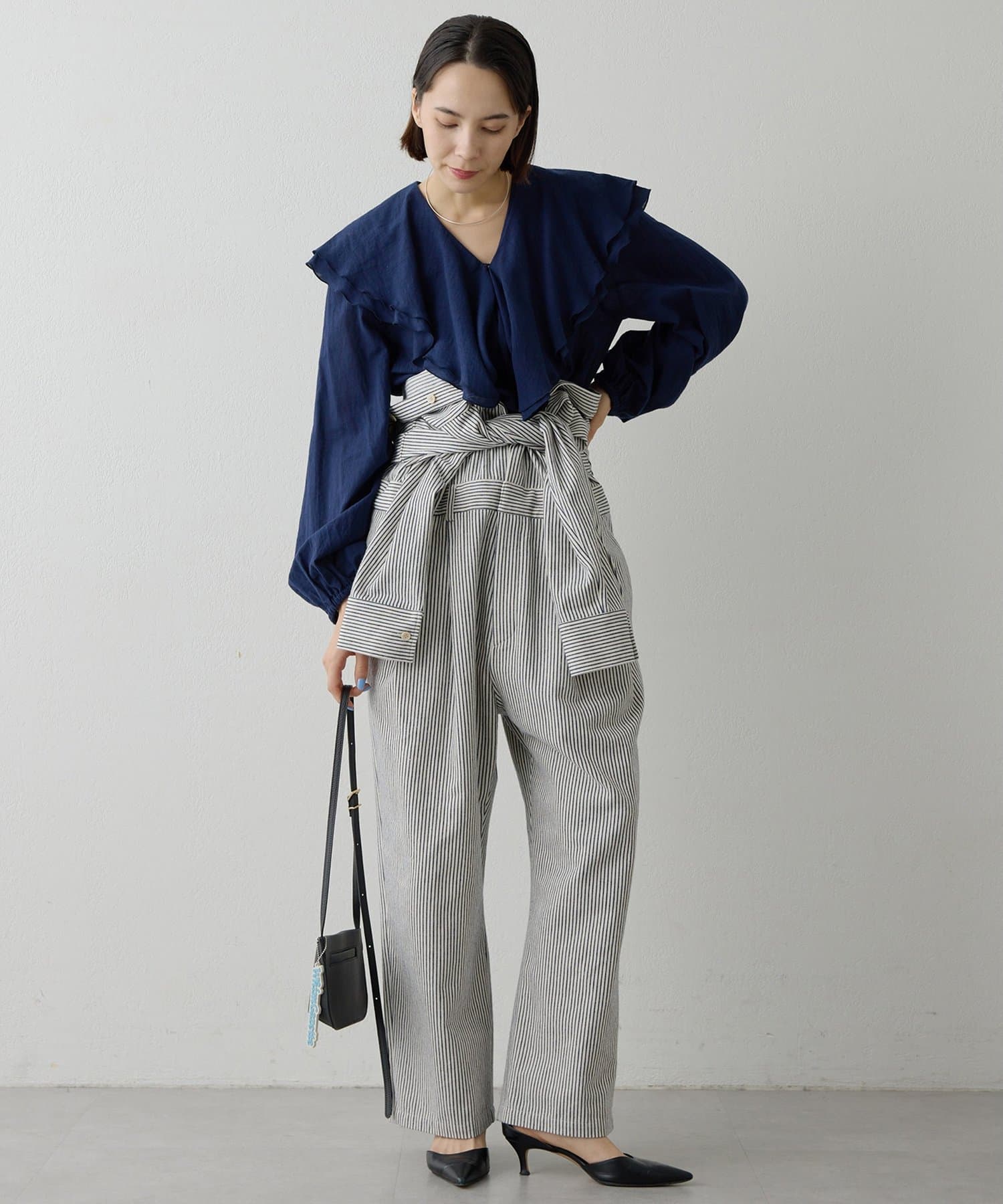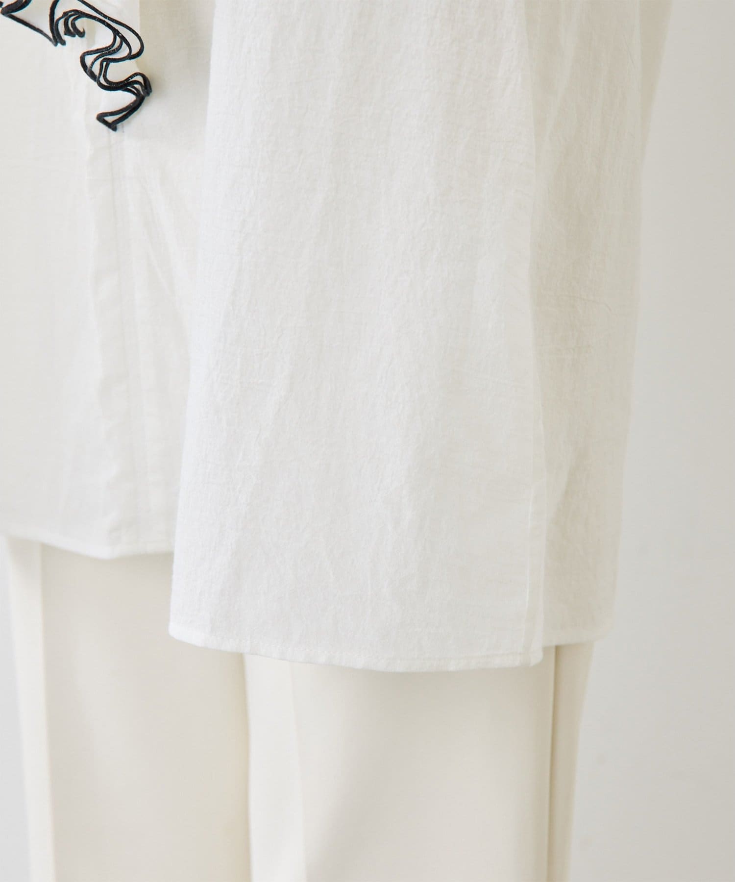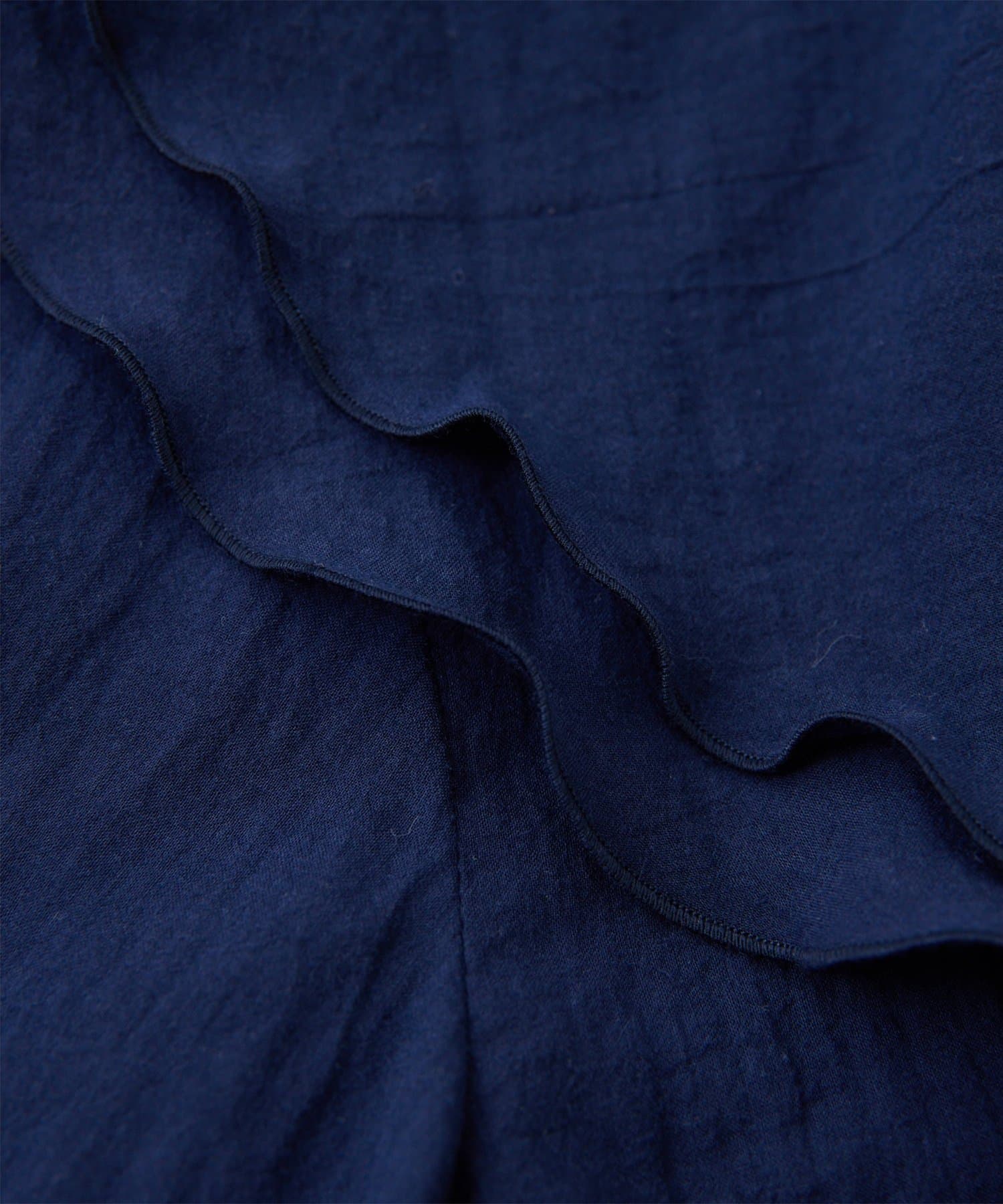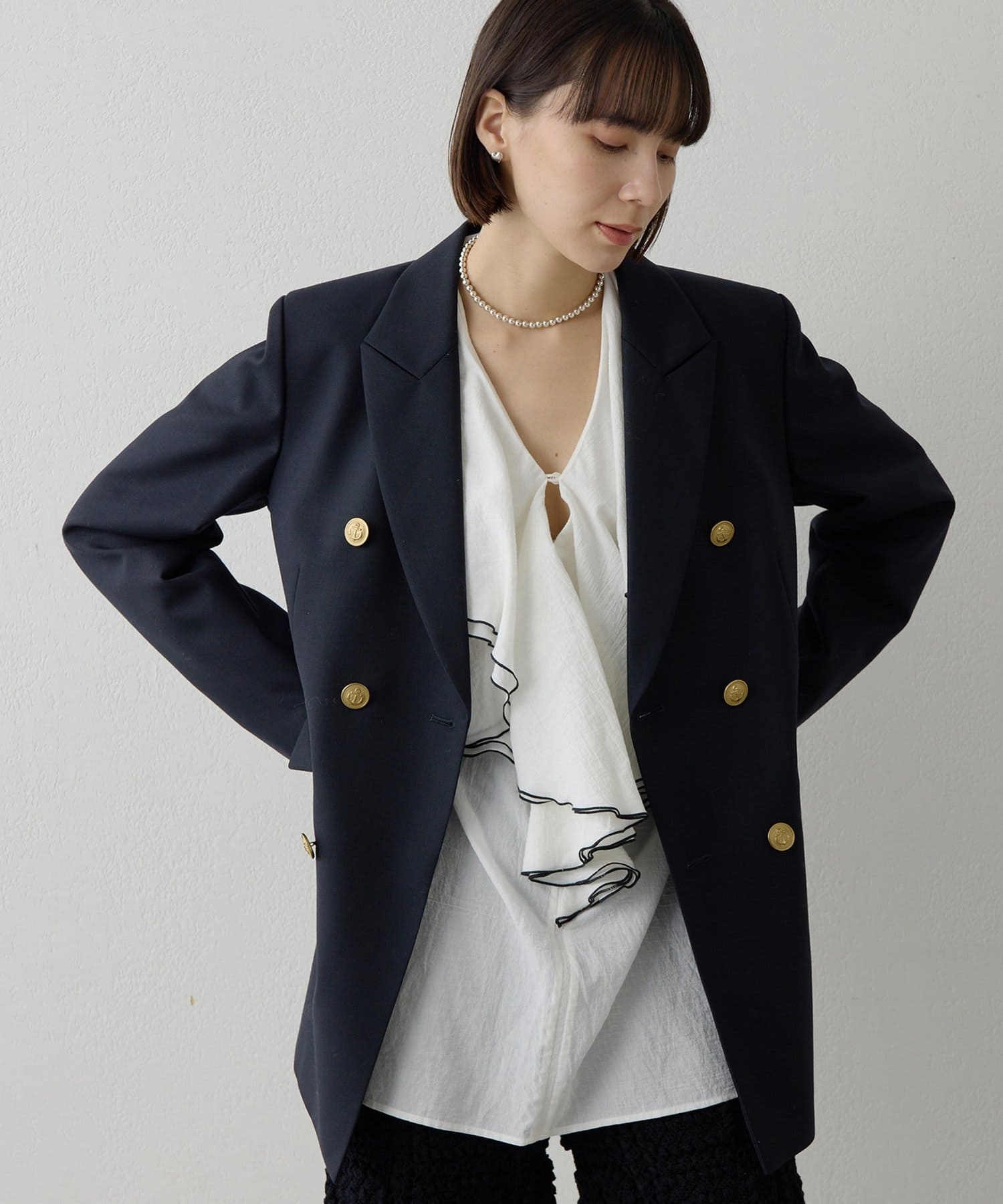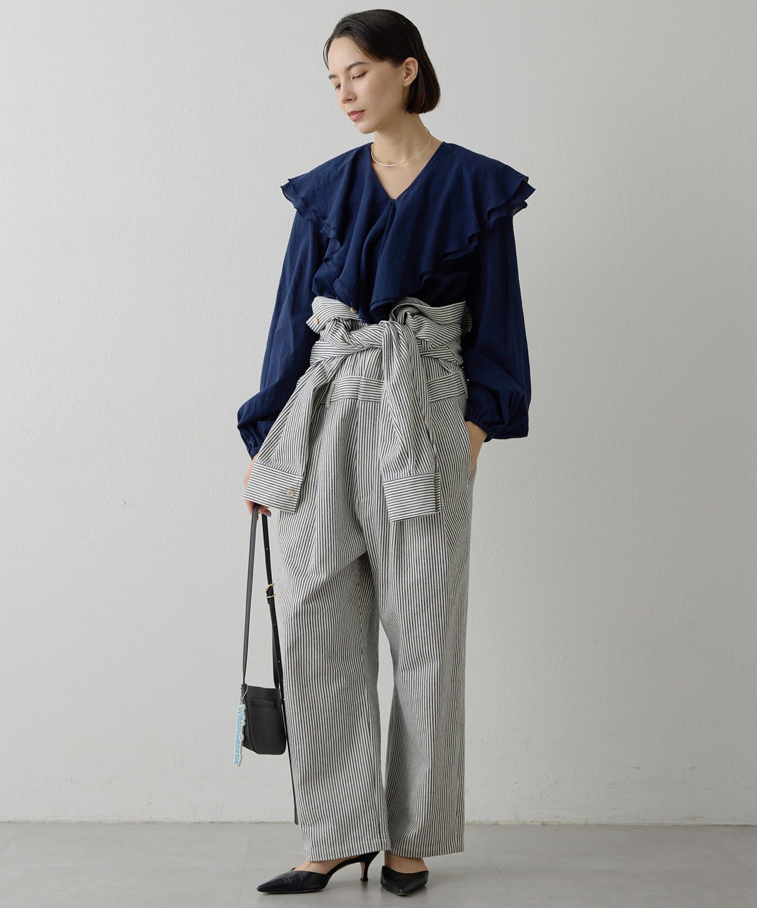 ■襟元に重ねたフリルが華やかさをプラスし、甘すぎず上品なバランスに。