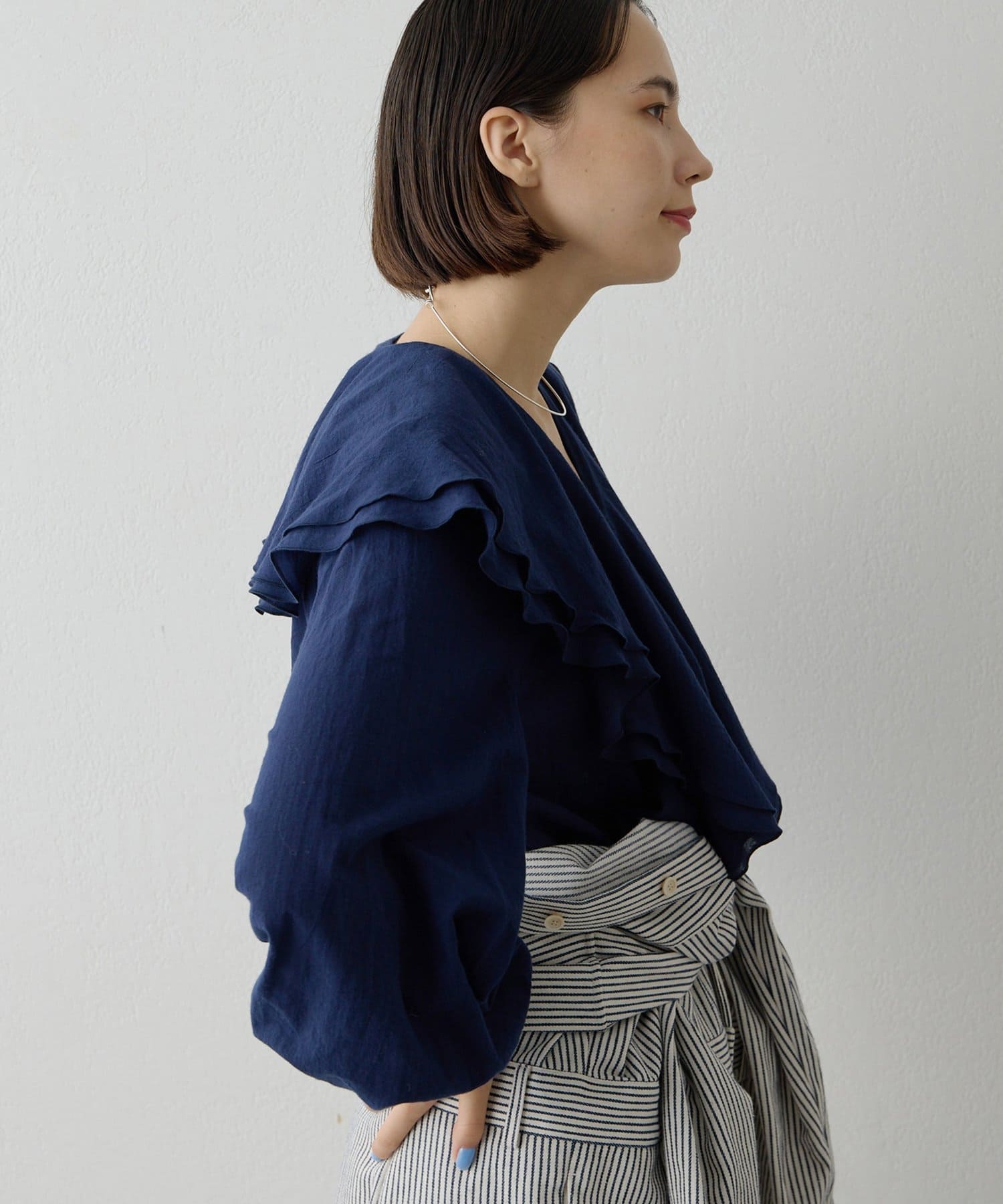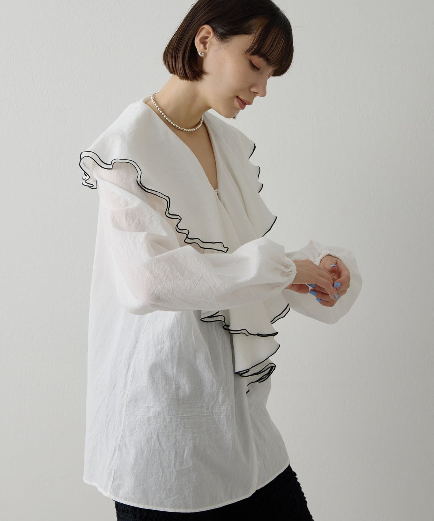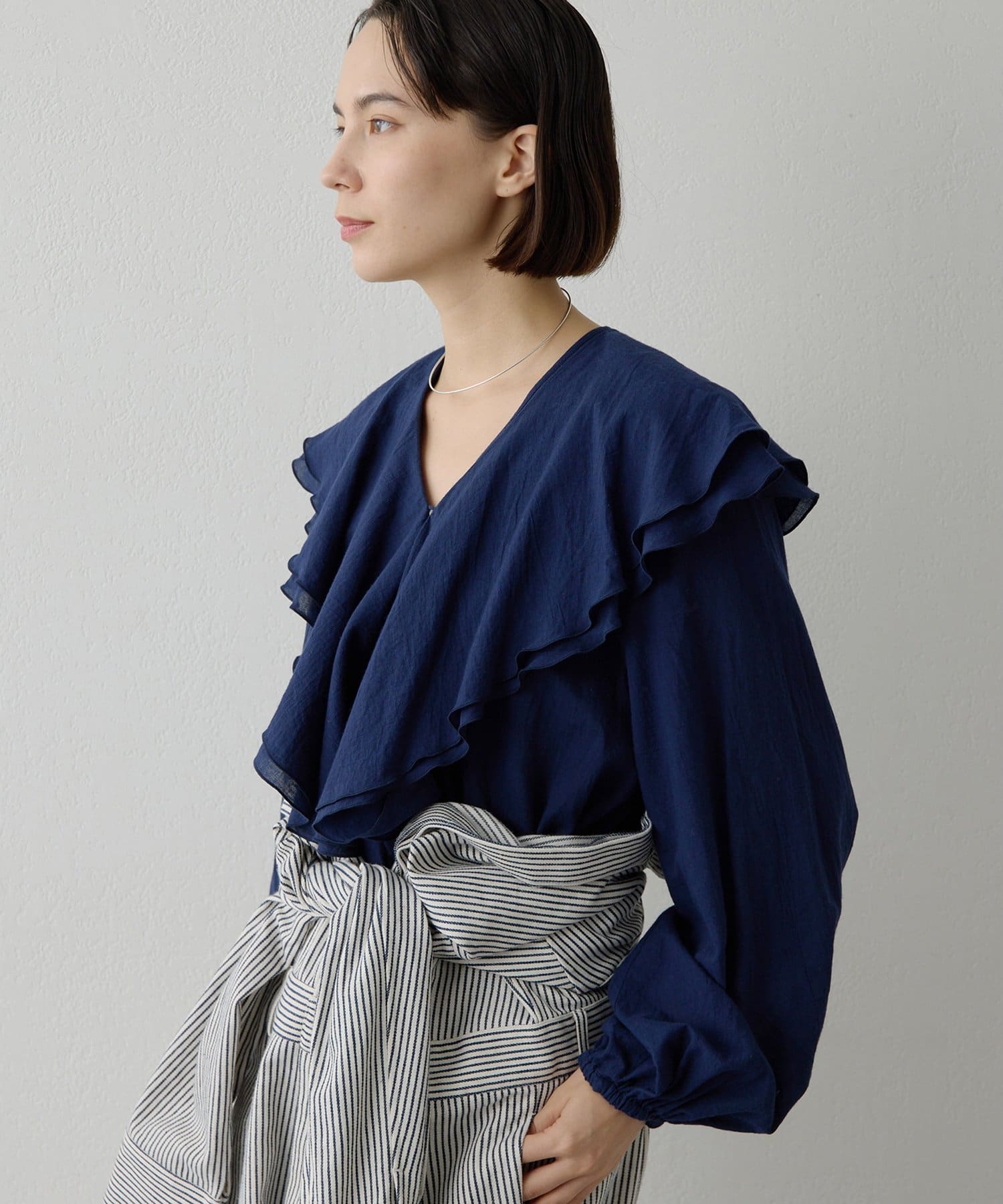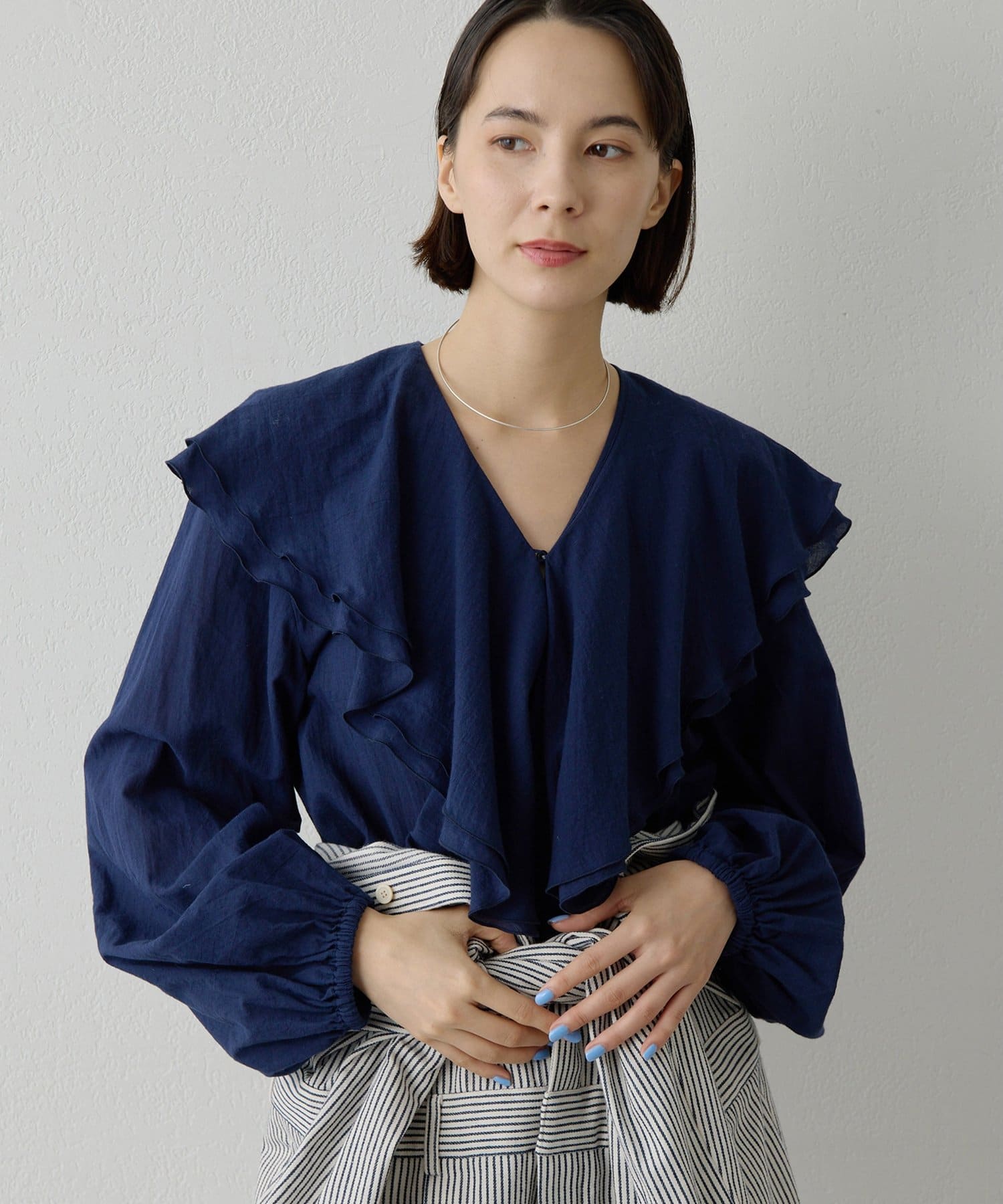 ■軽やかなローン素材で仕立てた、フェミニンな印象のフリルブラウス。