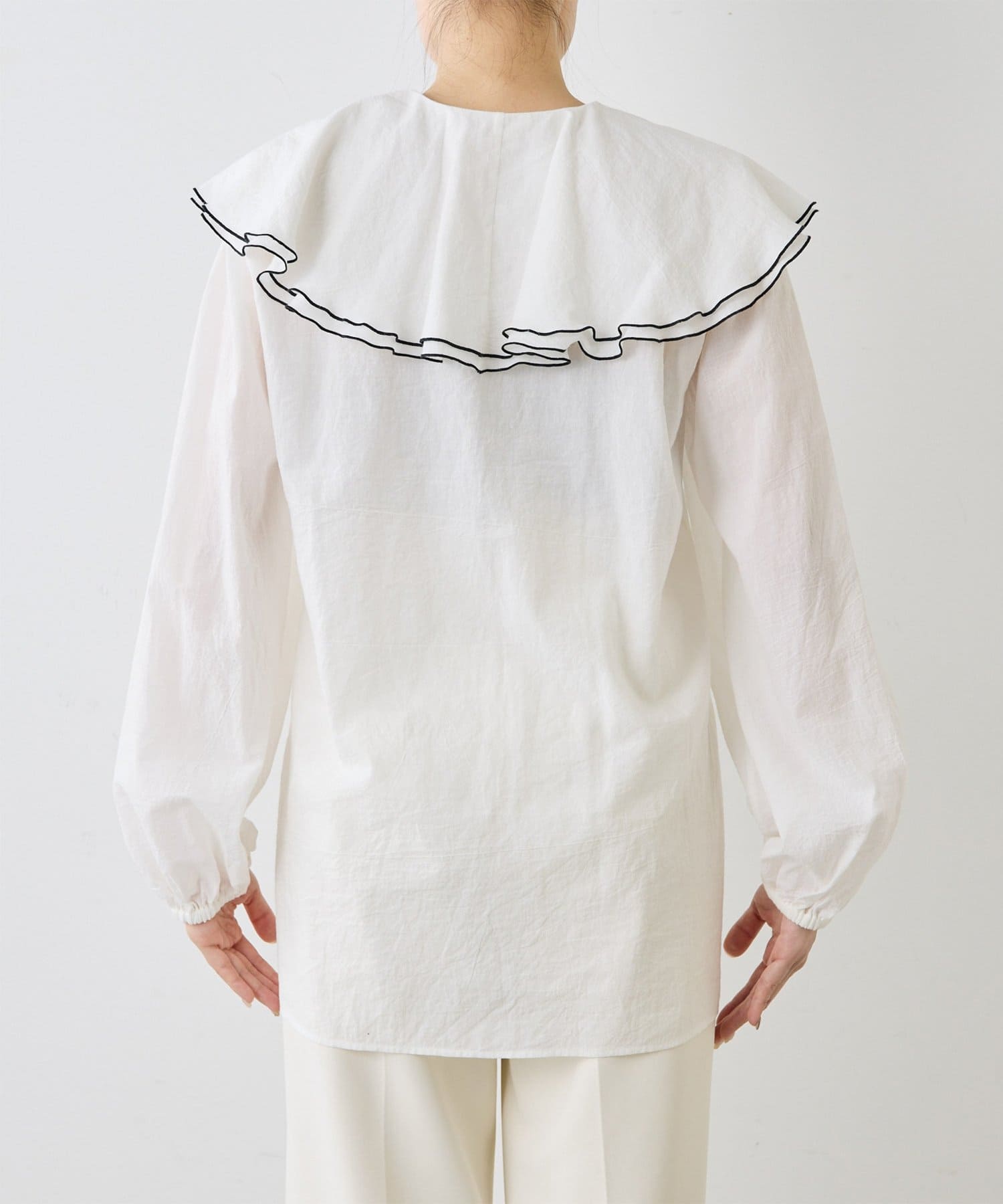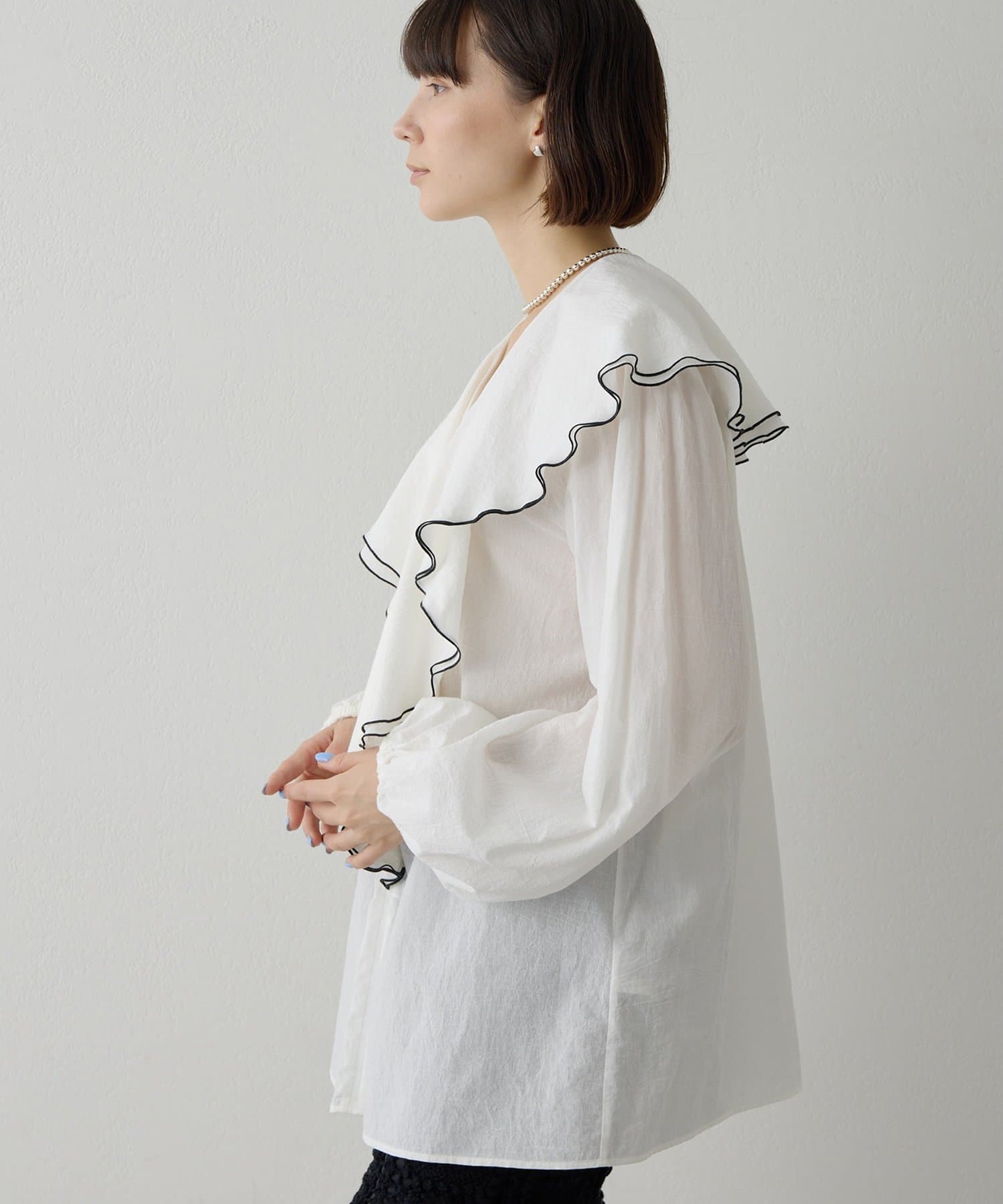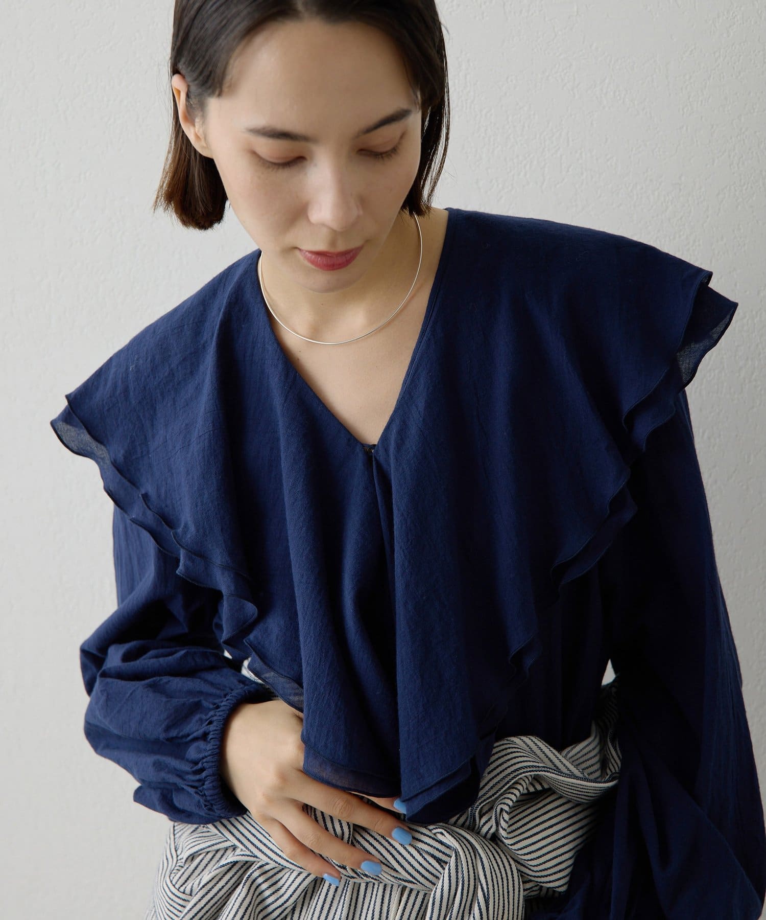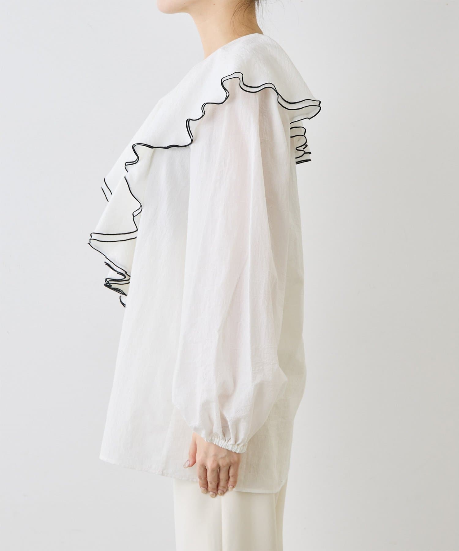 ■軽やかなローン素材で仕立てた、フェミニンな印象のフリルブラウス。