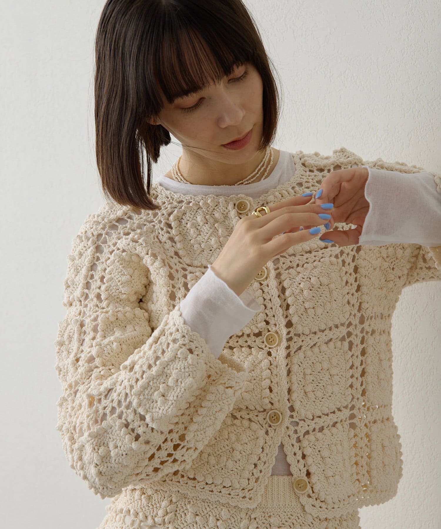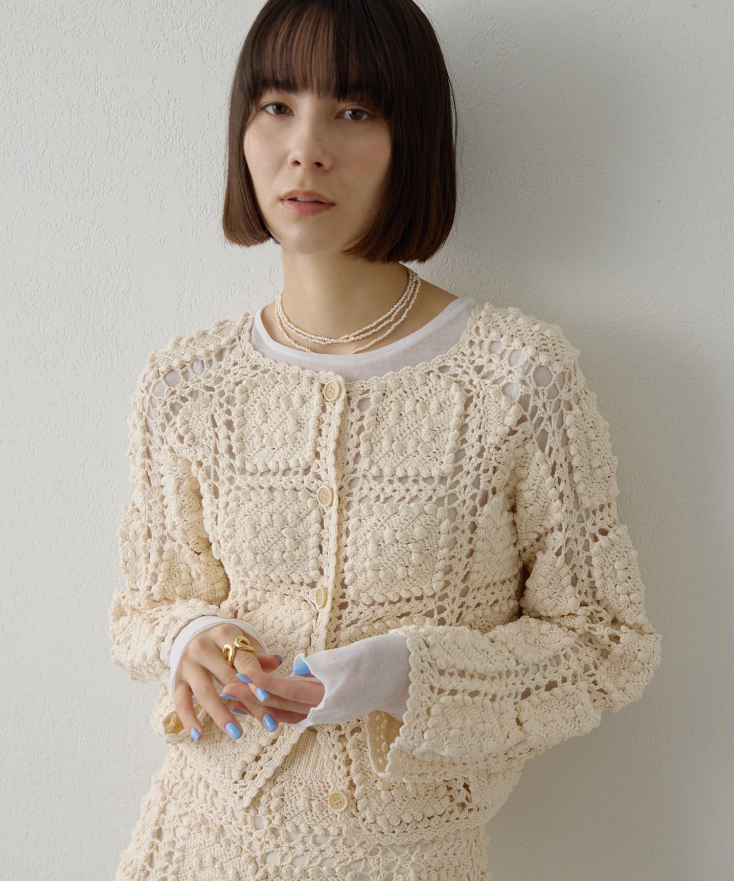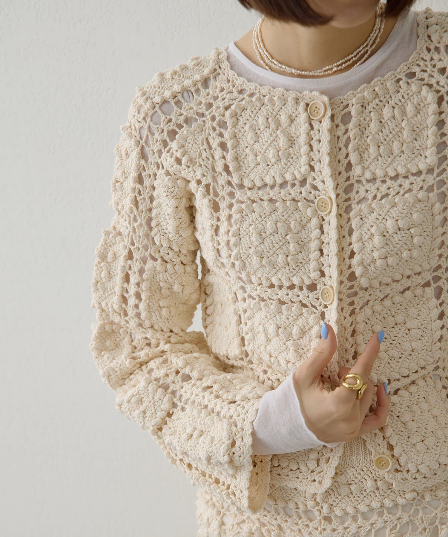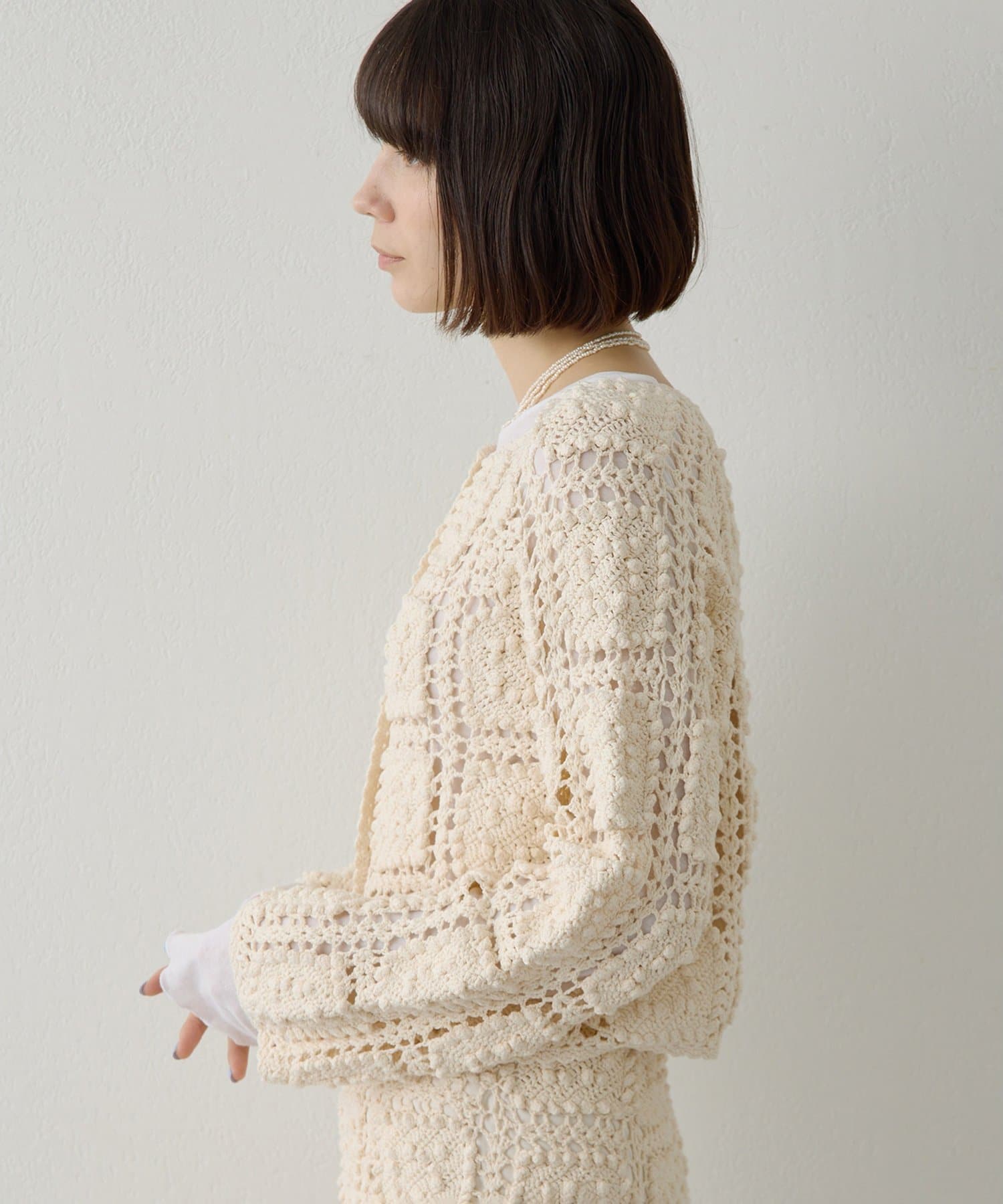 繊細なハンドクロシェで仕立てた、クラフト感あふれるカーディガン