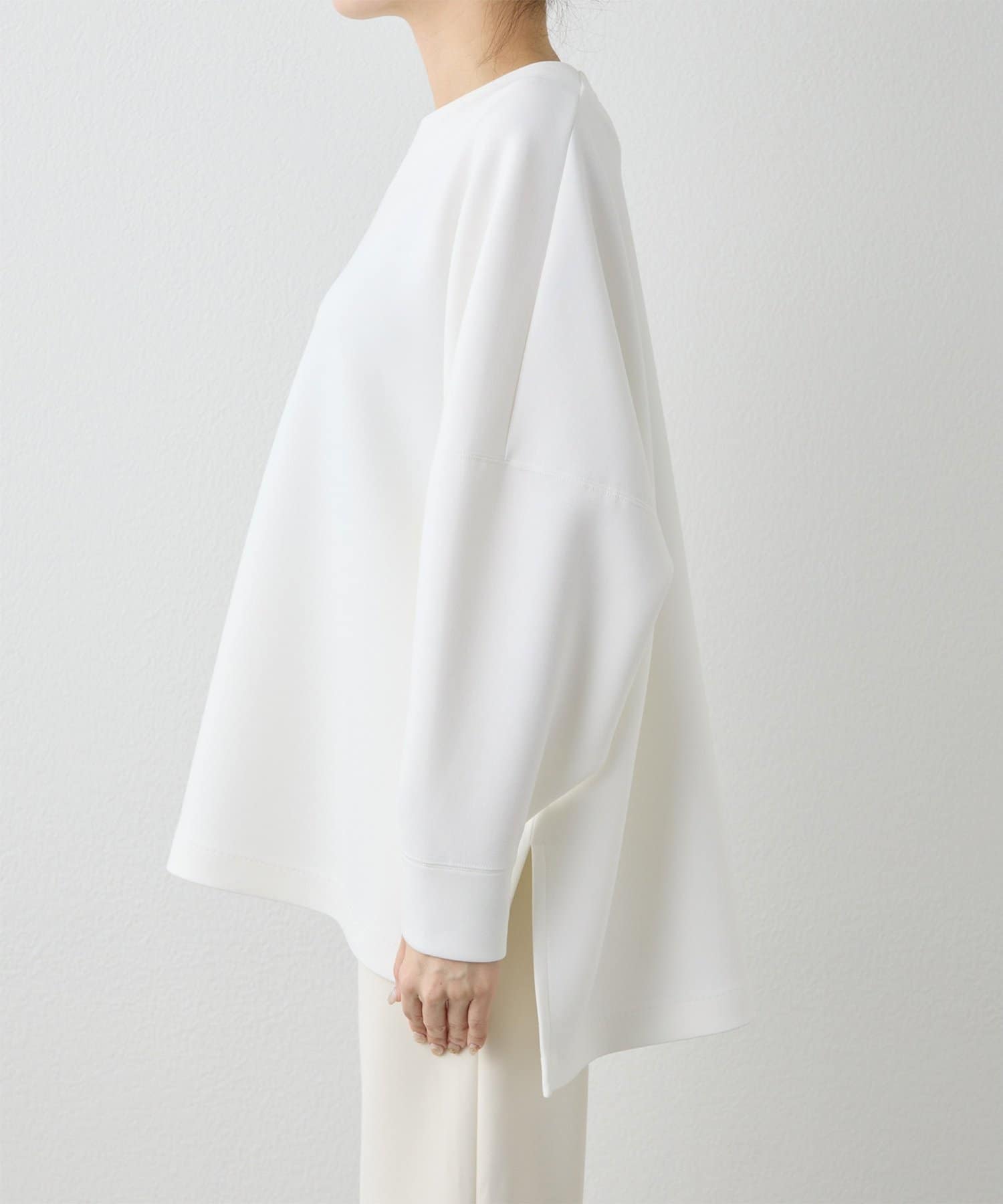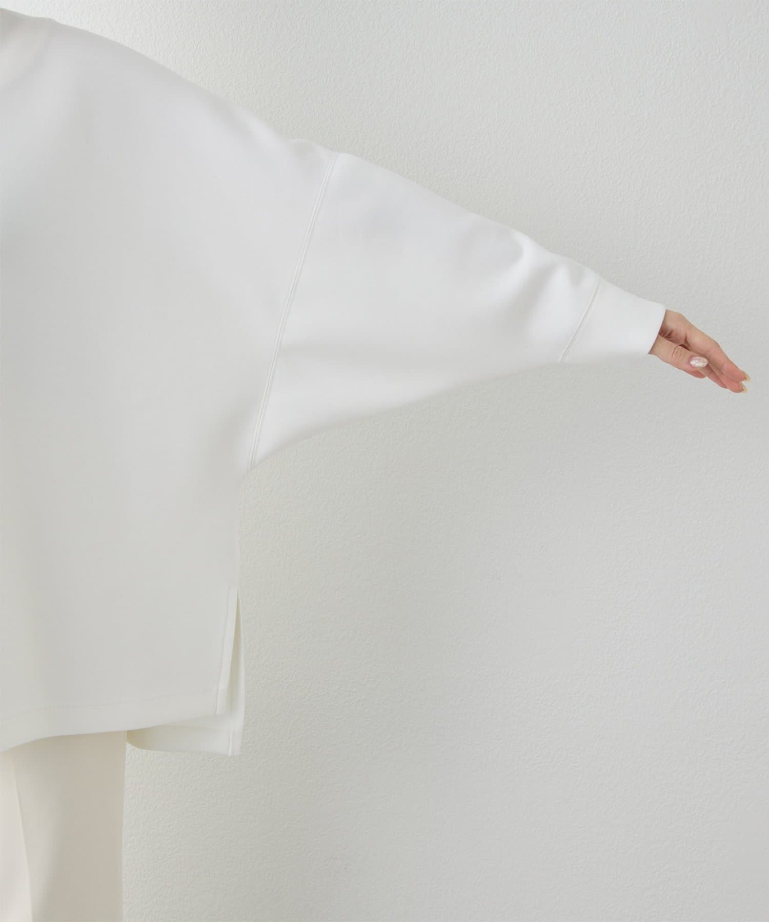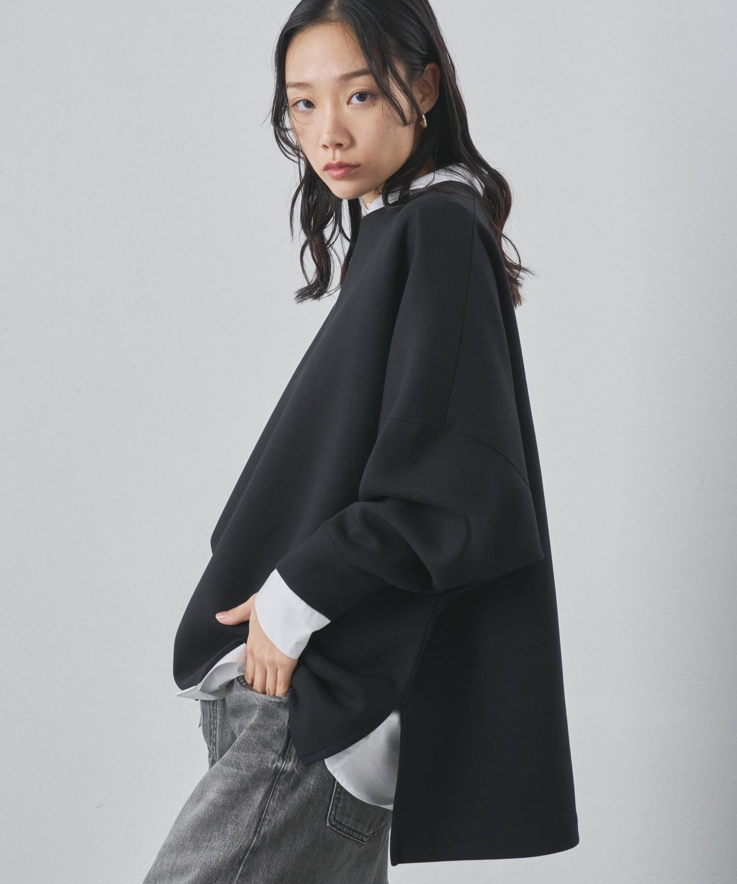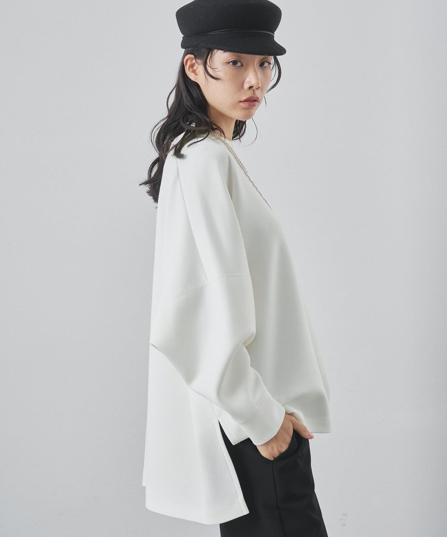 ■クルーネックのシンプルなデザインながら、ワイドな身幅と脇スリットで抜け感のあるシルエットを実現。