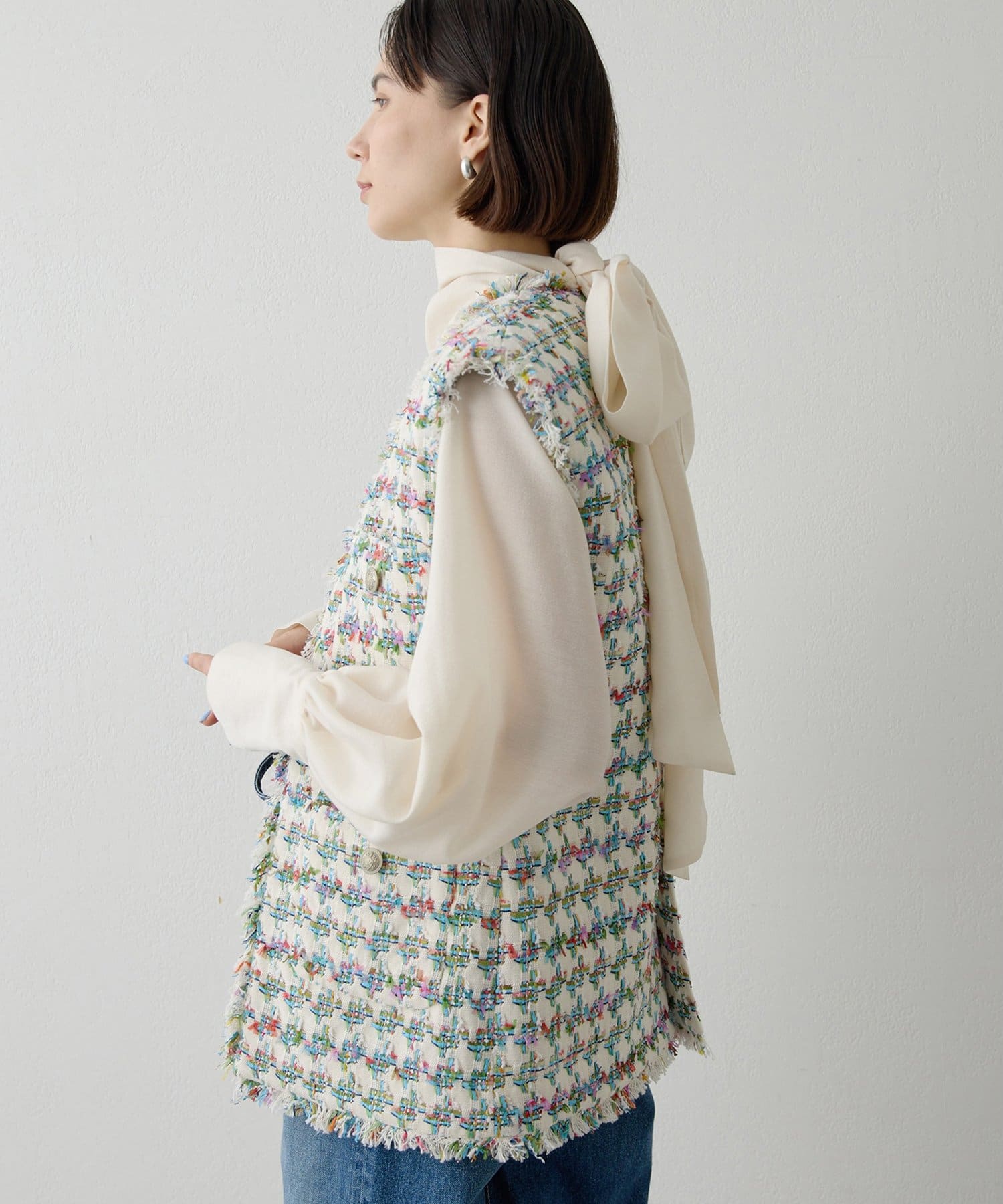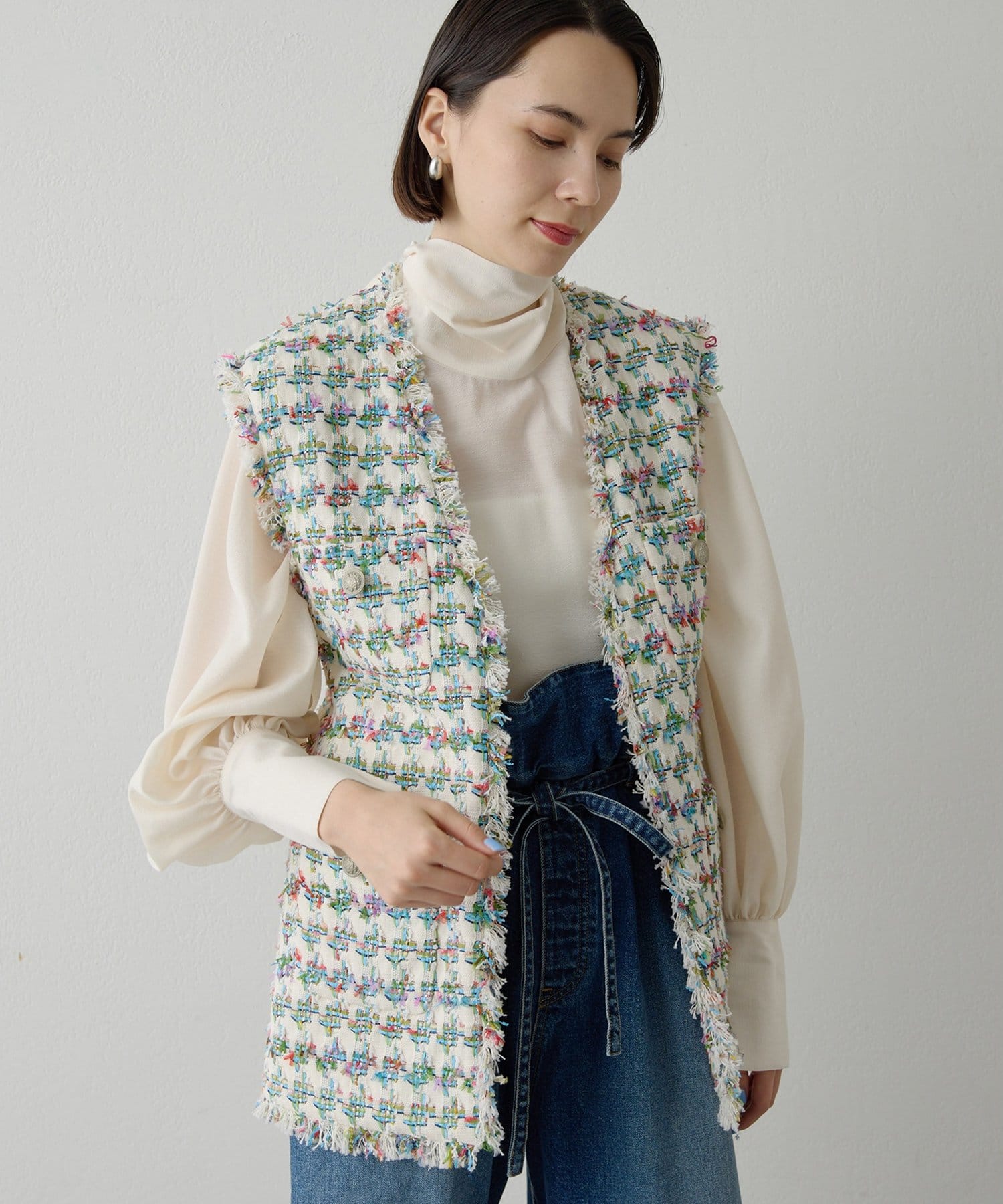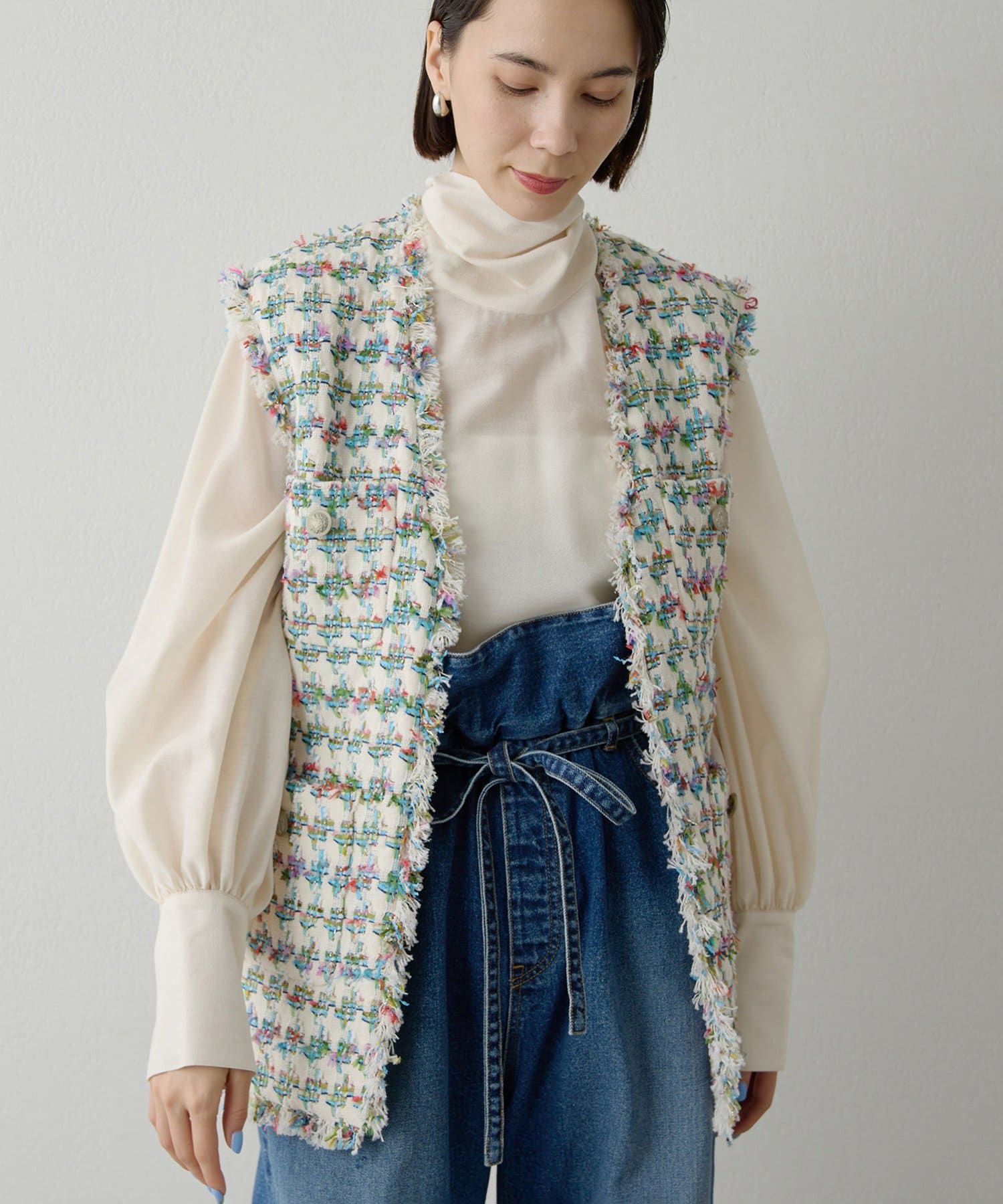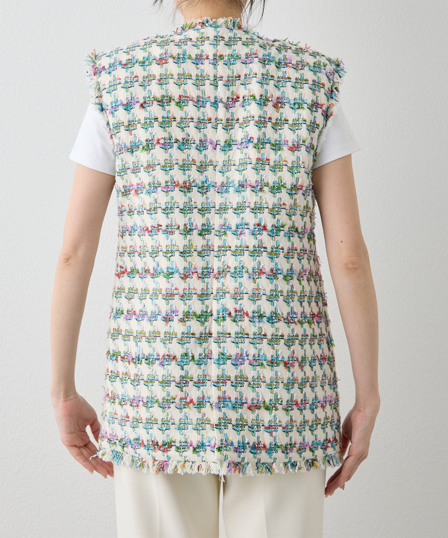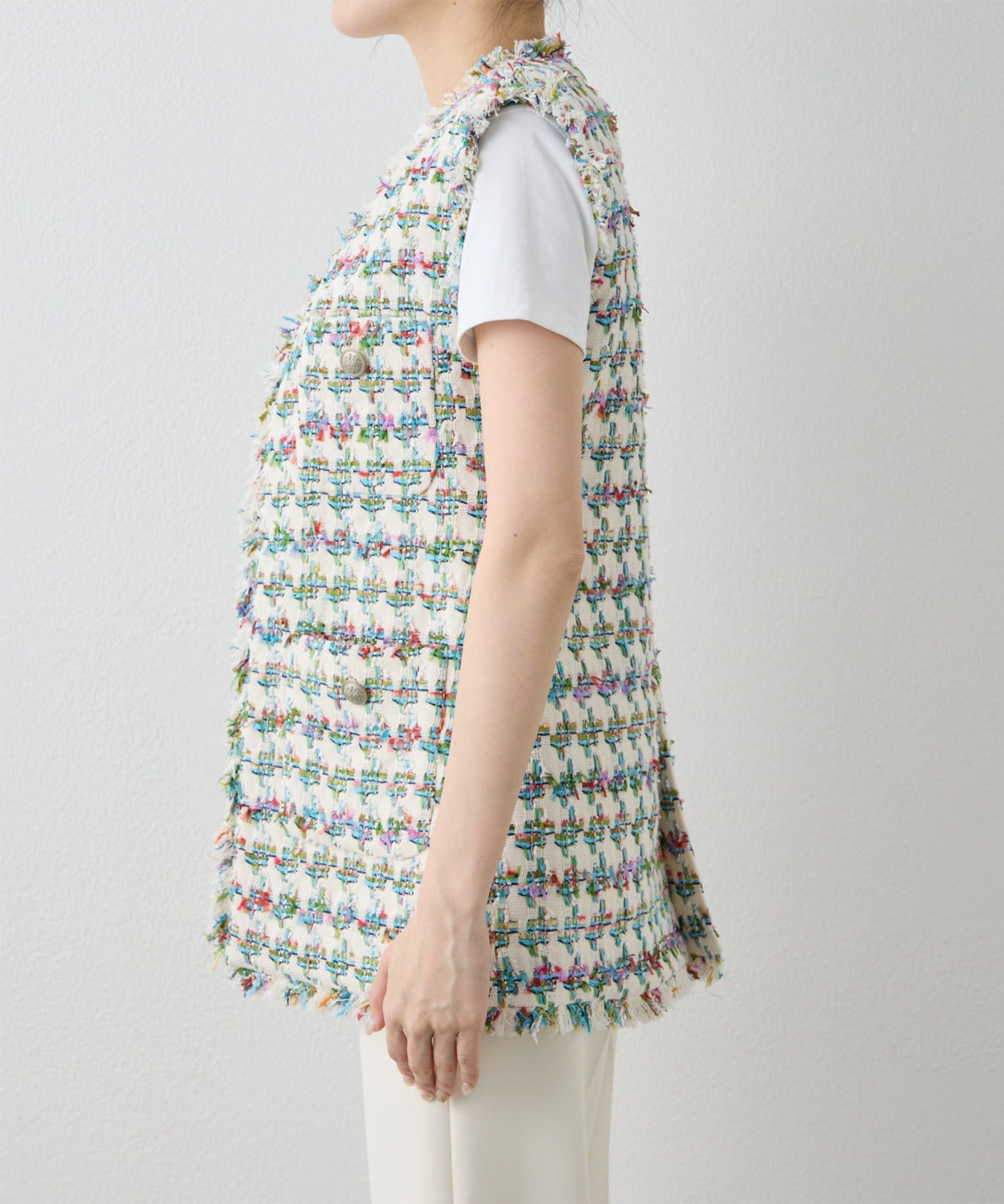 ■イギリスの老舗LINTON社の高品質なファンシーツイードでデザインされたジレ。