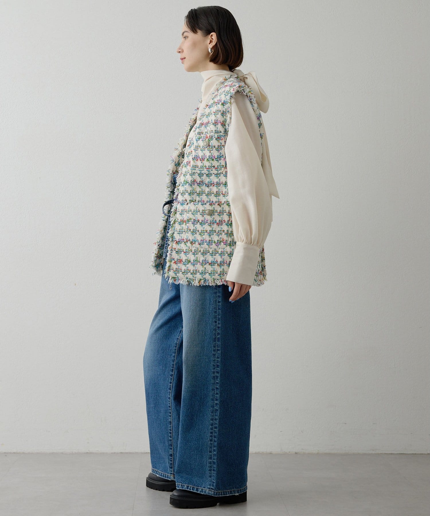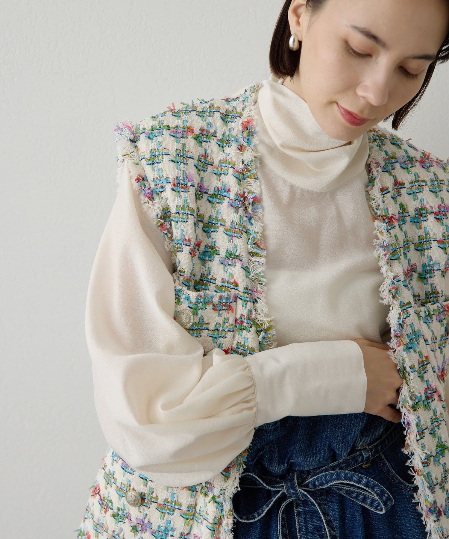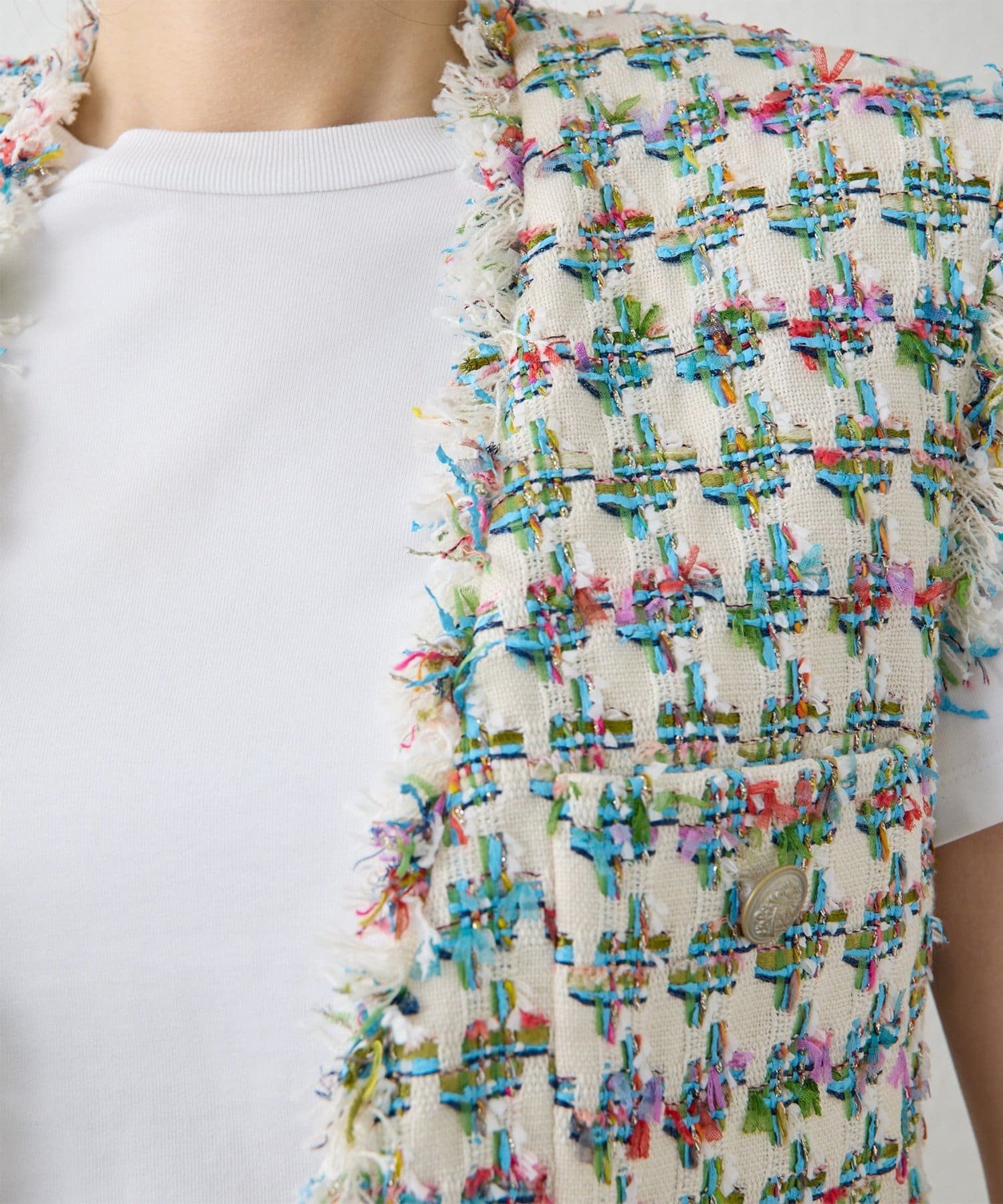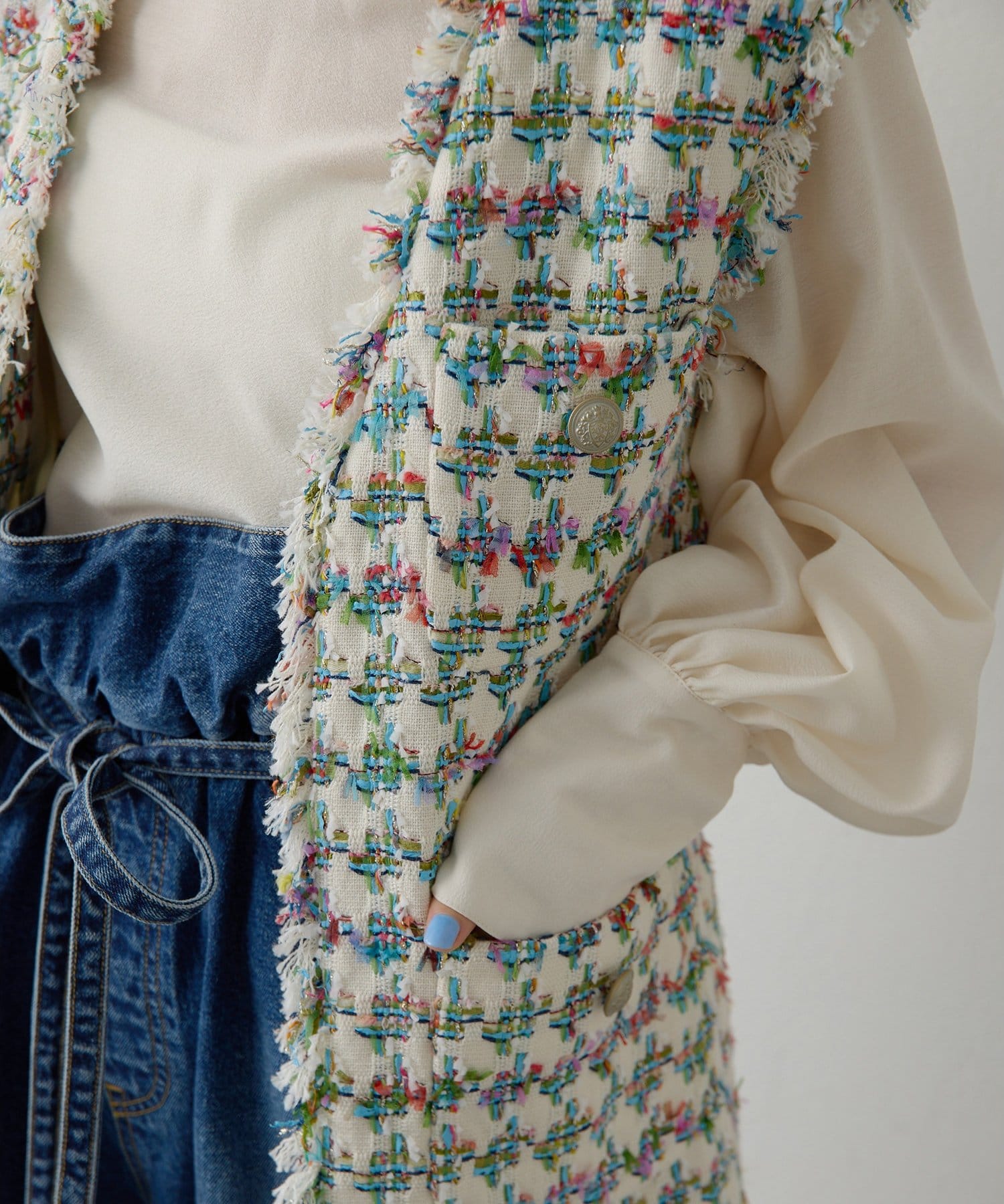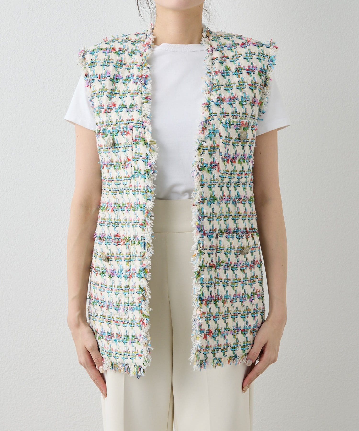 ■イギリスの老舗LINTON社の高品質なファンシーツイードでデザインされたジレ。
