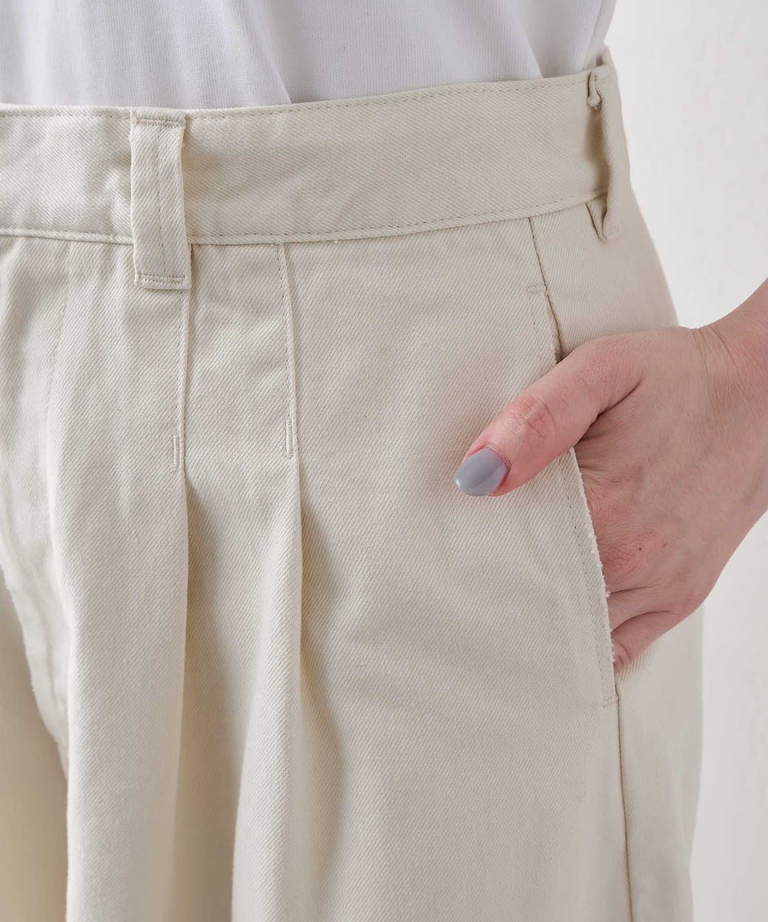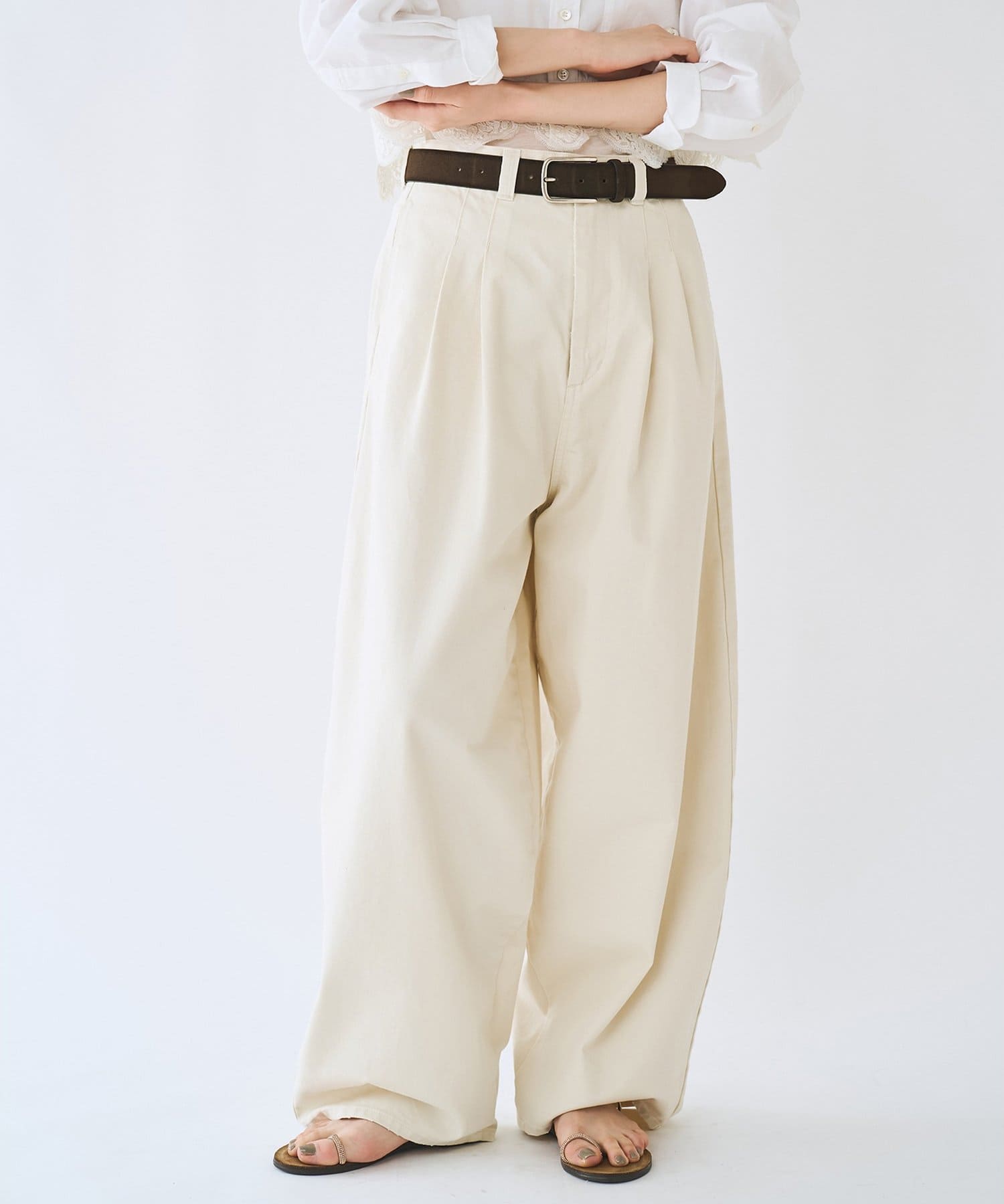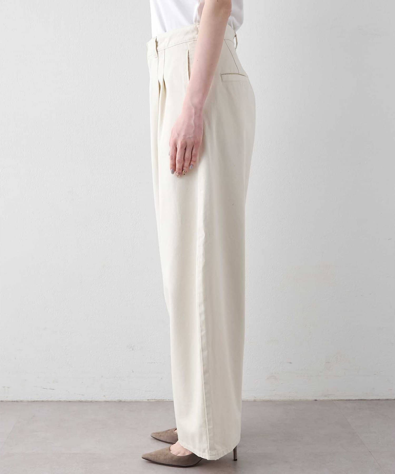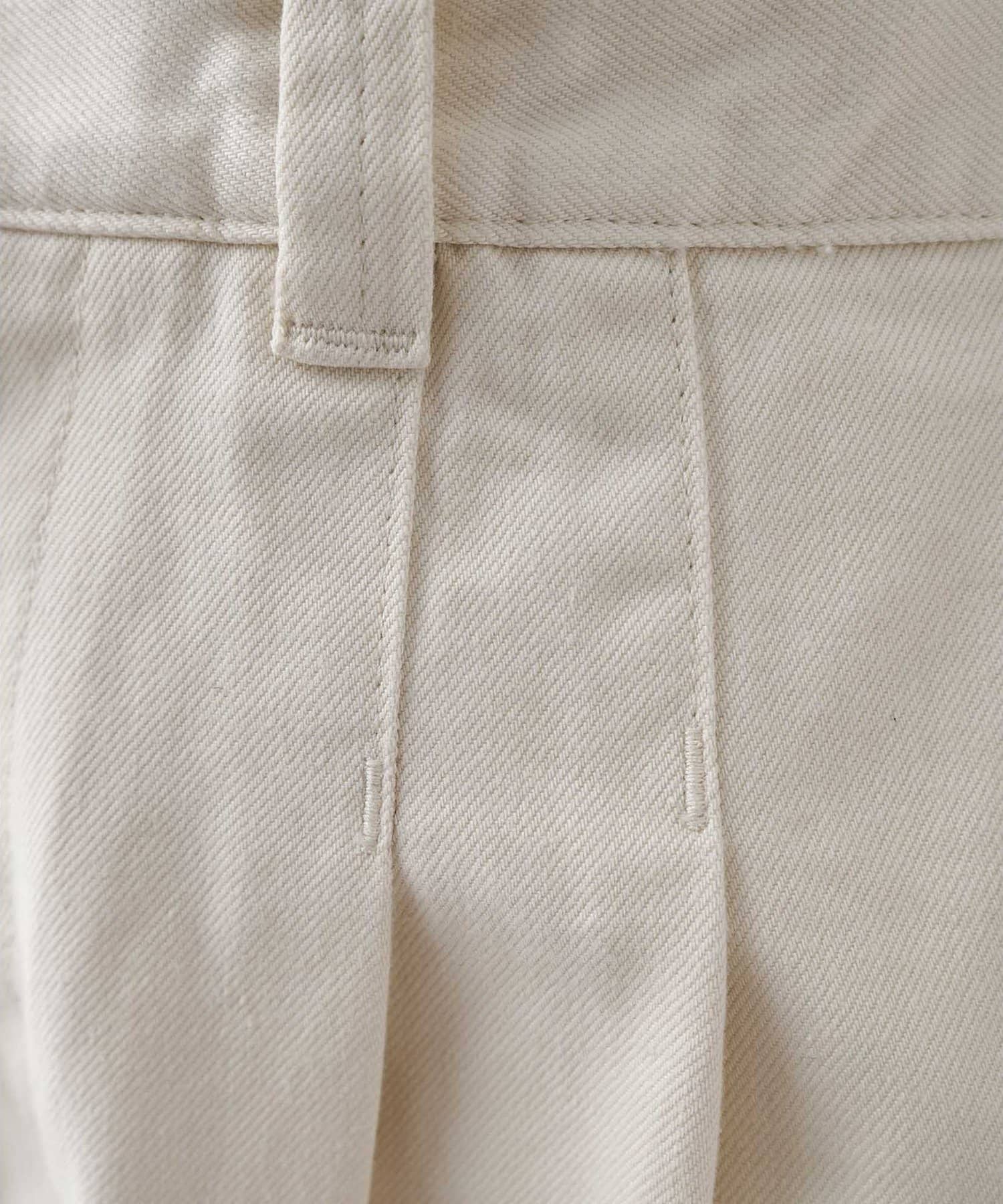 ■フロントに施したタックが立体感を生むチノ素材のワイドパンツ。