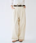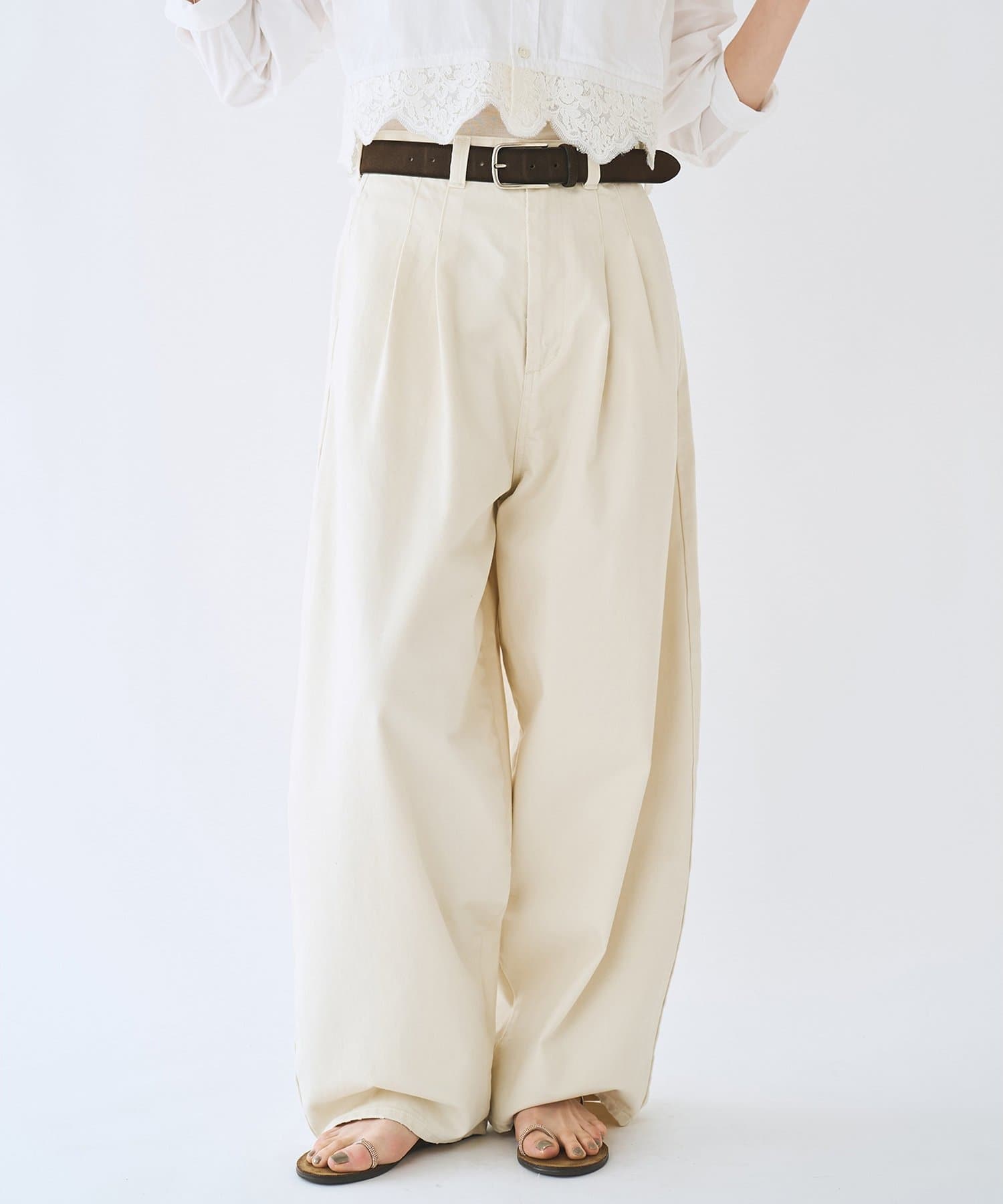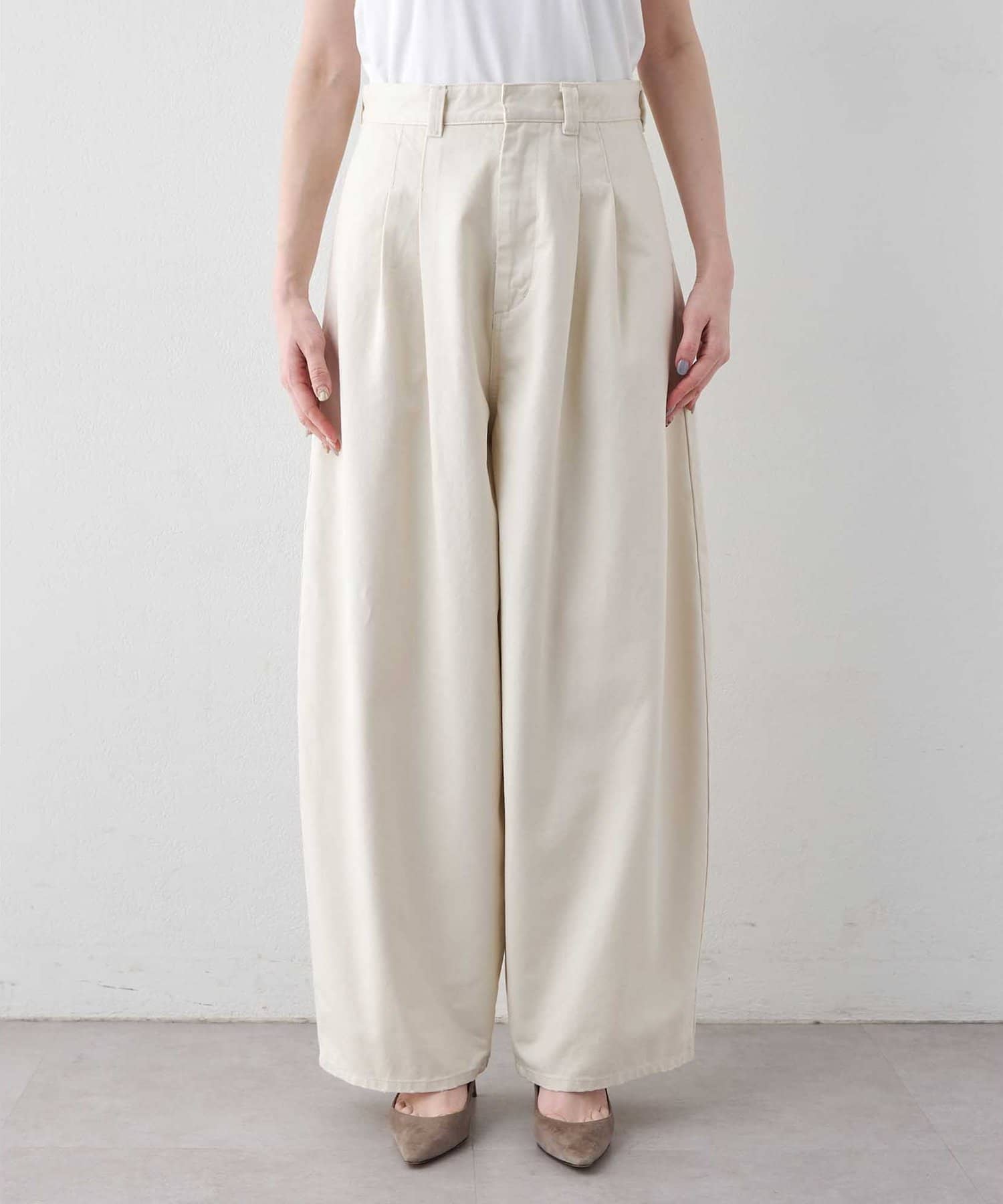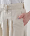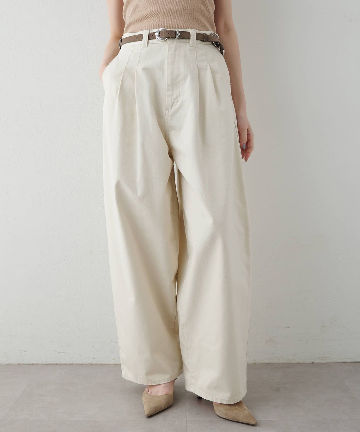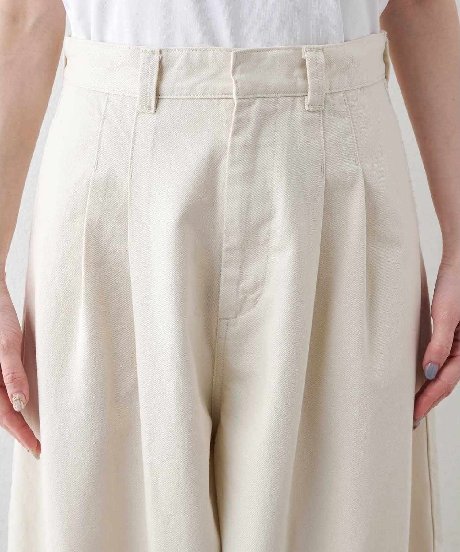 ■フロントに施したタックが立体感を生むチノ素材のワイドパンツ。