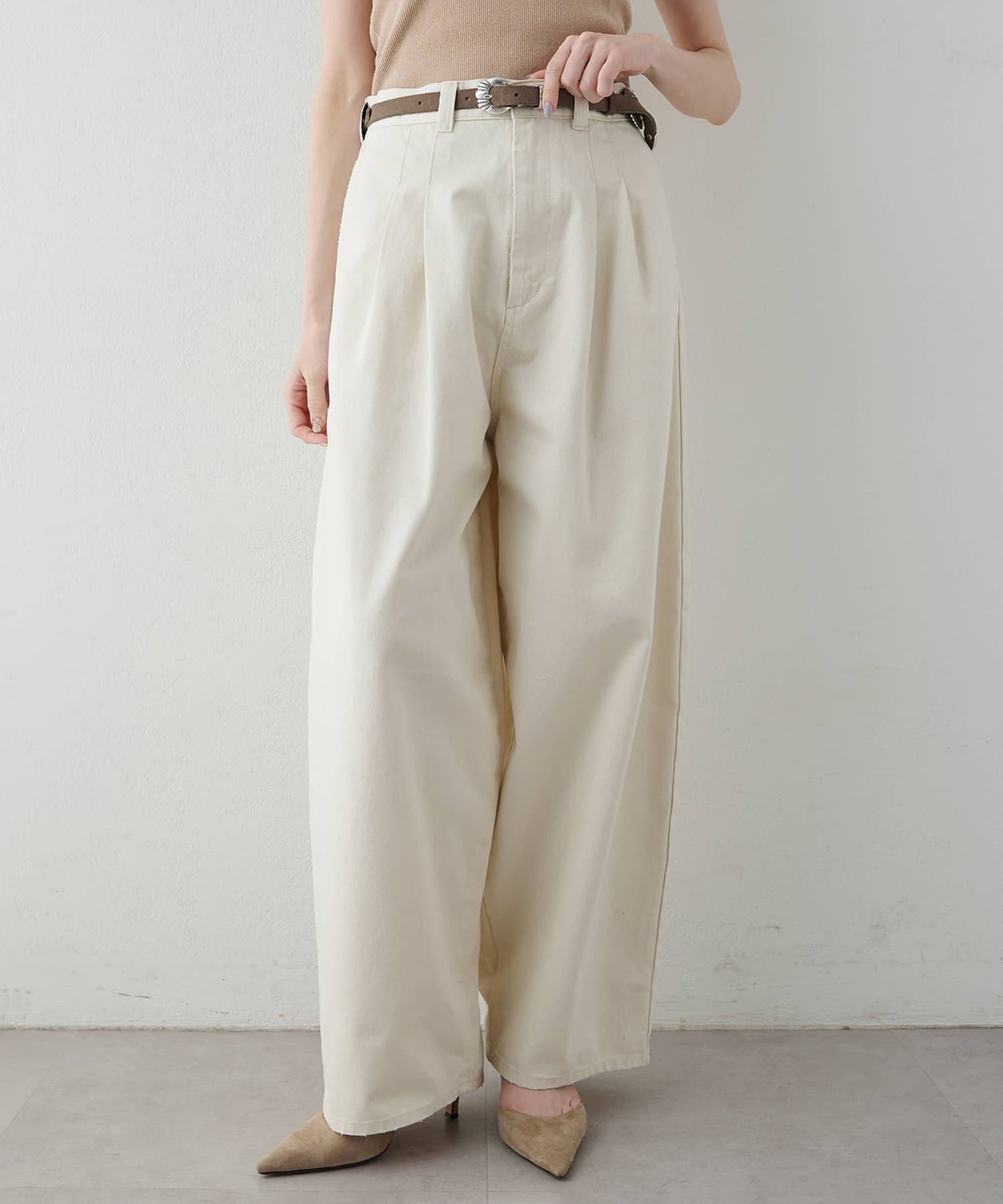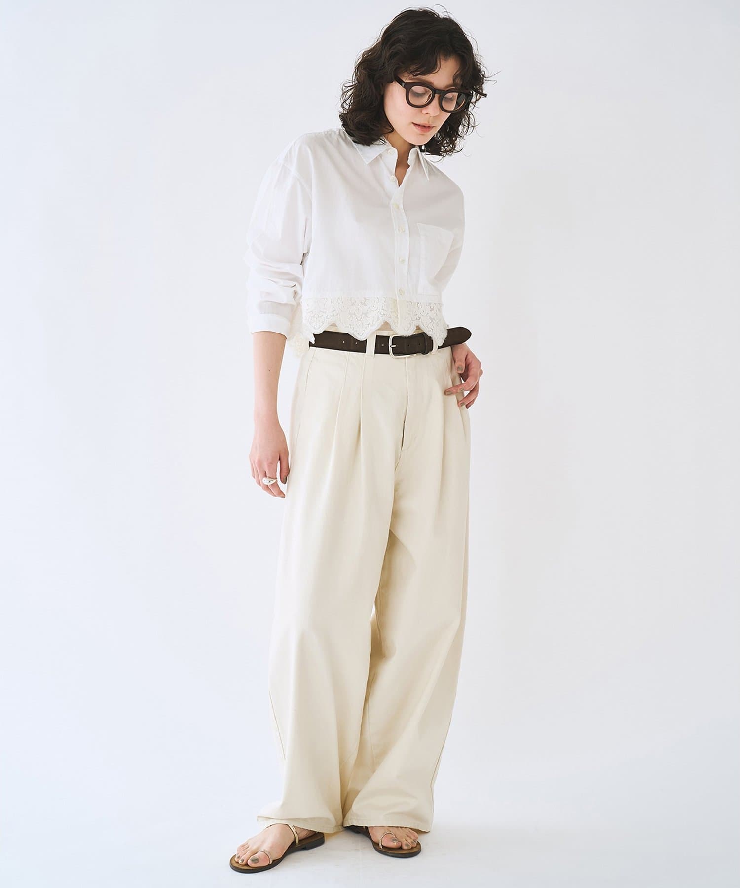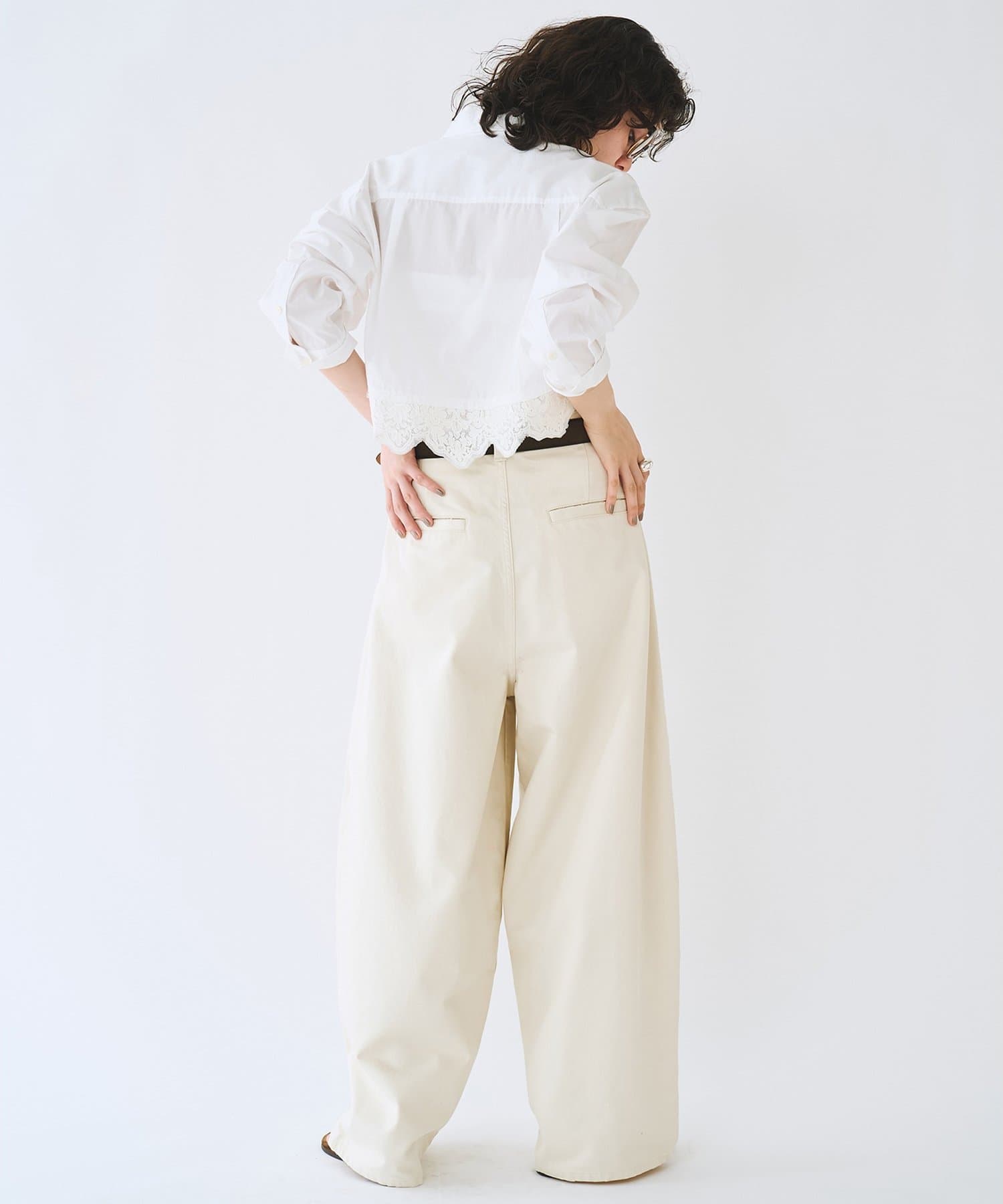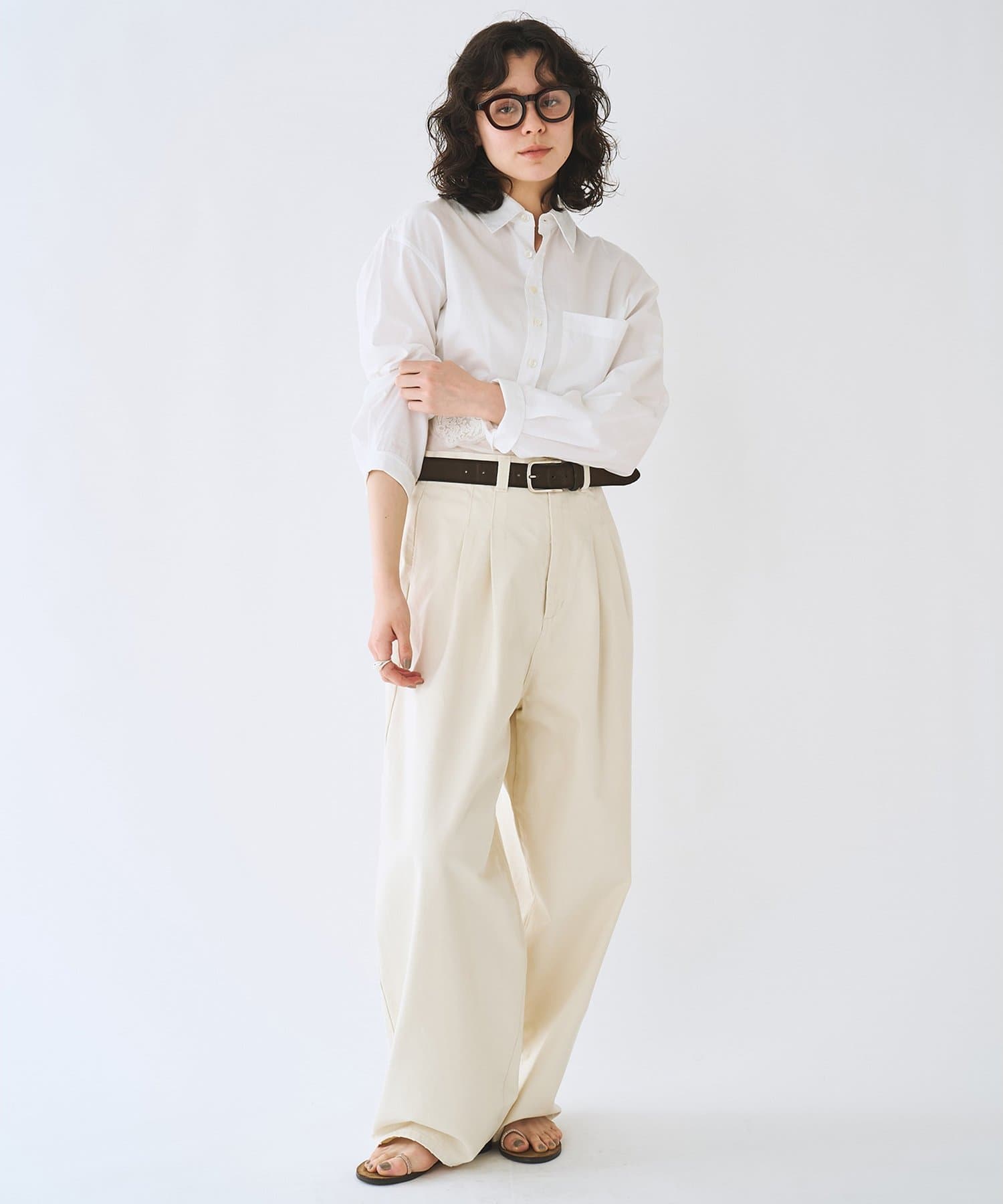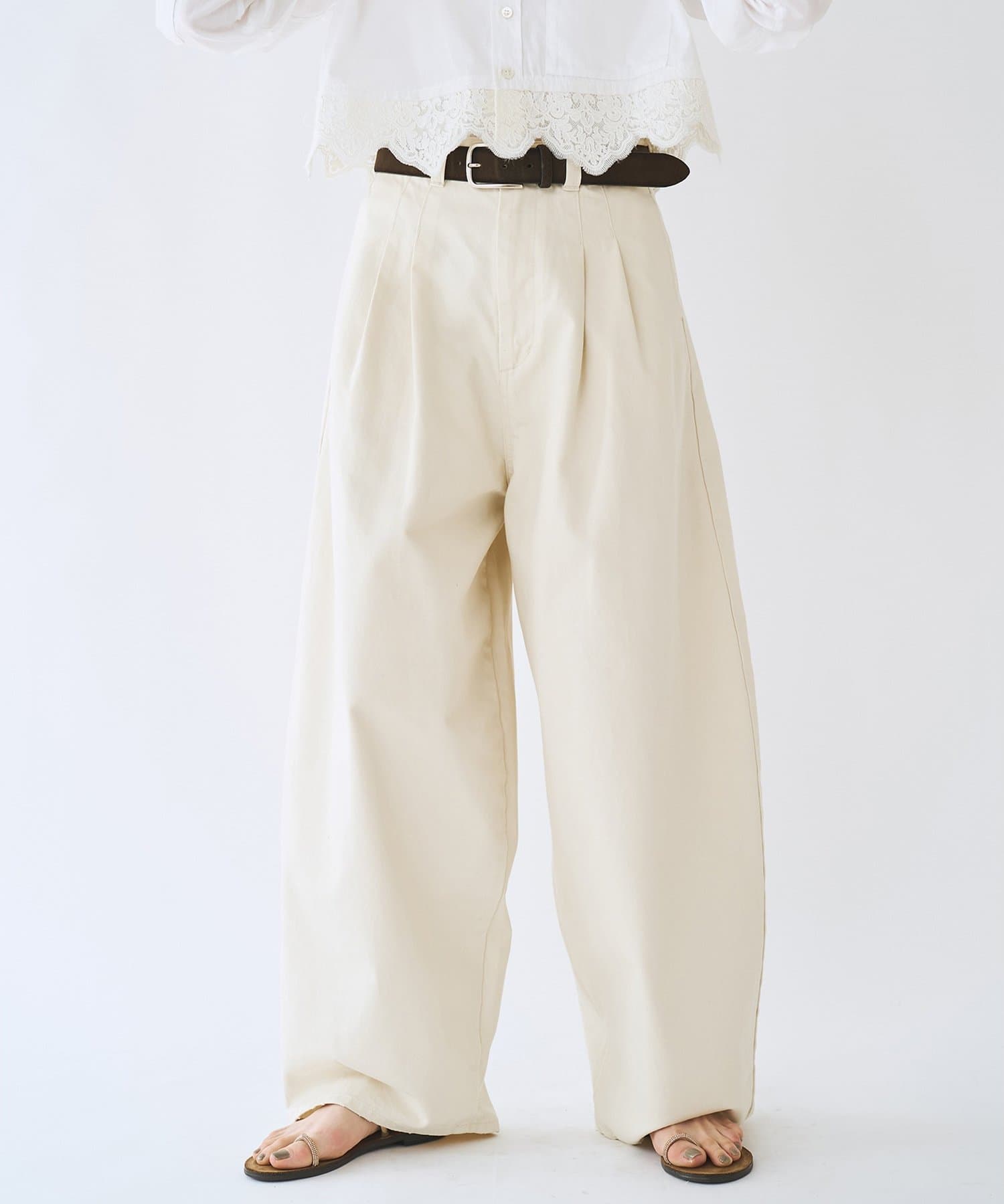 ■フロントに施したタックが立体感を生むチノ素材のワイドパンツ。