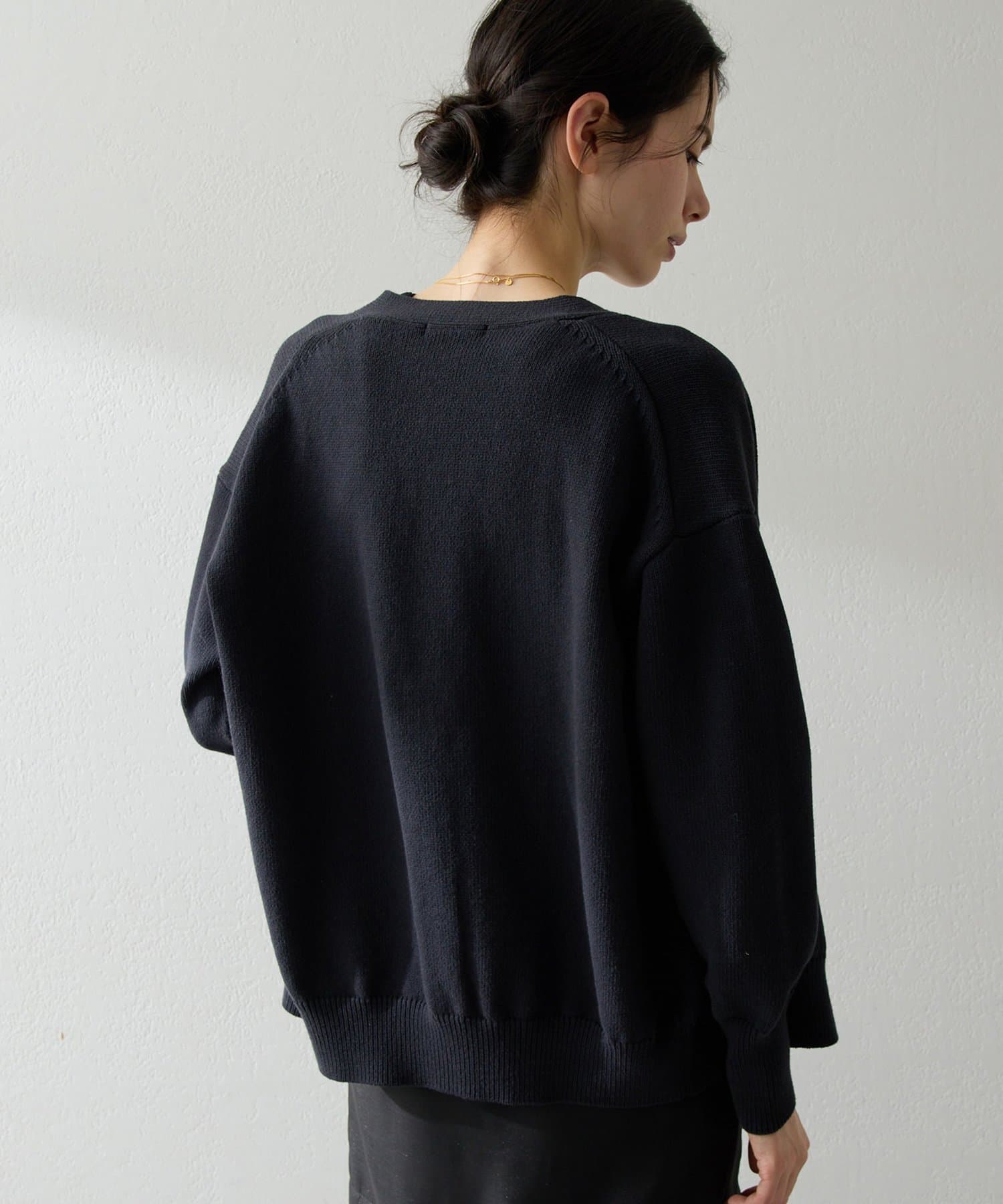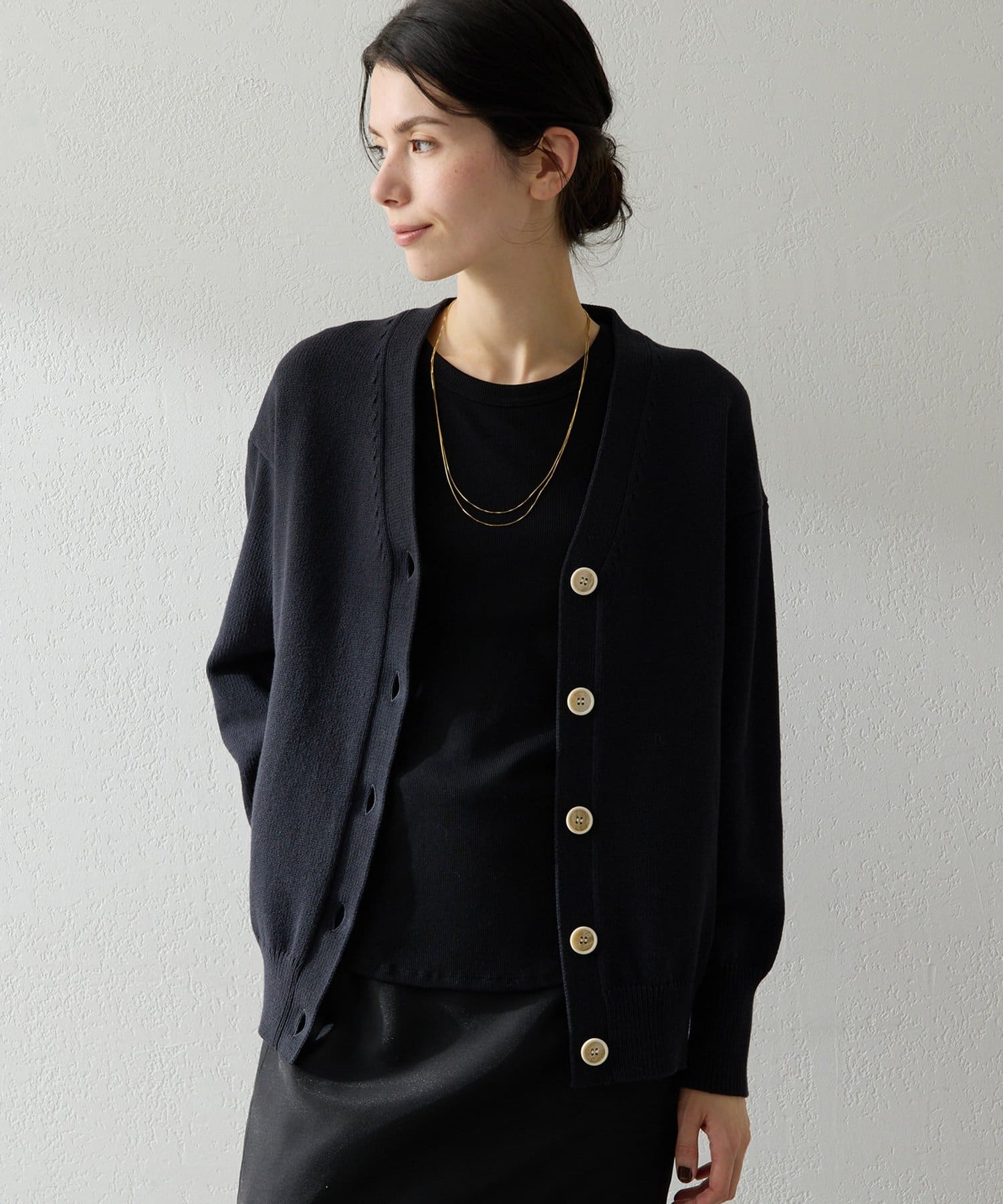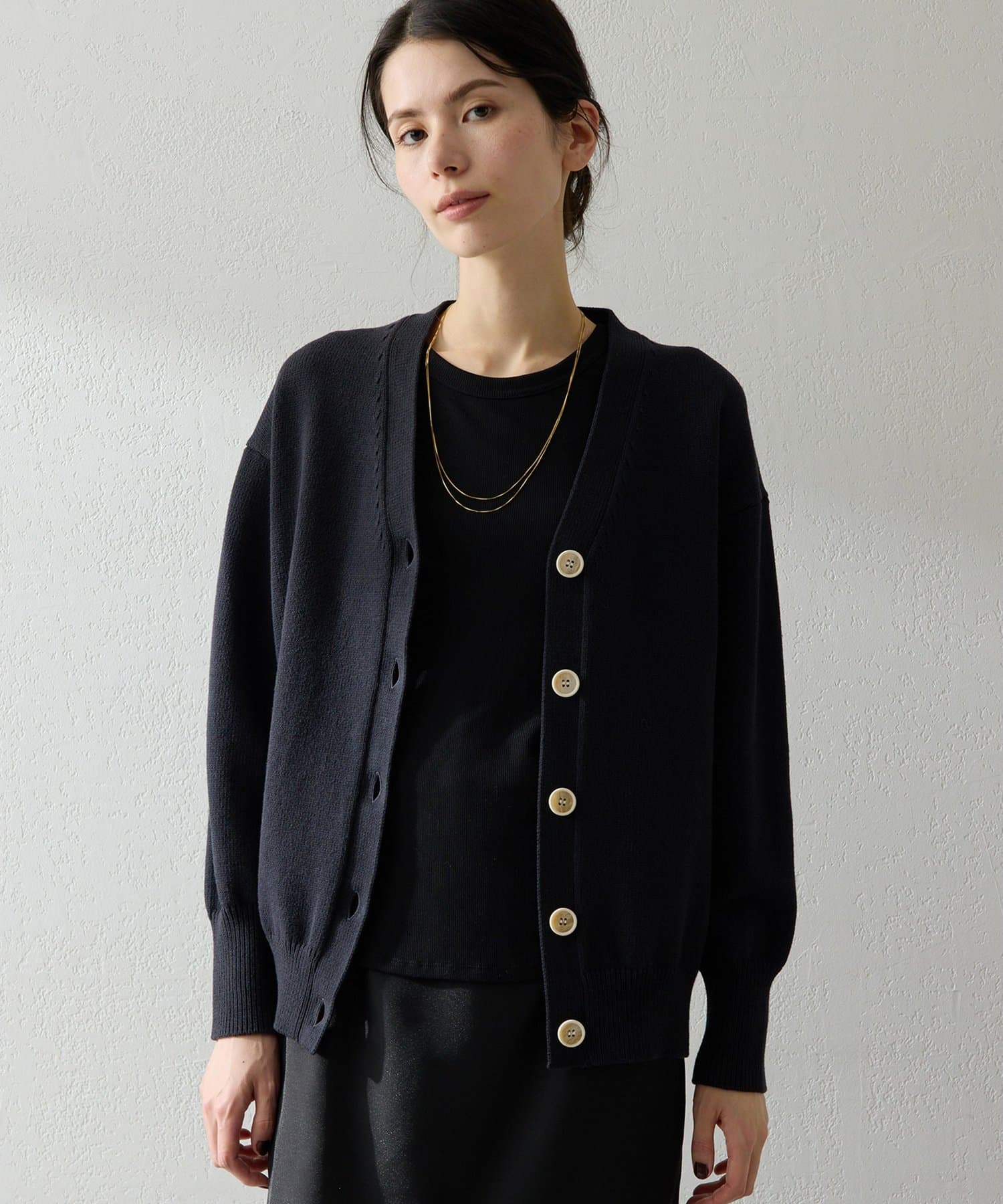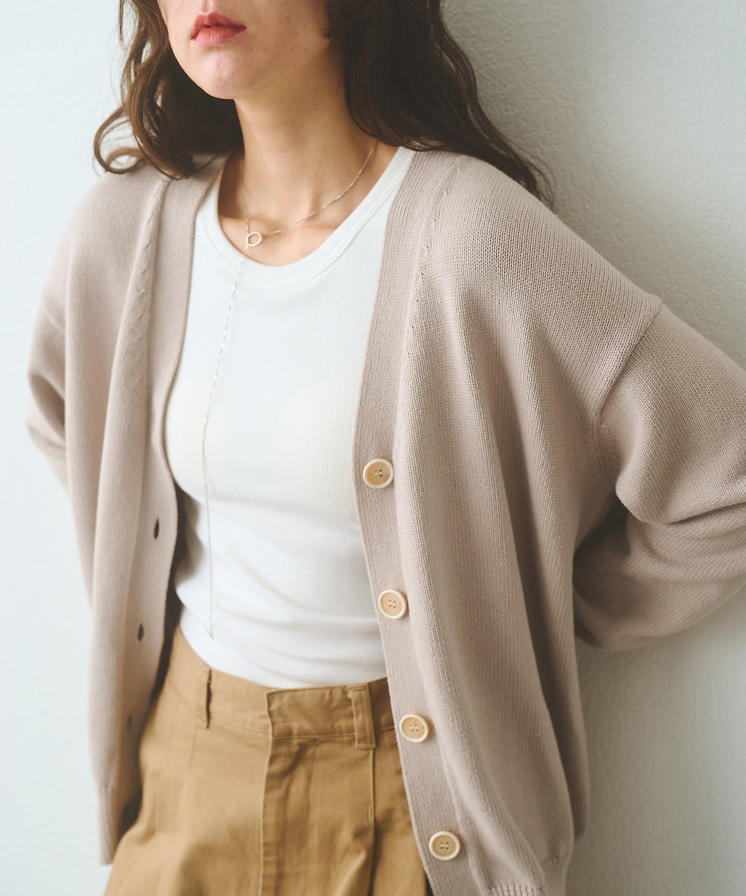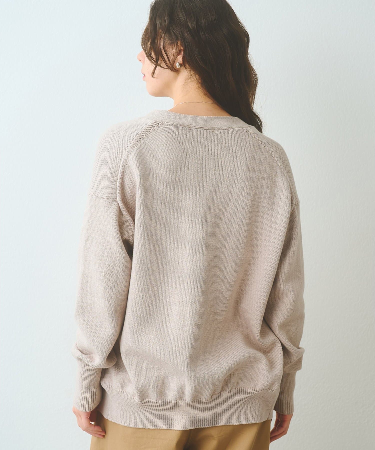 ■羽織りとしてはもちろん、ボタンを閉じてVネックプルオーバーのように楽しむのも◎。