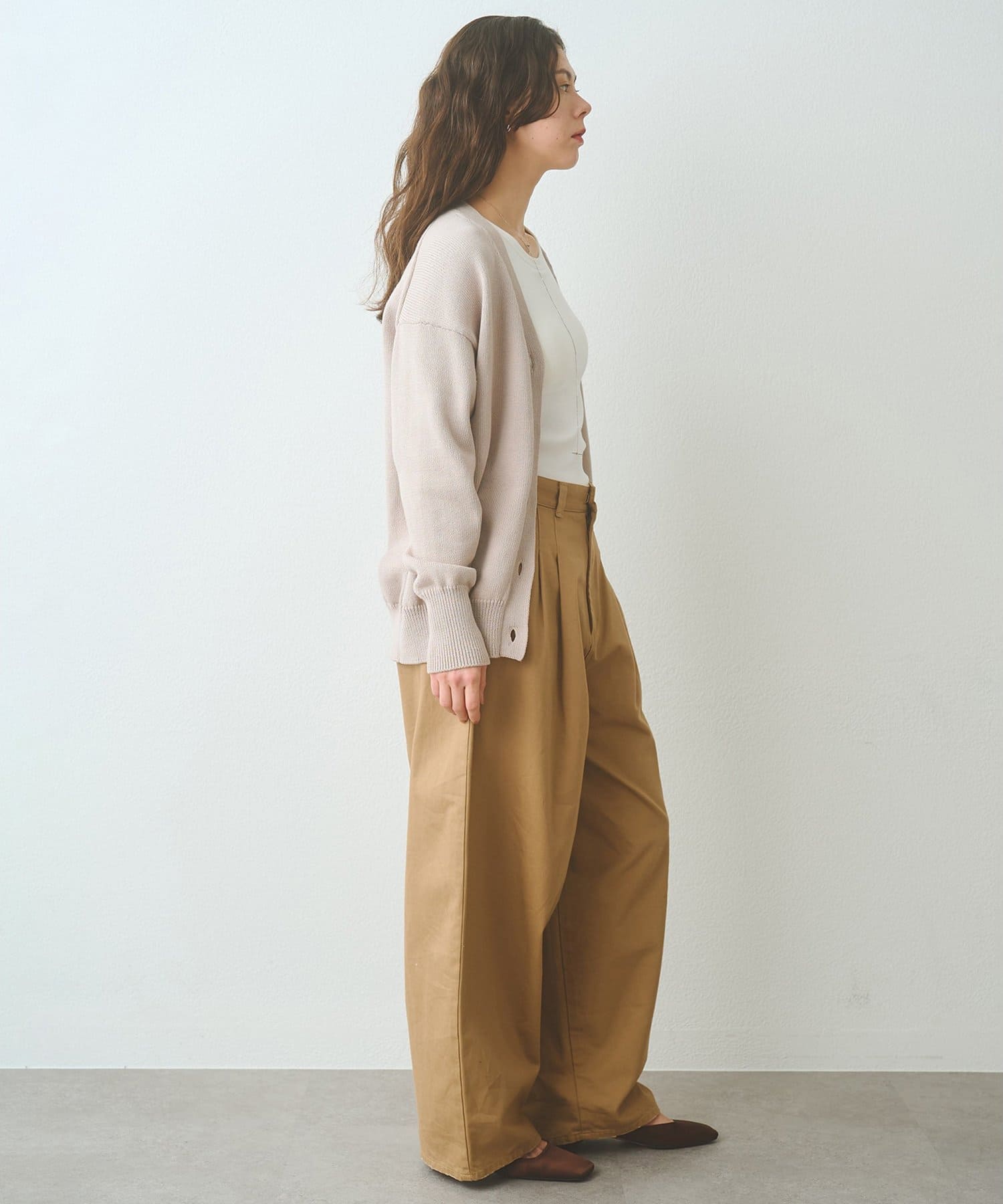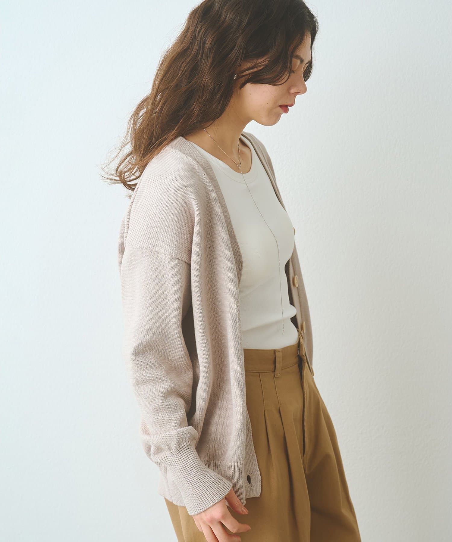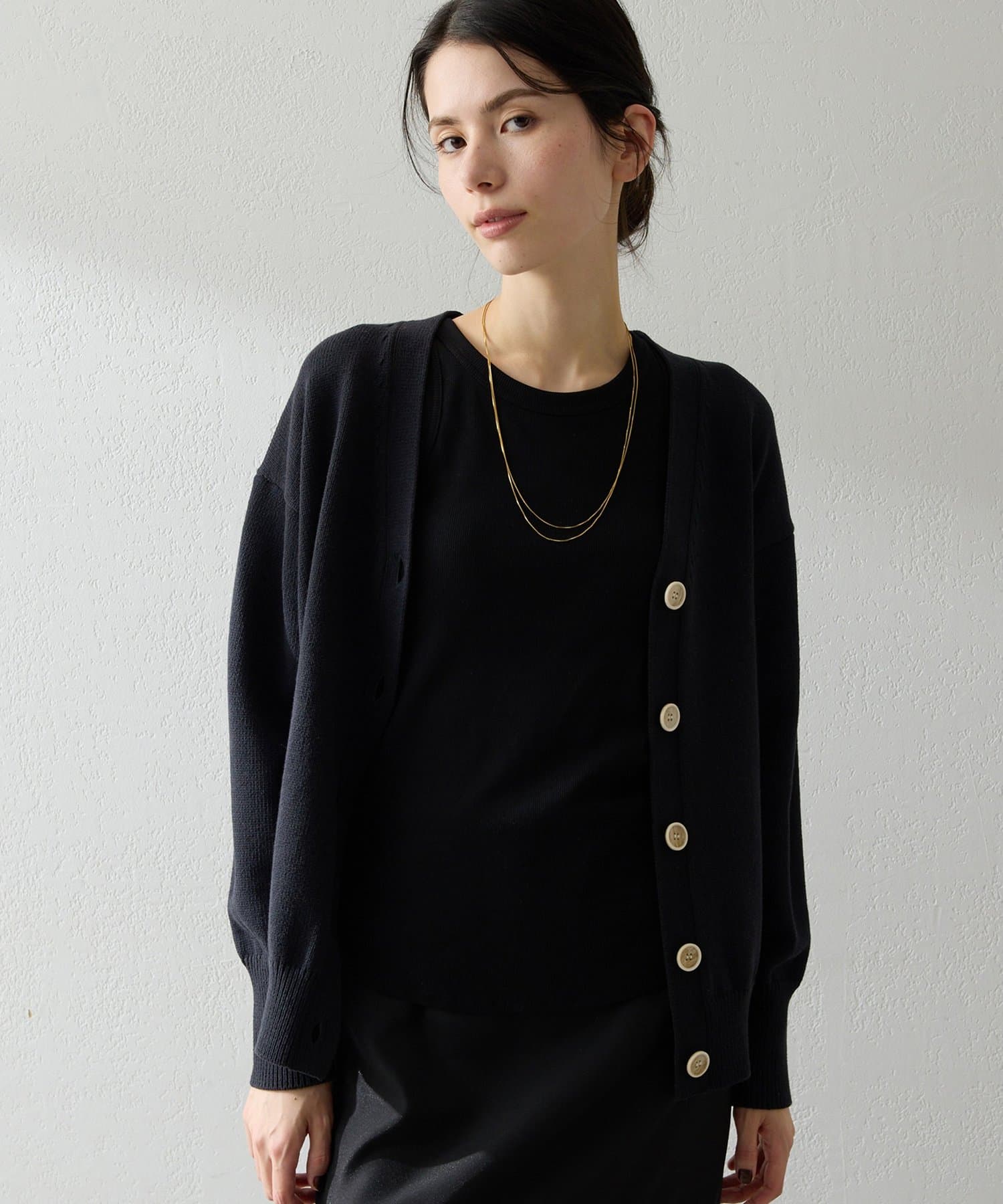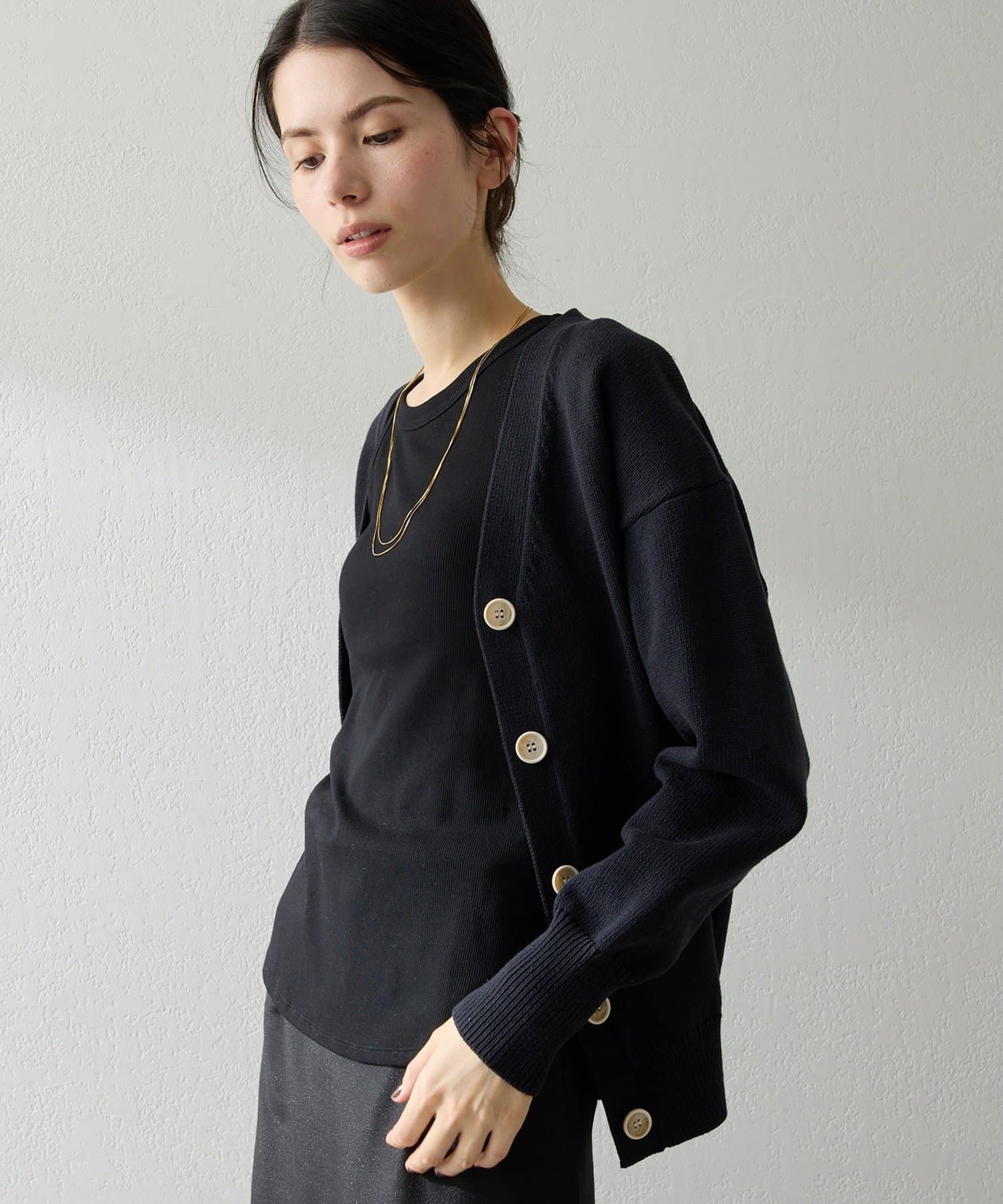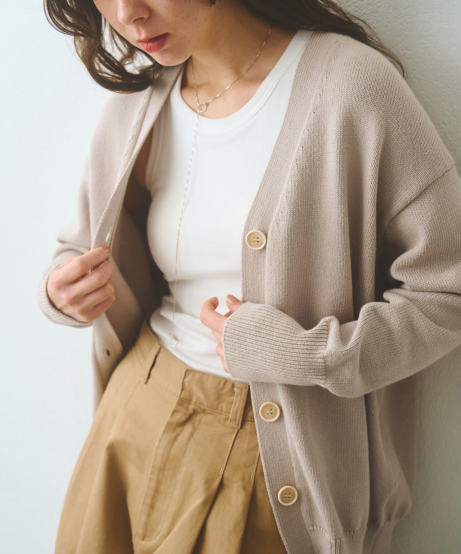 ■羽織りとしてはもちろん、ボタンを閉じてVネックプルオーバーのように楽しむのも◎。