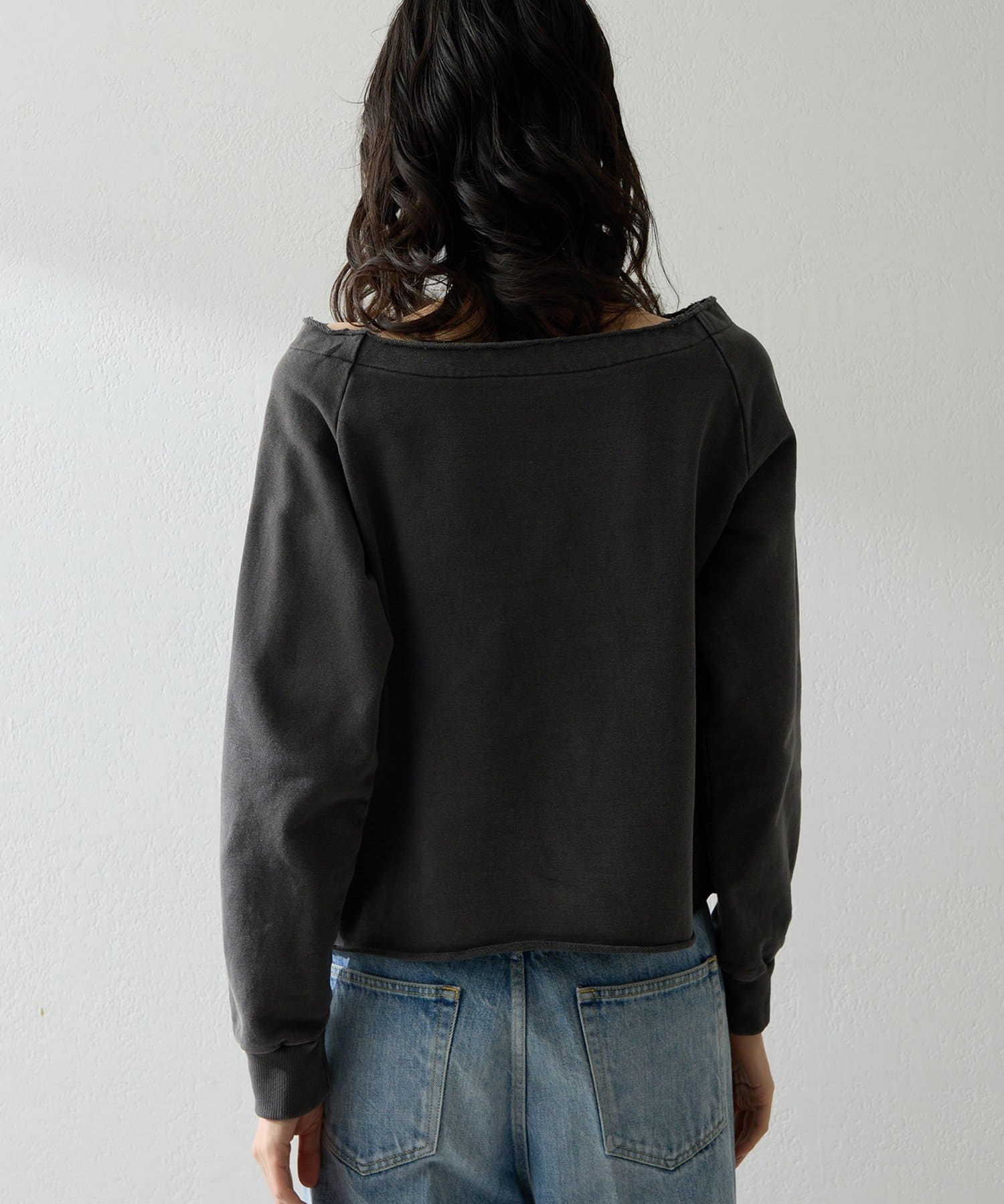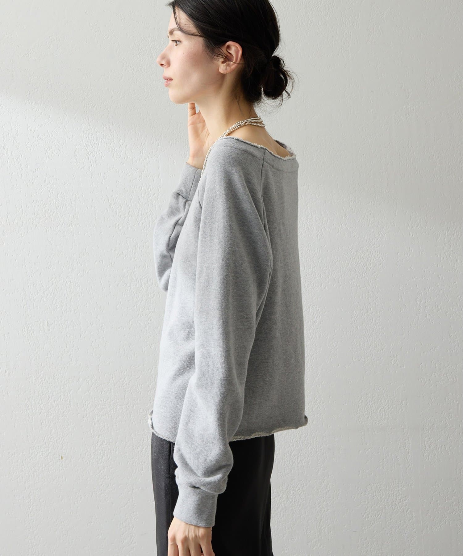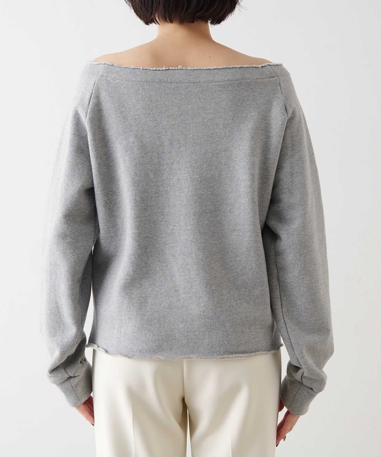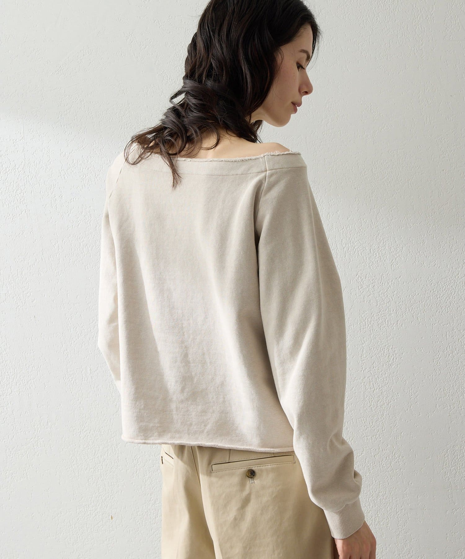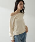 抜け感を演出するオフショルスウェットプルオーバー