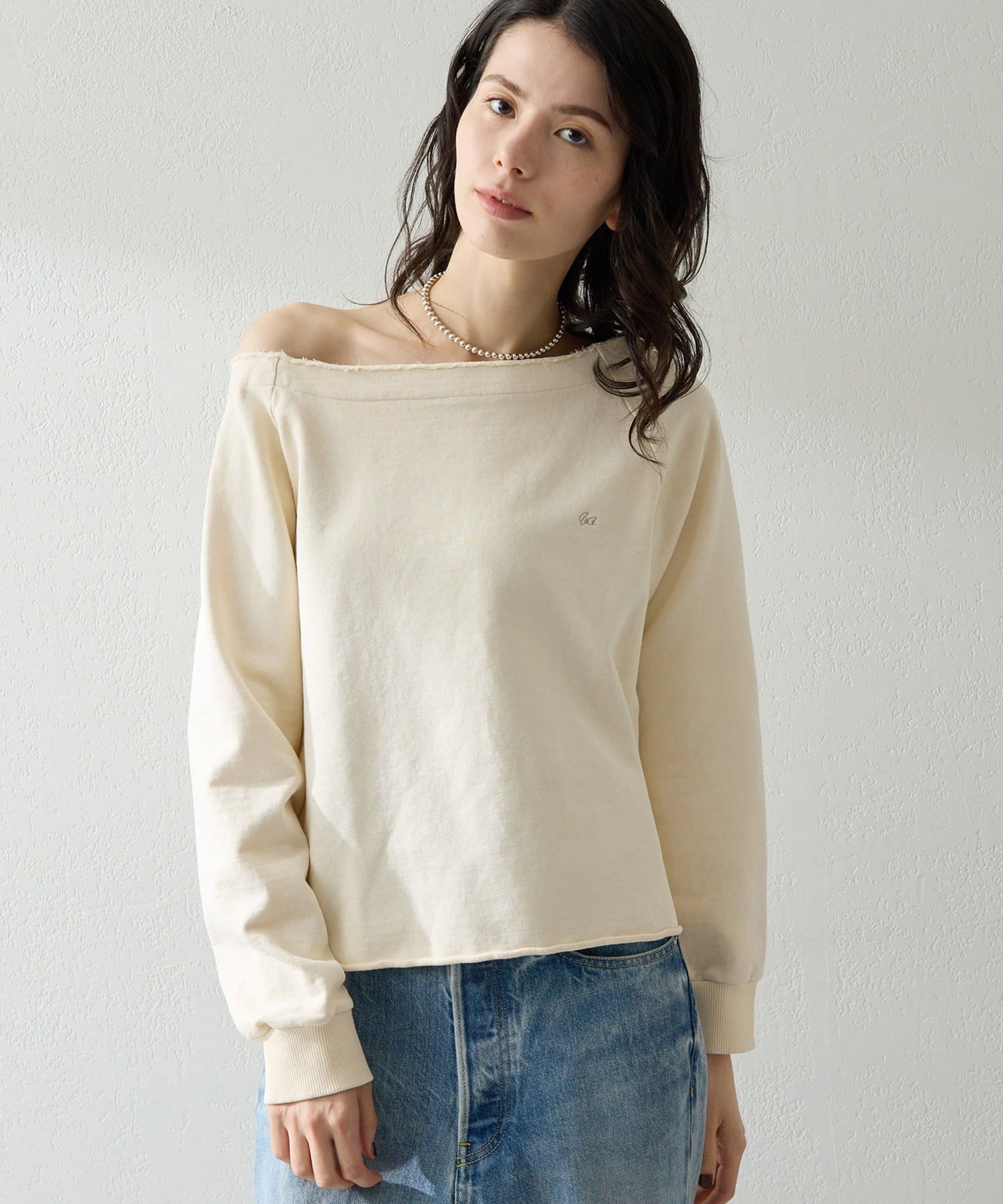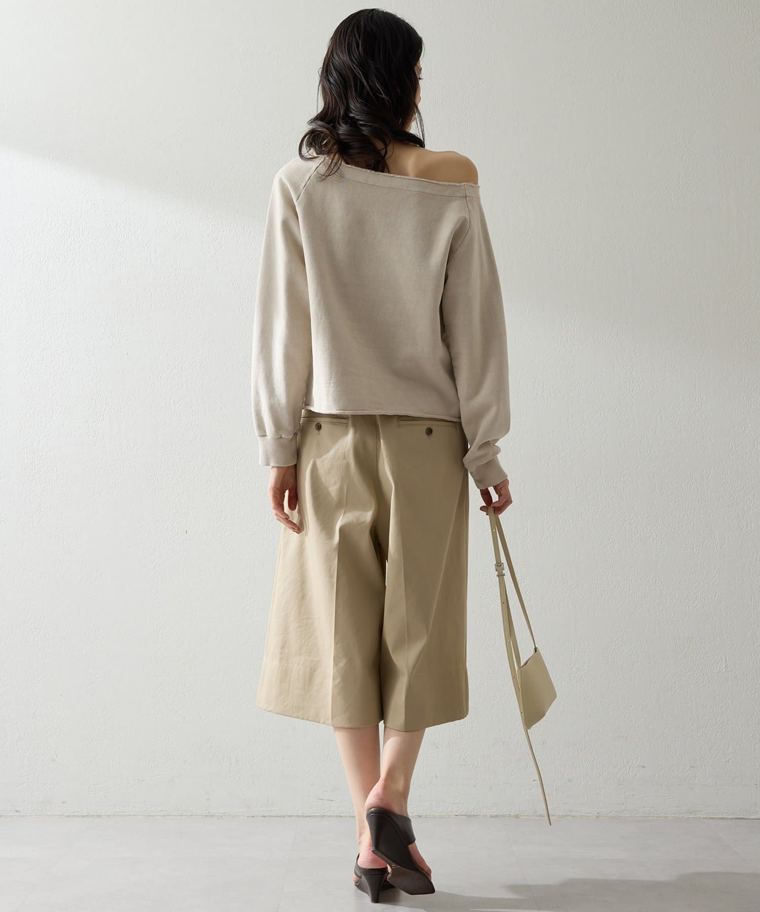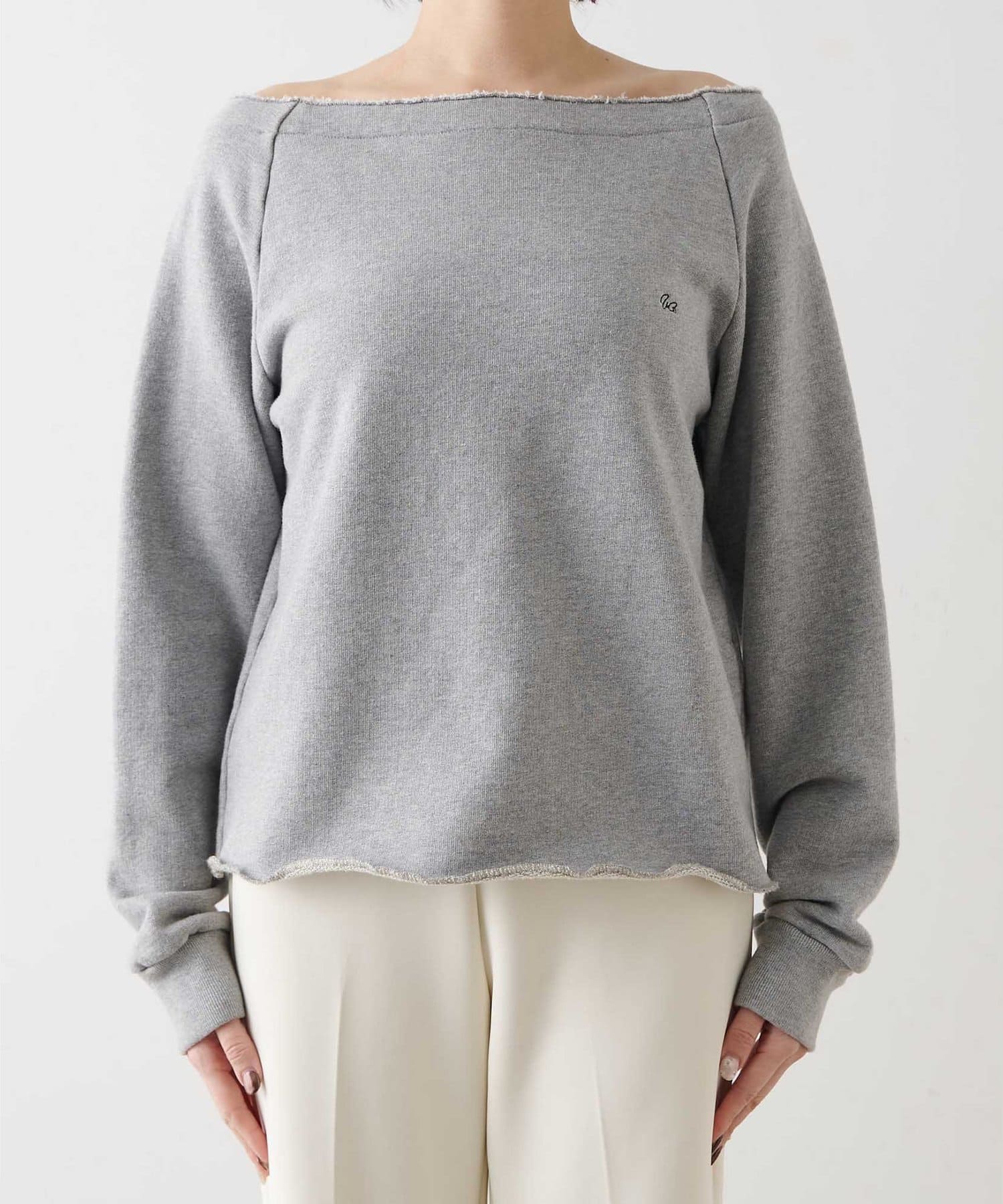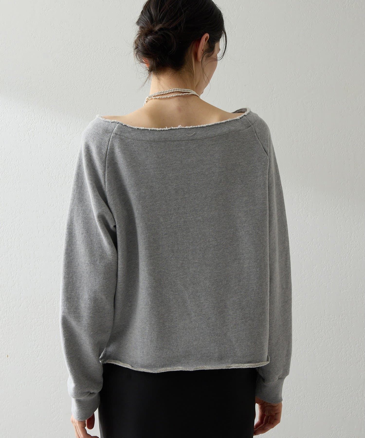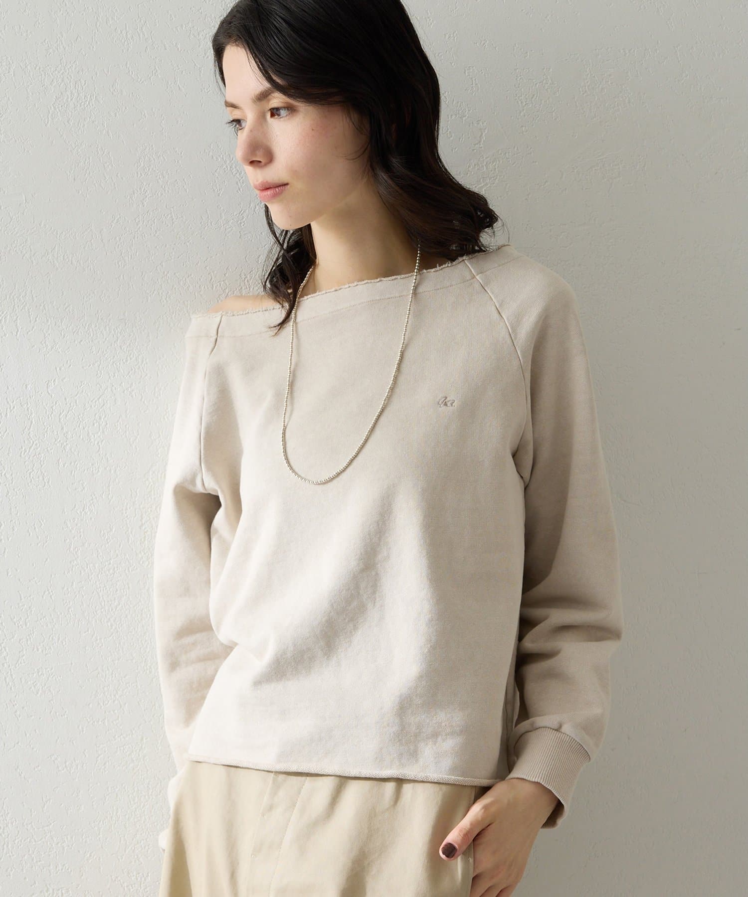抜け感を演出するオフショルスウェットプルオーバー