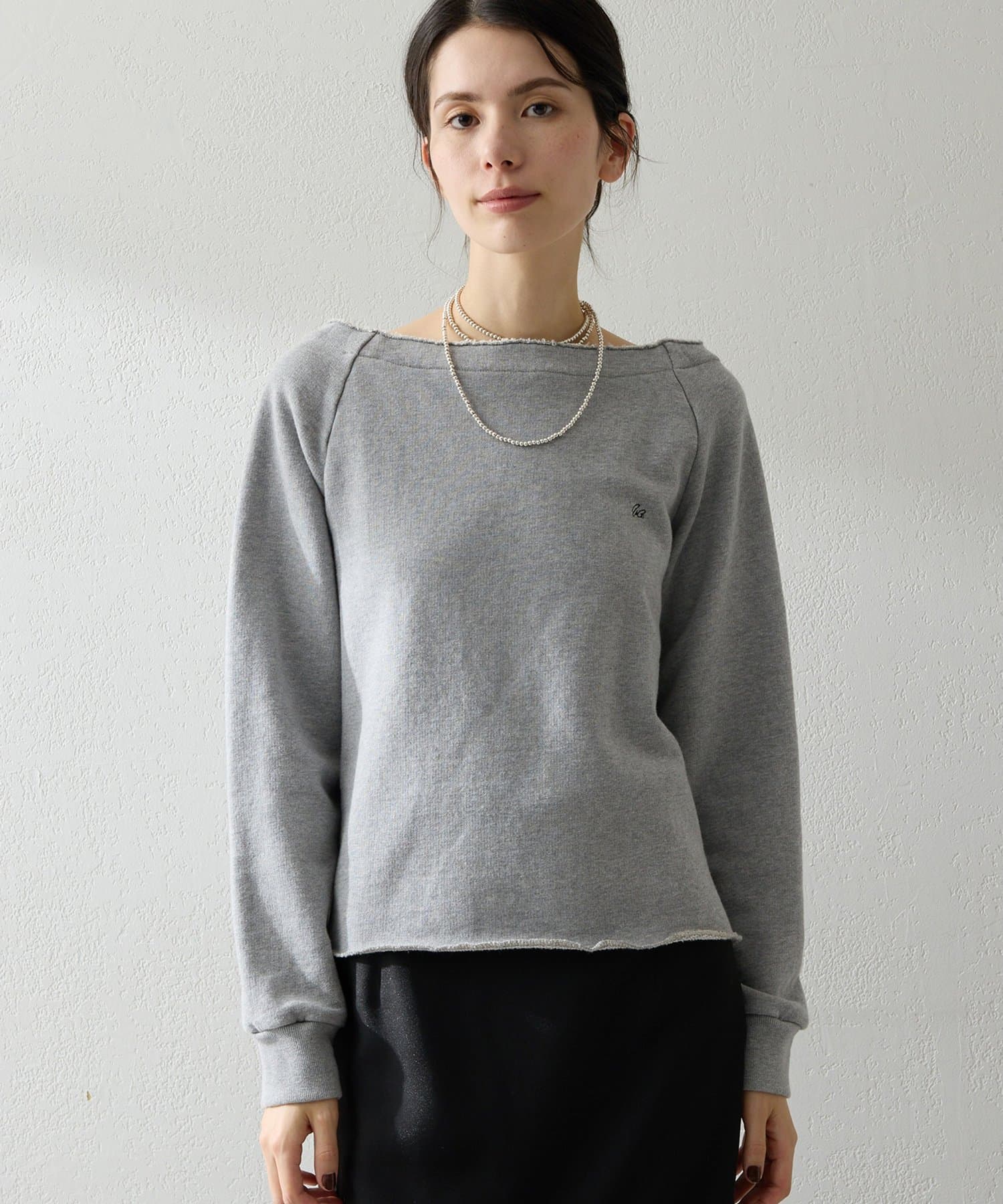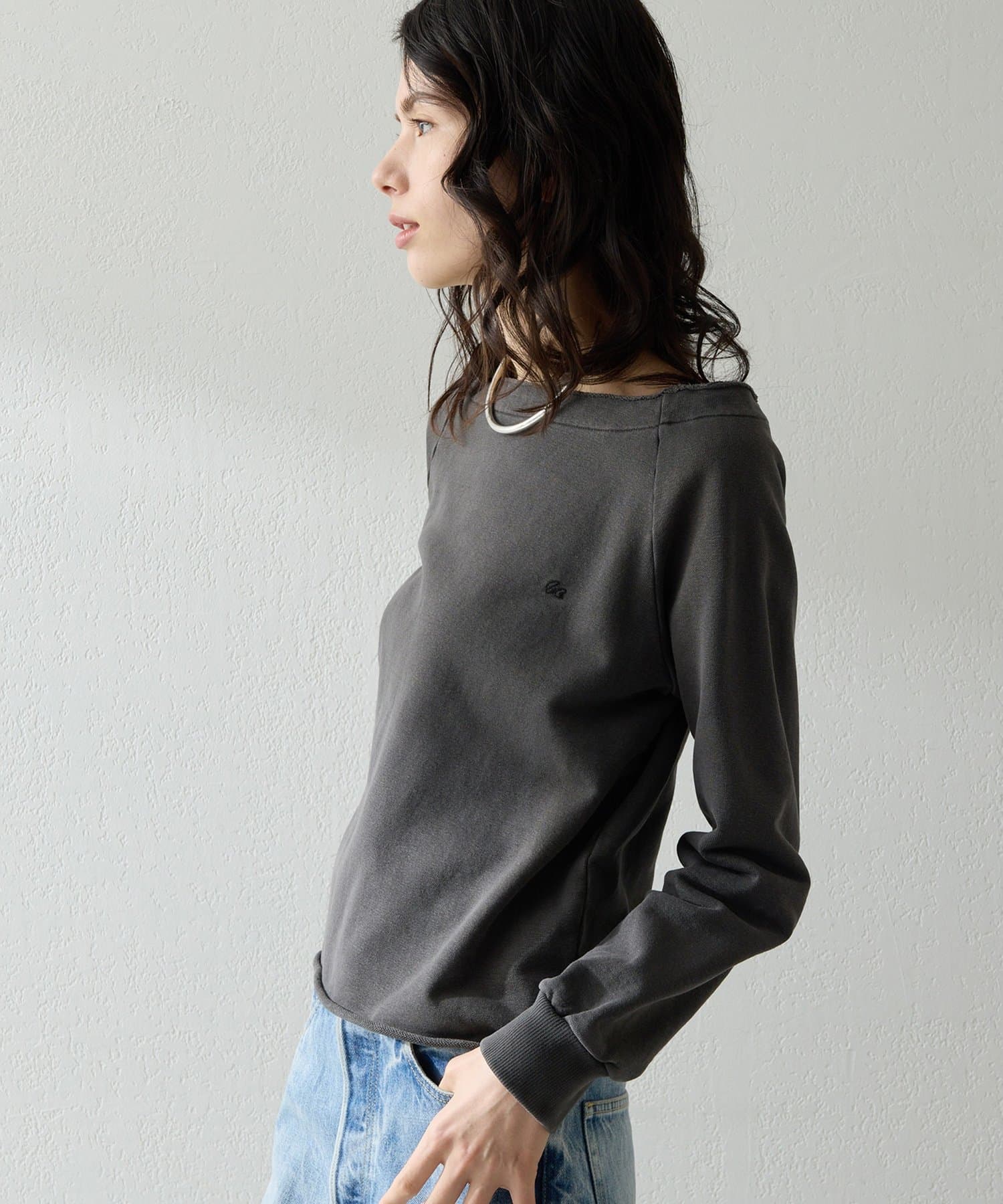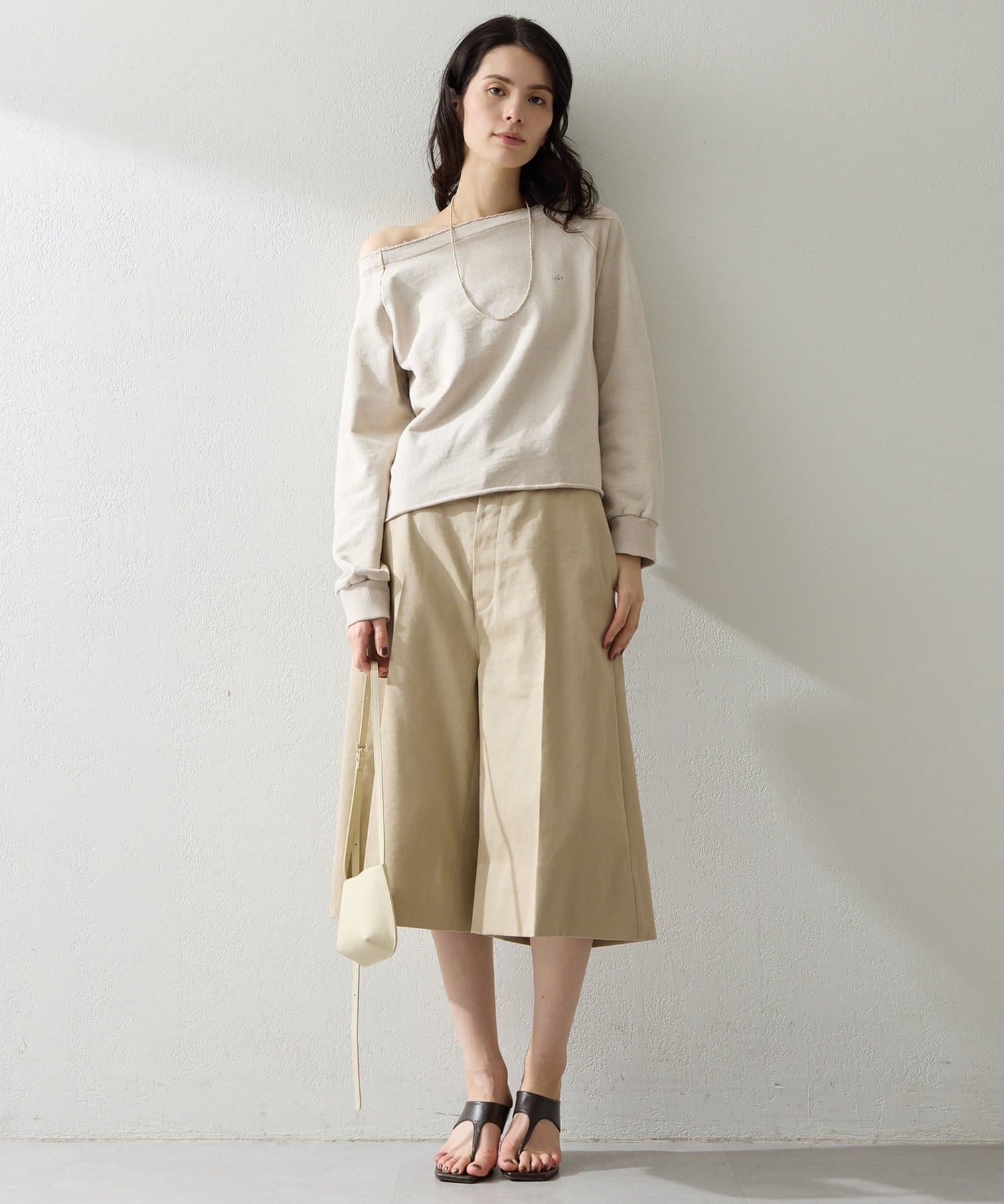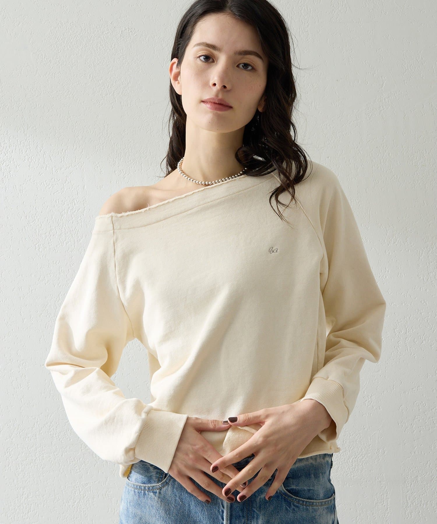 抜け感を演出するオフショルスウェットプルオーバー