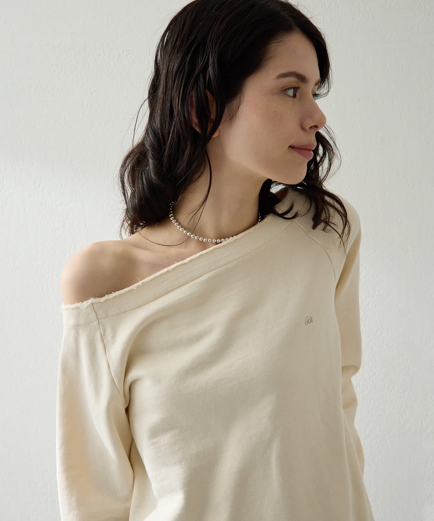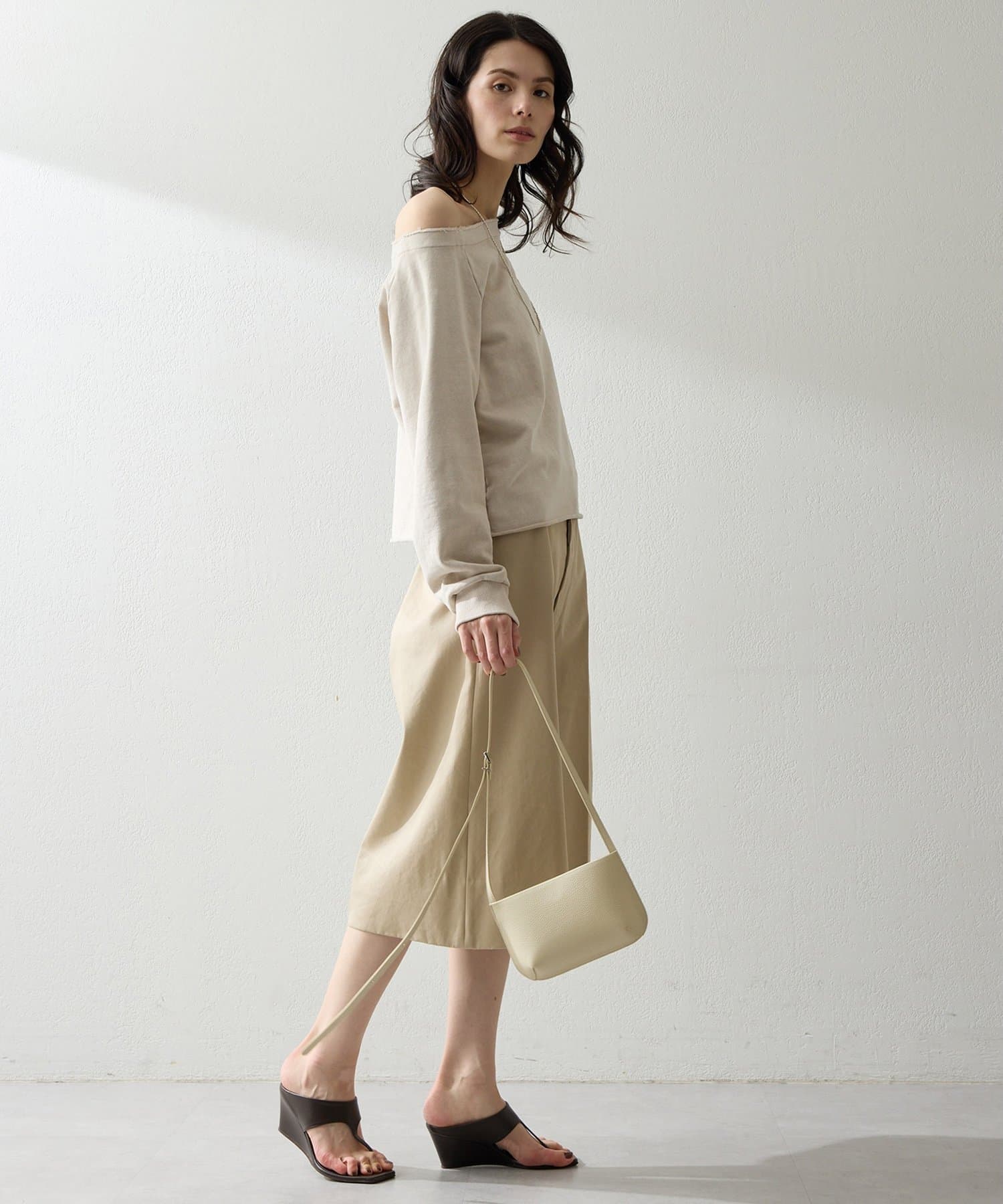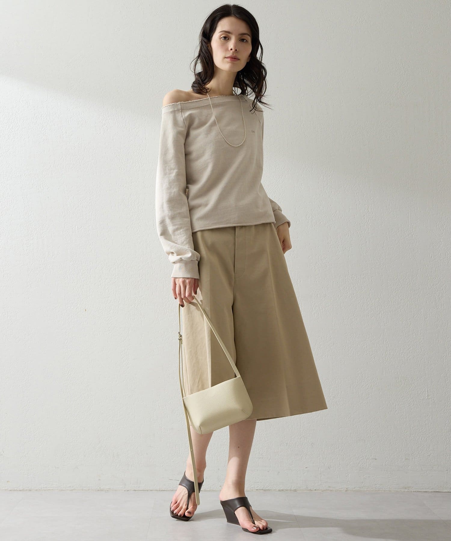 ■程よくラフな表情と、女性らしいデコルテラインを引き立てるオフショルデザインが絶妙なバランス。