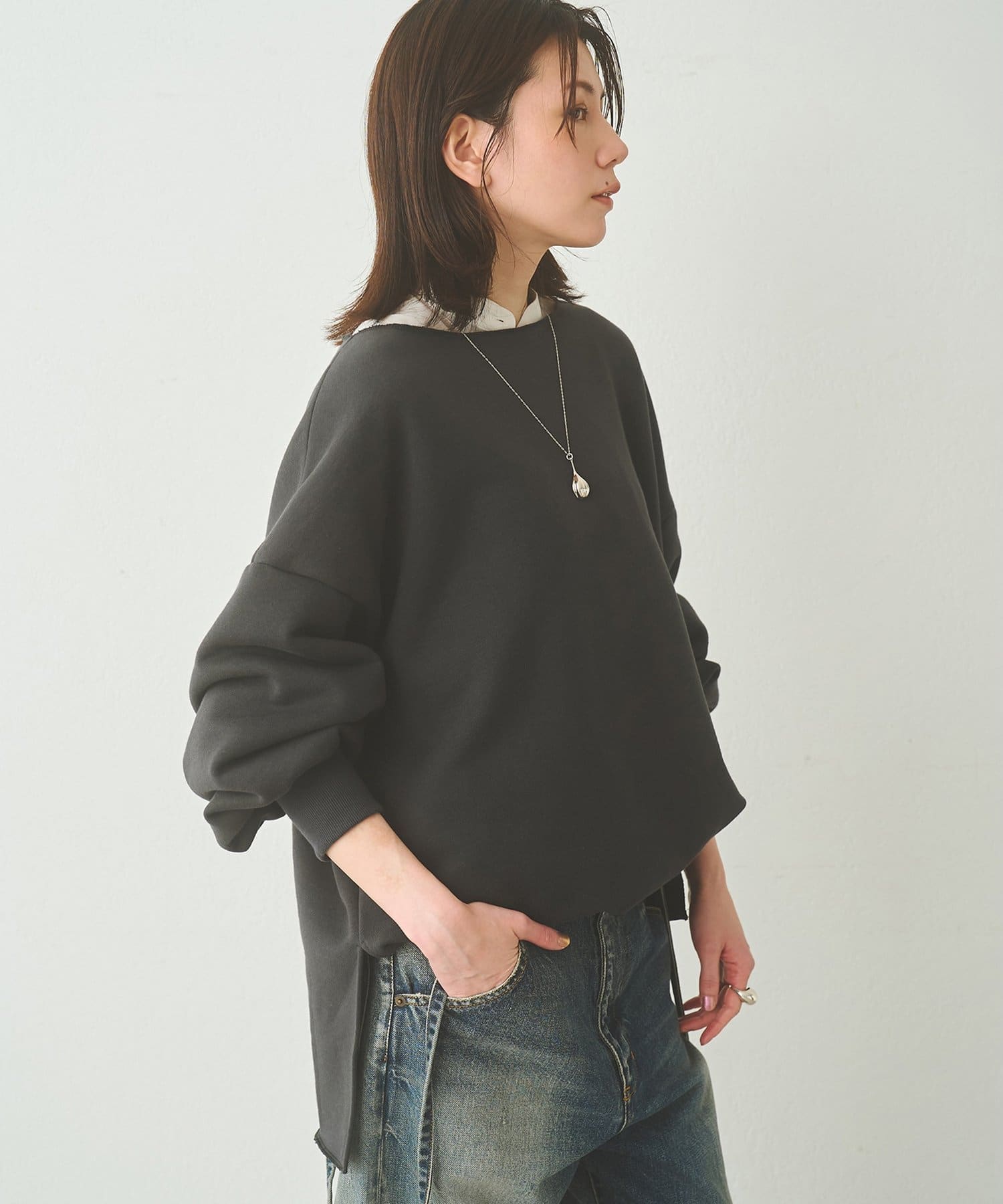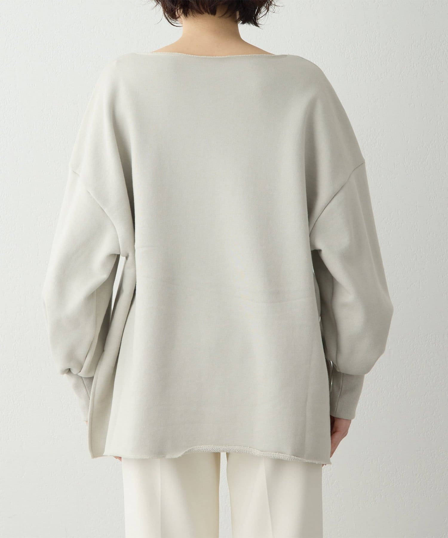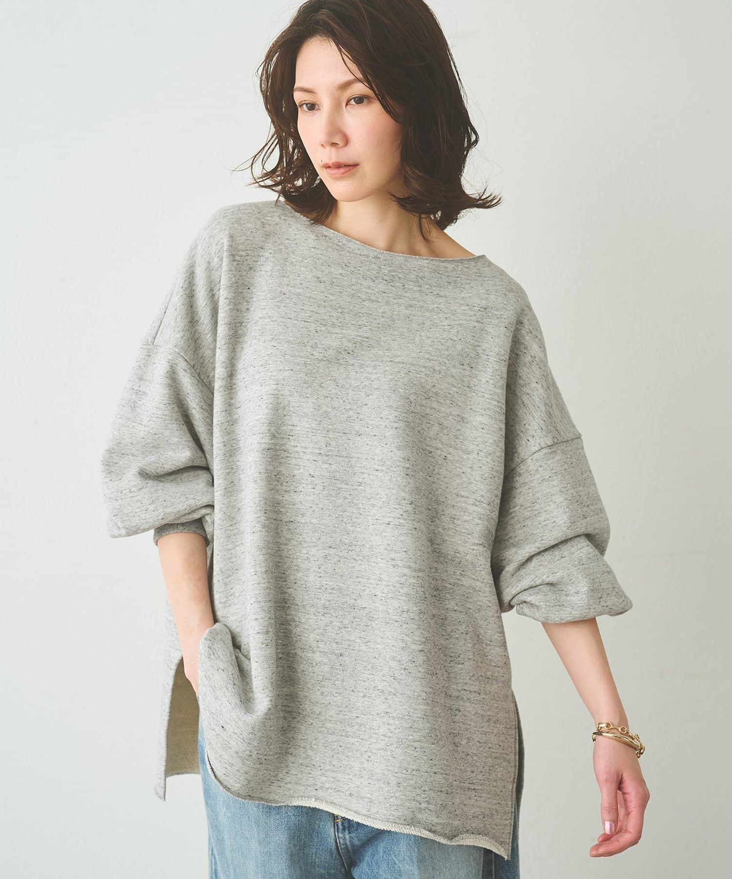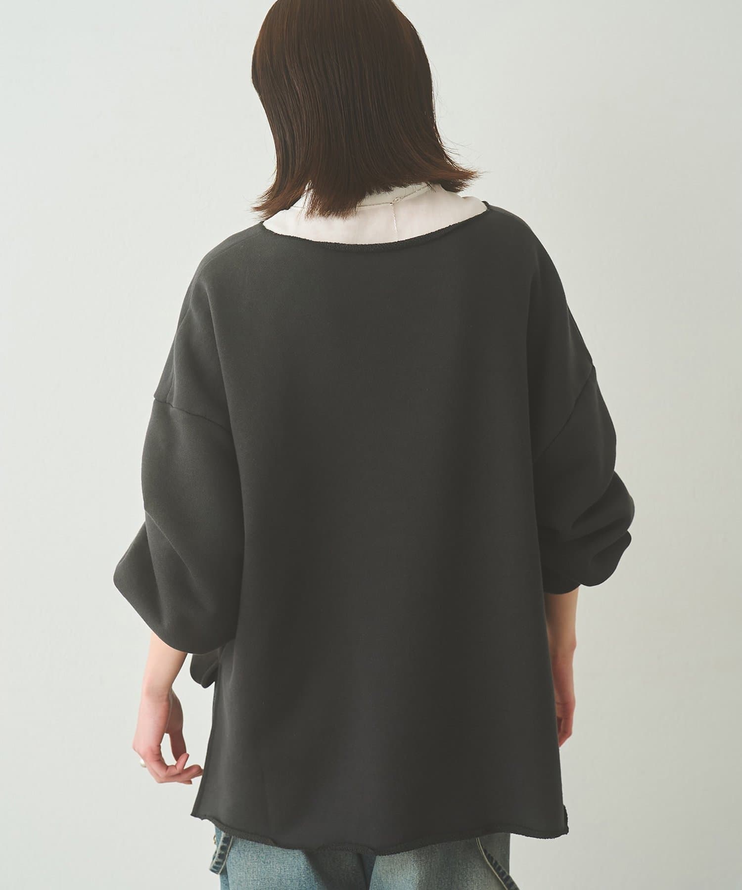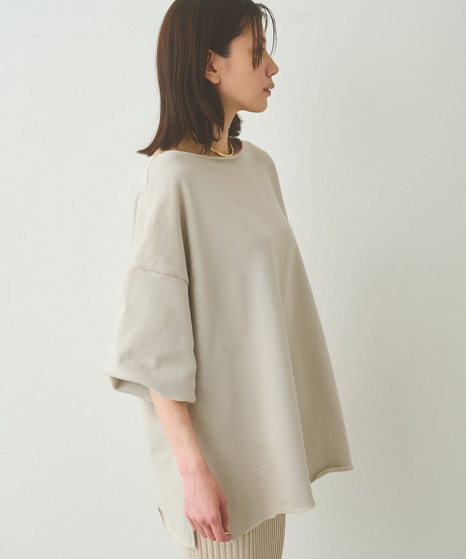■ゆったりとしたシルエットに、横に開いたネックラインが抜け感をプラス。