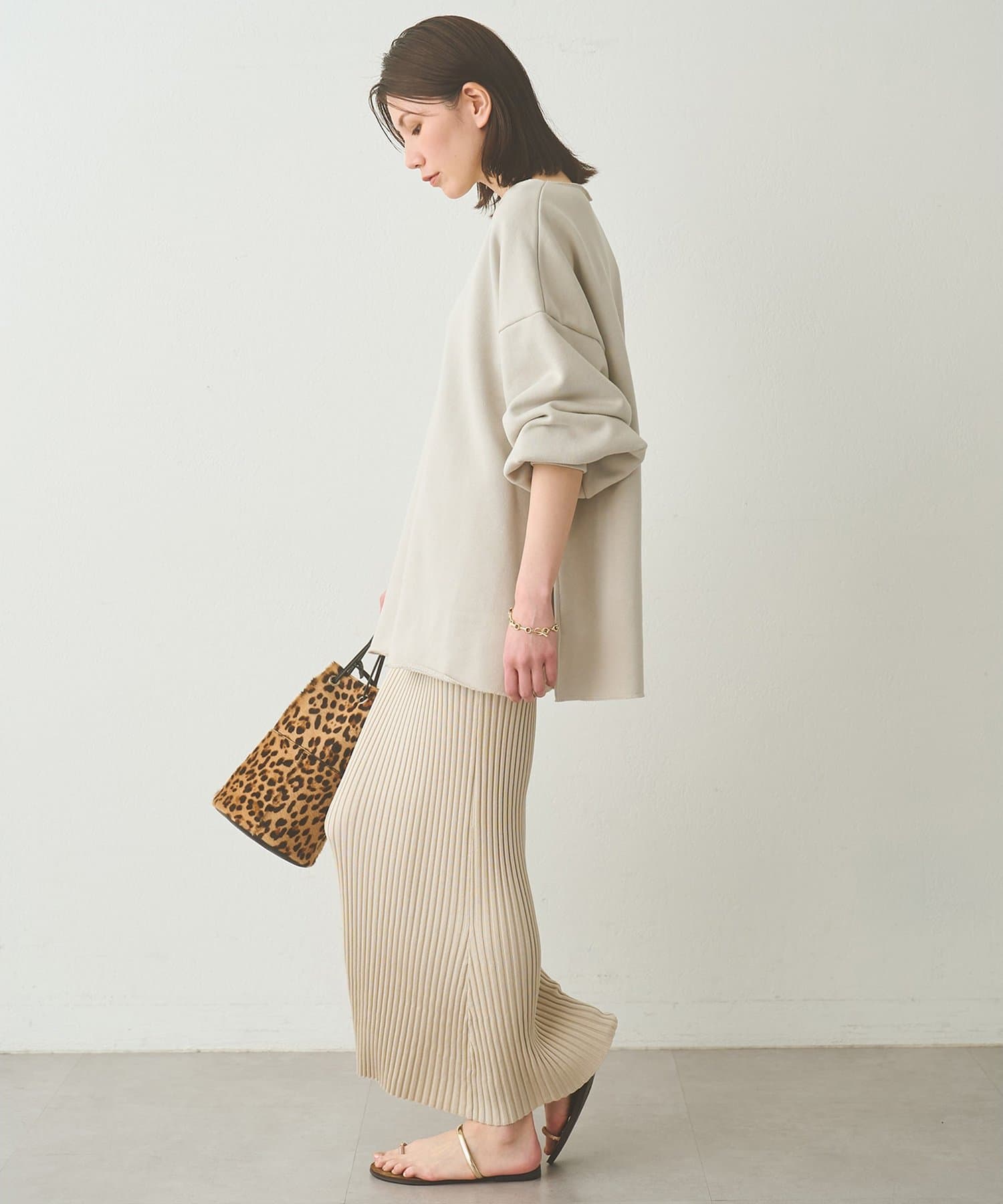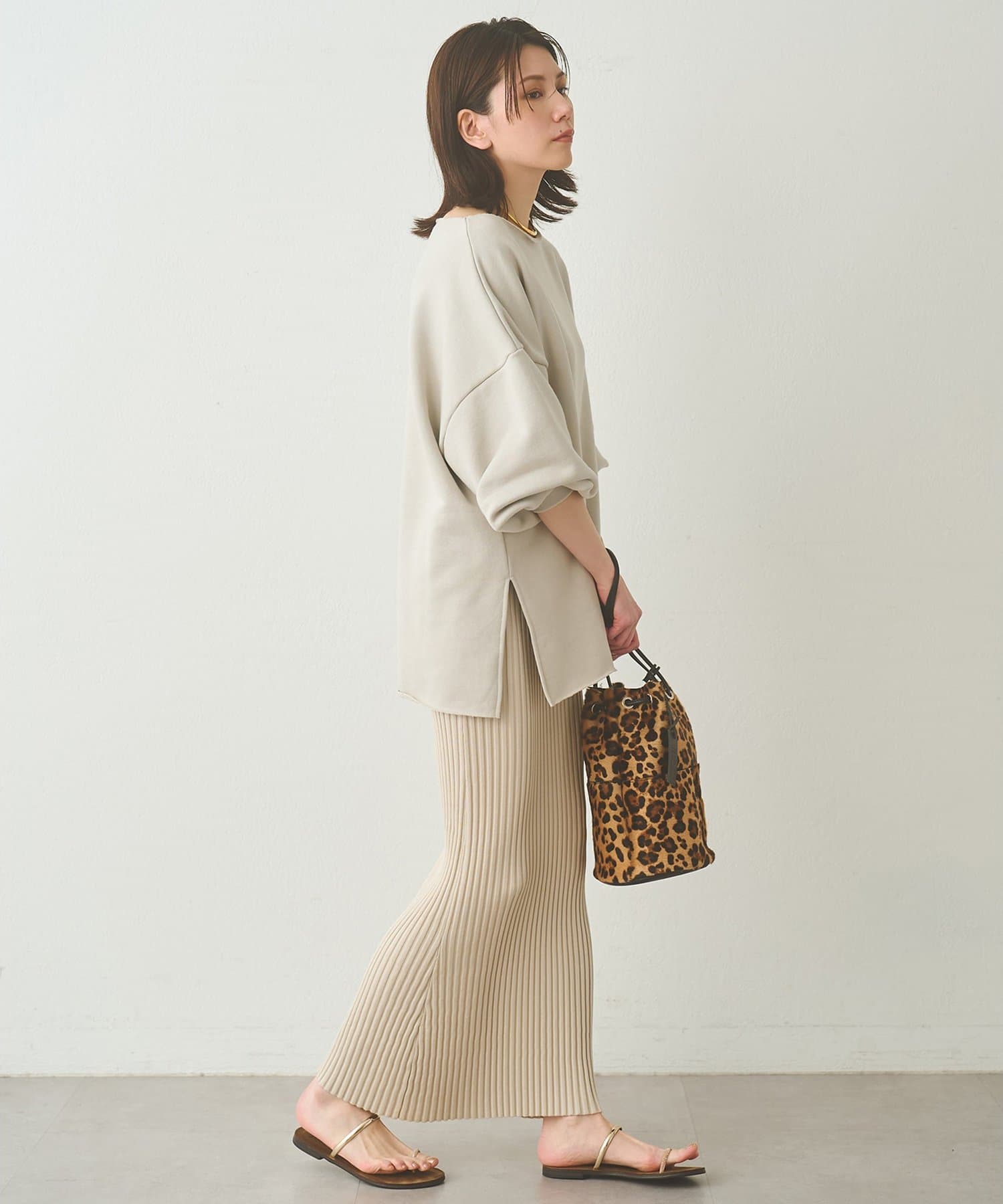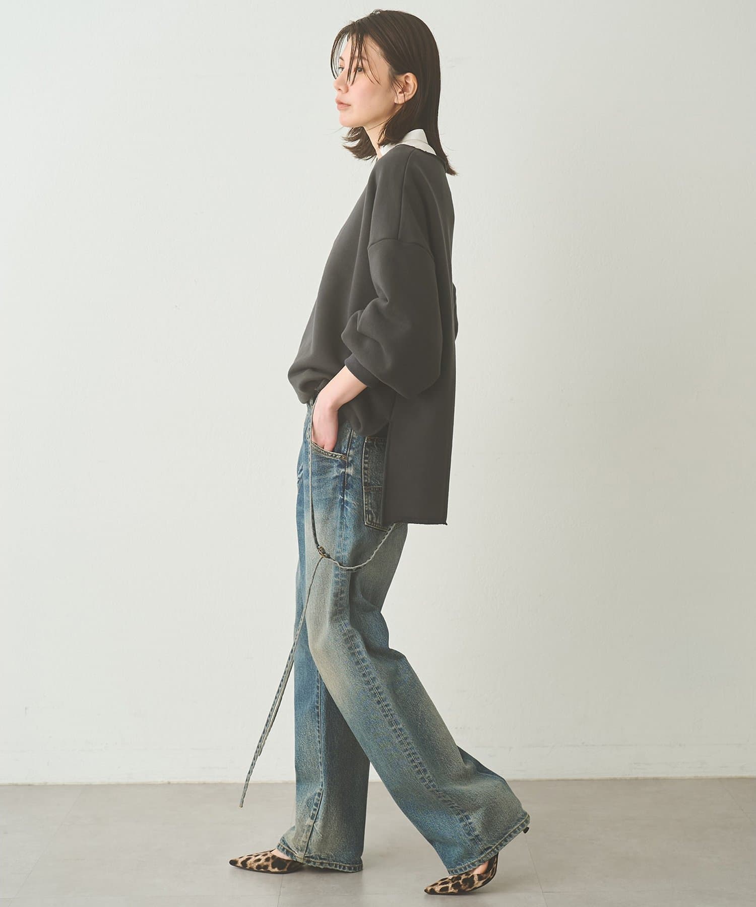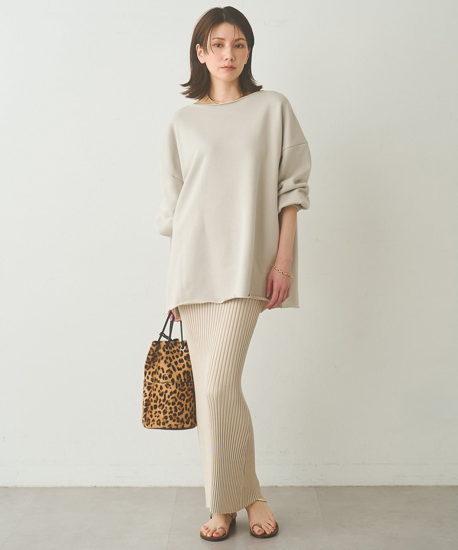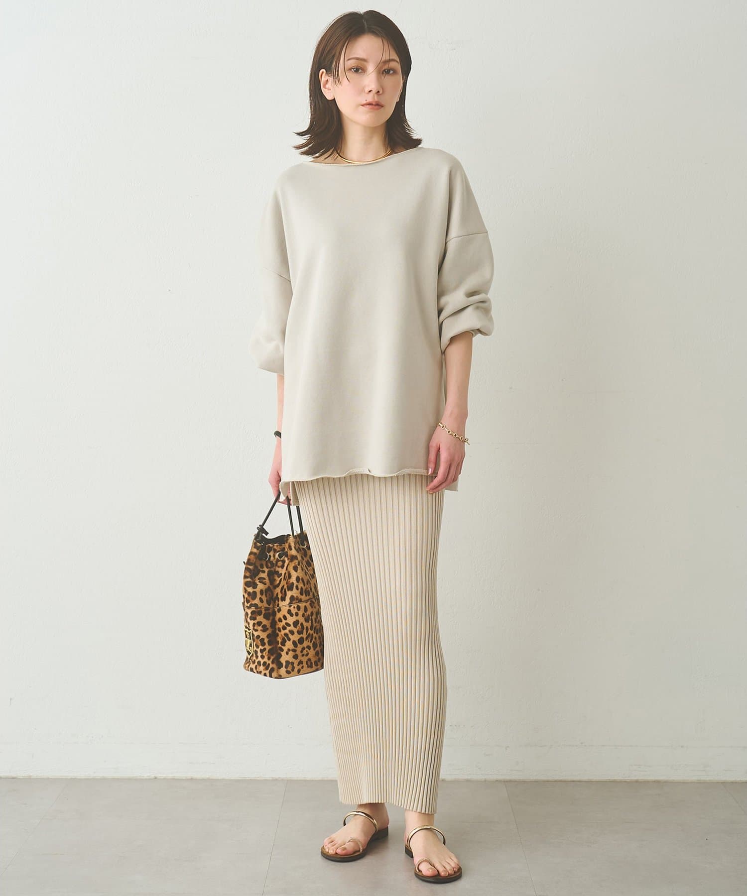 ■ゆったりとしたシルエットに、横に開いたネックラインが抜け感をプラス。