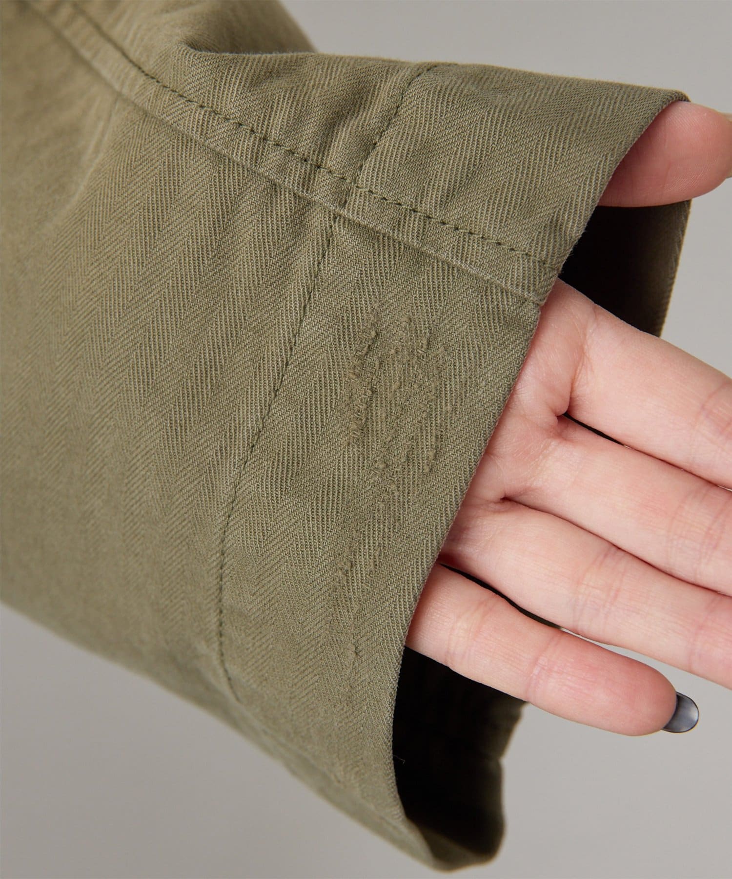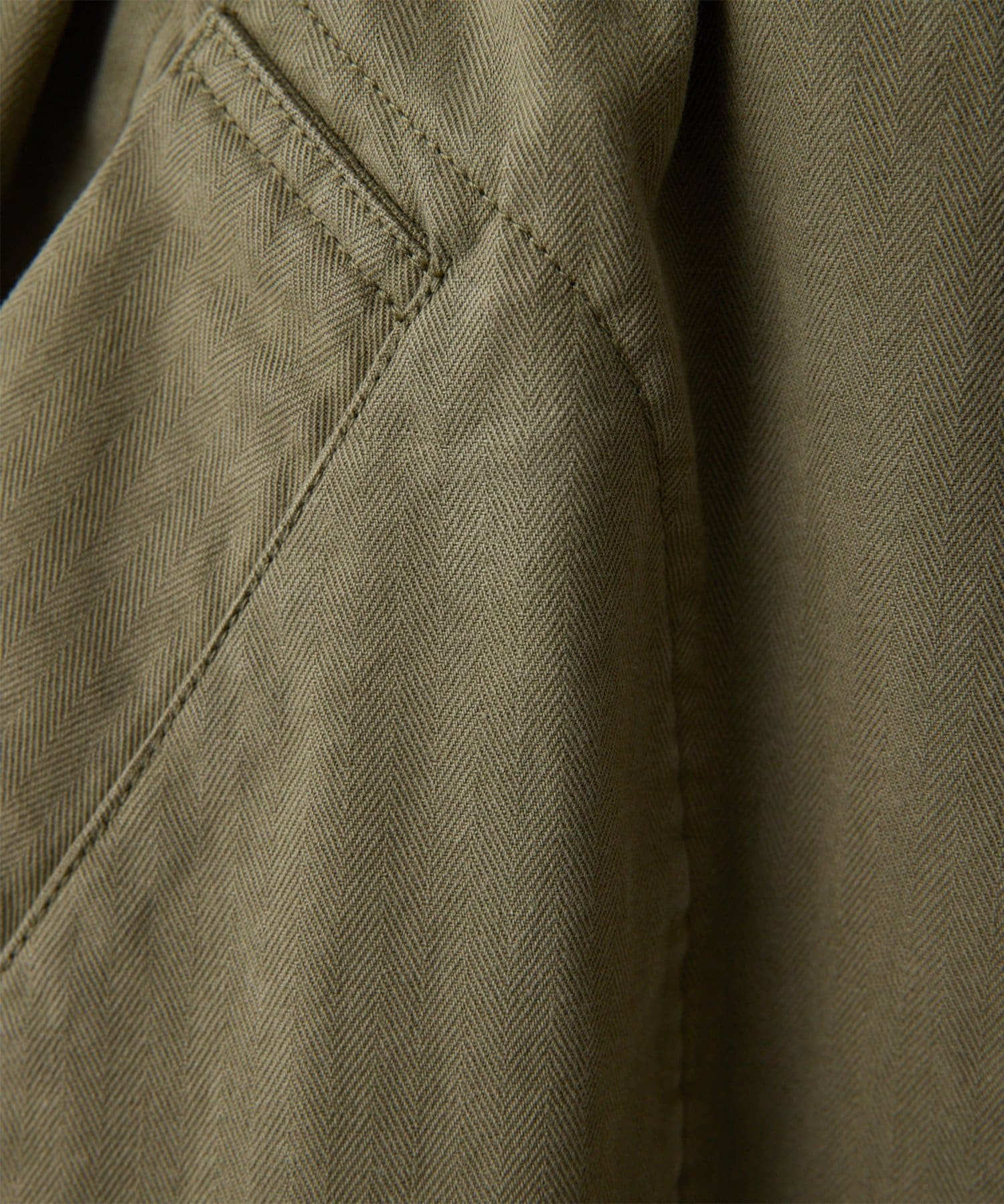 丈夫さと独特のV字模様(杉綾)が特徴のミリタリー、ワーク系アイテムで使われることが多い経年変化を楽しめる素材。