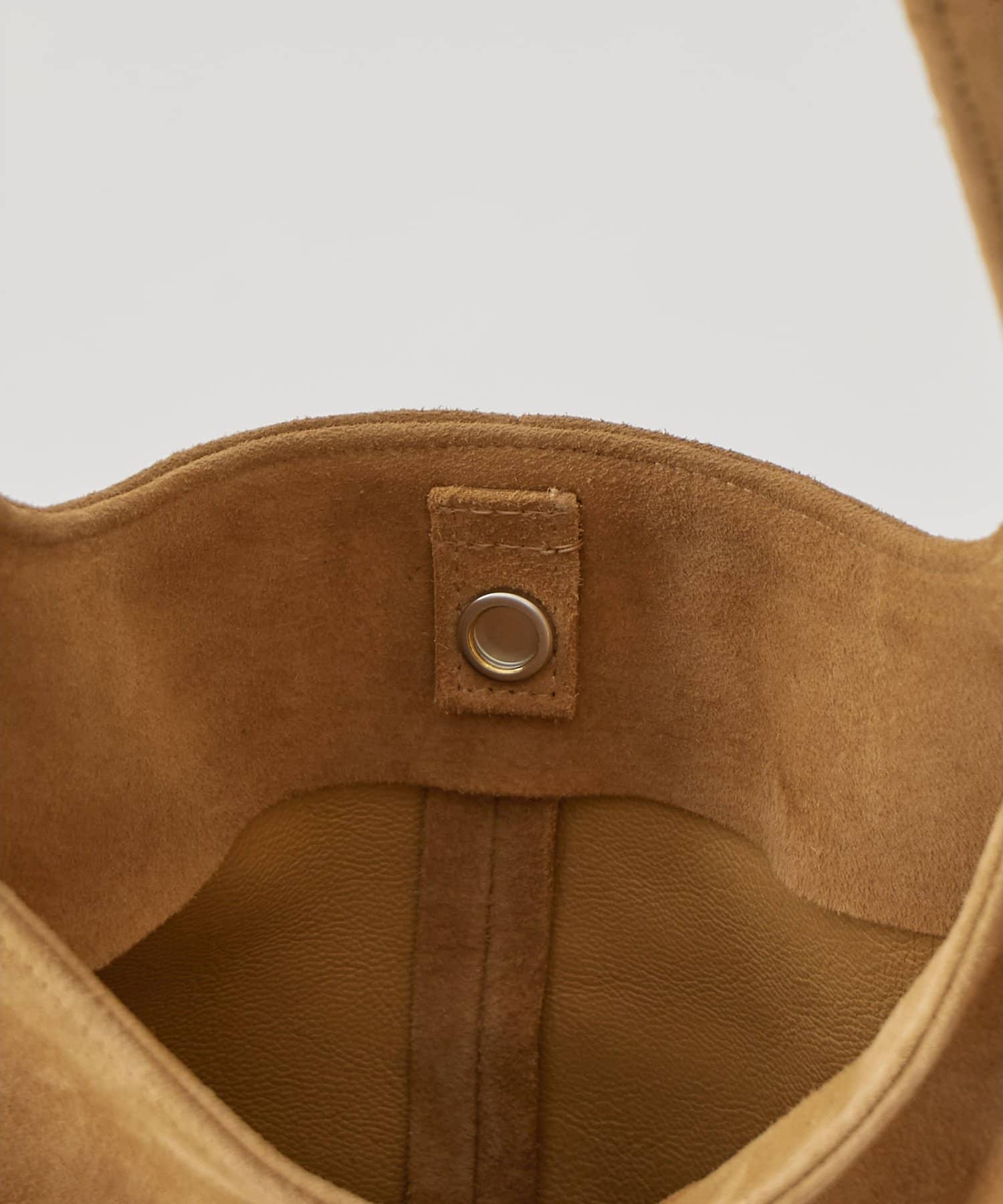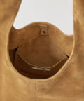■大きめのラウンド型がコーディネートの主役になるスエードバッグ。