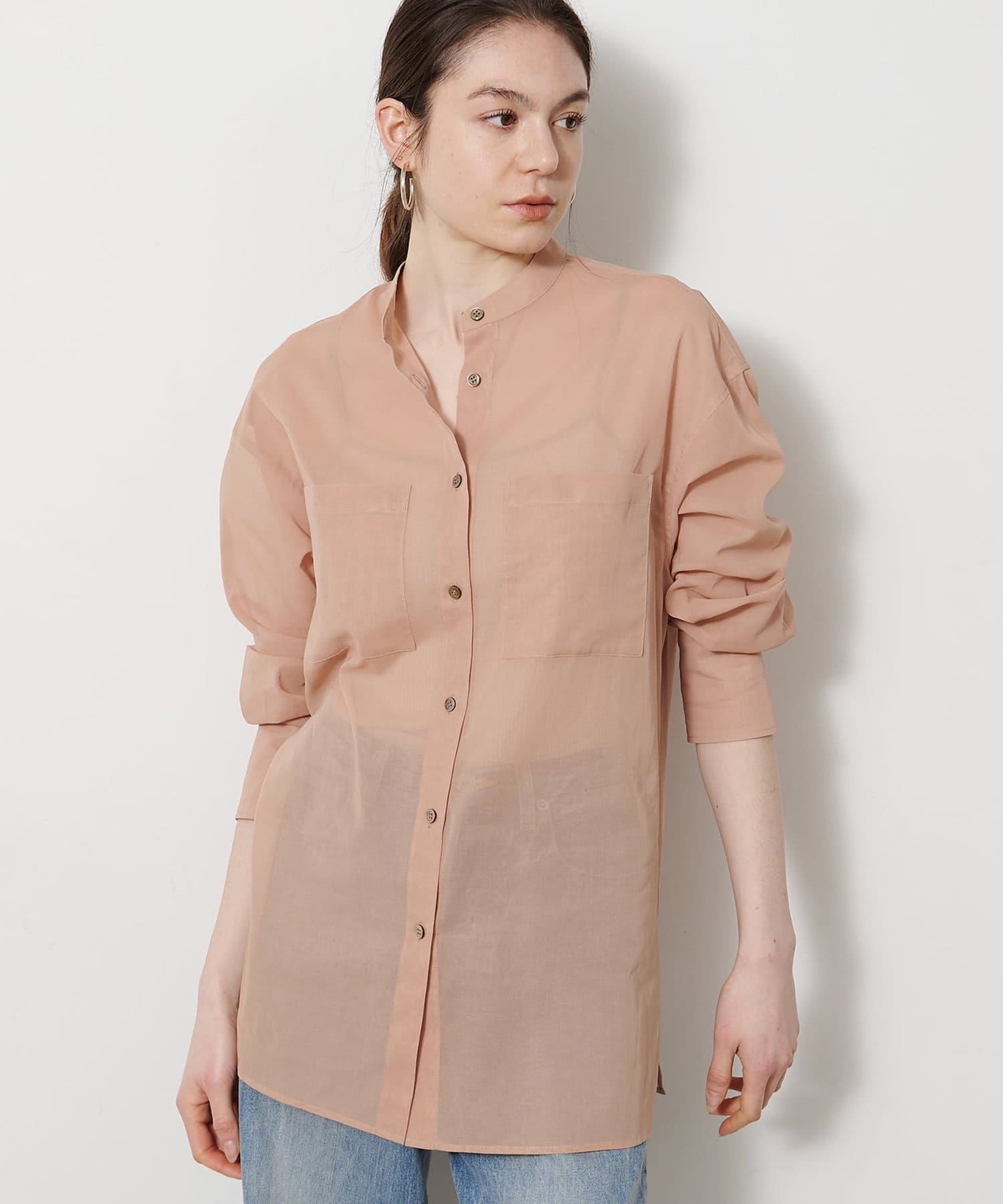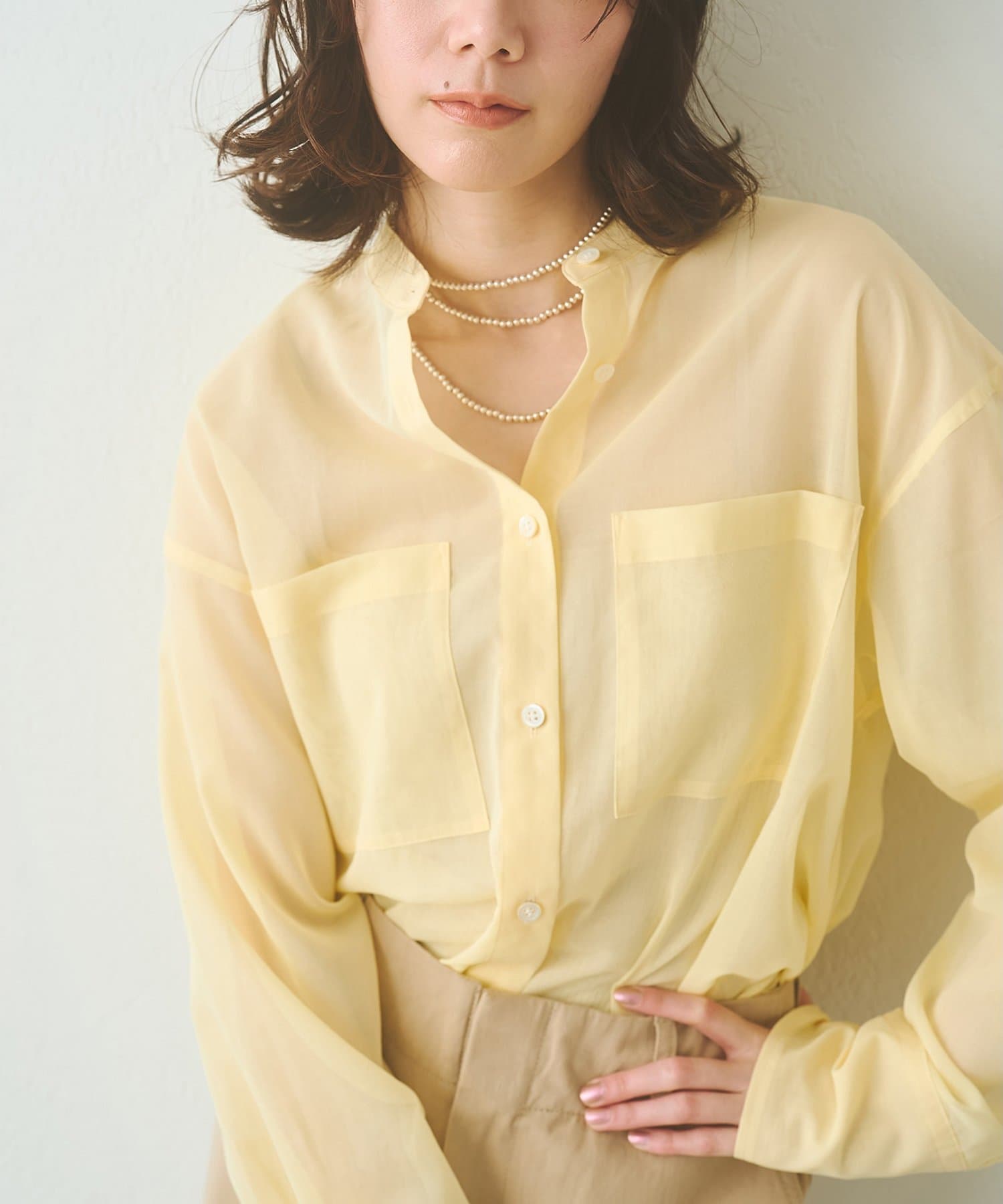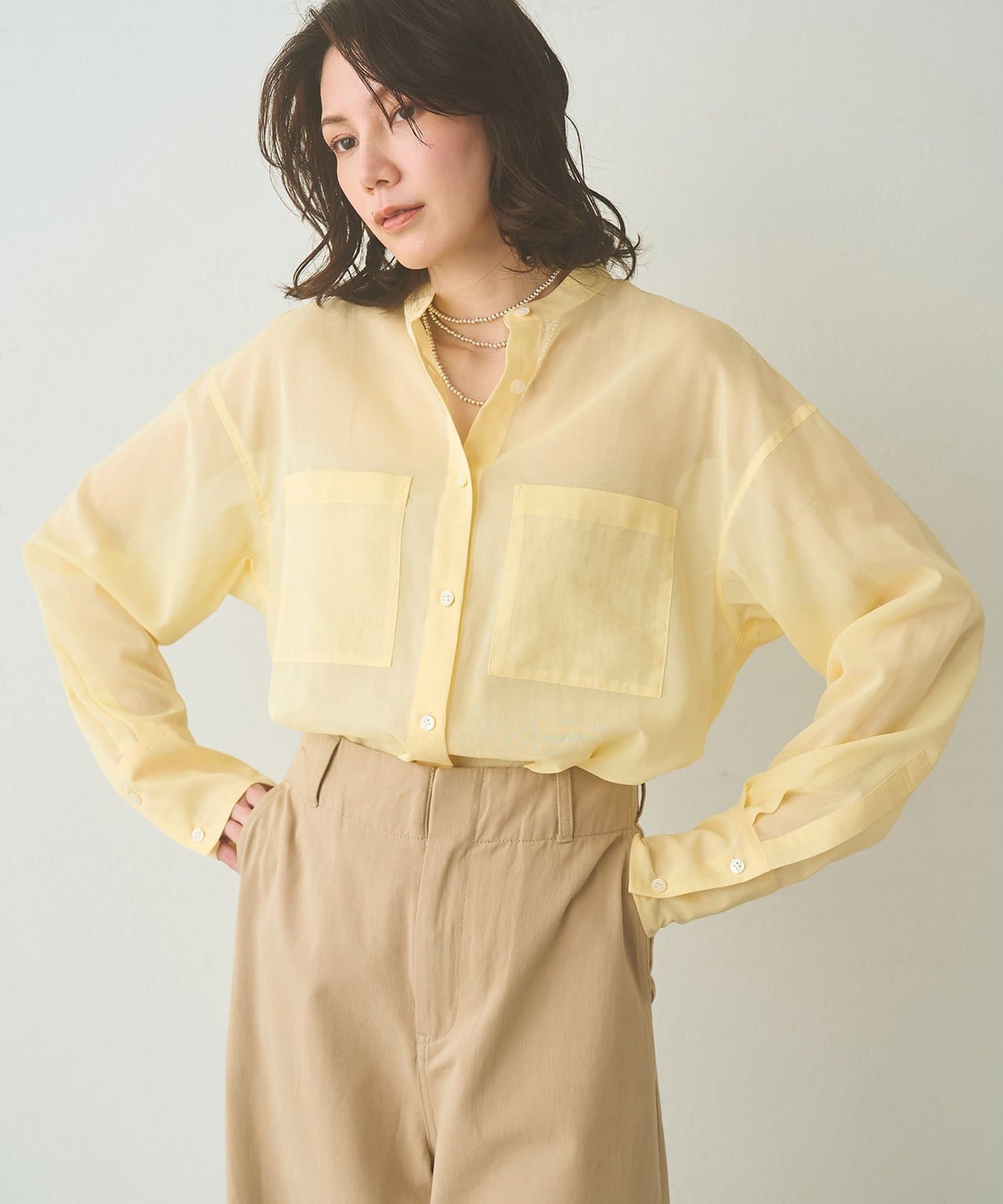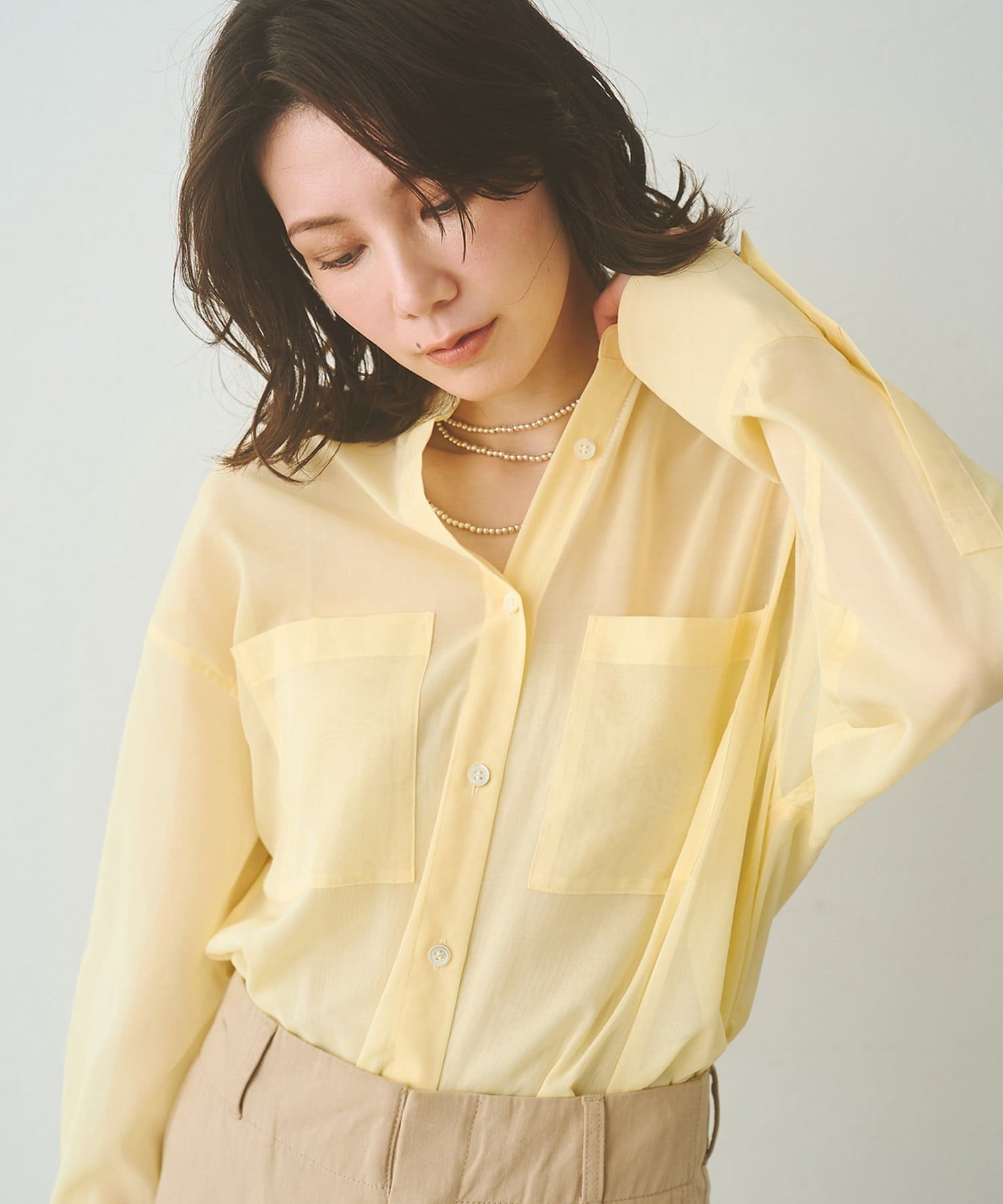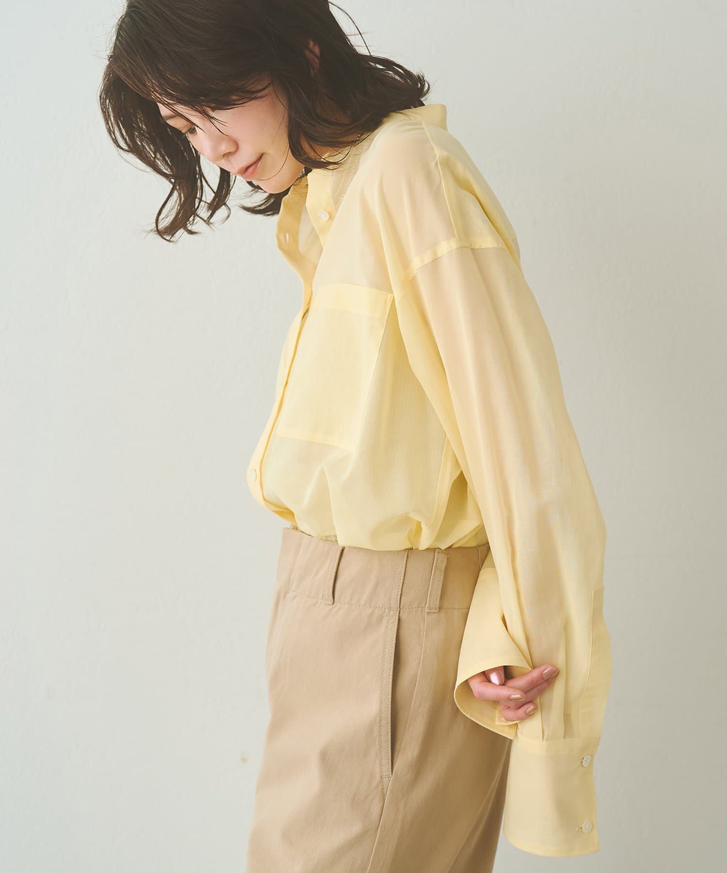 ■上品な透け感が合わせるアイテムを選ばないシアーシャツ。