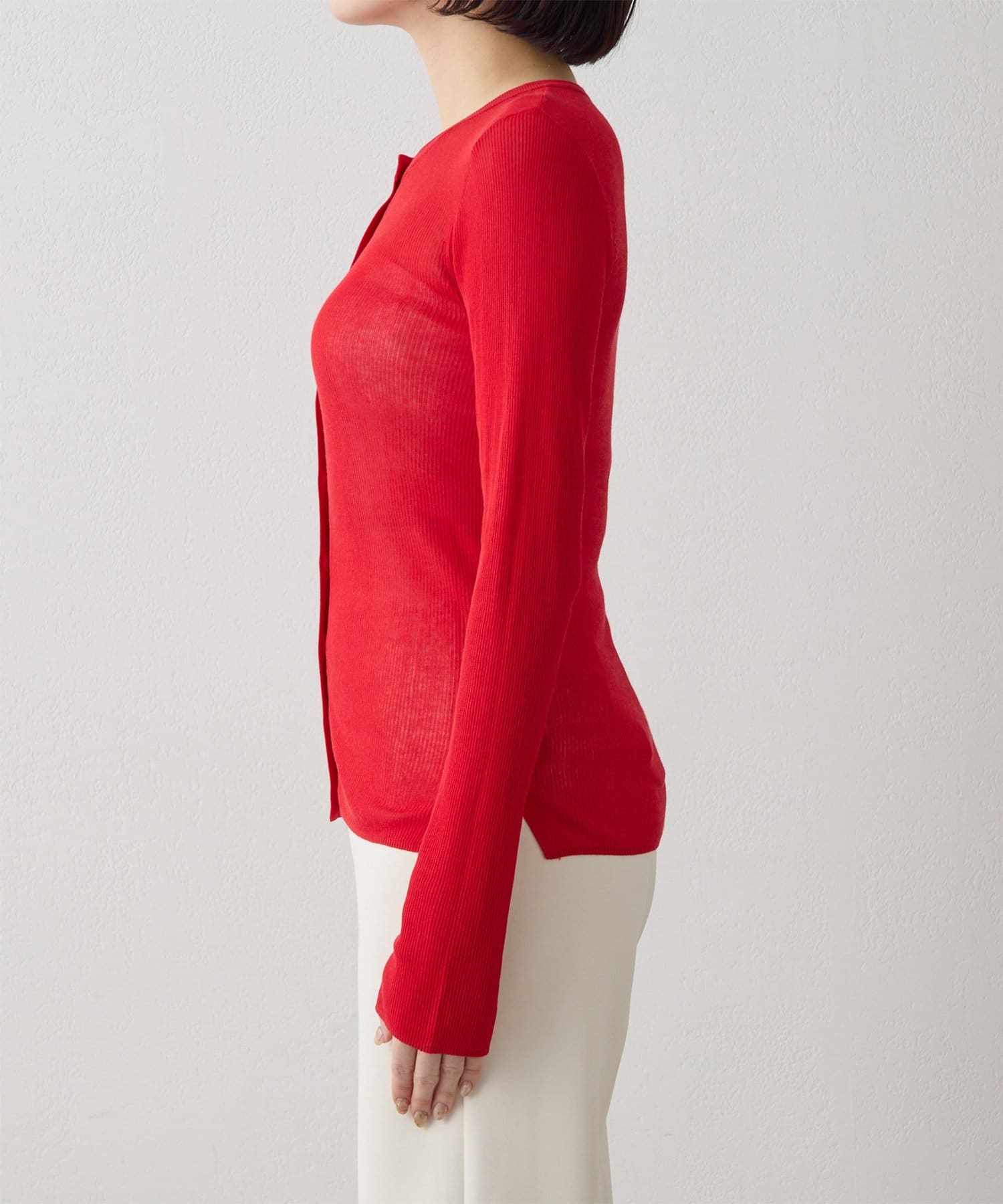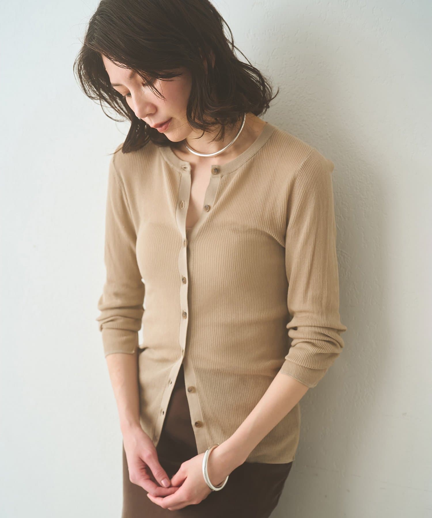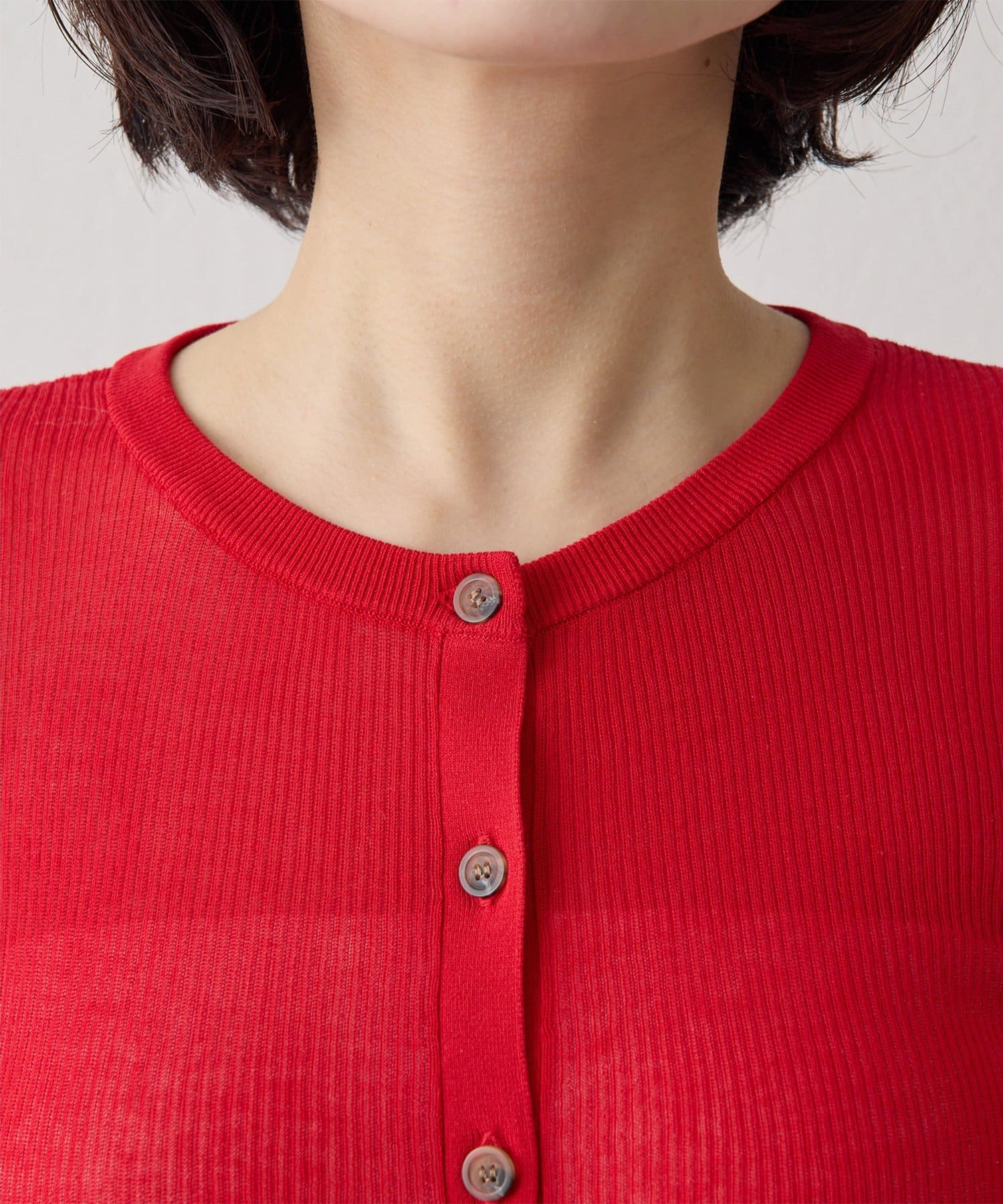 ■清涼感のあるシアー素材を使用したリブニットカーディガン。