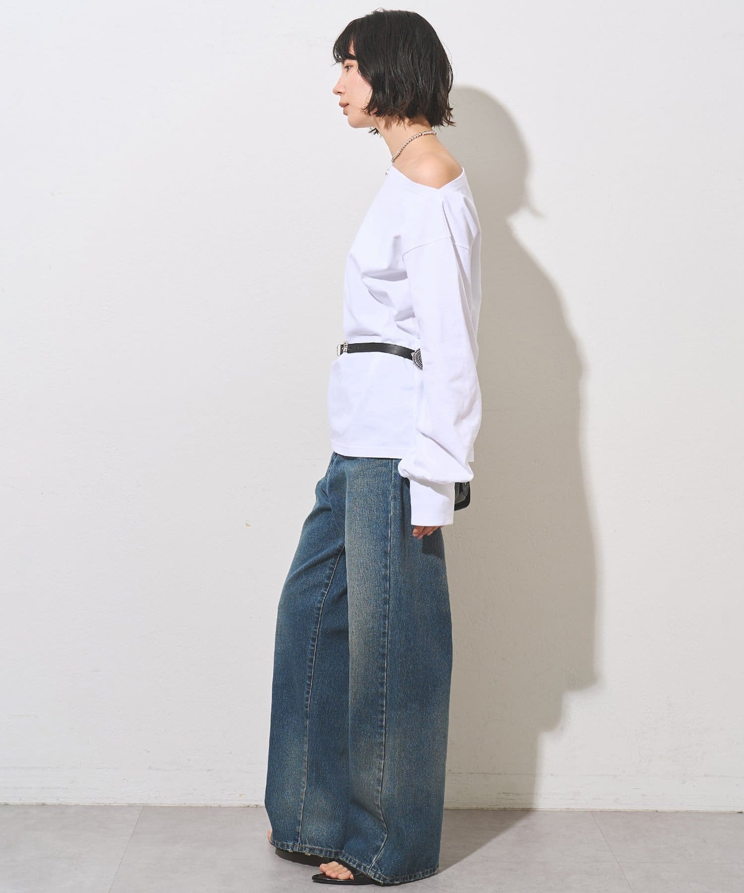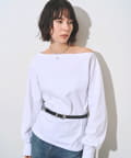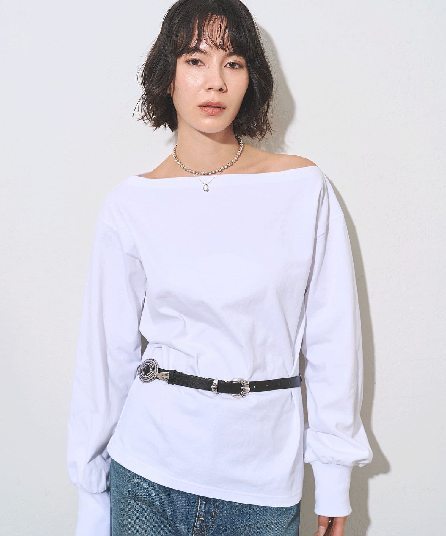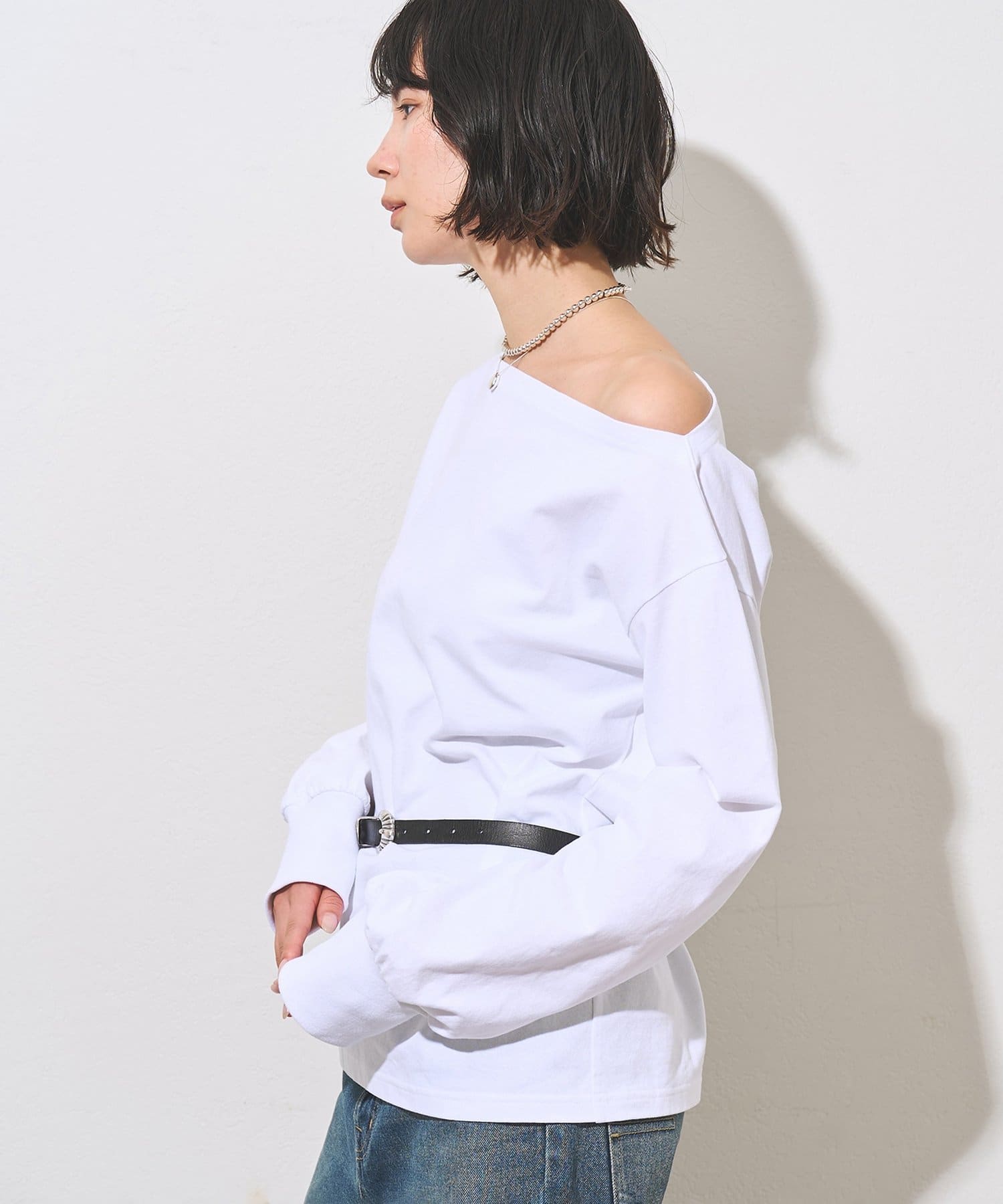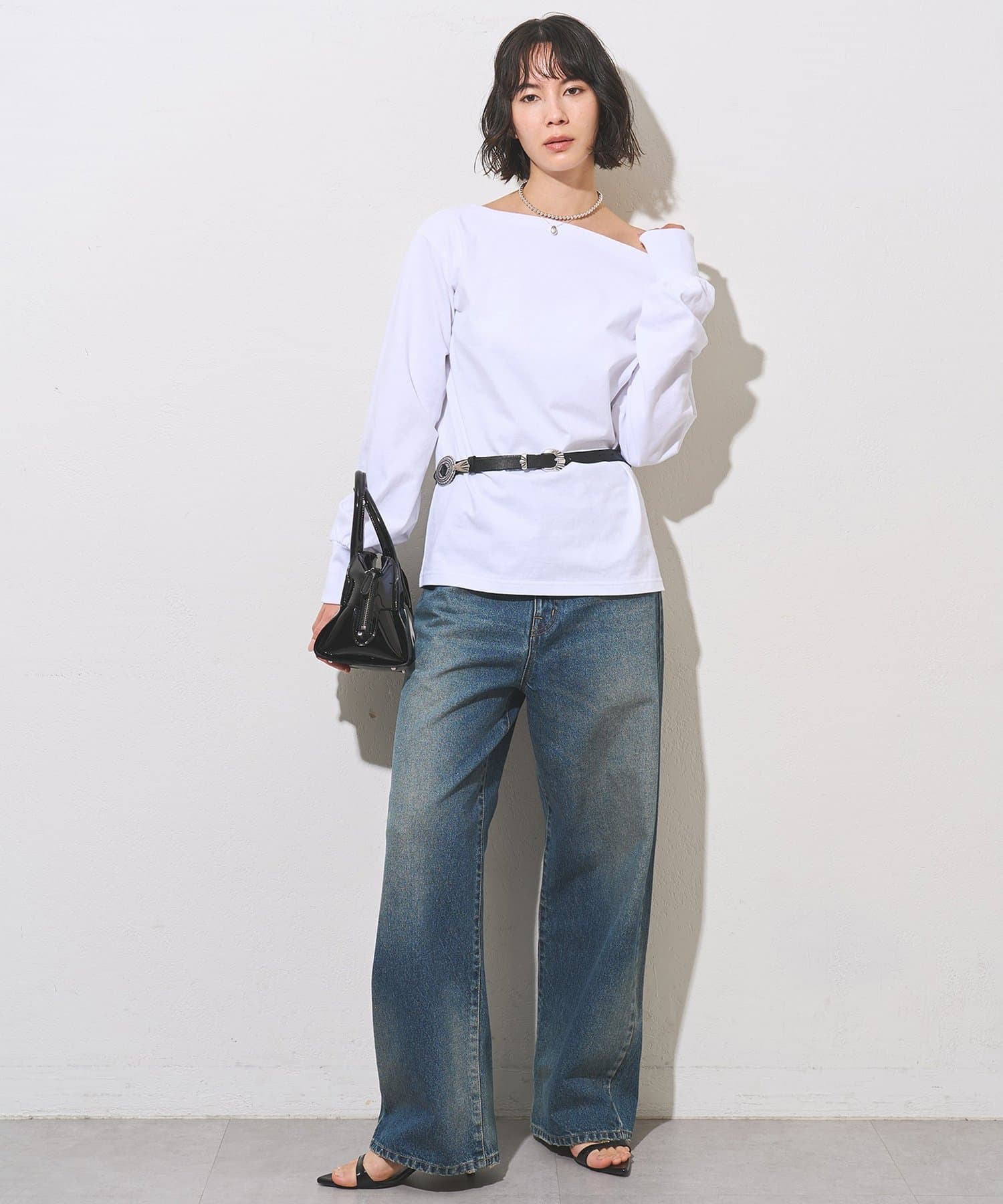 ■横に広いネックラインは、片方の肩を落としてワンショルダーとして着用でき、程よいこなれ感をプラス。