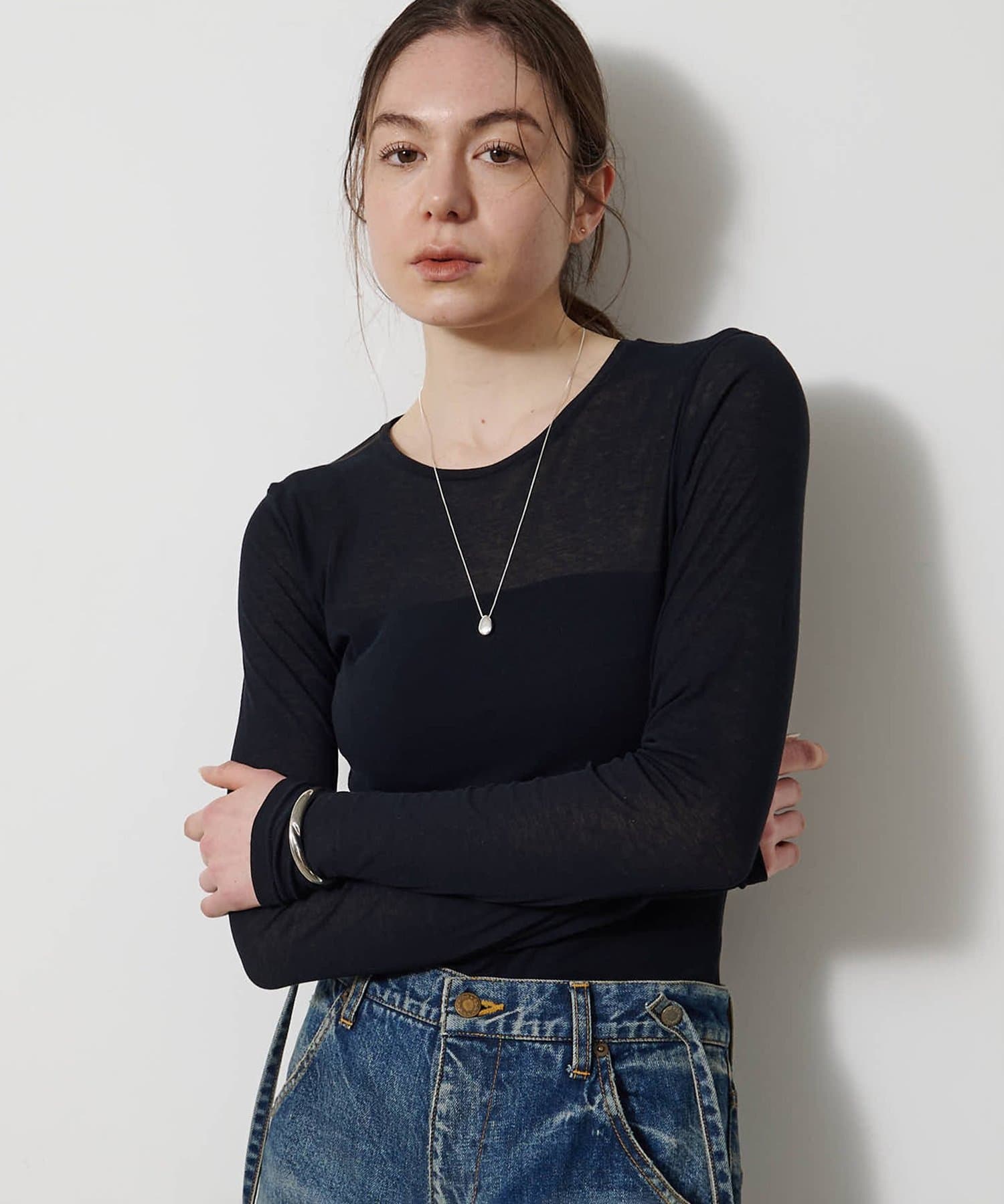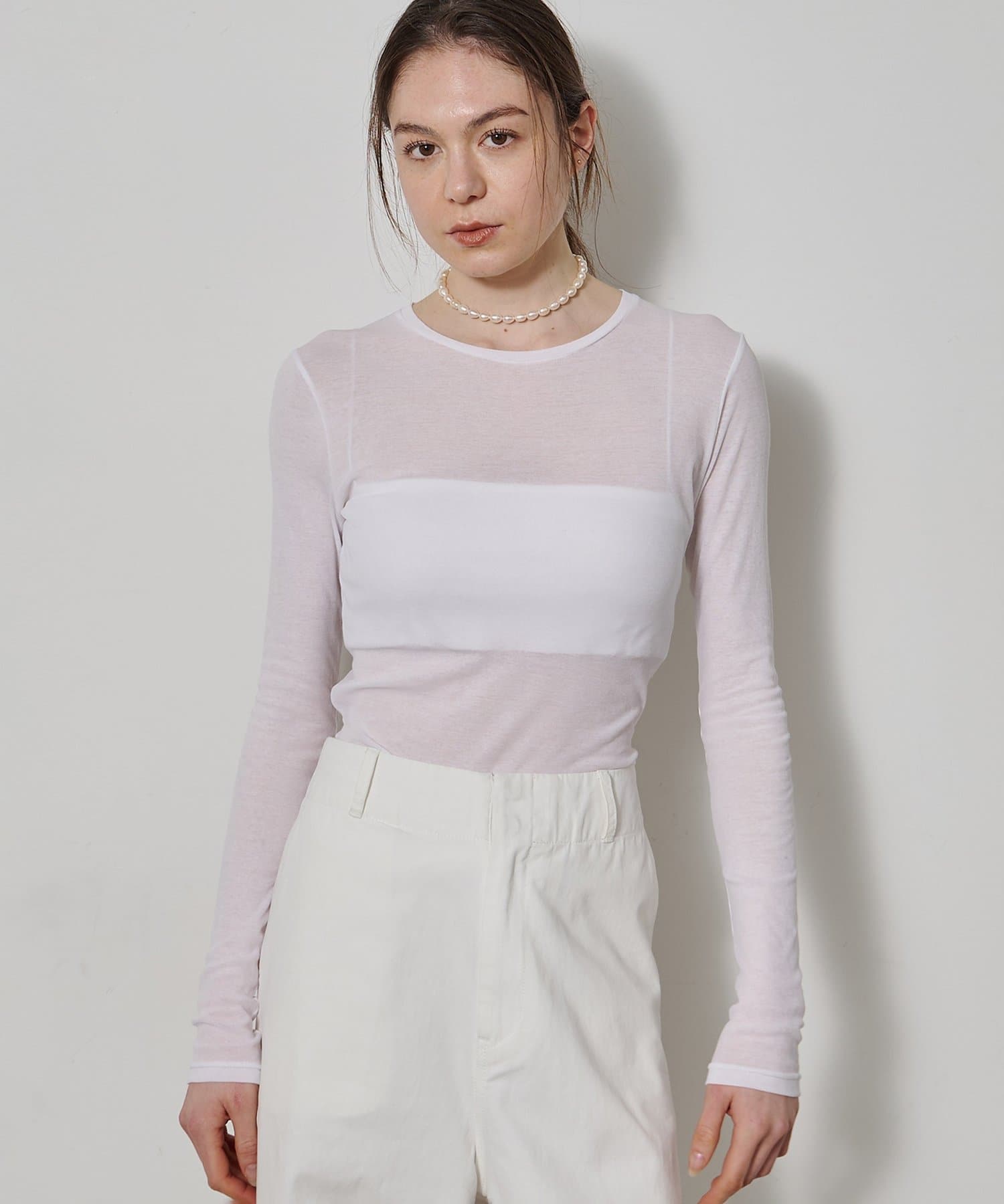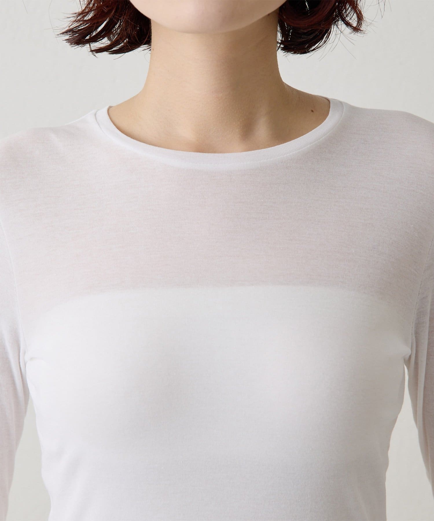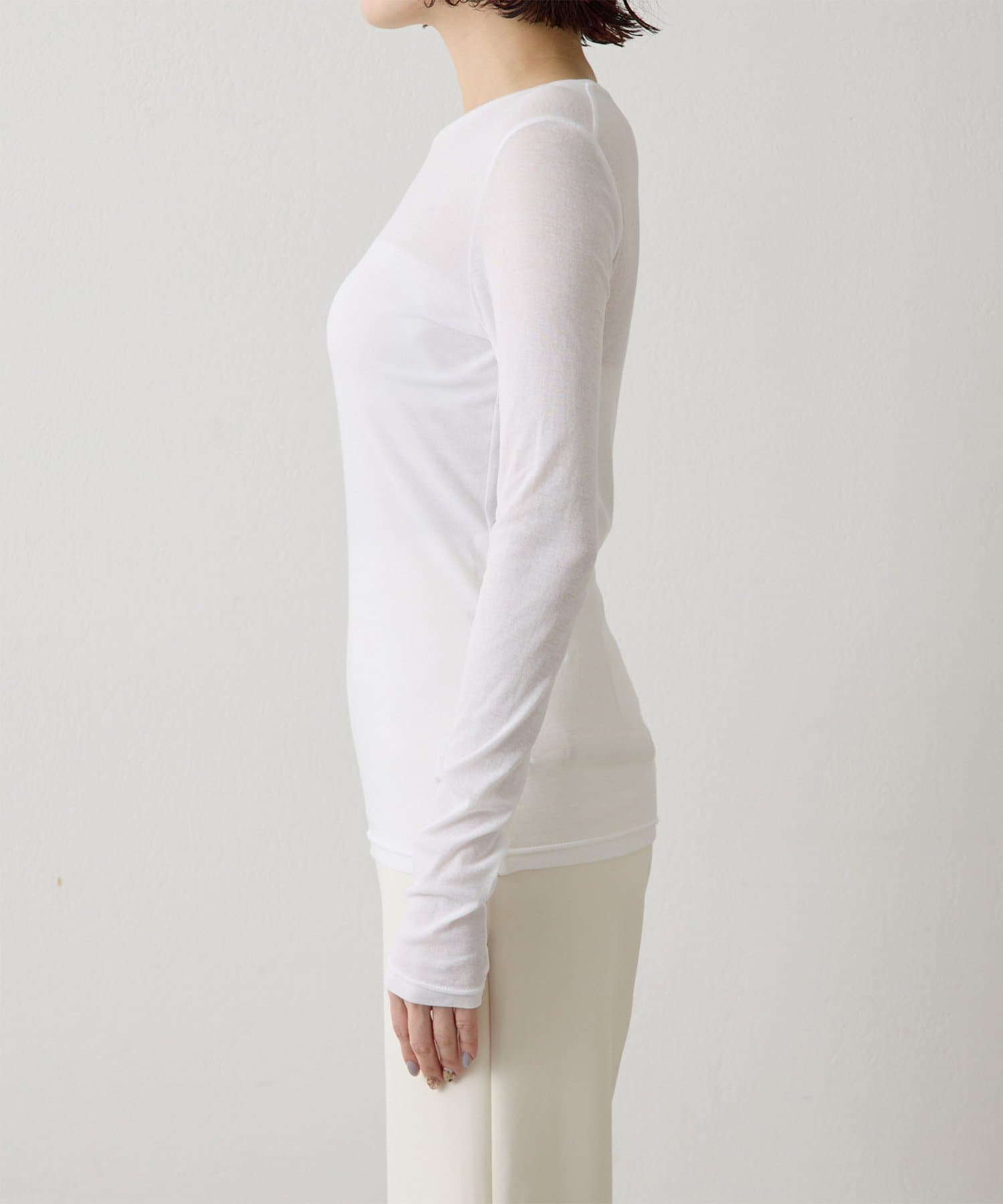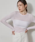 ■程よいシアー感と華奢なクルーネックがレイヤードを邪魔せず、女性らしい抜け感を演出。